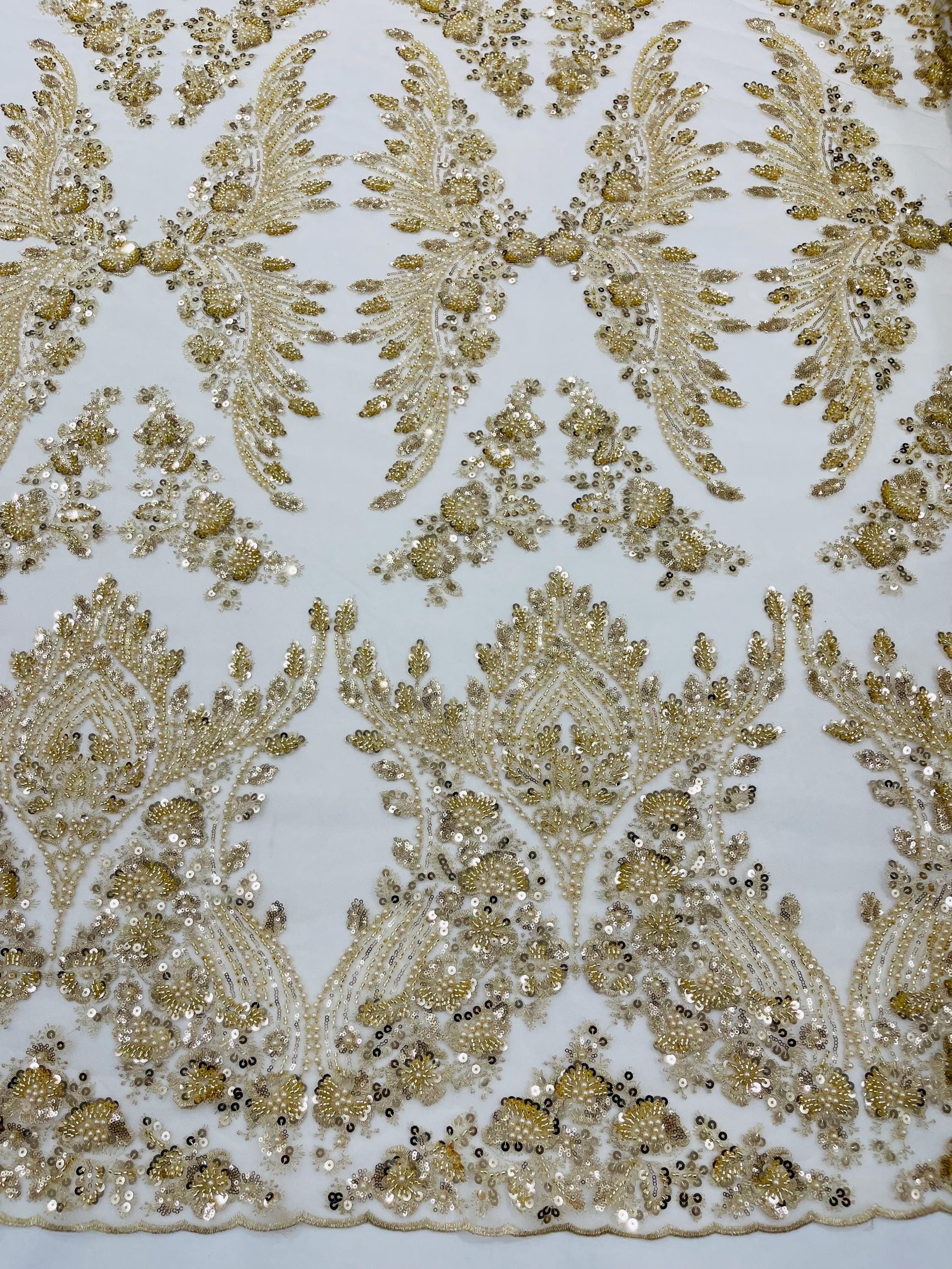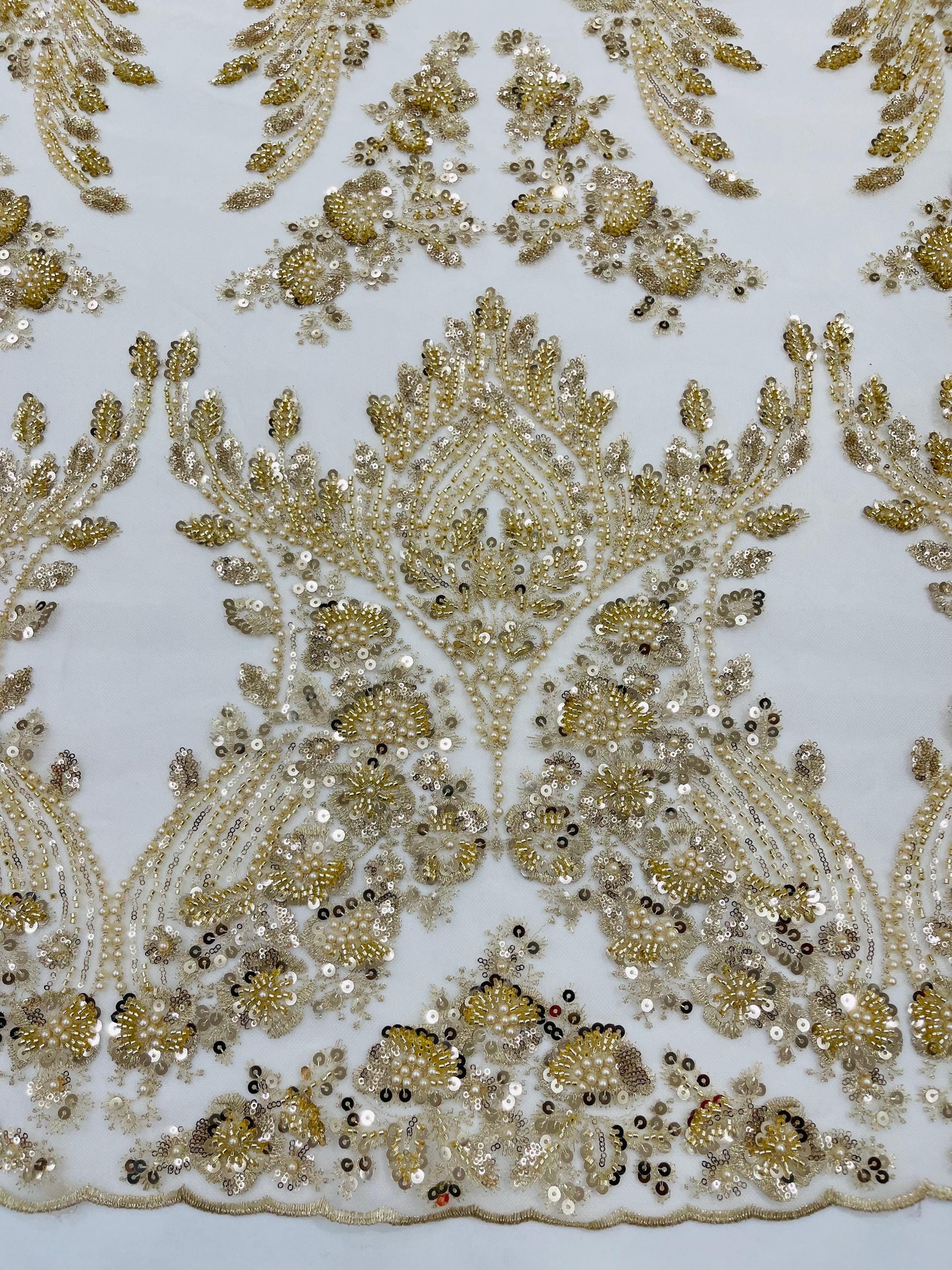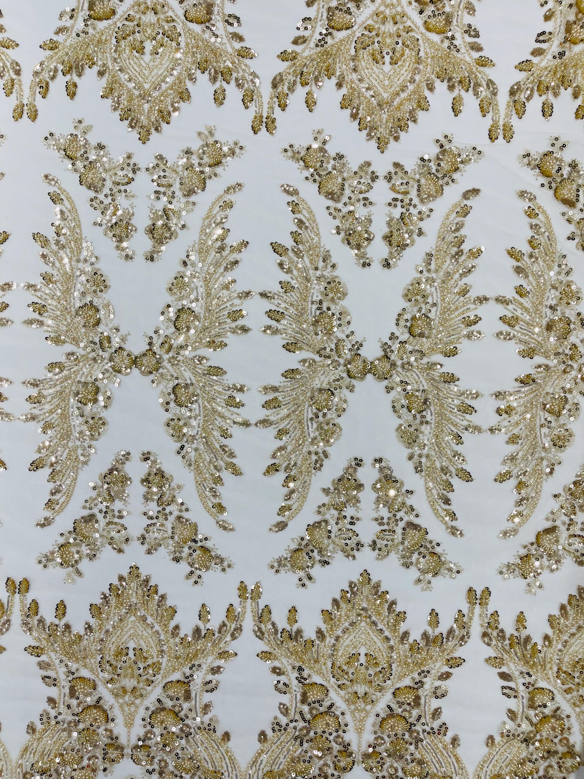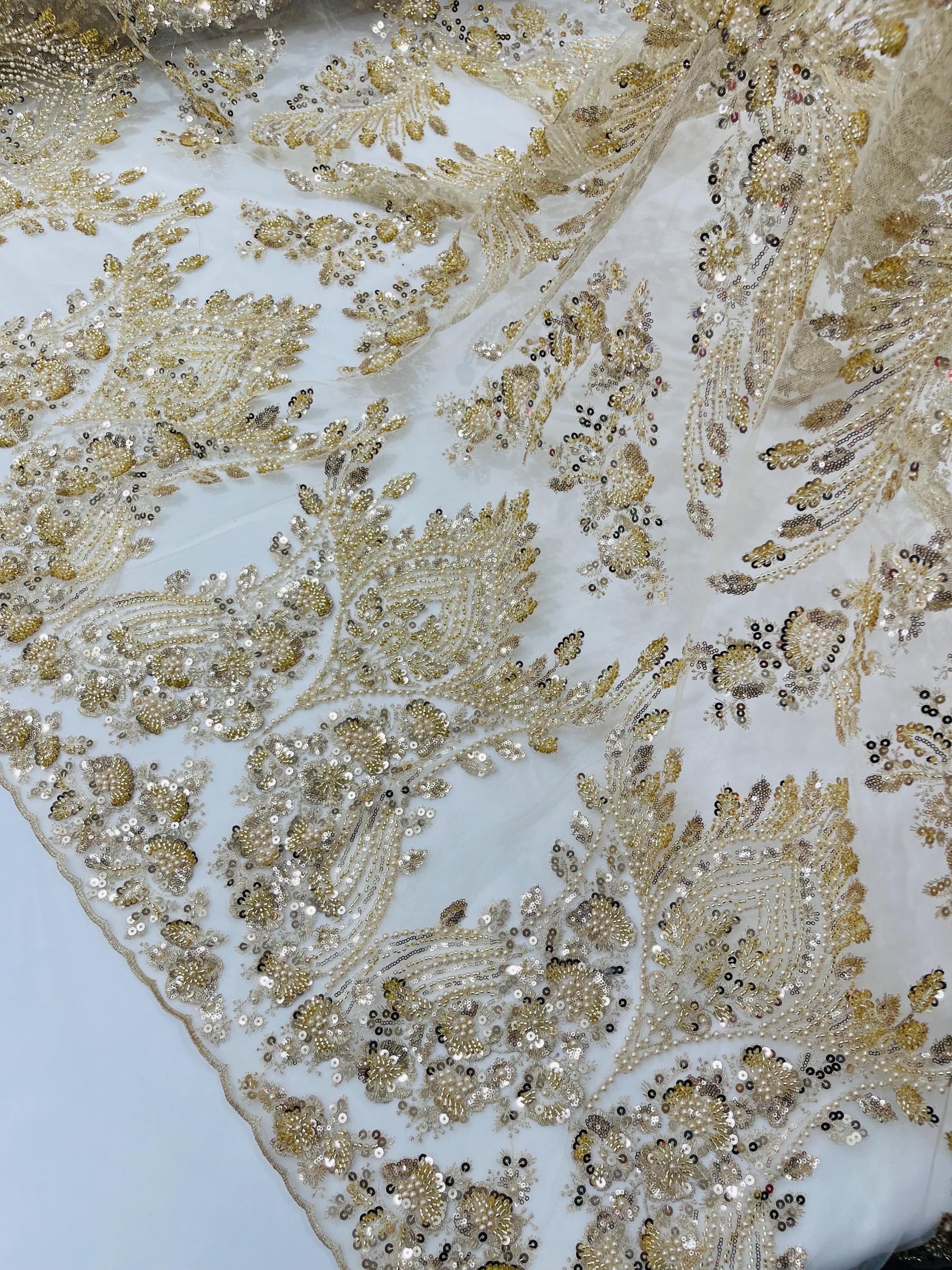 Champagne Beaded Fabric: Embroidered Butterfly Pattern, Bridal Wedding Fabric