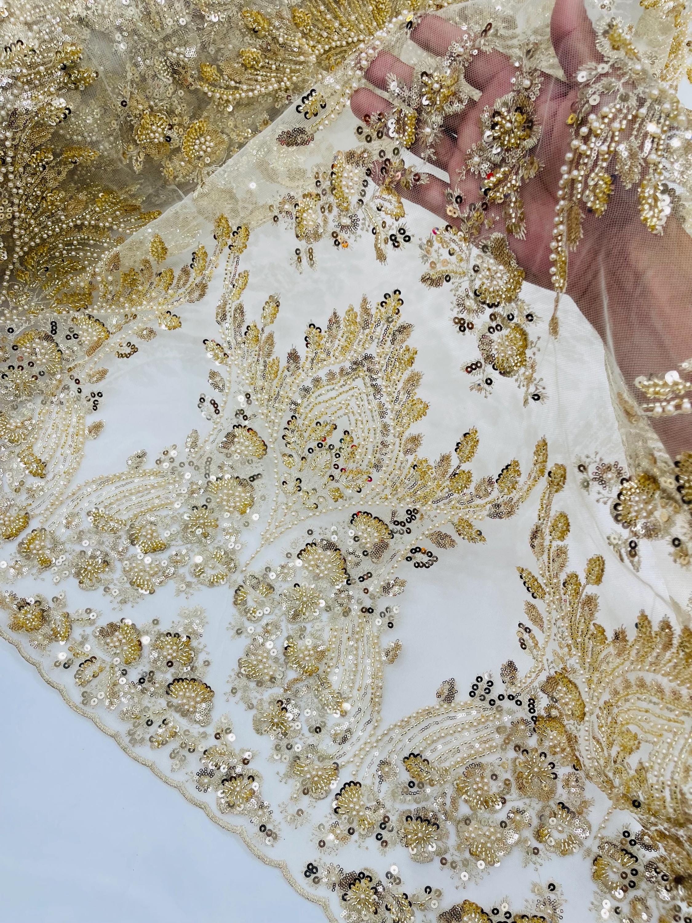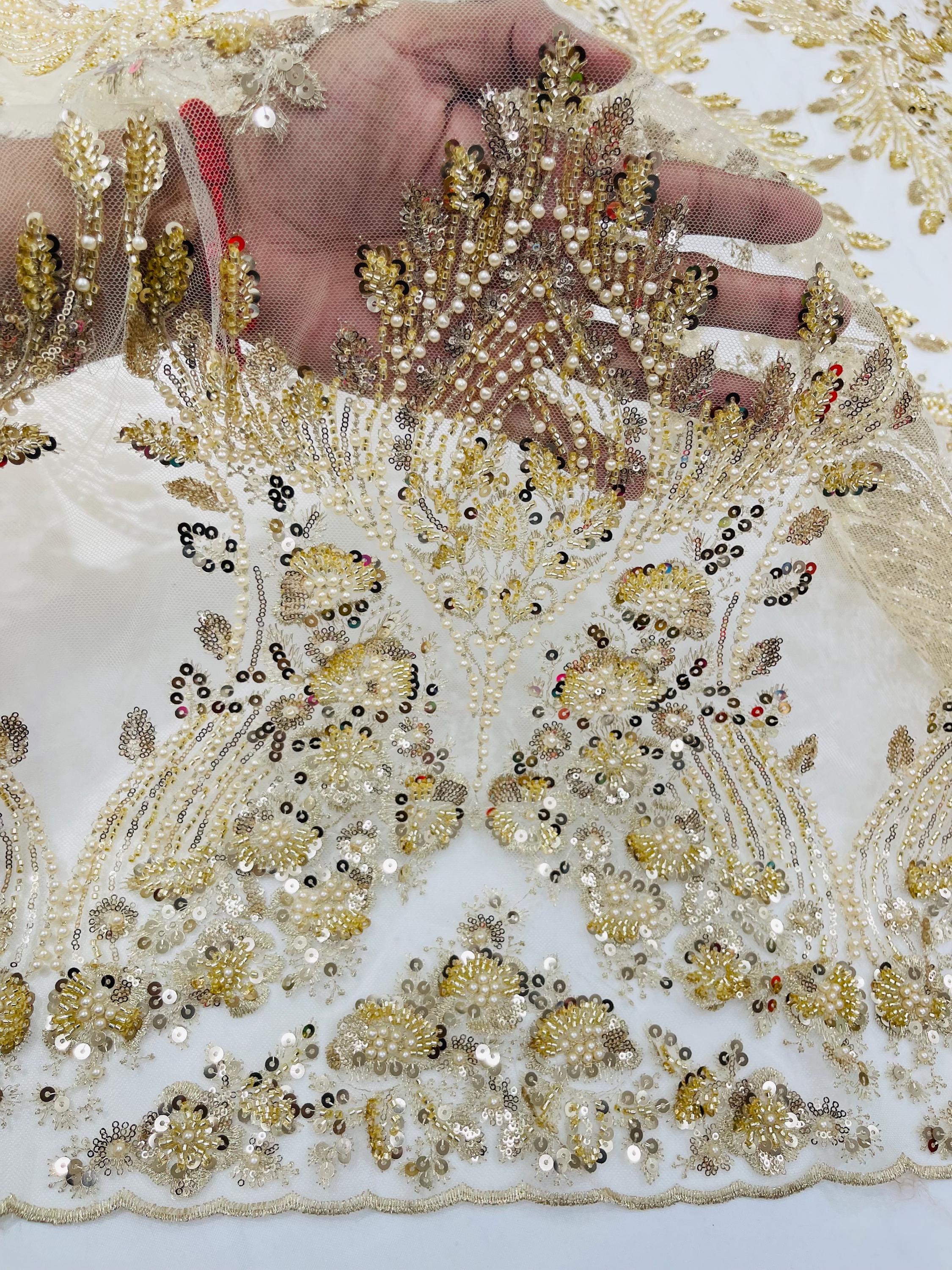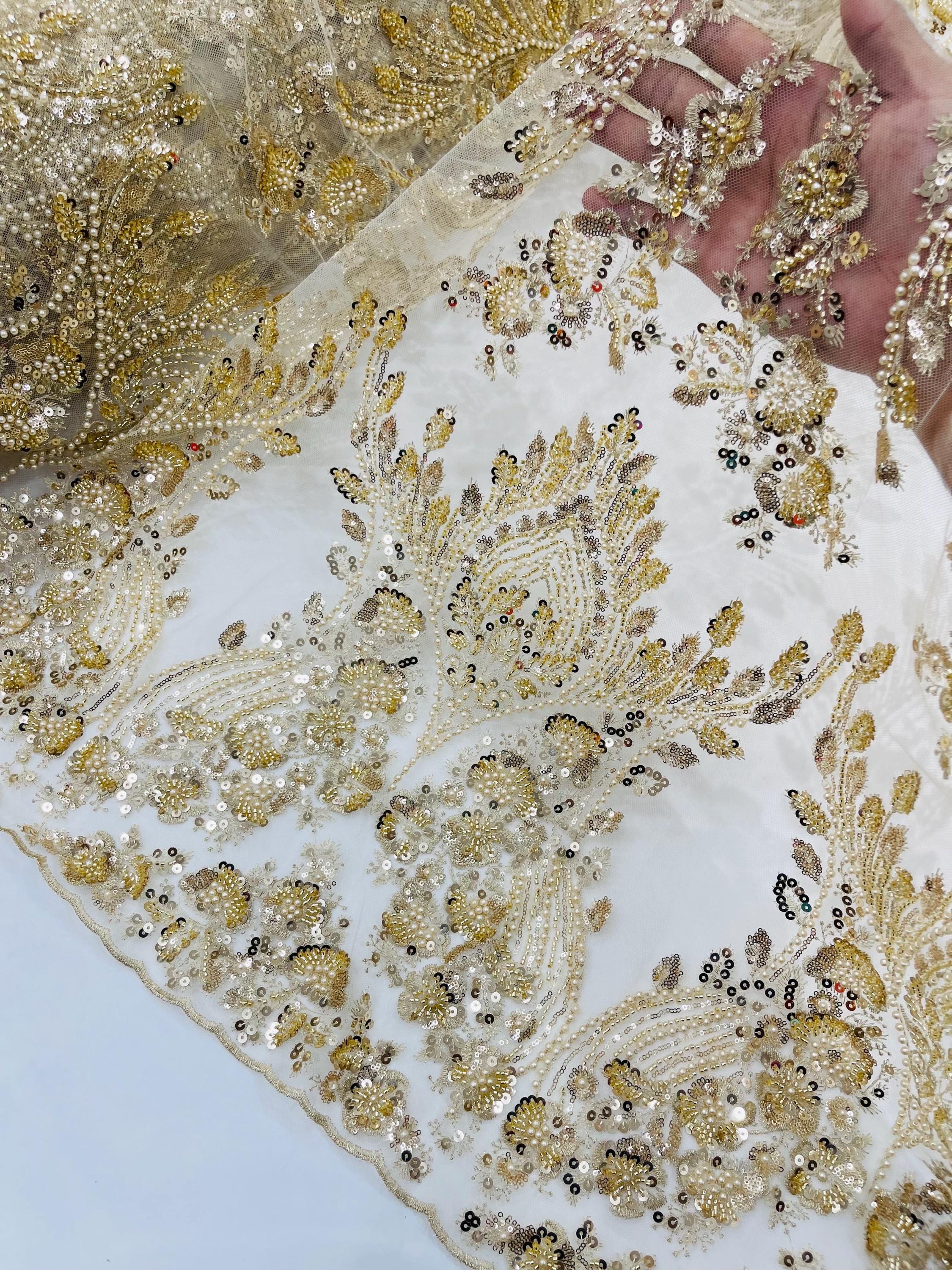 The beautiful design includes embroidered wavy plants patterns with beads across a mesh fabric of great quality. It has a beautiful border on both ends. This lace can be used for dresses, tablecloths, nightgowns, prom gowns, bridesmaid gowns, wedding gowns, table covers/runners, pillows, home /event decorations, and much more.