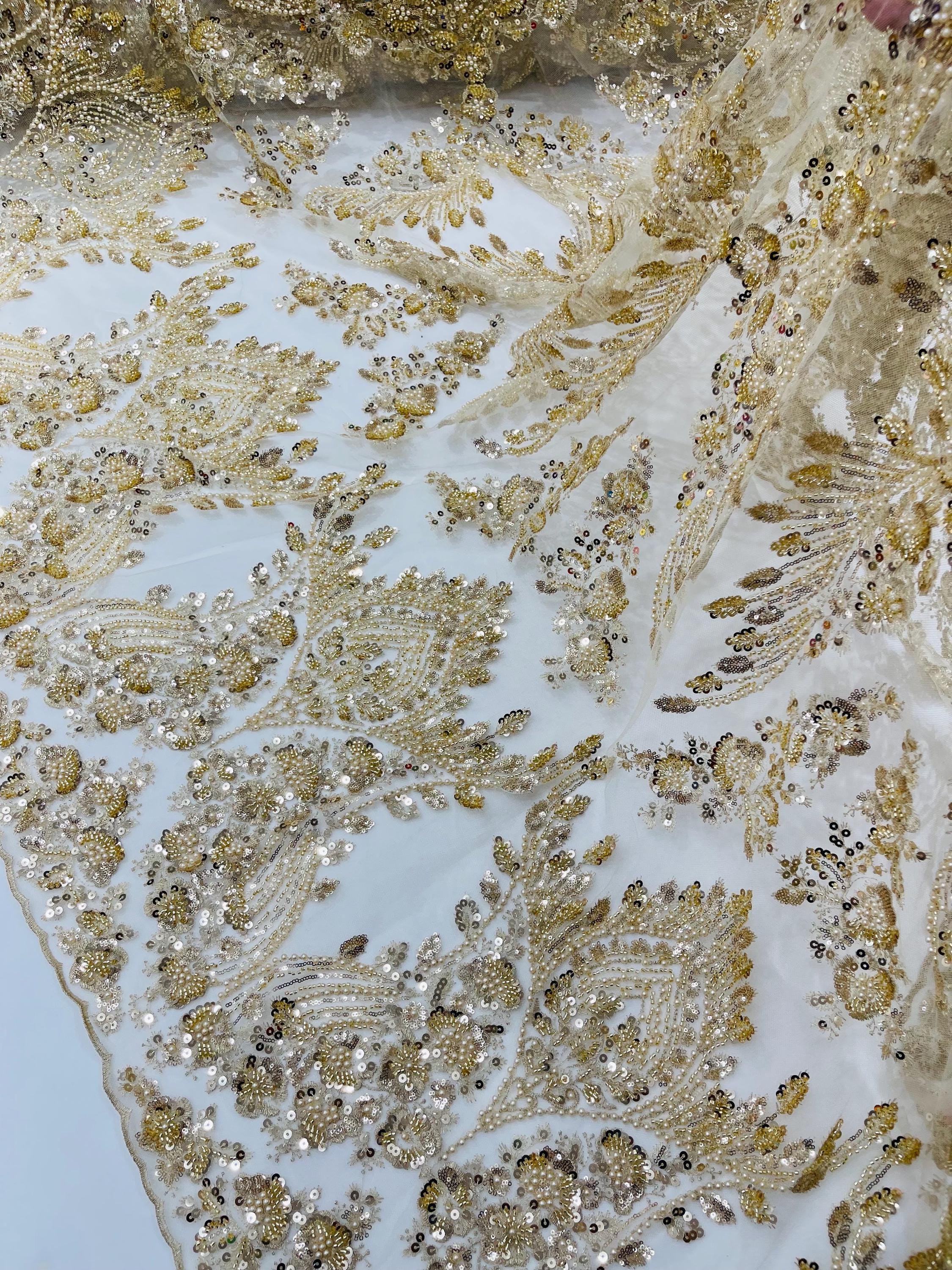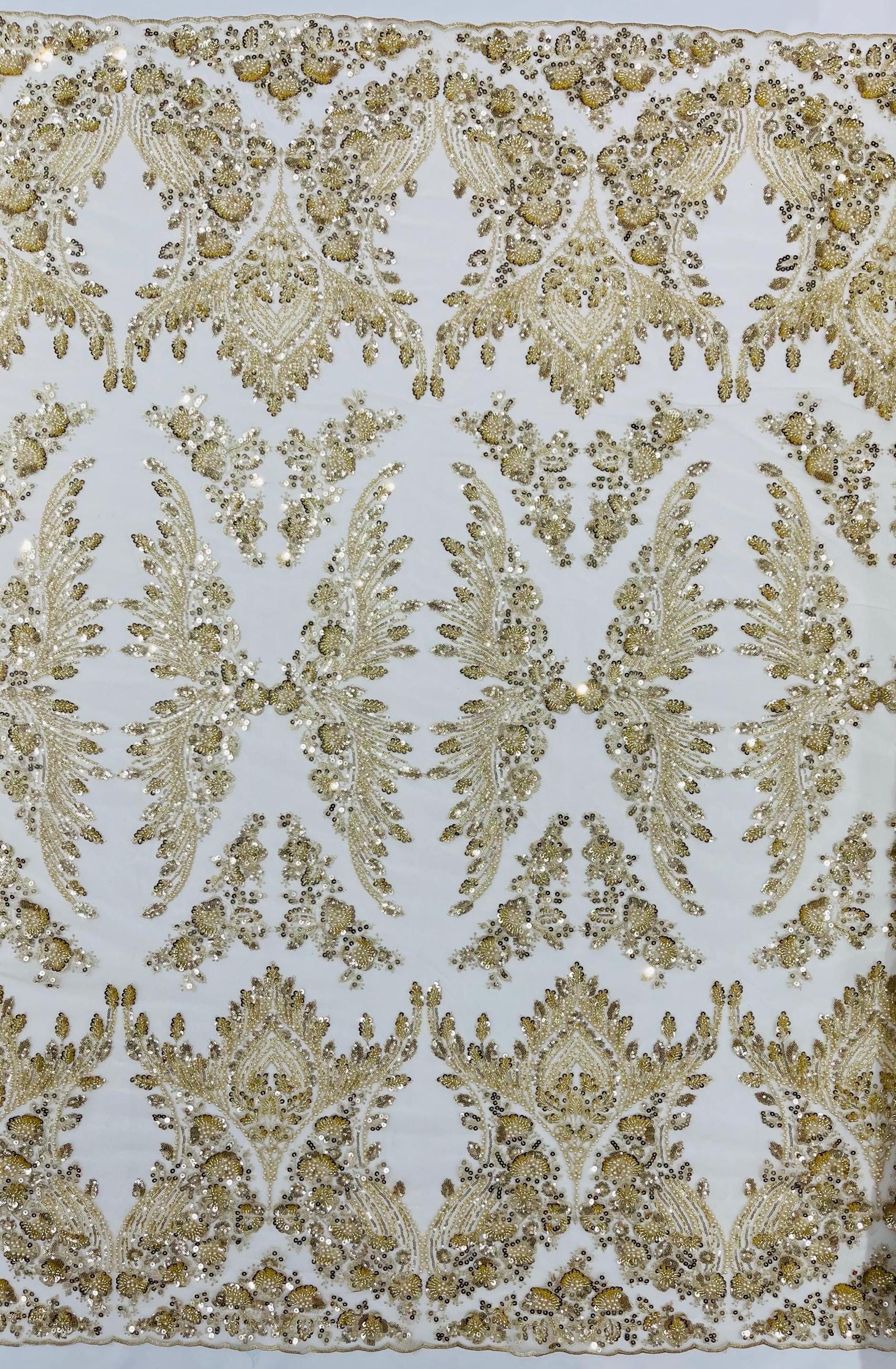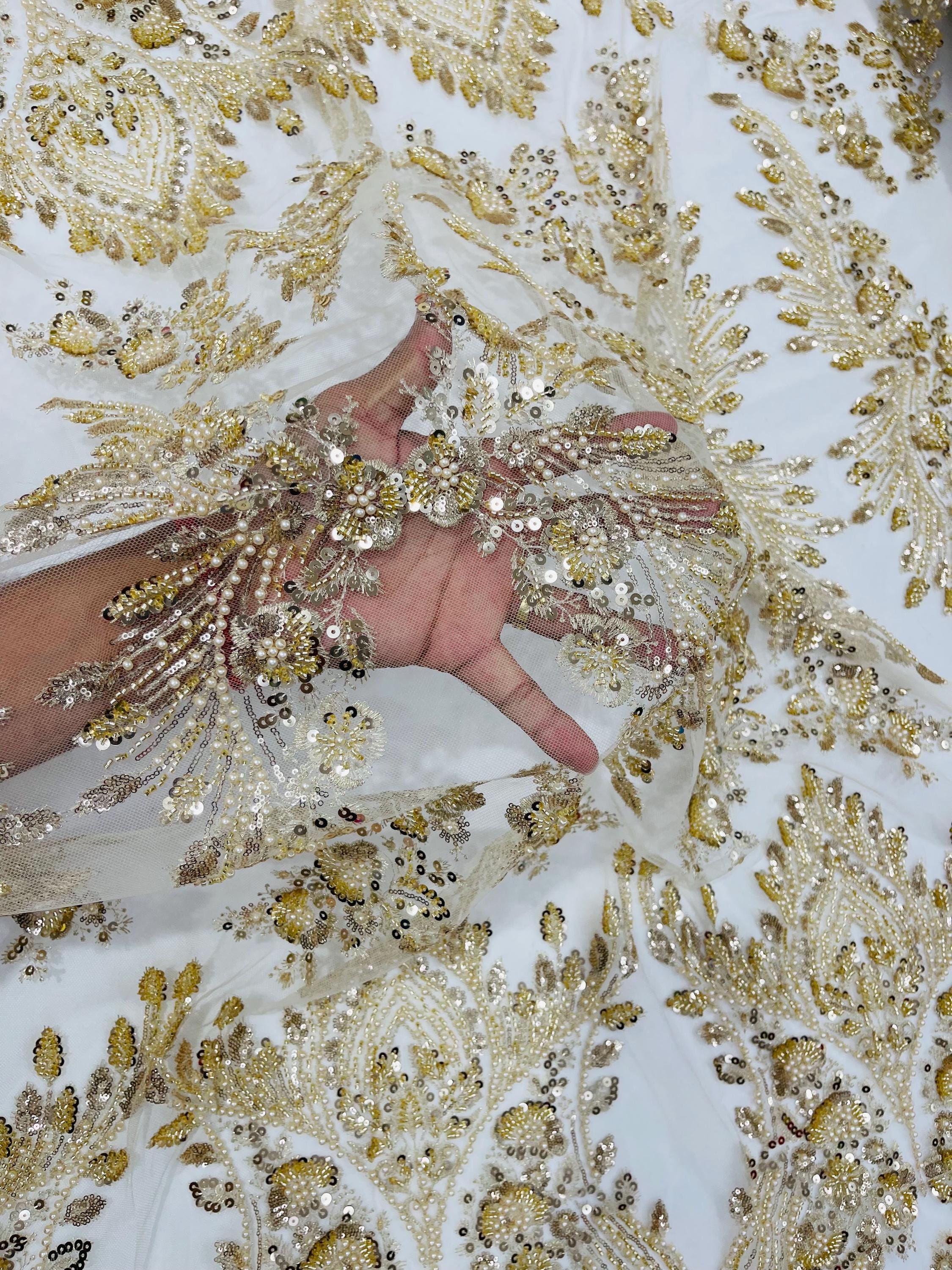 The beautiful design includes embroidered wavy plants patterns with beads across a mesh fabric of great quality. It has a beautiful border on both ends. This lace can be used for dresses, tablecloths, nightgowns, prom gowns, bridesmaid gowns, wedding gowns, table covers/runners, pillows, home /event decorations, and much more.