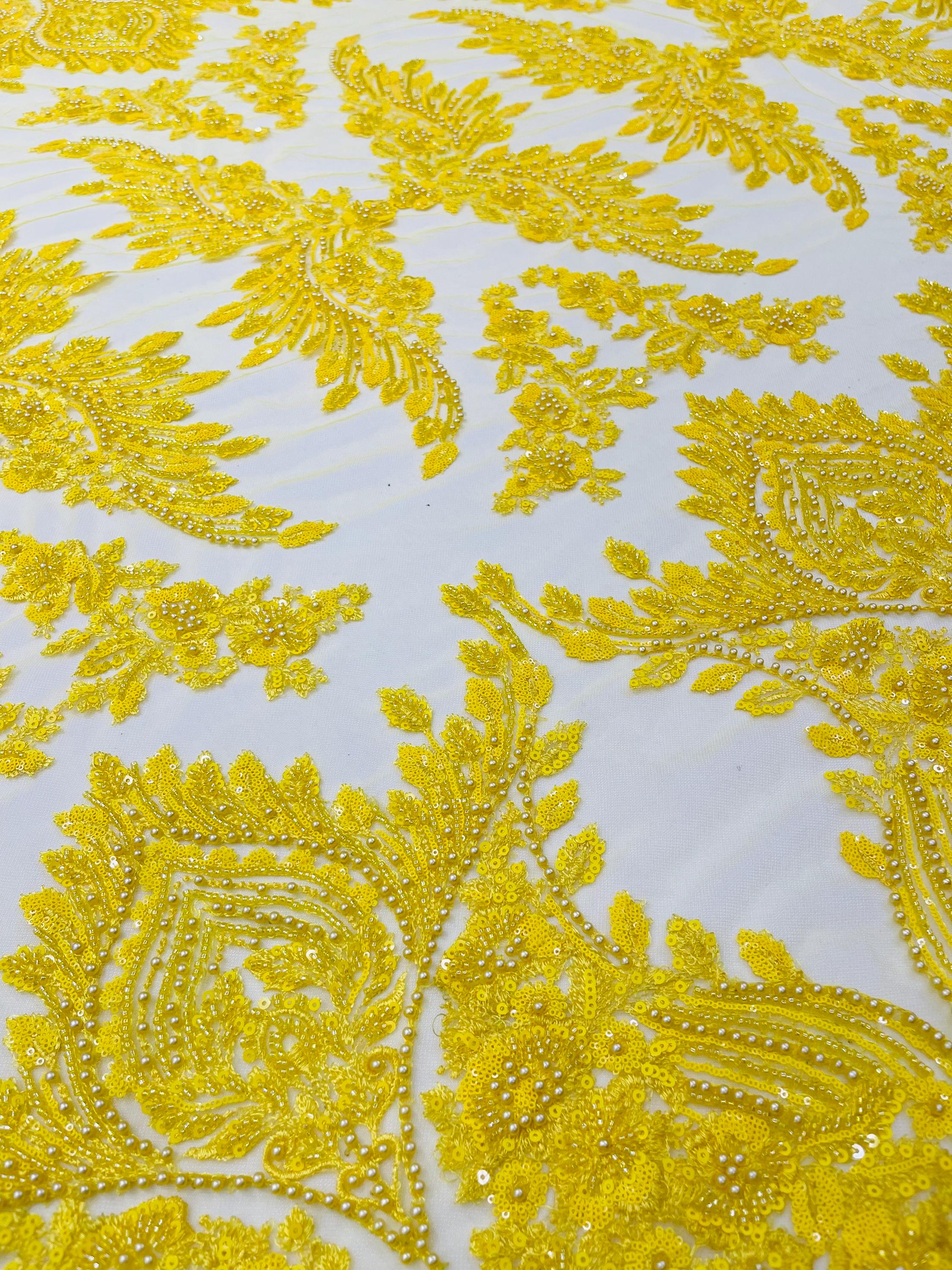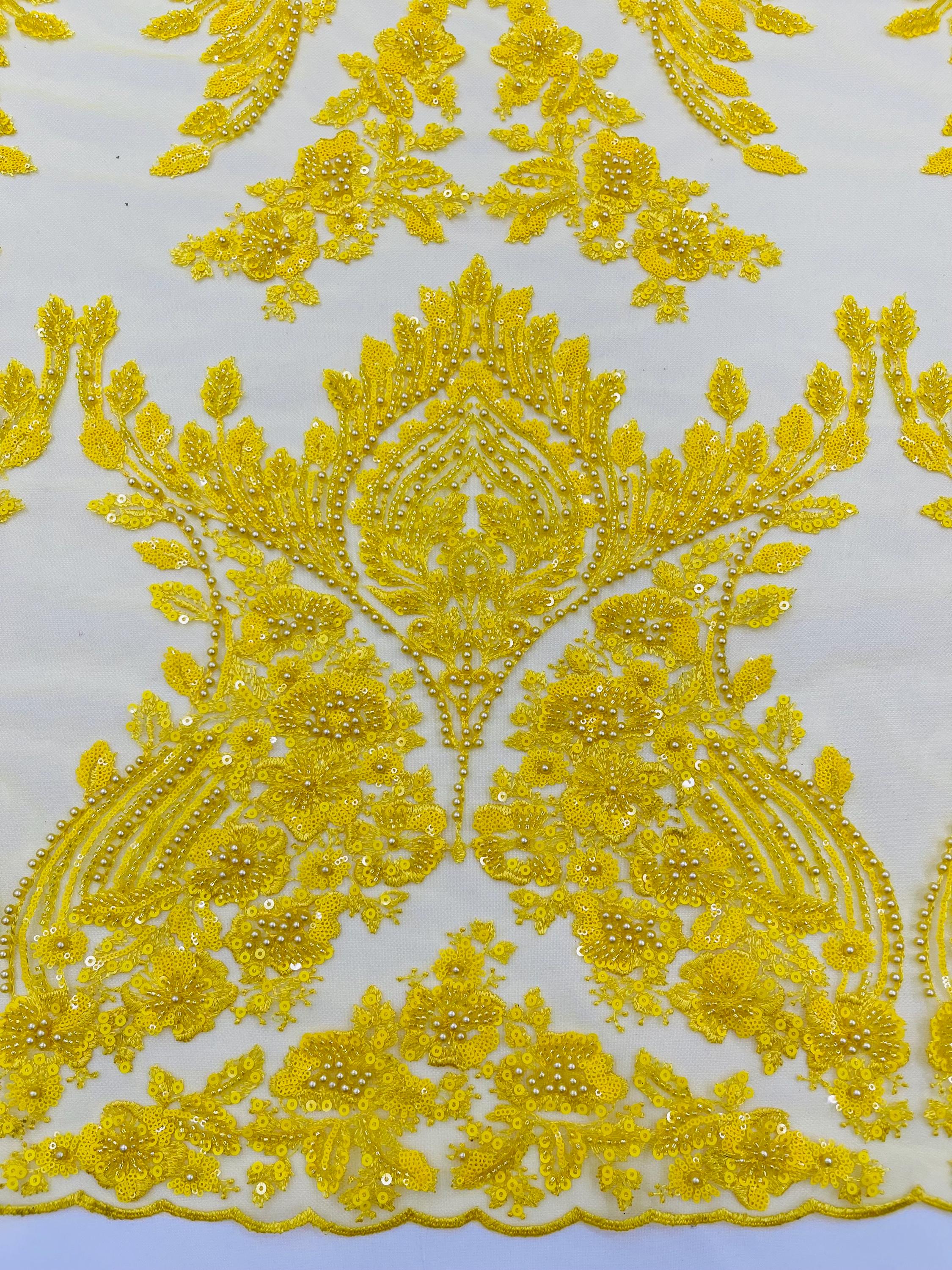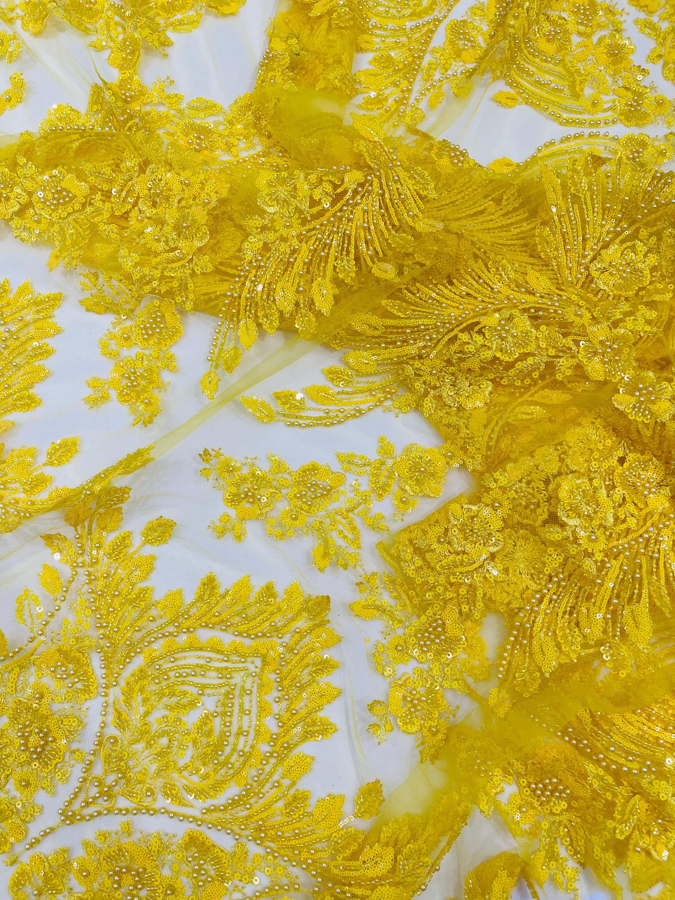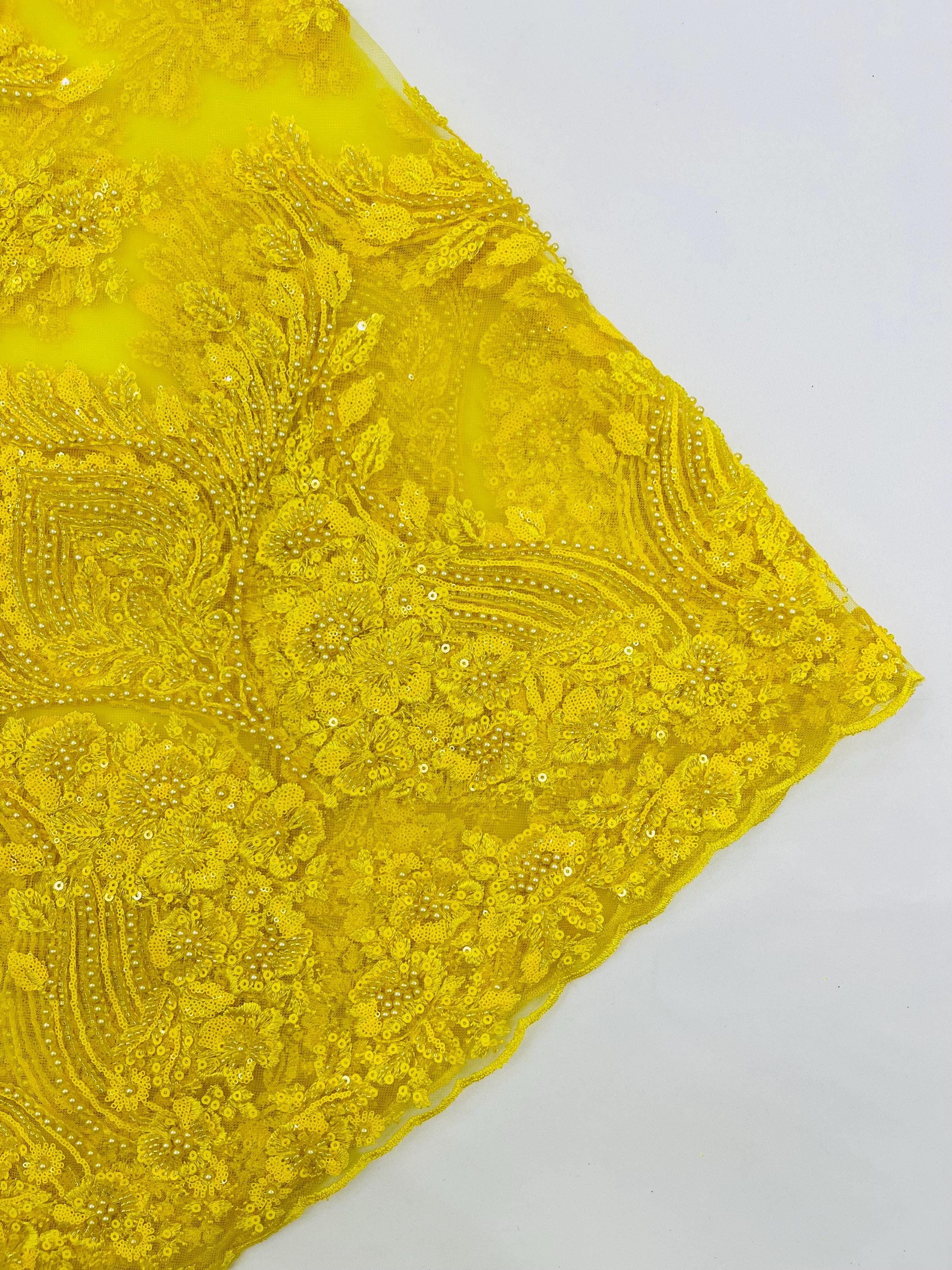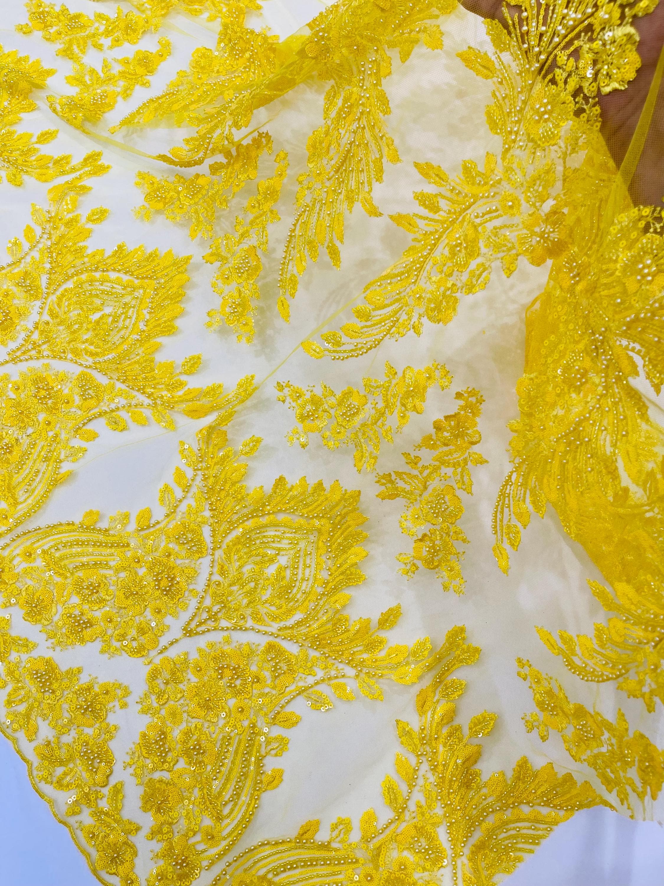 The beautiful design includes embroidered wavy plants patterns with beads across a mesh fabric of great quality. It has a beautiful border on both ends. This lace can be used for dresses, tablecloths, nightgowns, prom gowns, bridesmaid gowns, wedding gowns, table covers/runners, pillows, home /event decorations, and much more.