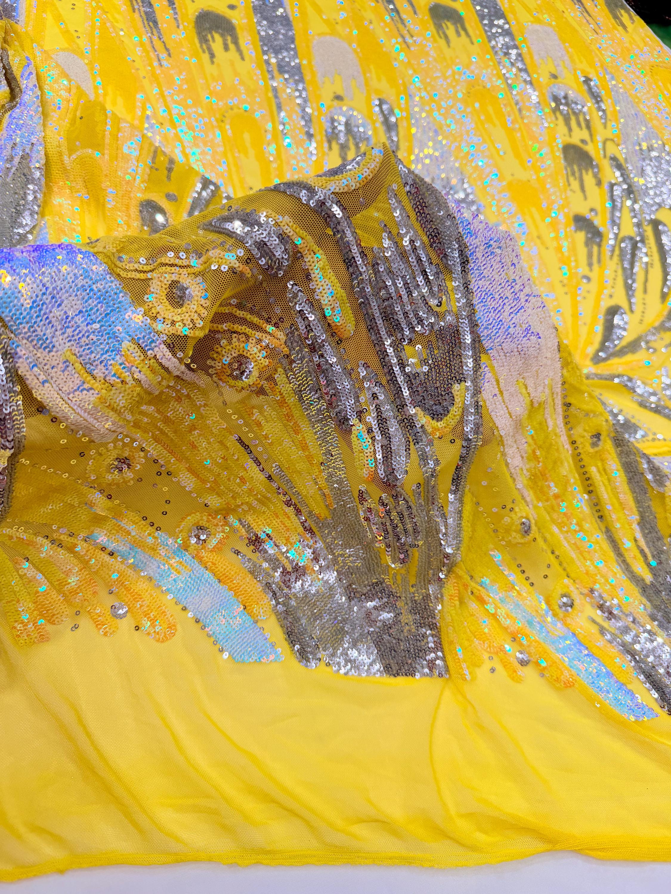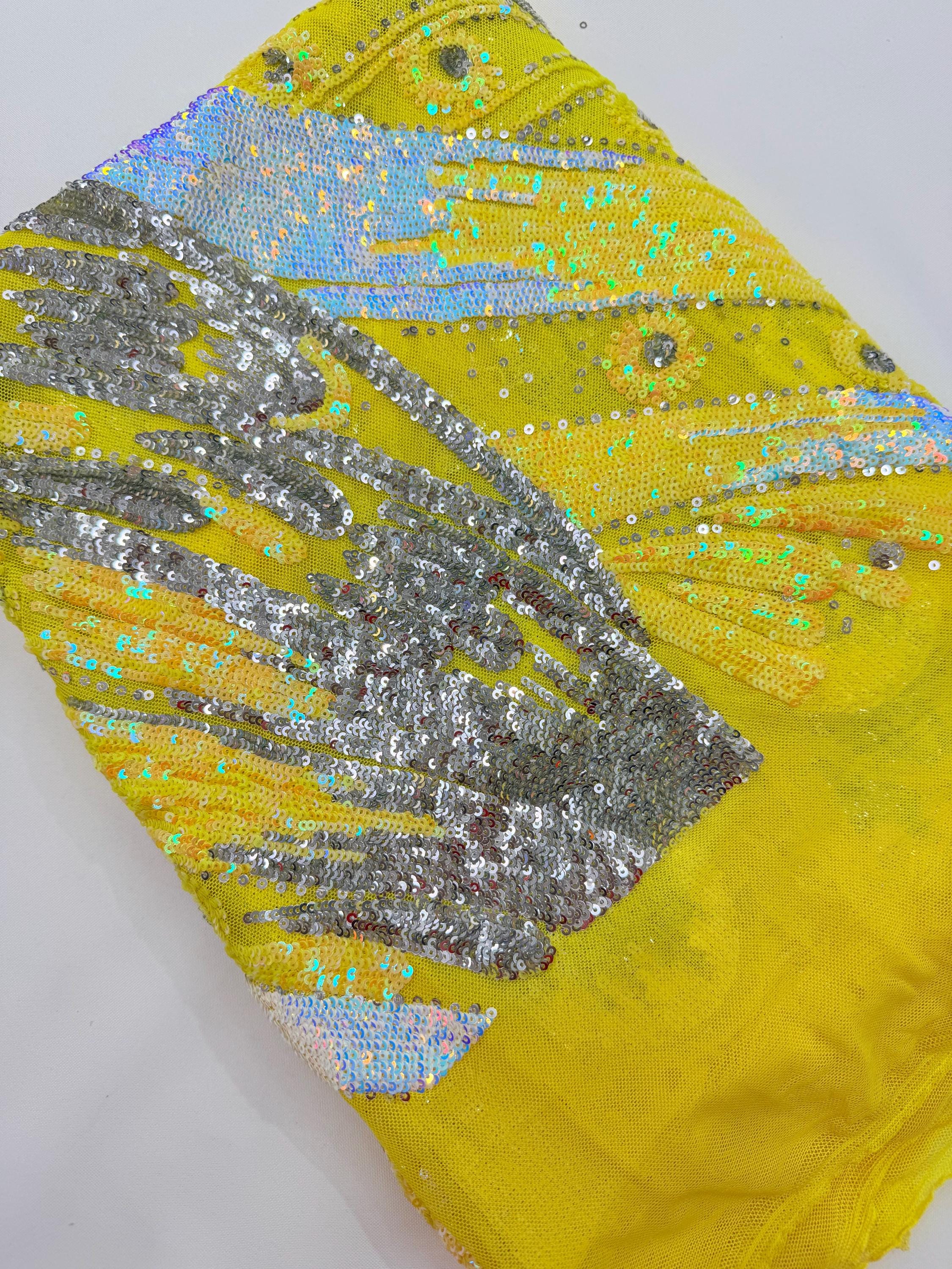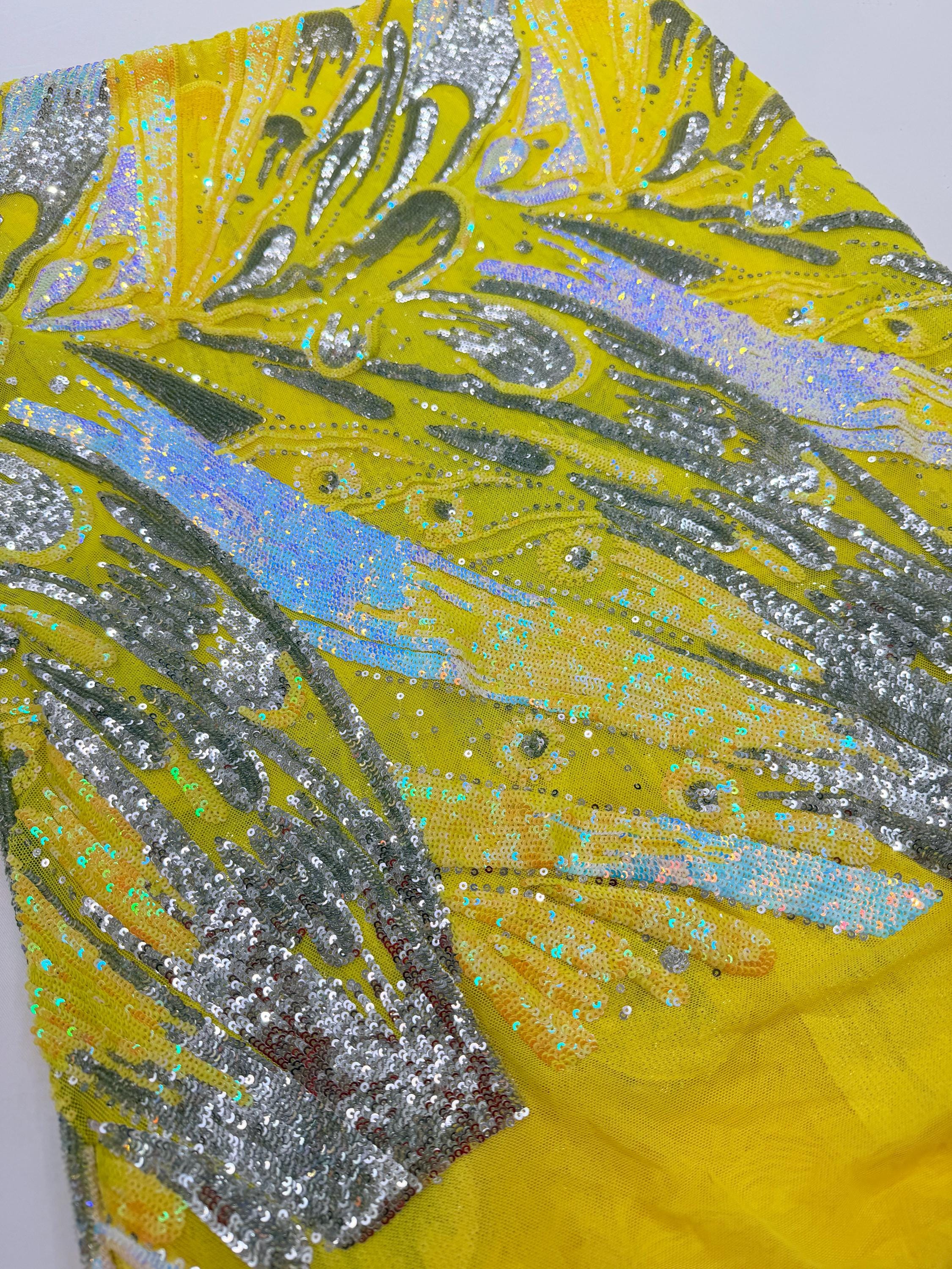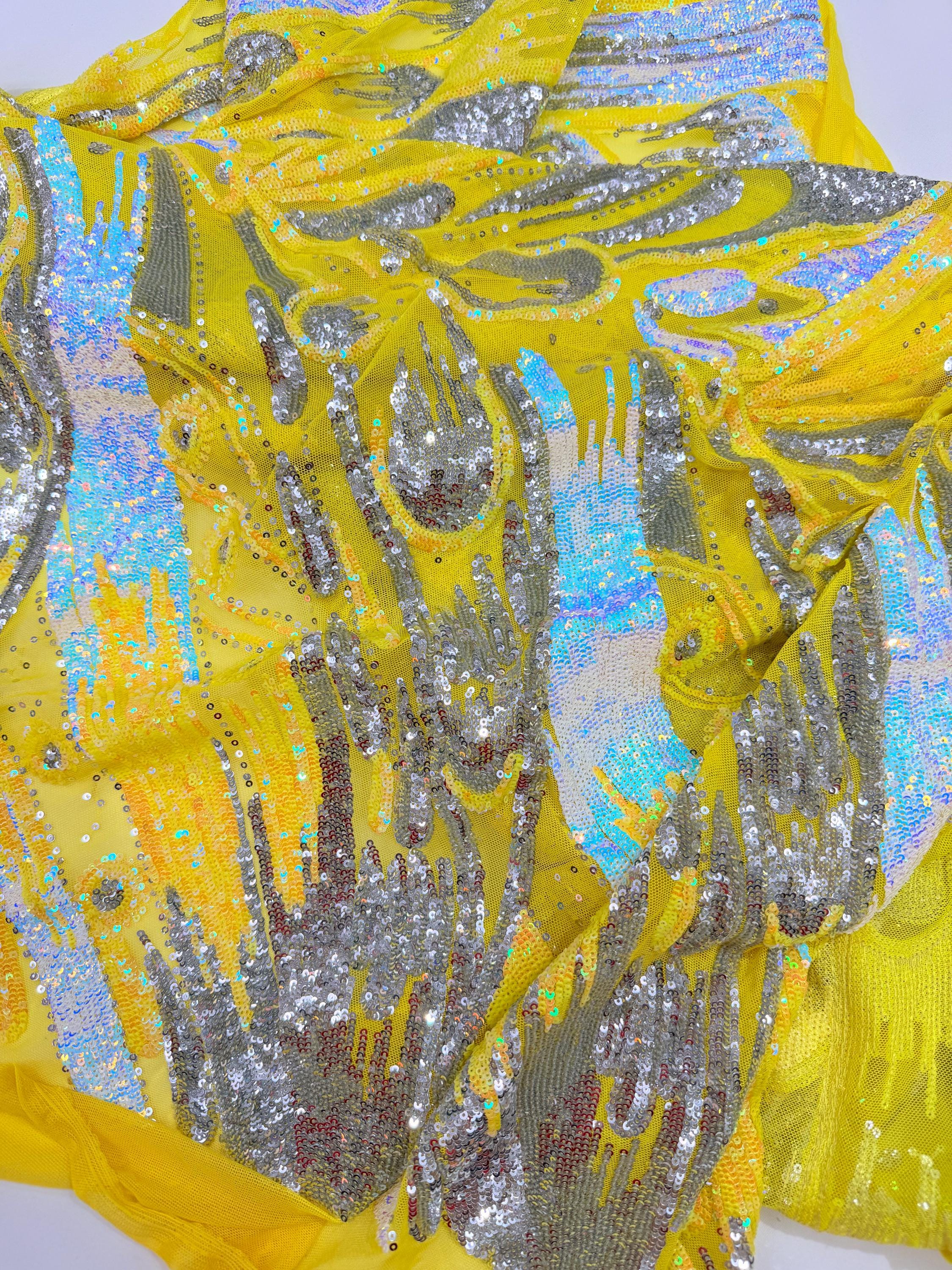 The material has a luxurious sequin design embroidered on the mesh.