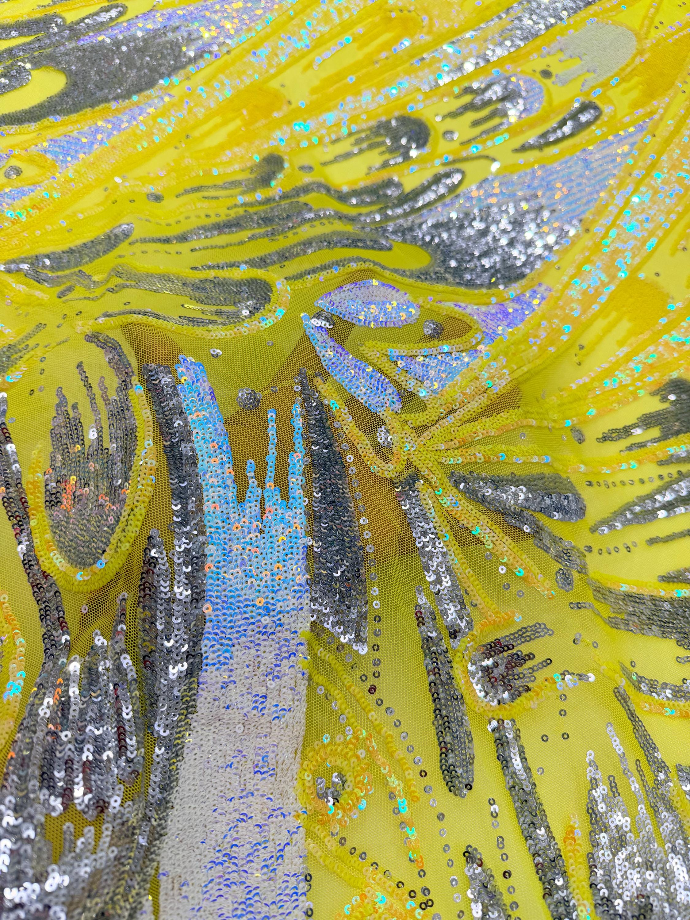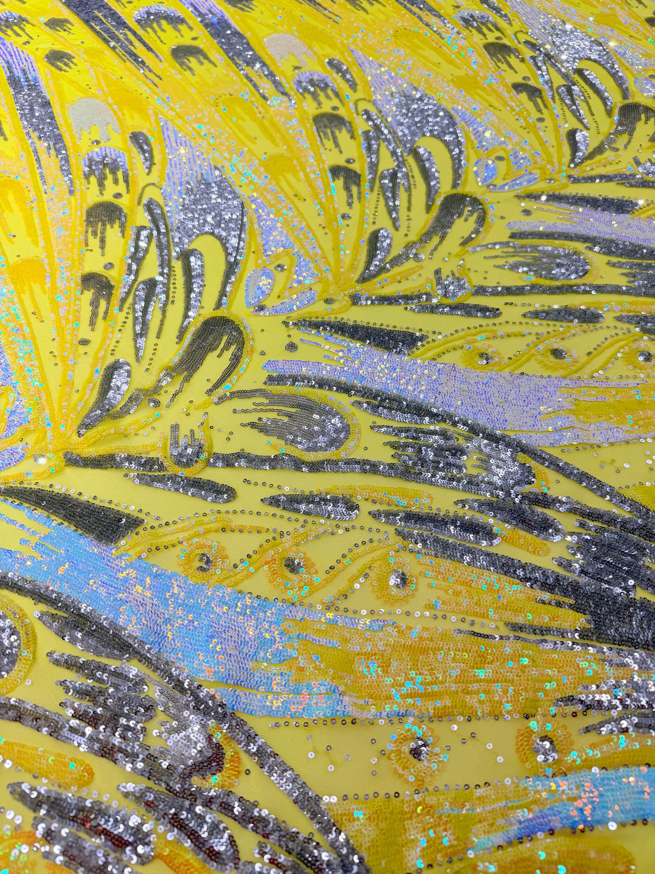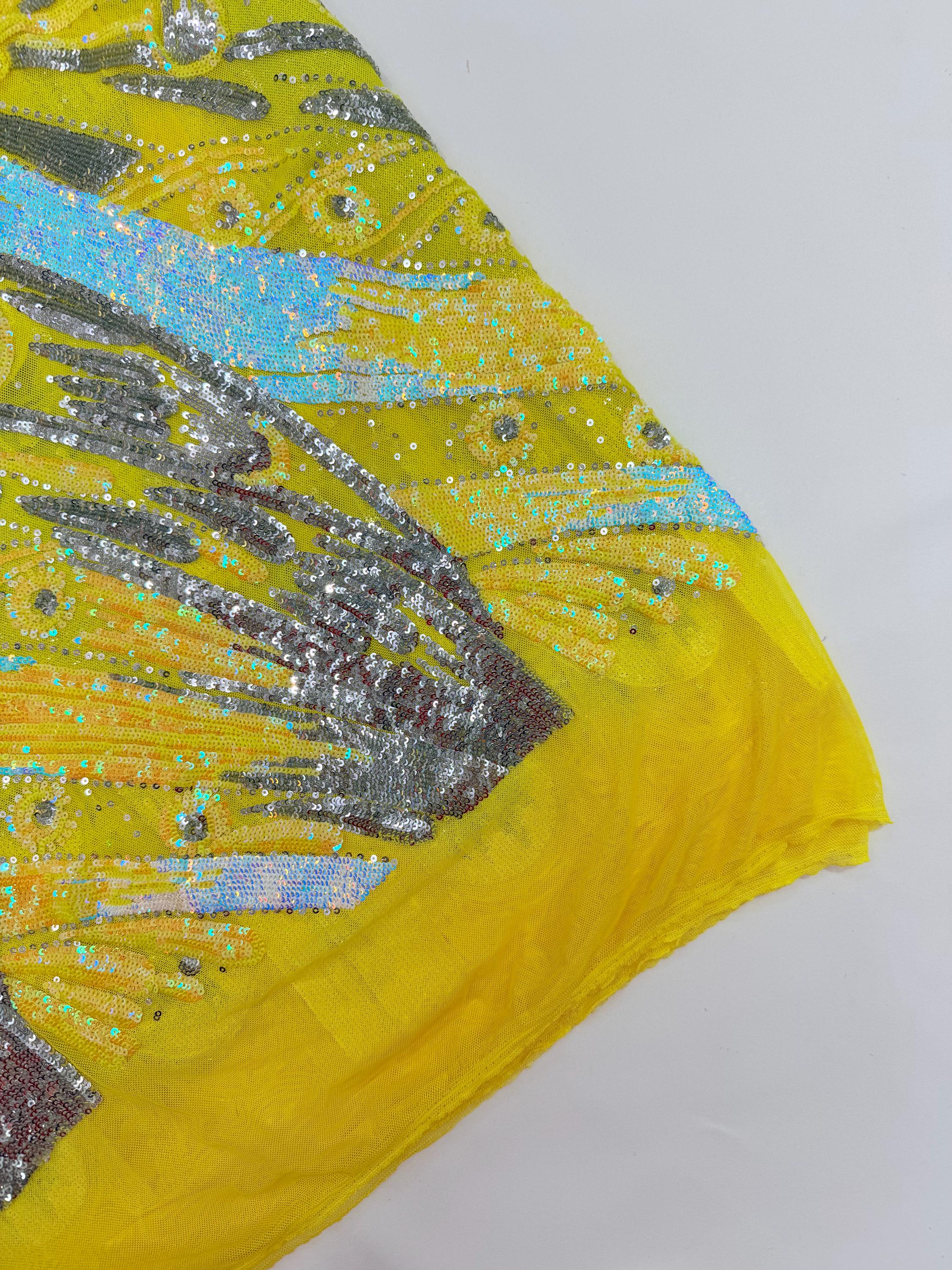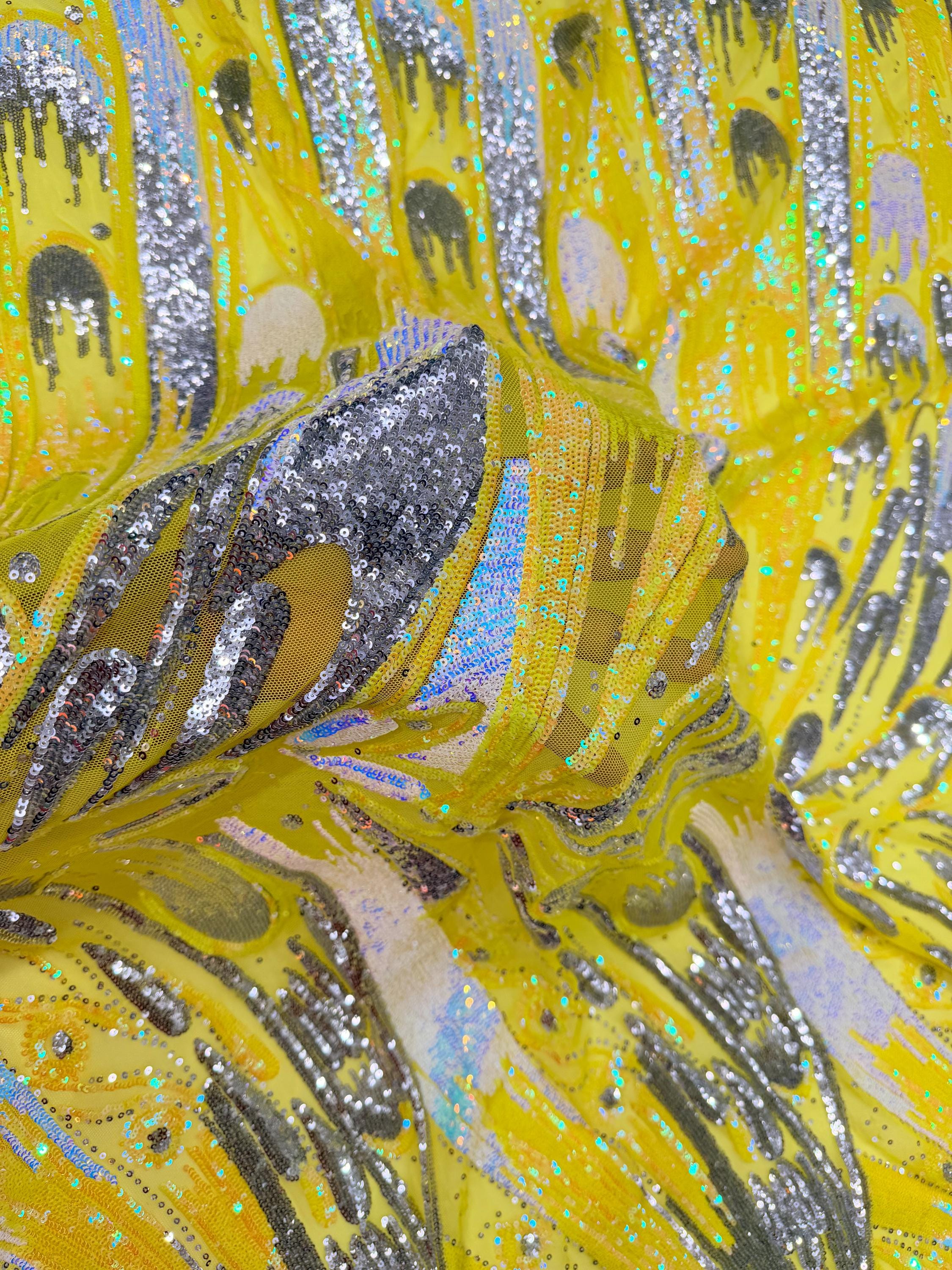 The material has a luxurious sequin design embroidered on the mesh.
