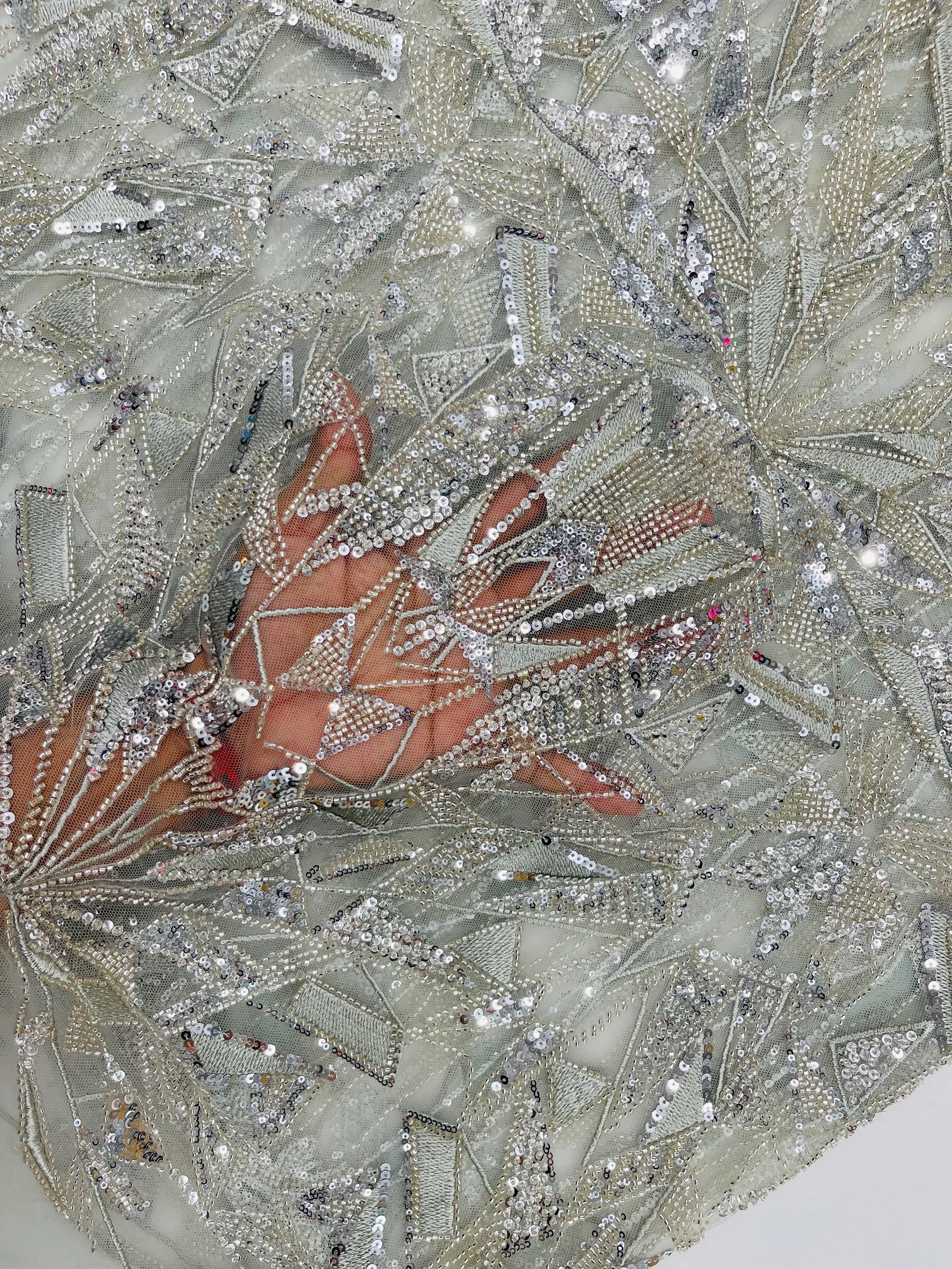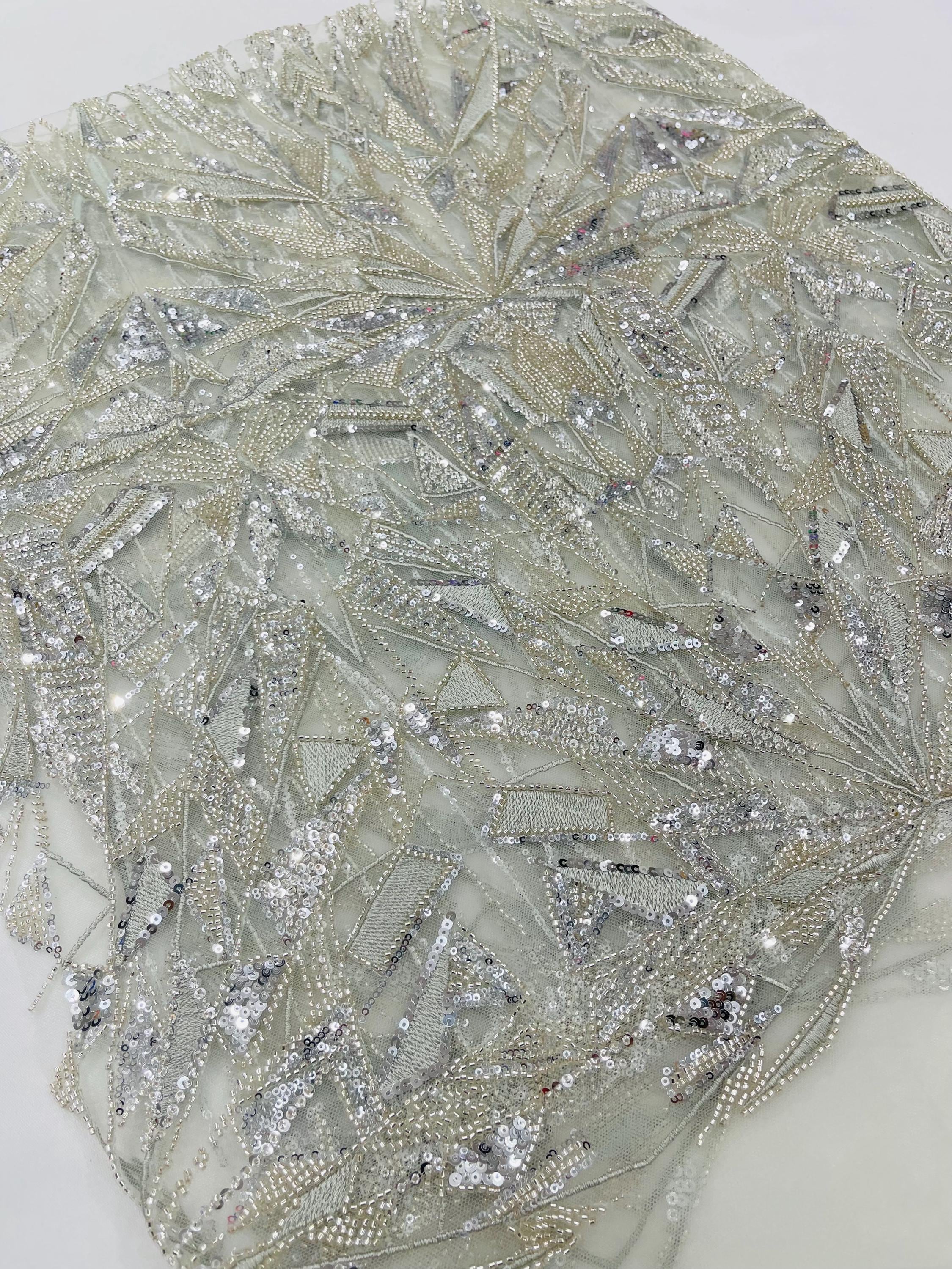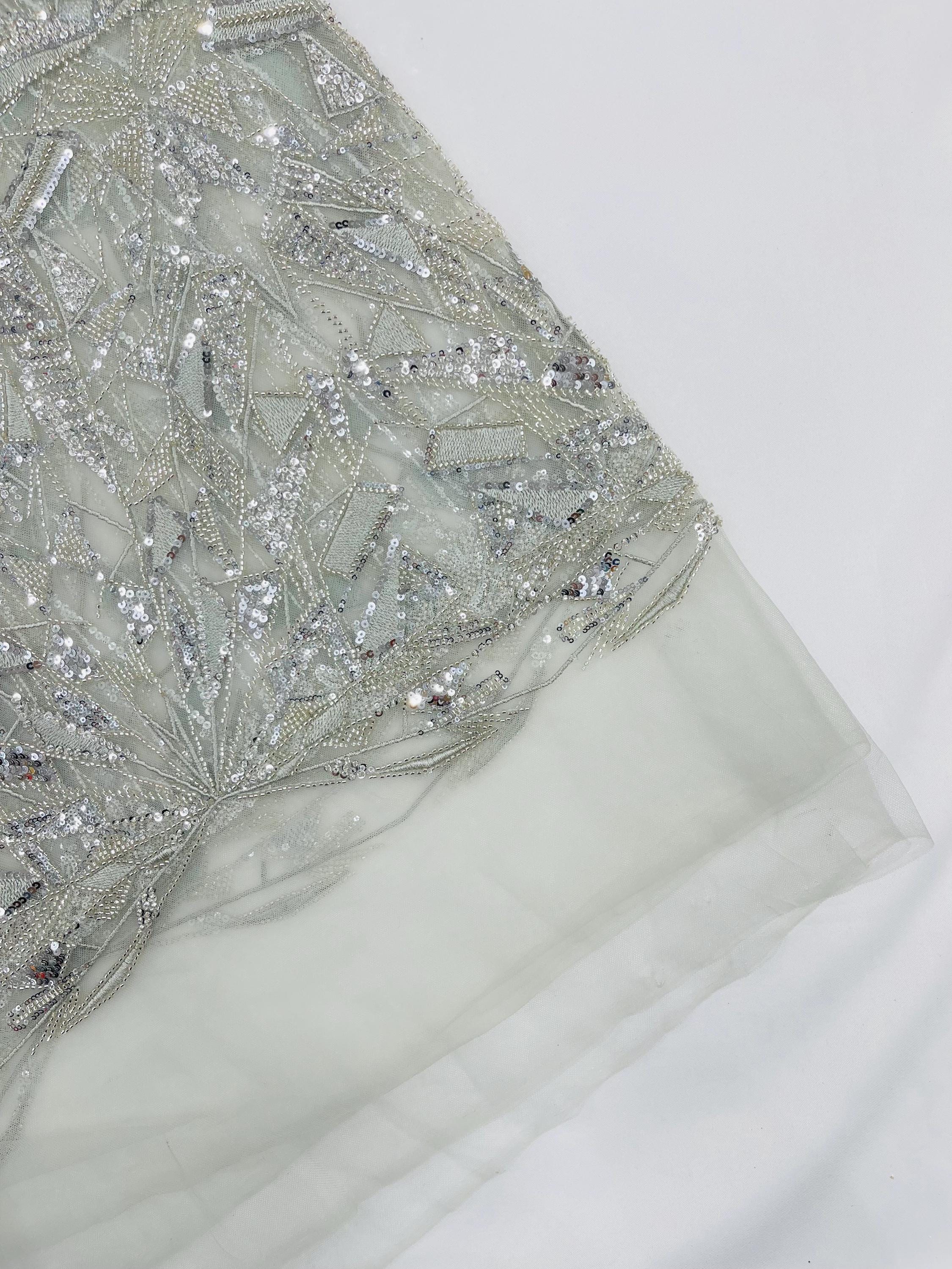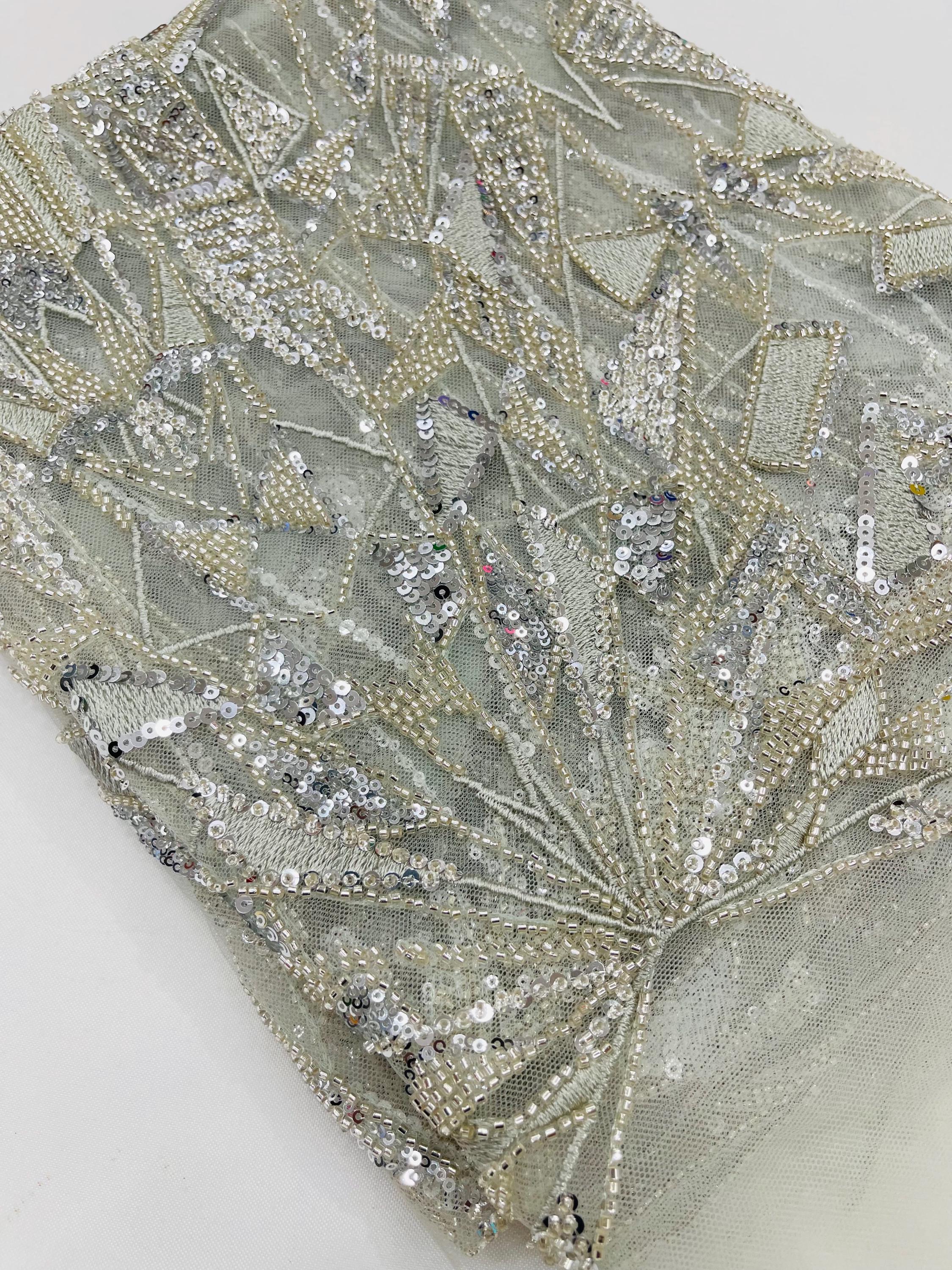 The beautiful design includes embroidered wavy leaf patterns with beads across a mesh fabric of great quality. It has a beautiful border on both ends. This lace can be used for dresses, tablecloths, nightgowns, prom gowns, bridesmaid gowns, wedding gowns, table covers/runners, pillows, home /event decorations, and much more.