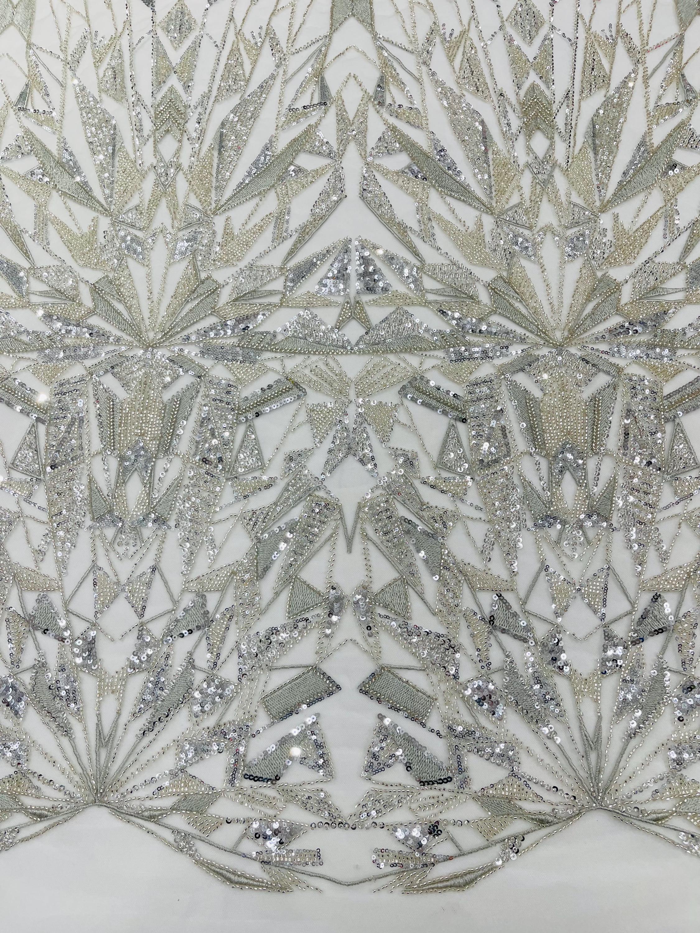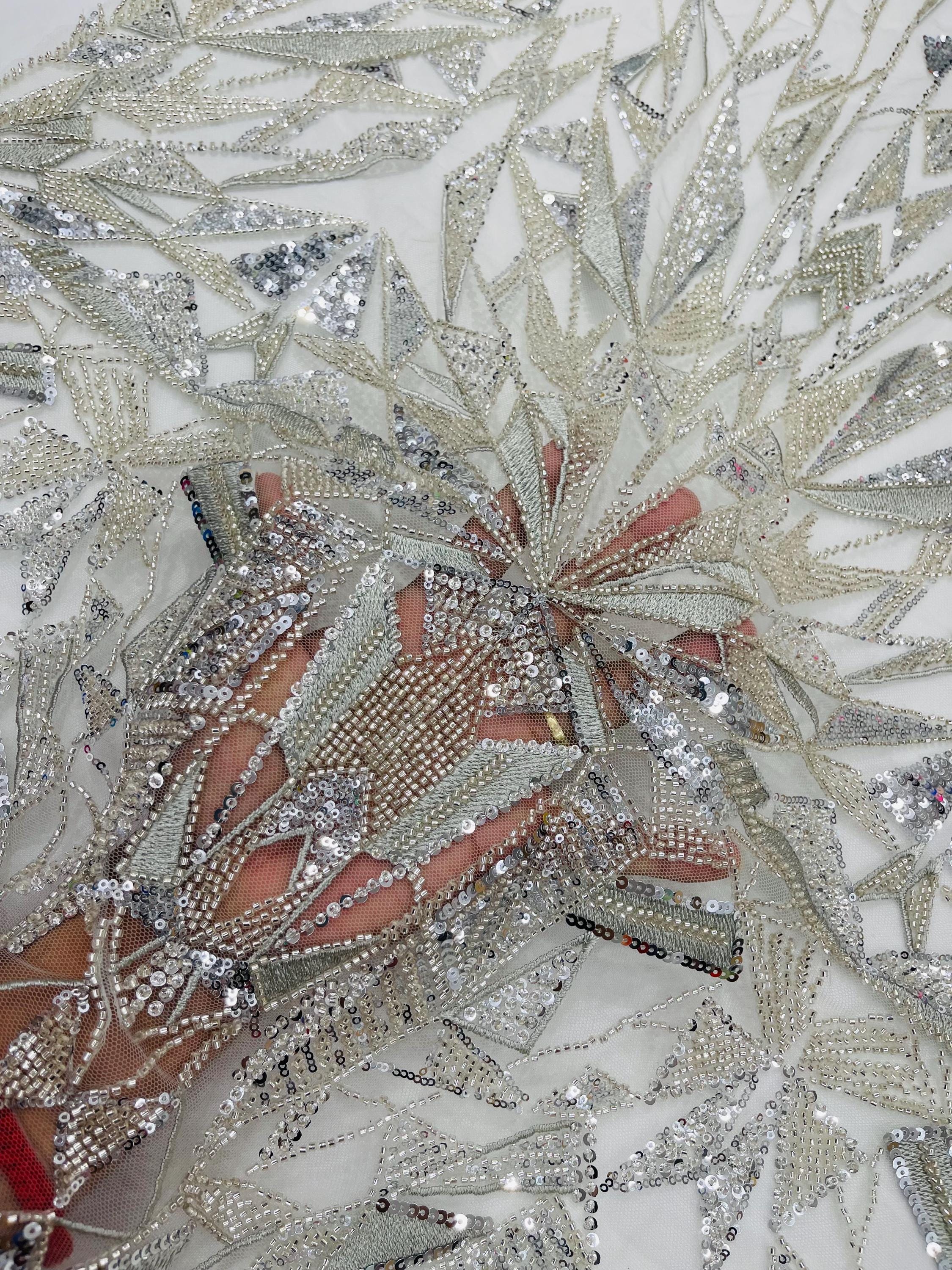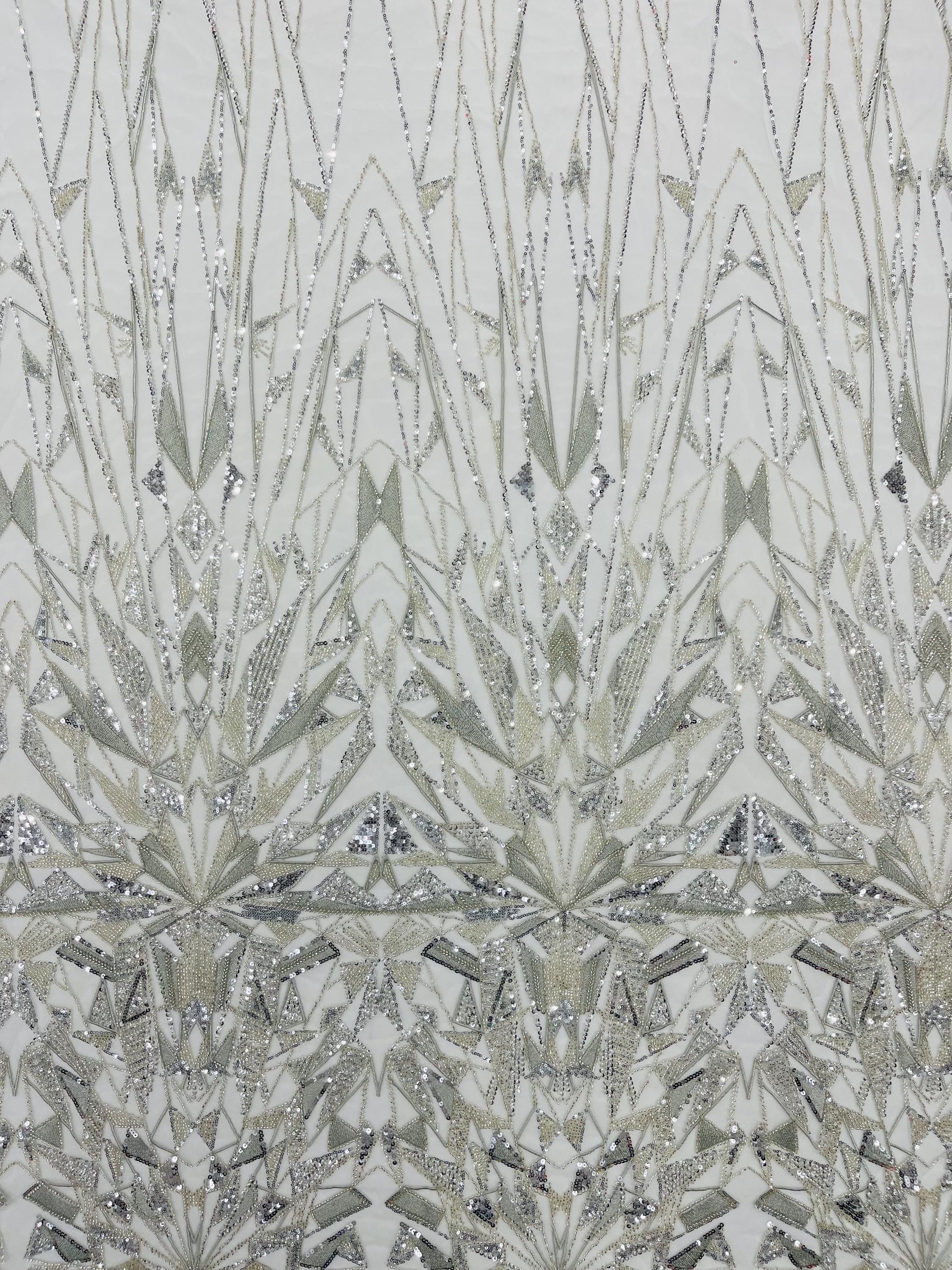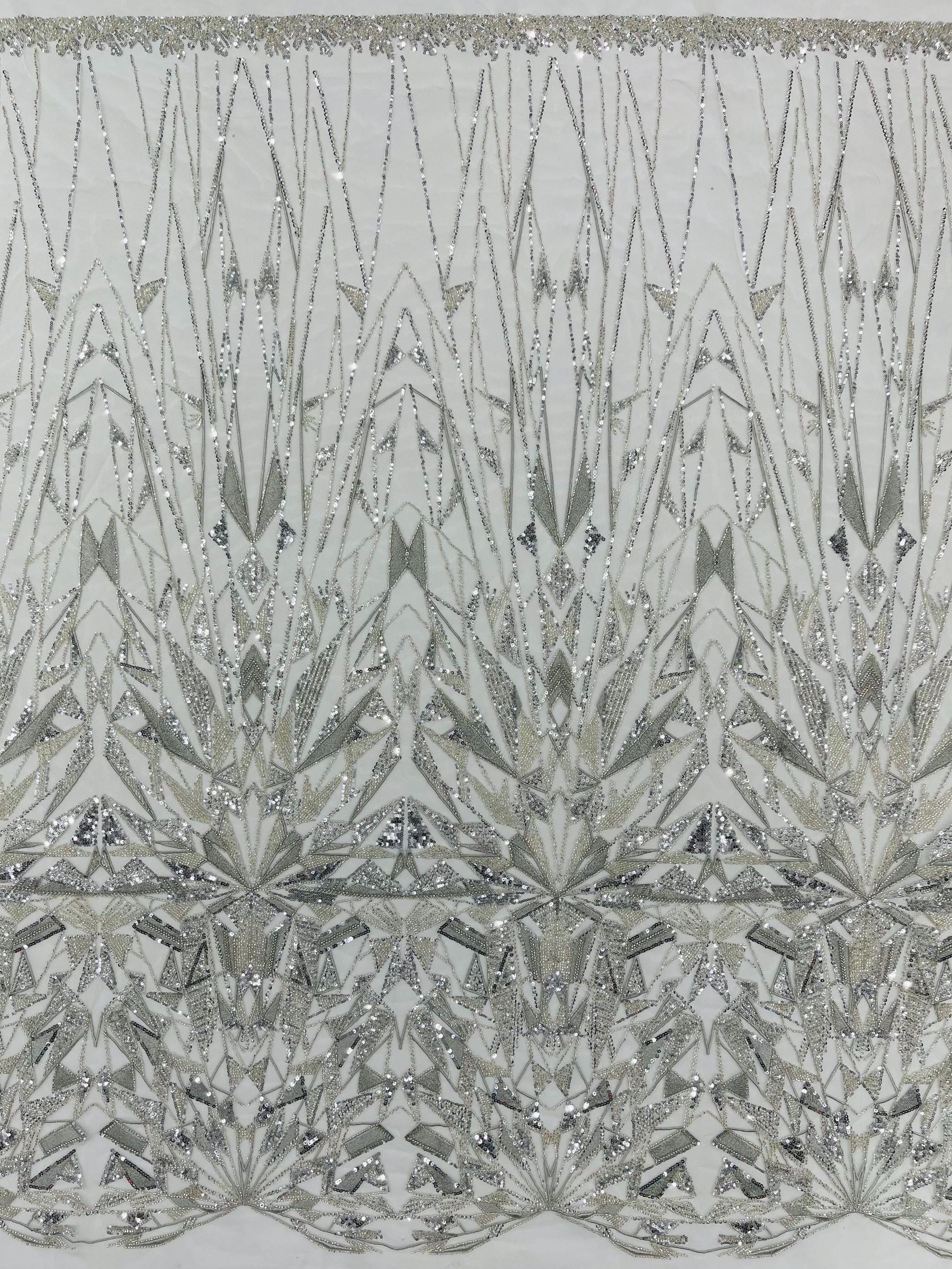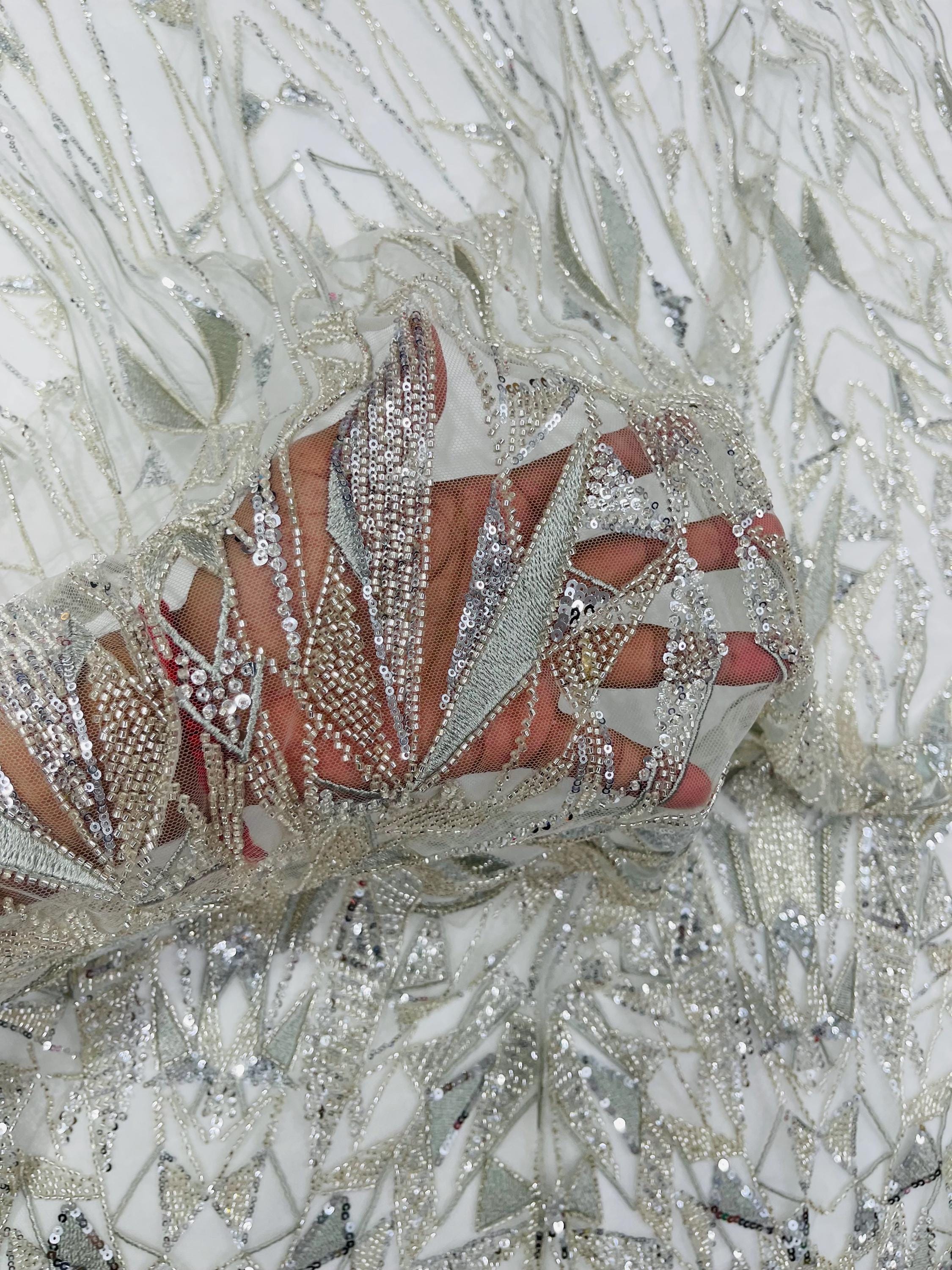 The beautiful design includes embroidered wavy leaf patterns with beads across a mesh fabric of great quality. It has a beautiful border on both ends. This lace can be used for dresses, tablecloths, nightgowns, prom gowns, bridesmaid gowns, wedding gowns, table covers/runners, pillows, home /event decorations, and much more.