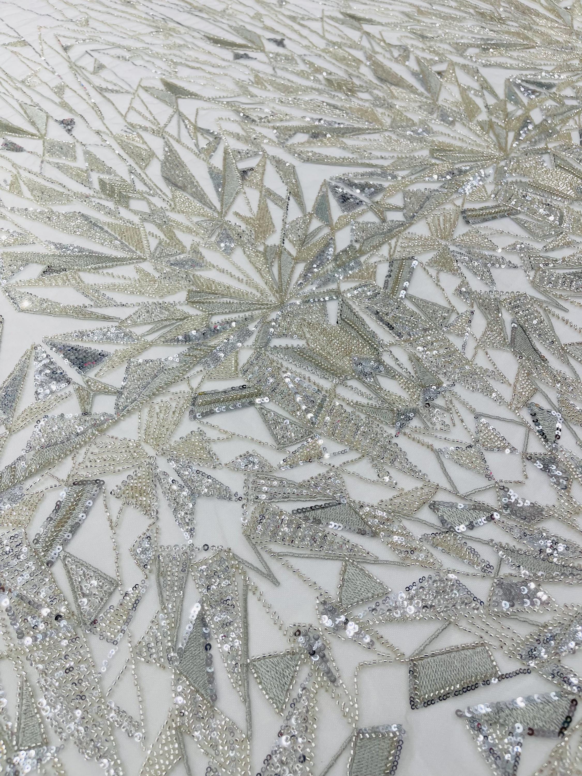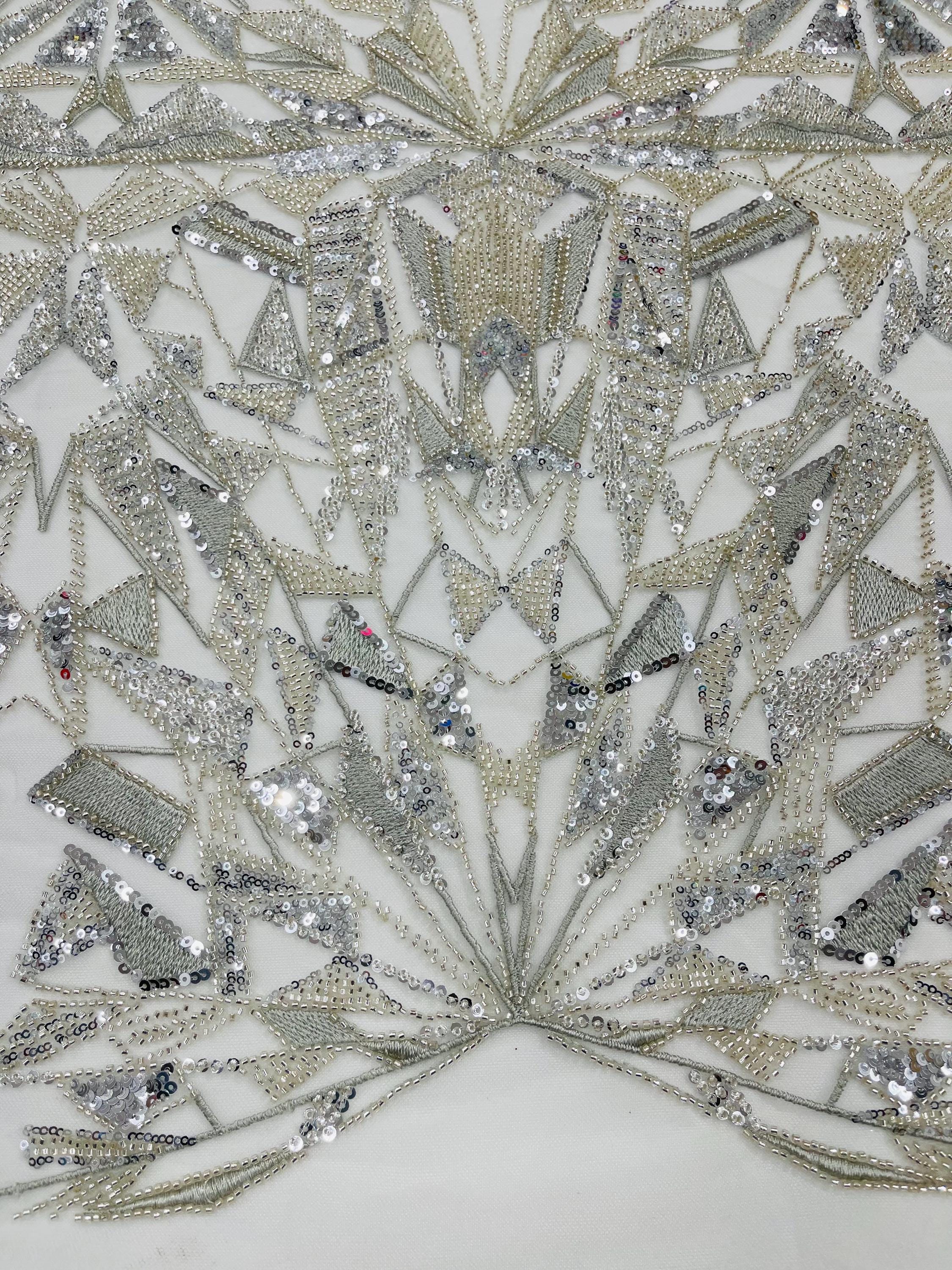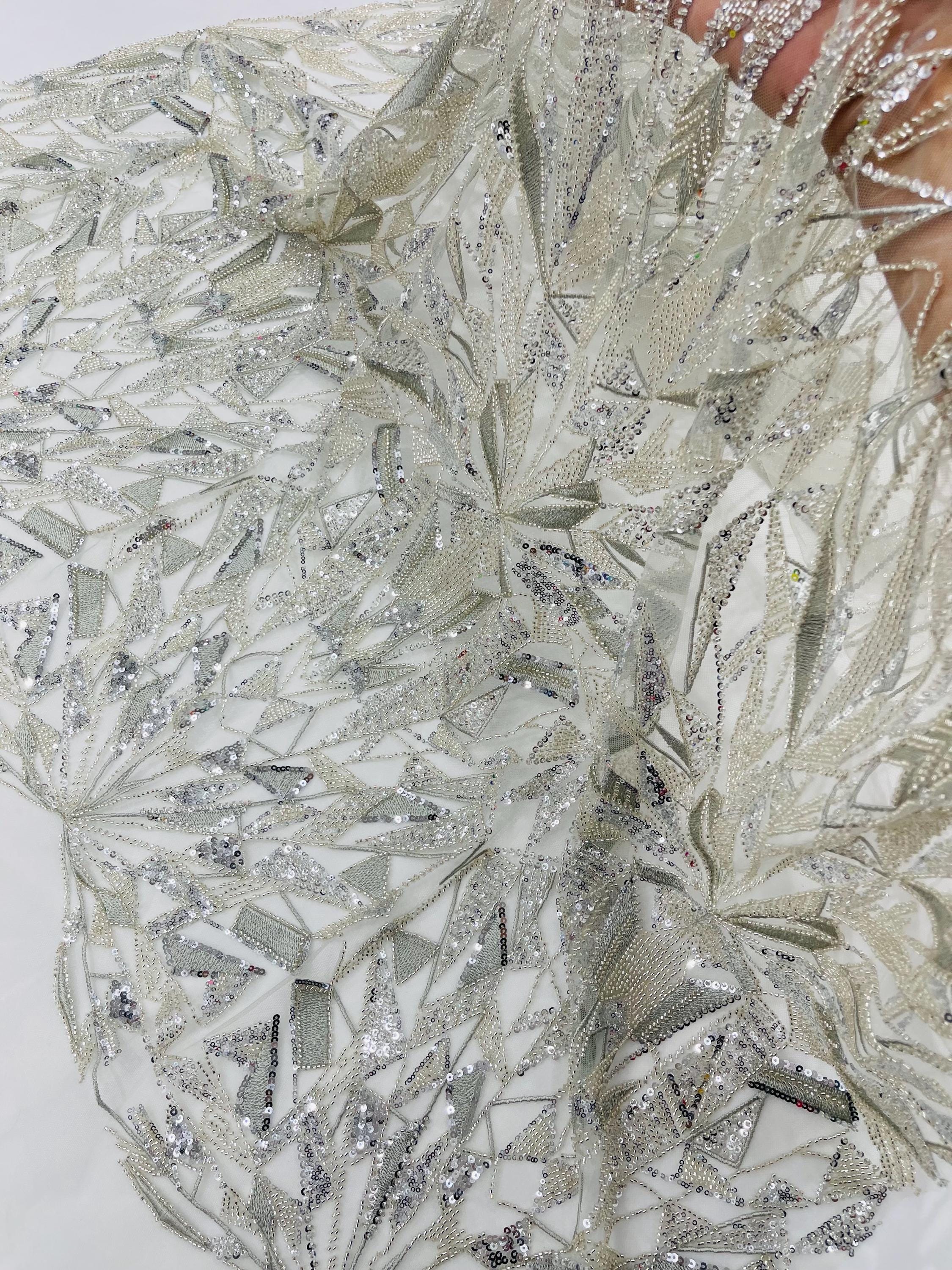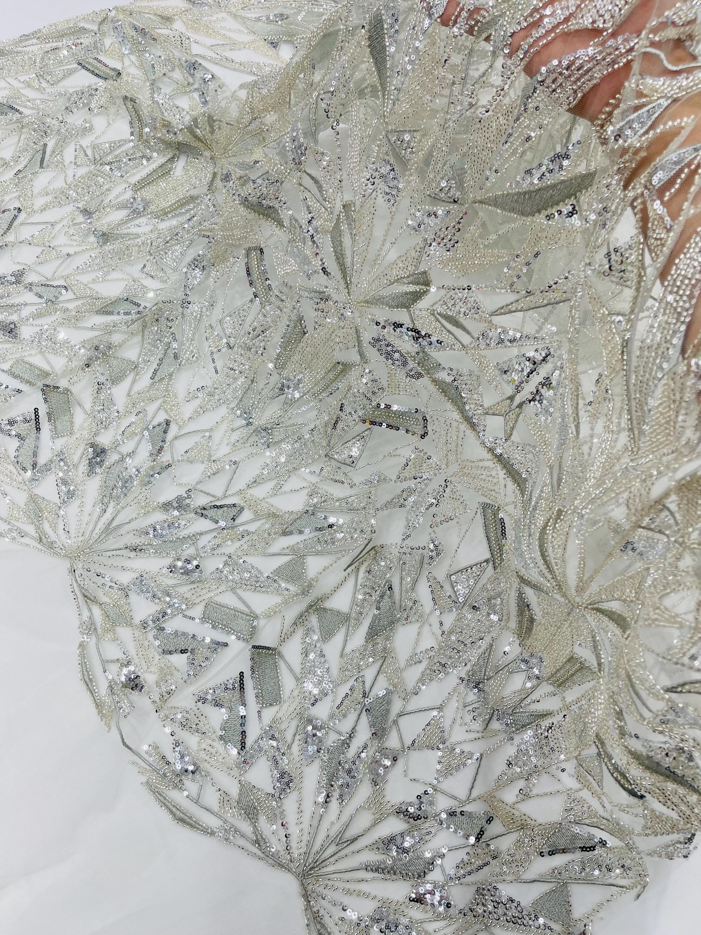 The beautiful design includes embroidered wavy leaf patterns with beads across a mesh fabric of great quality. It has a beautiful border on both ends. This lace can be used for dresses, tablecloths, nightgowns, prom gowns, bridesmaid gowns, wedding gowns, table covers/runners, pillows, home /event decorations, and much more.