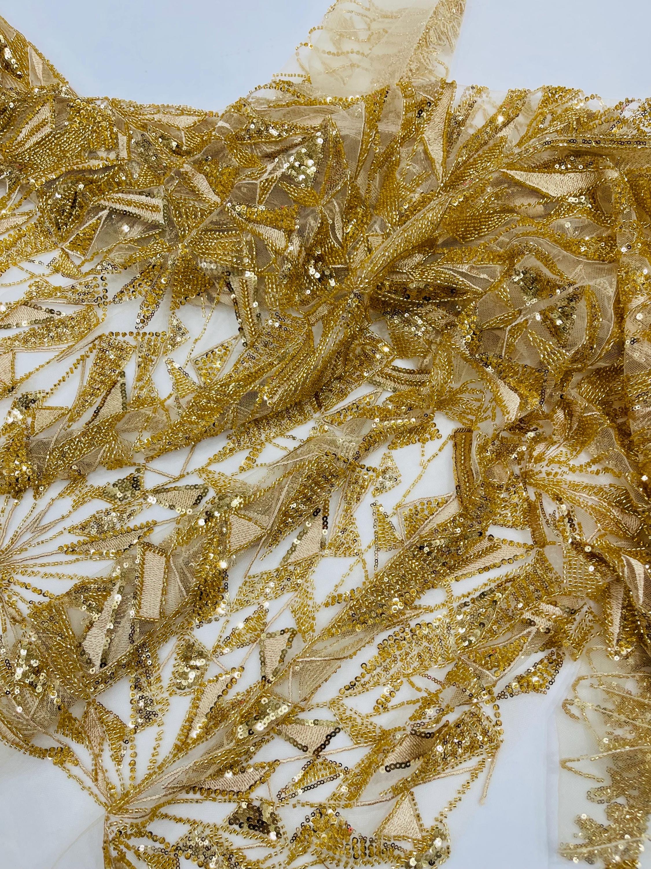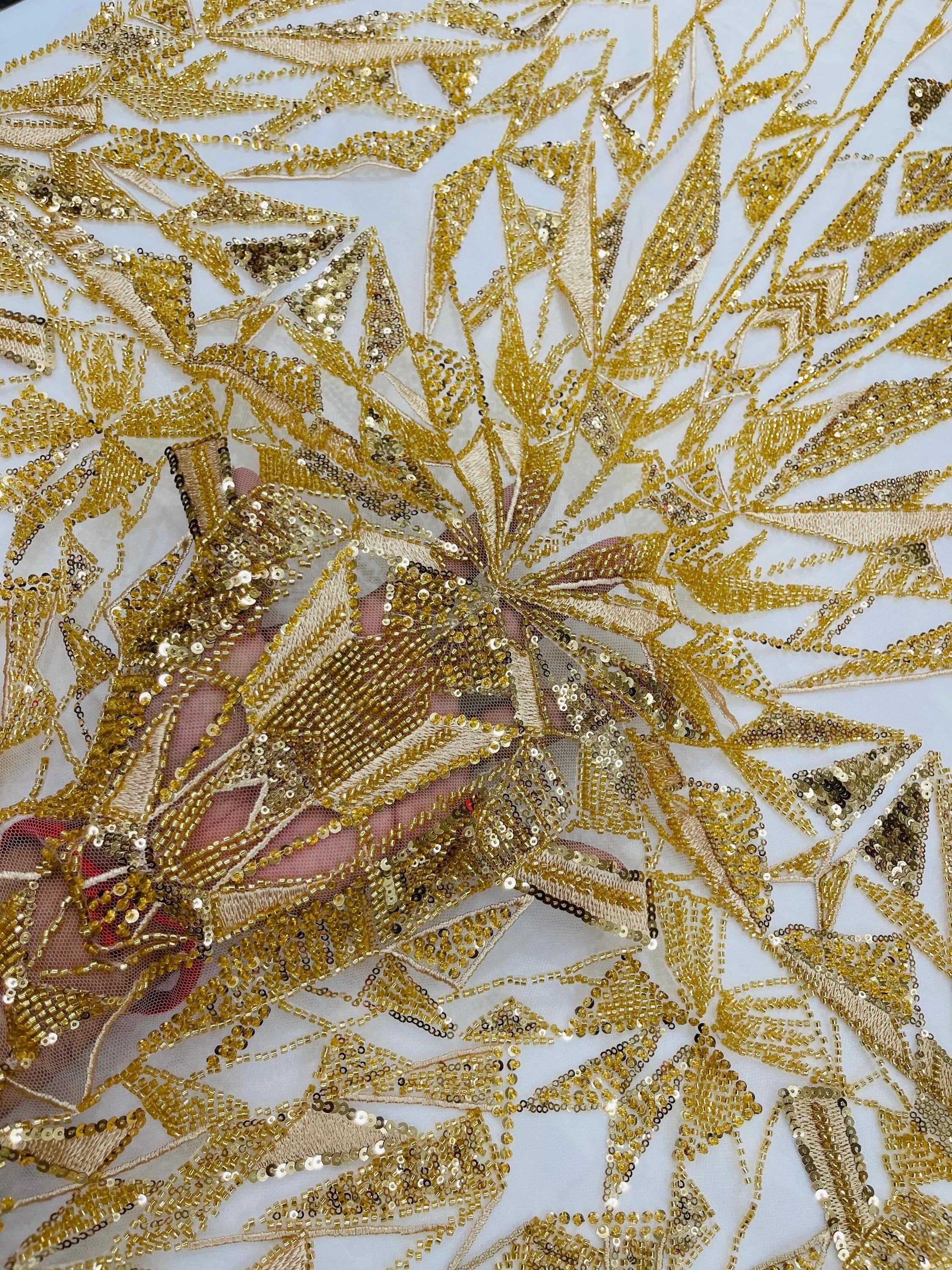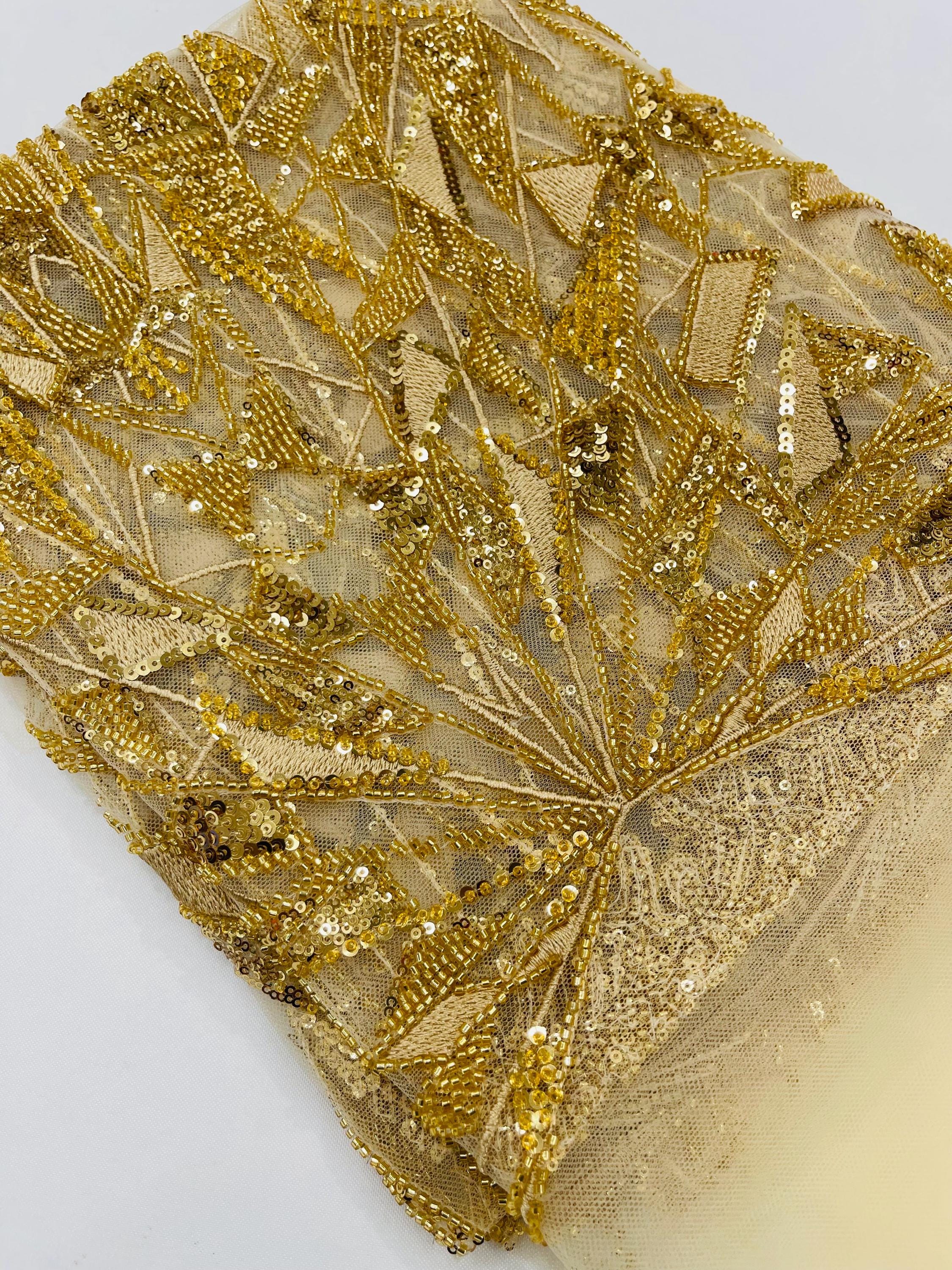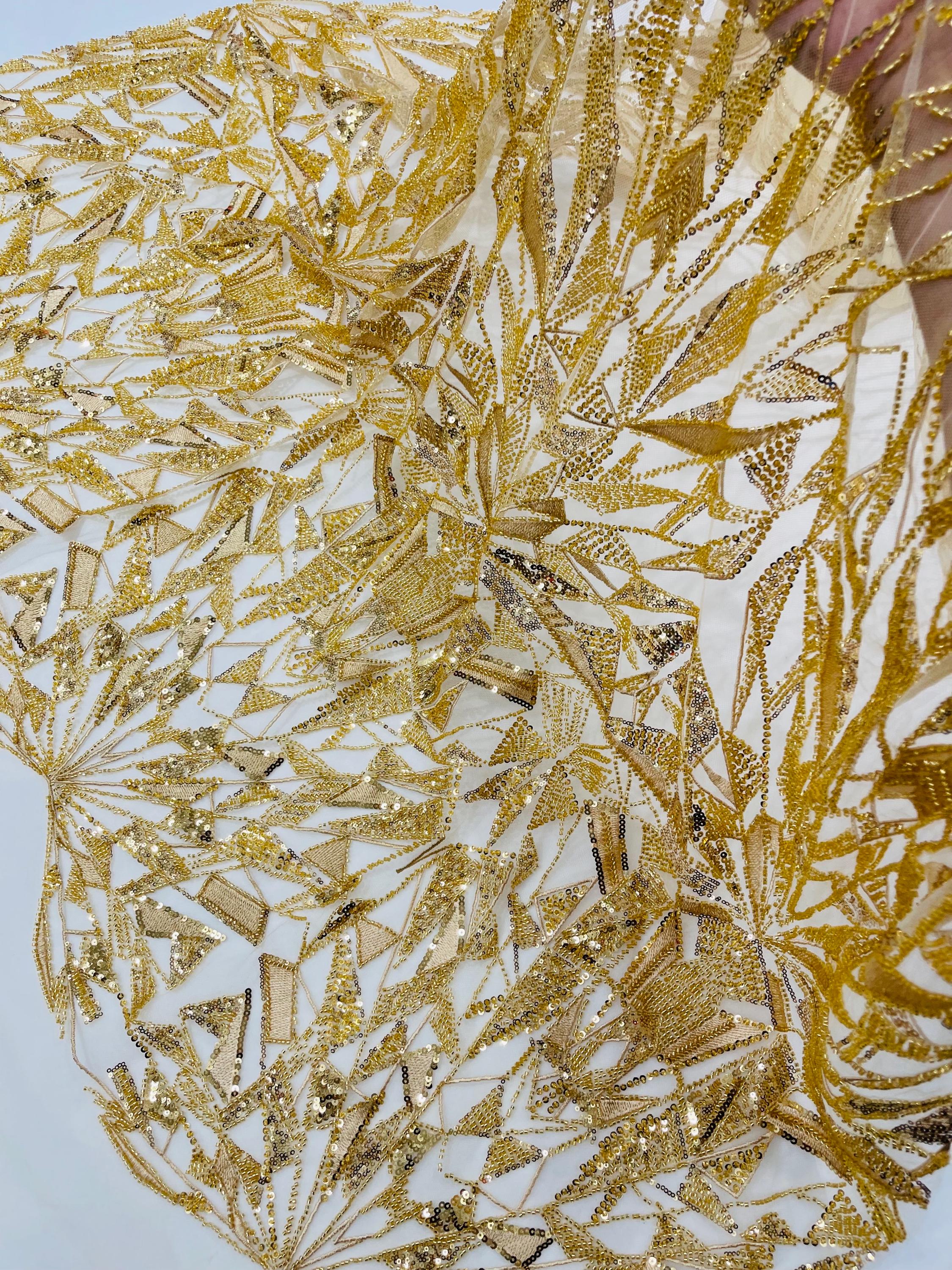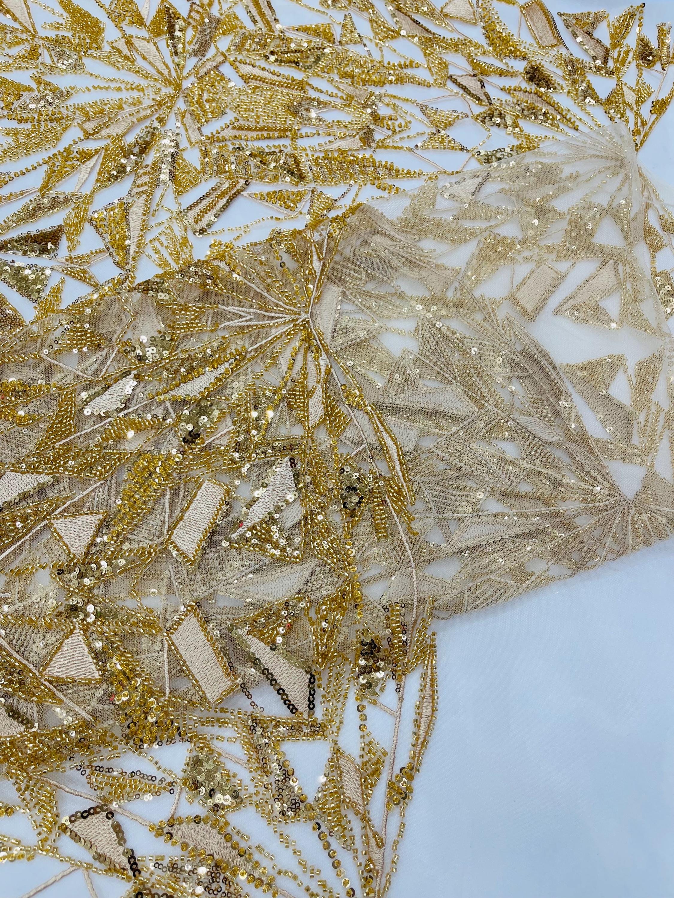 Gold Beaded Lace Fabric: Geometric Sequins on Mesh, Bridal Wedding Dress
