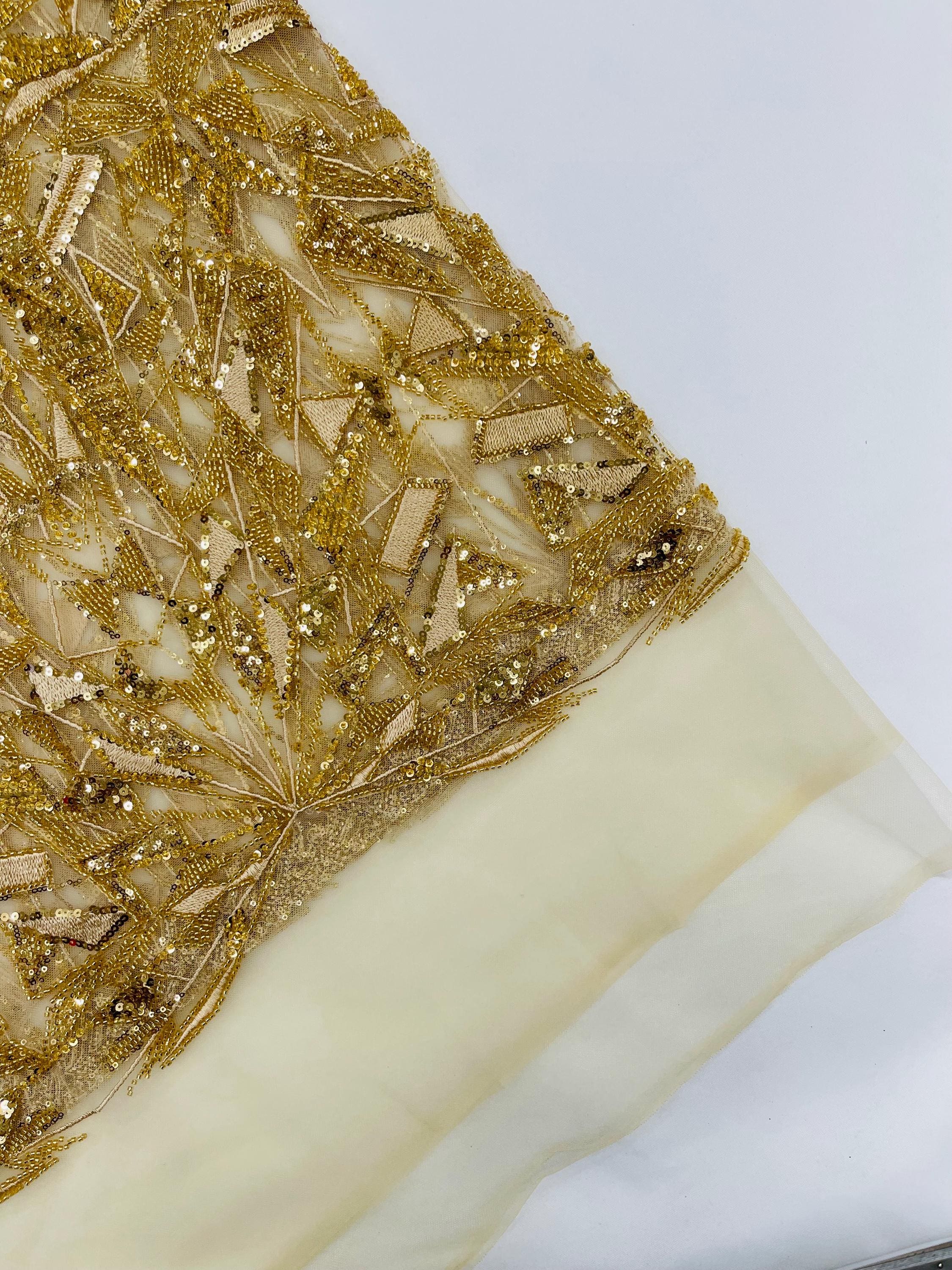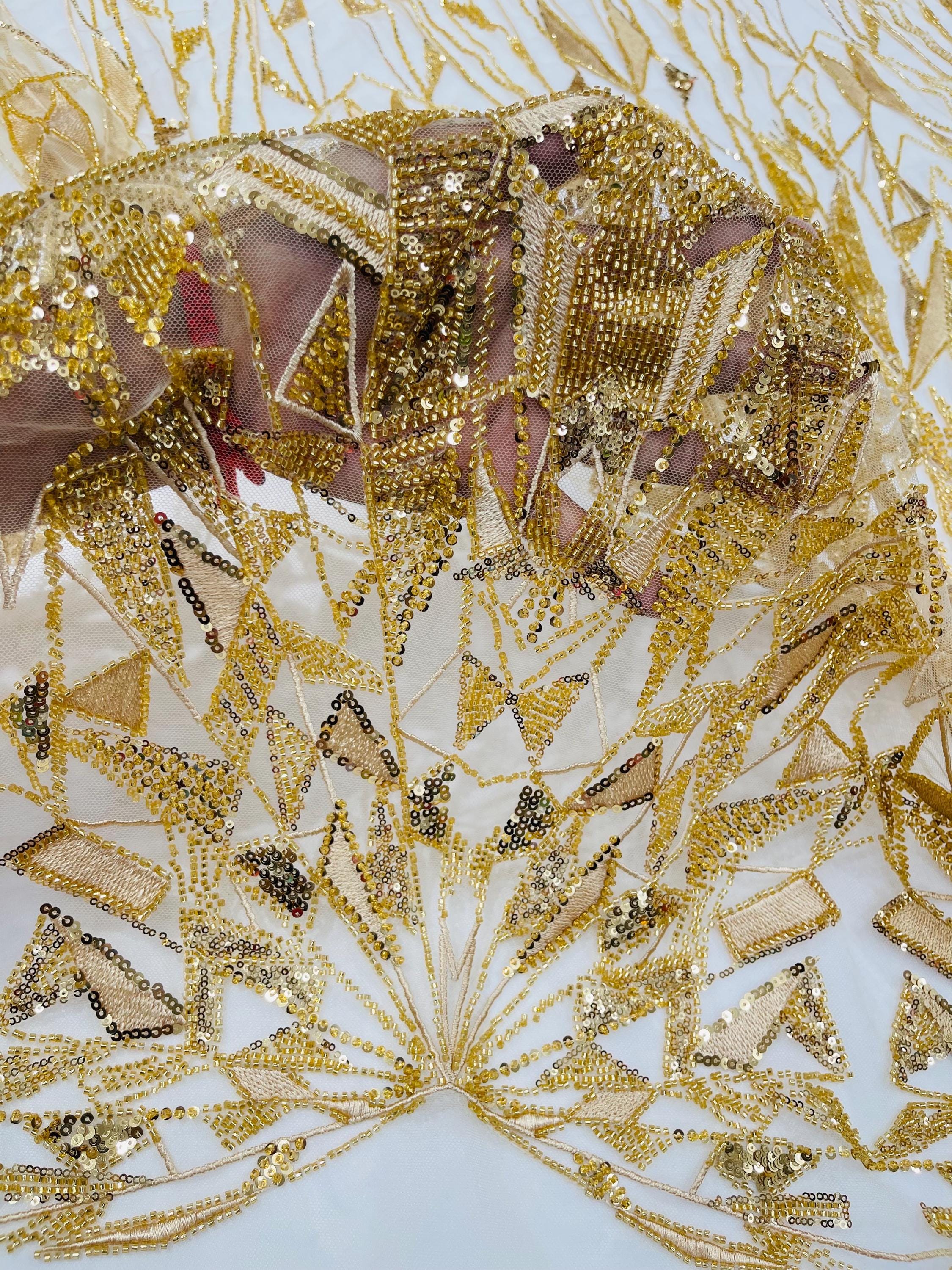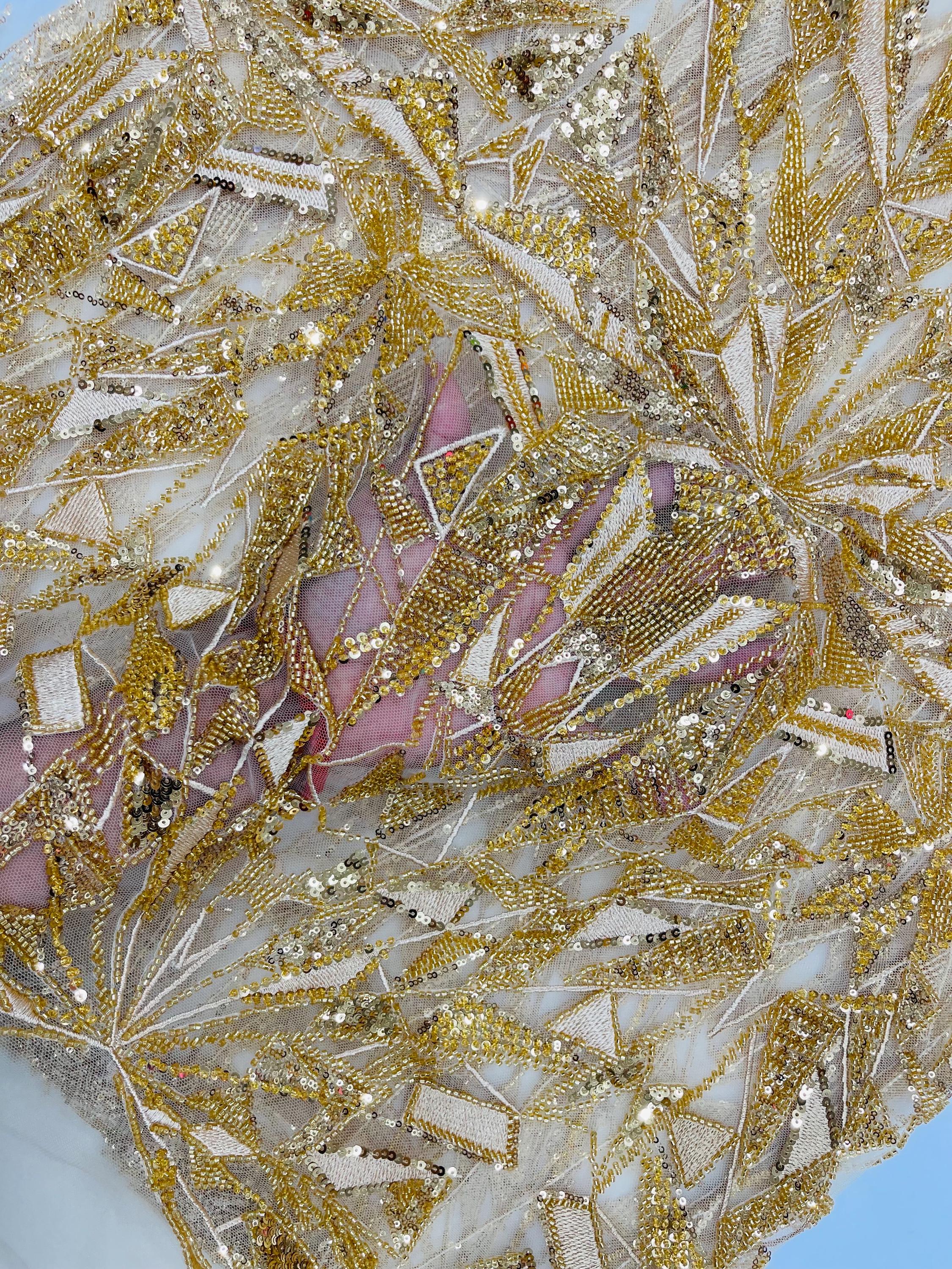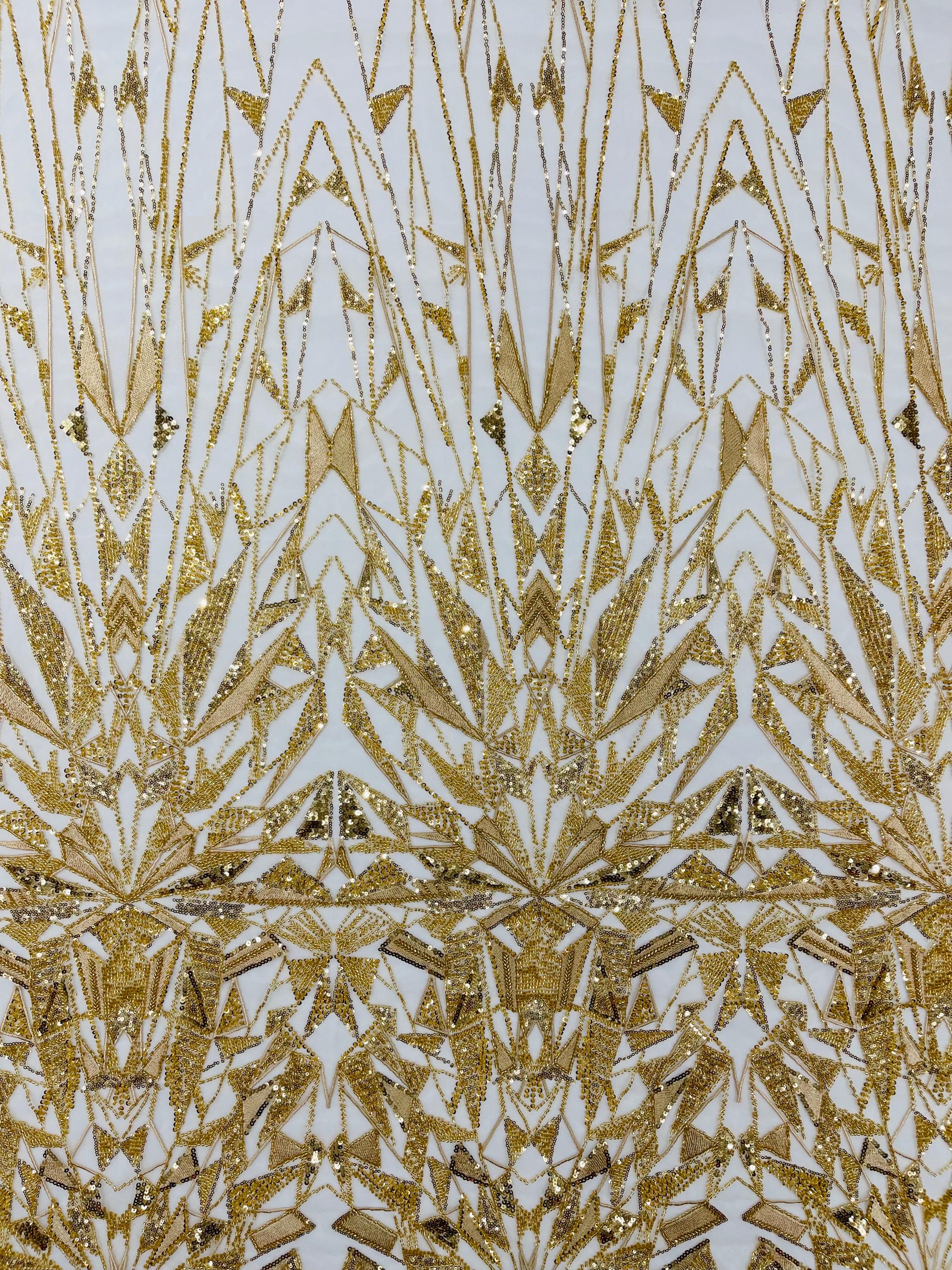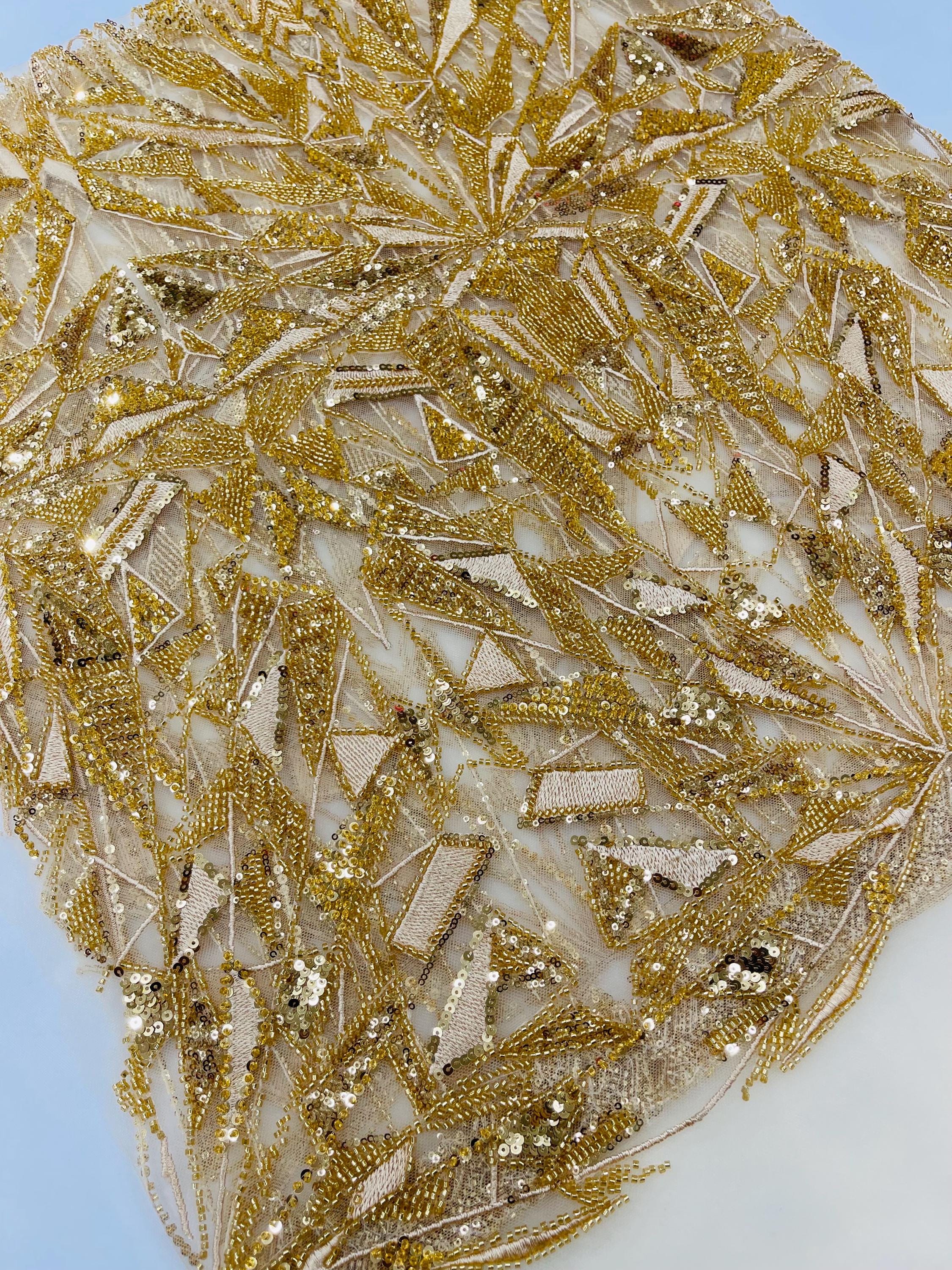 Gold Beaded Lace Fabric: Geometric Sequins on Mesh, Bridal Wedding Dress