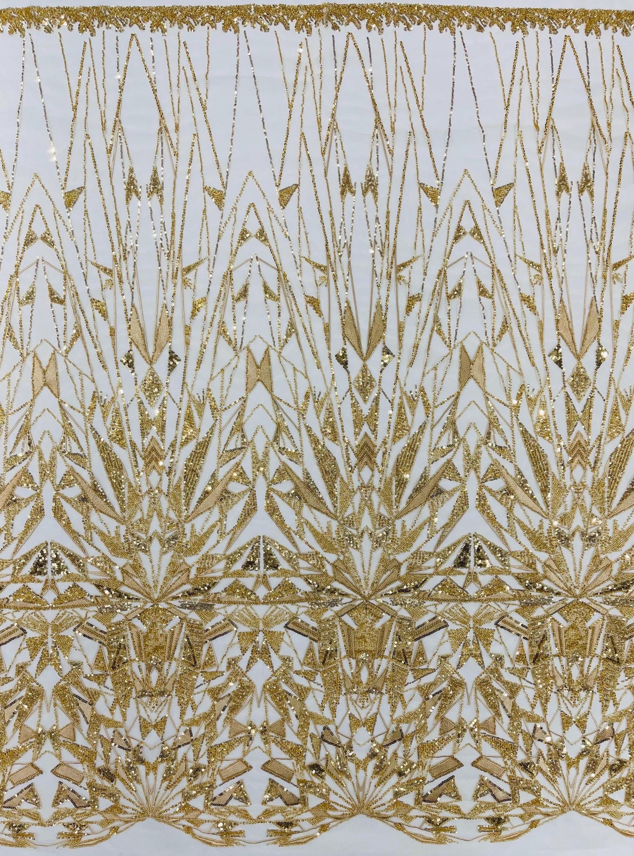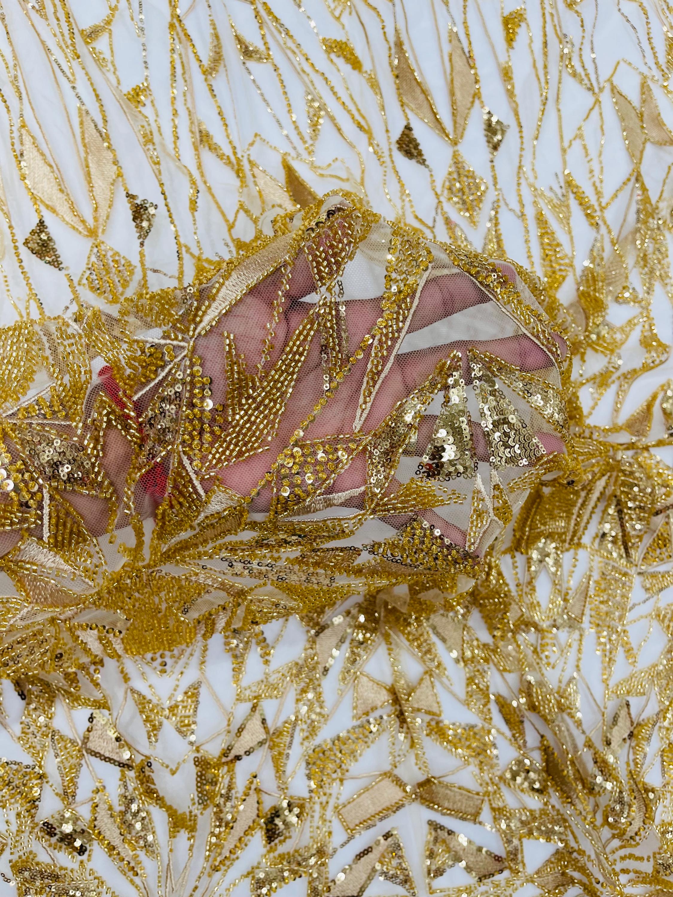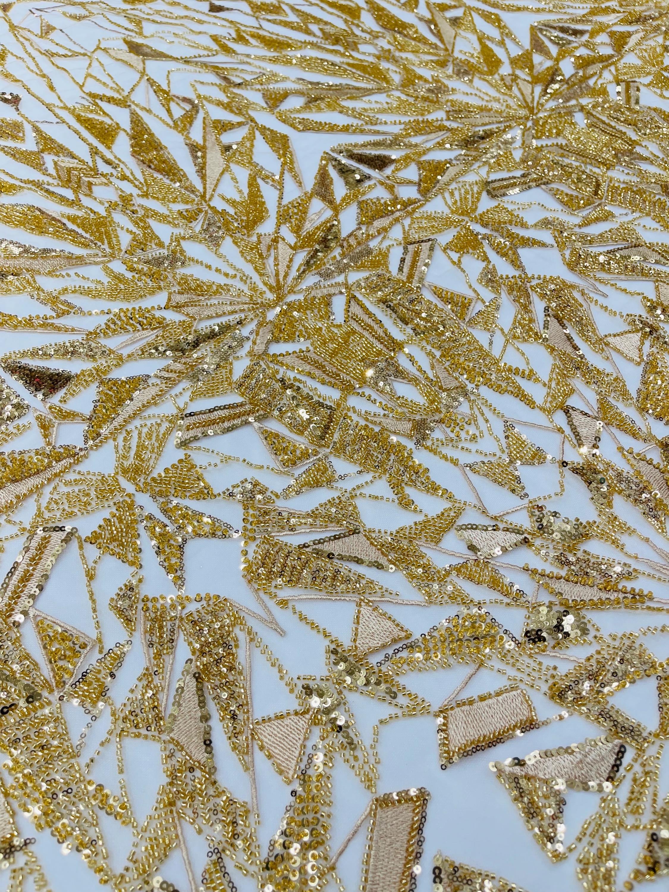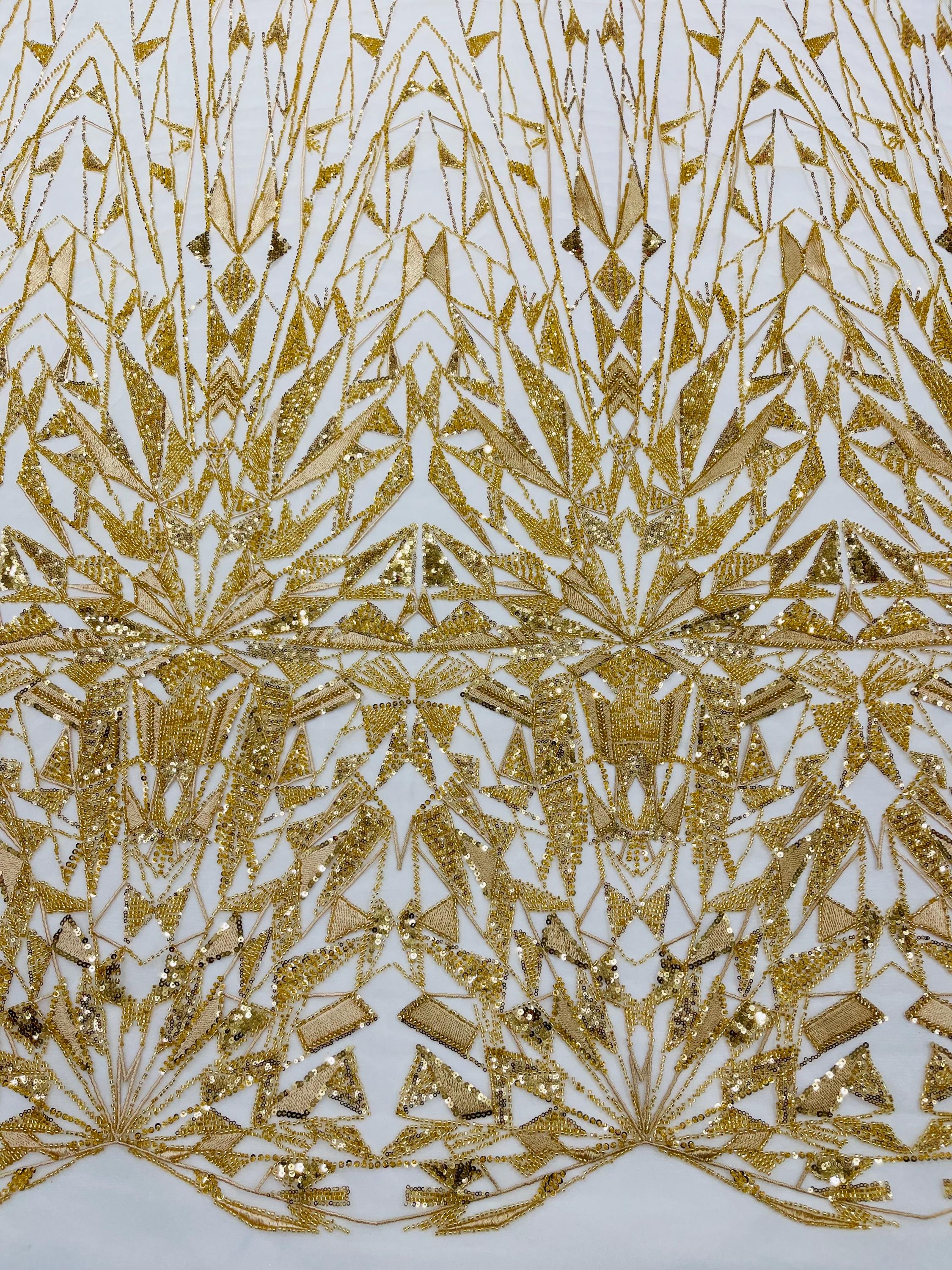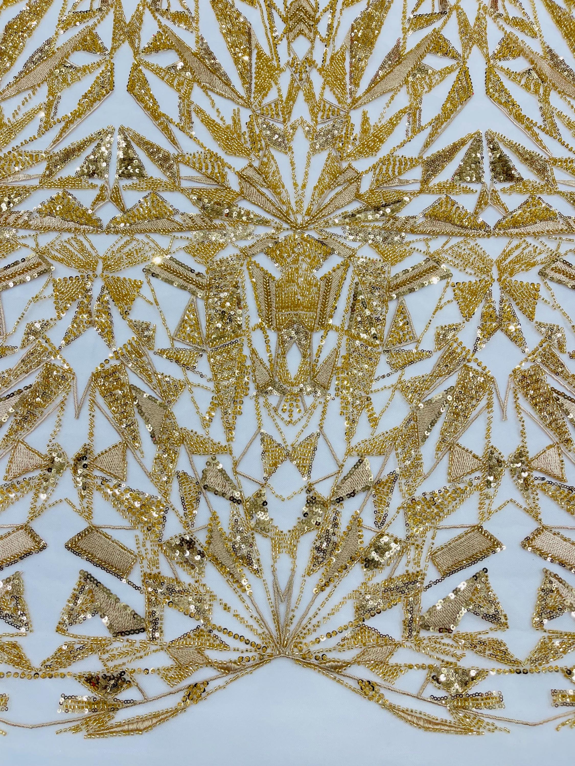 Gold Beaded Lace Fabric: Geometric Sequins on Mesh, Bridal Wedding Dress