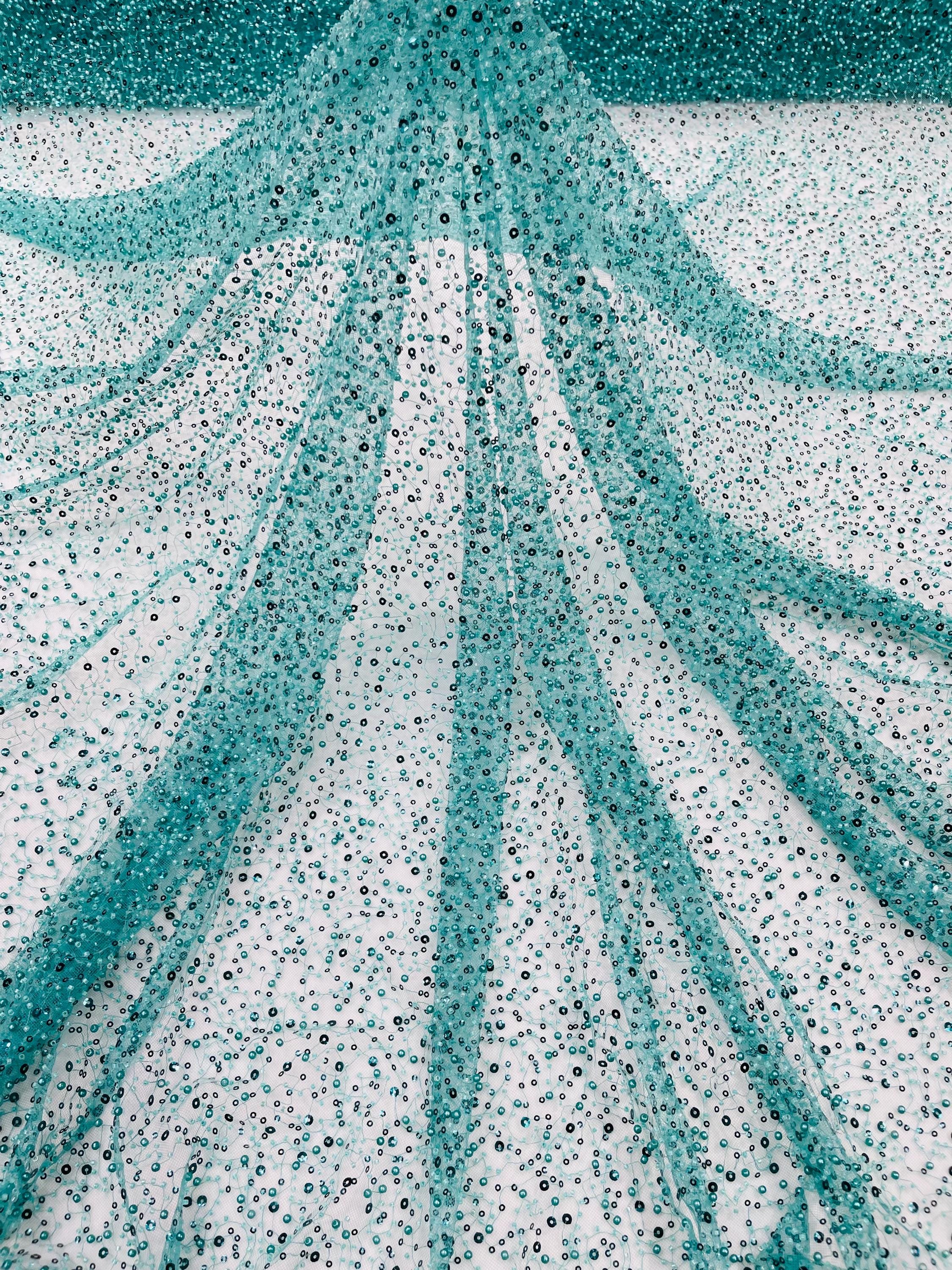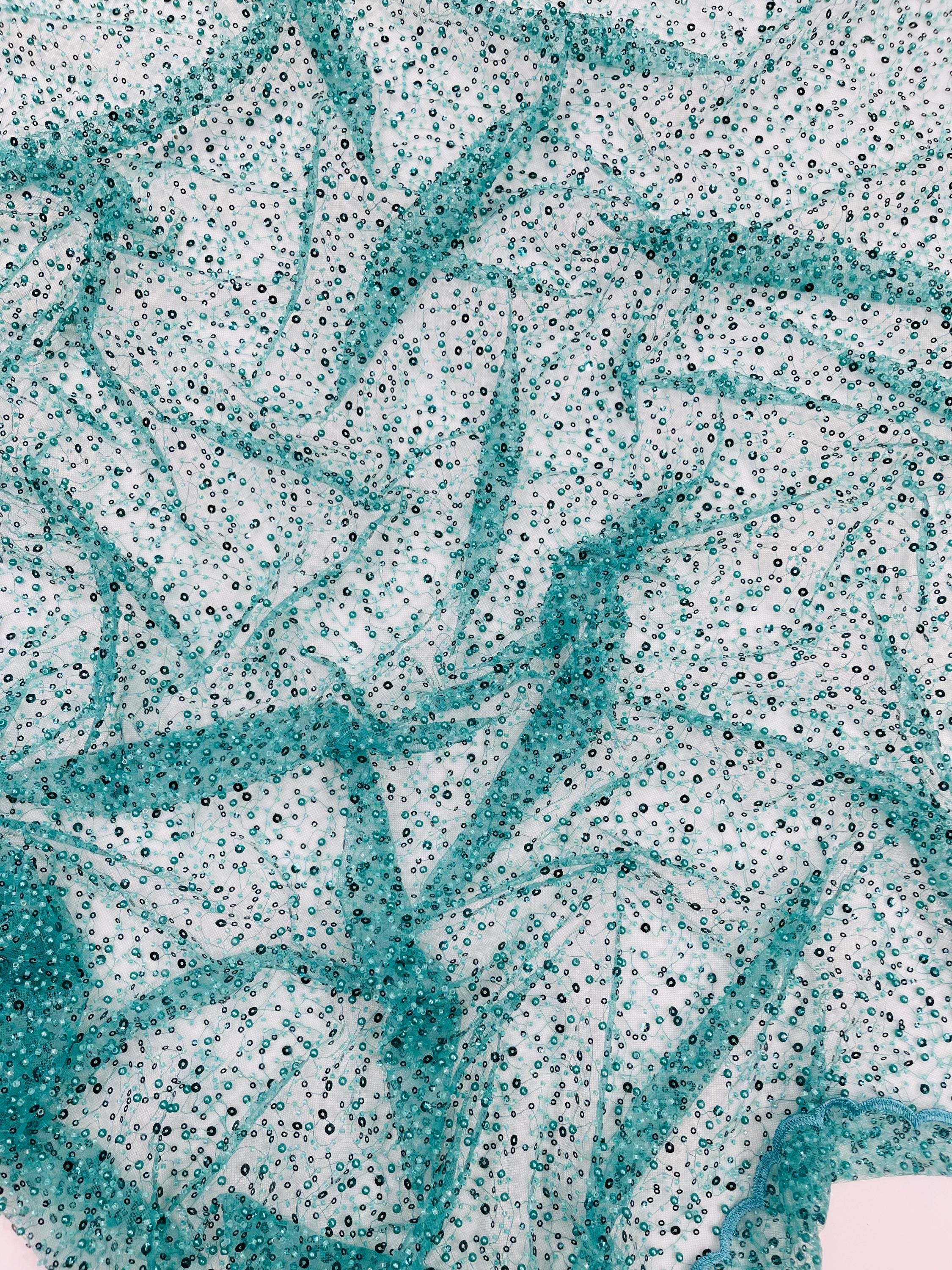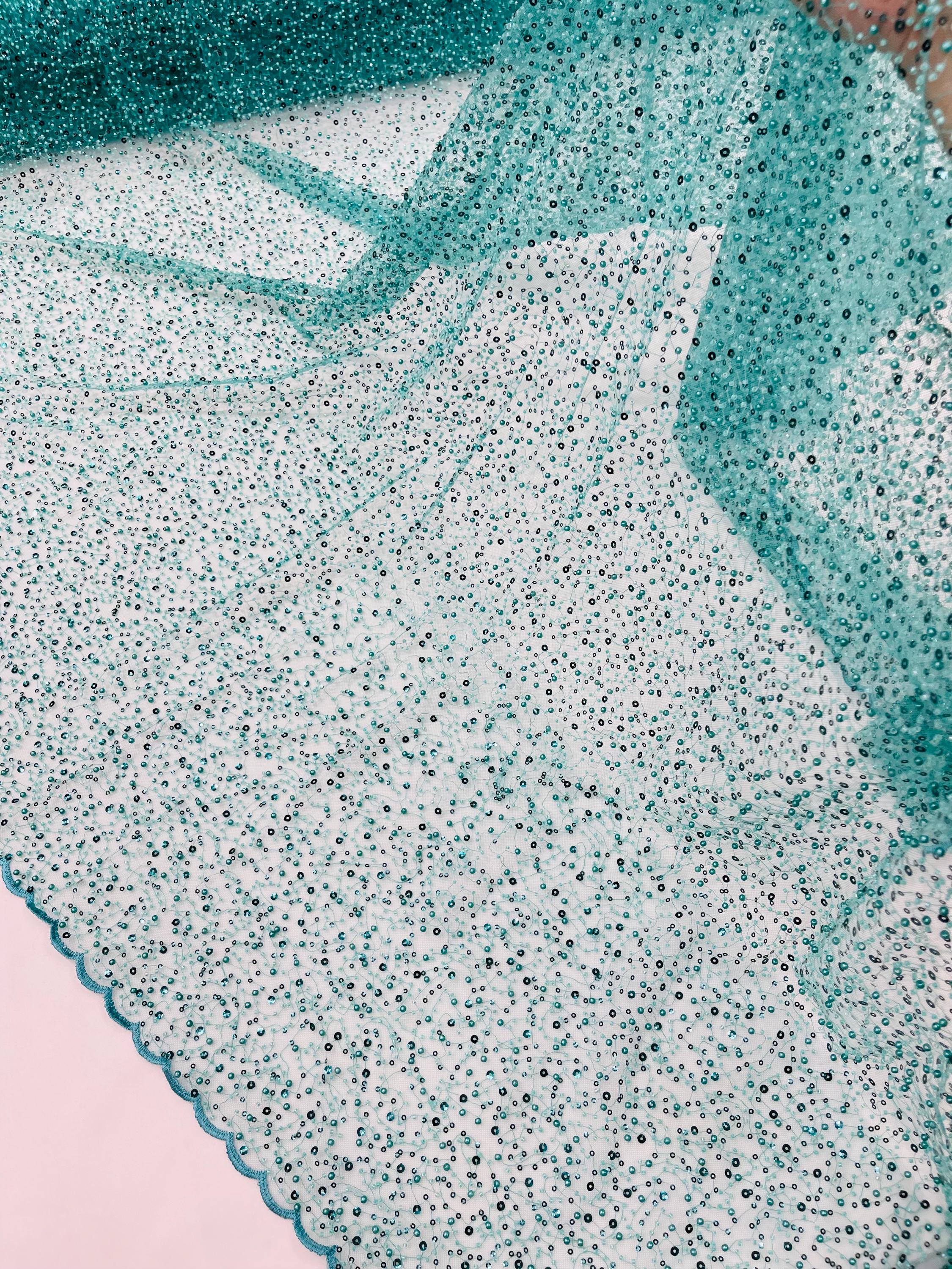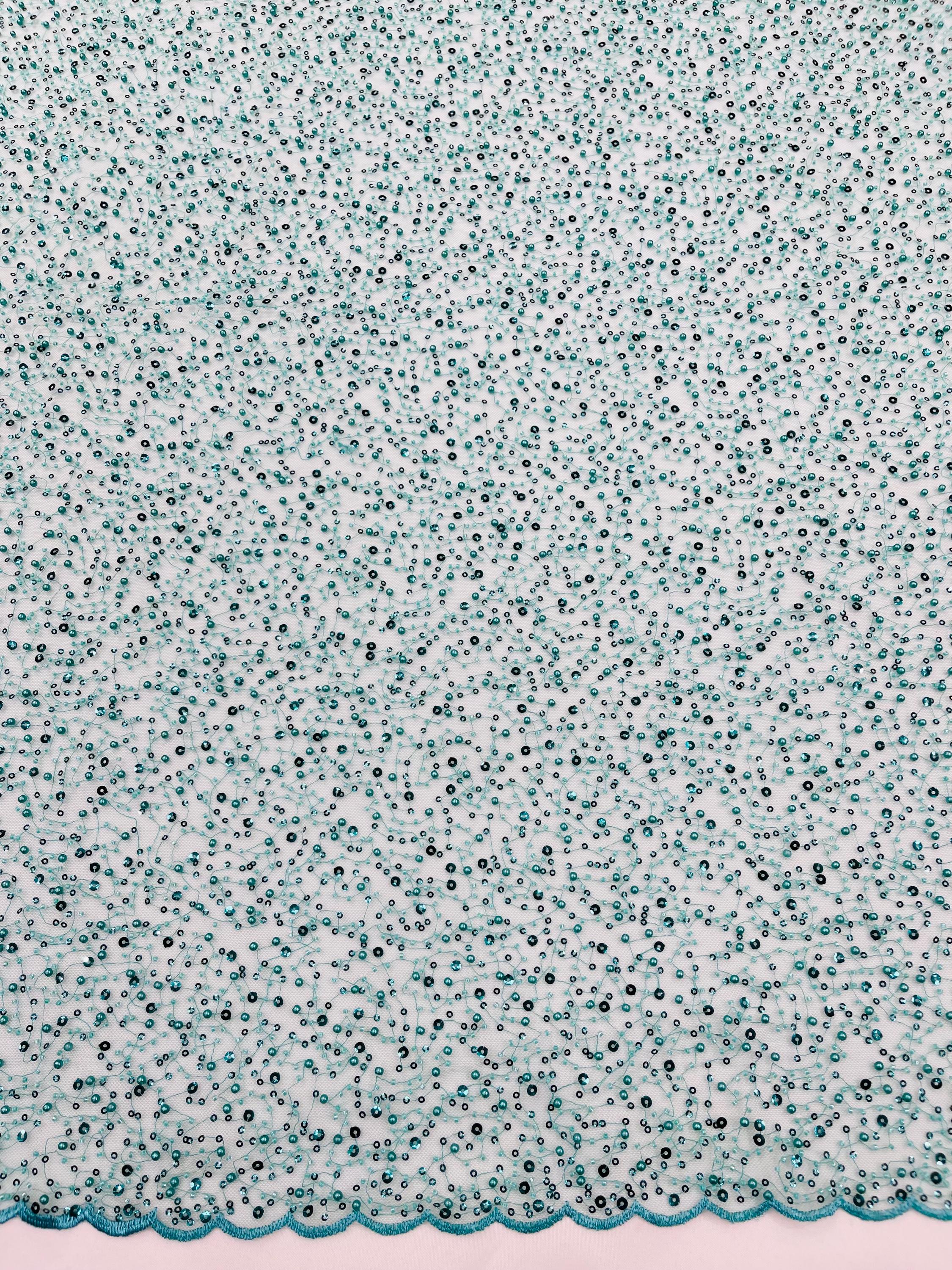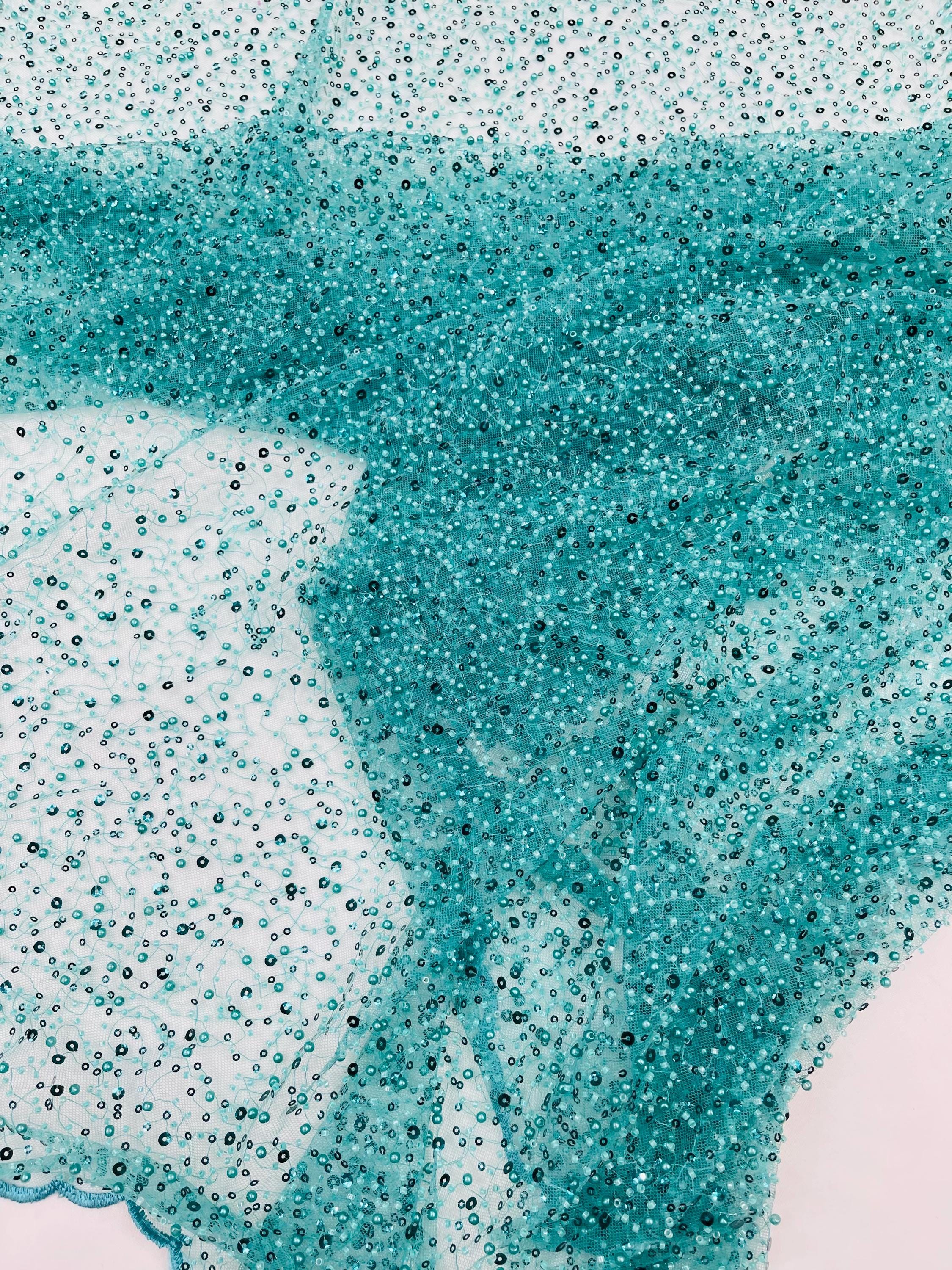 Teal Green Beaded Sequin Mesh Lace Fabric, Rain Design Embroidery By The Yard
