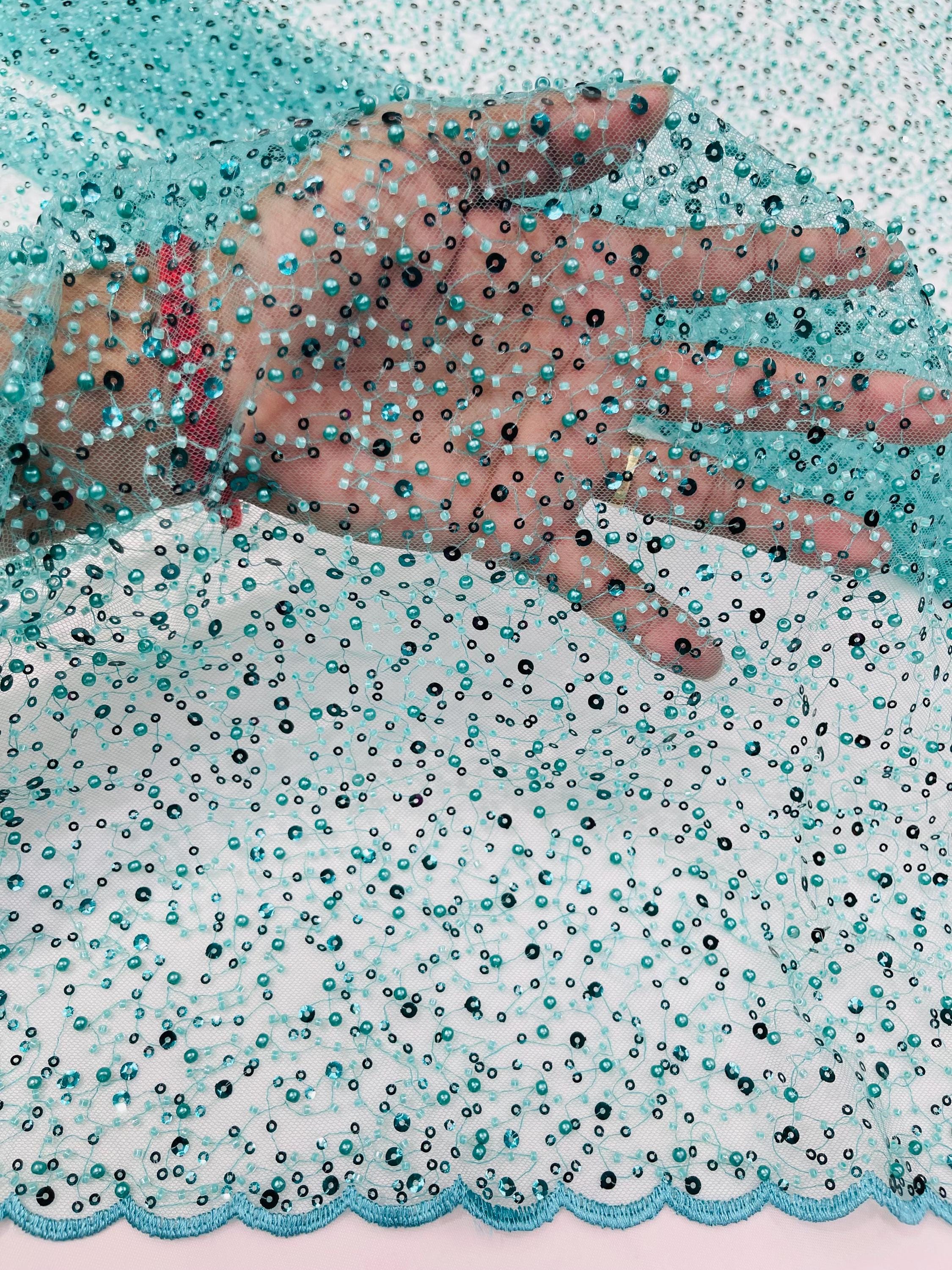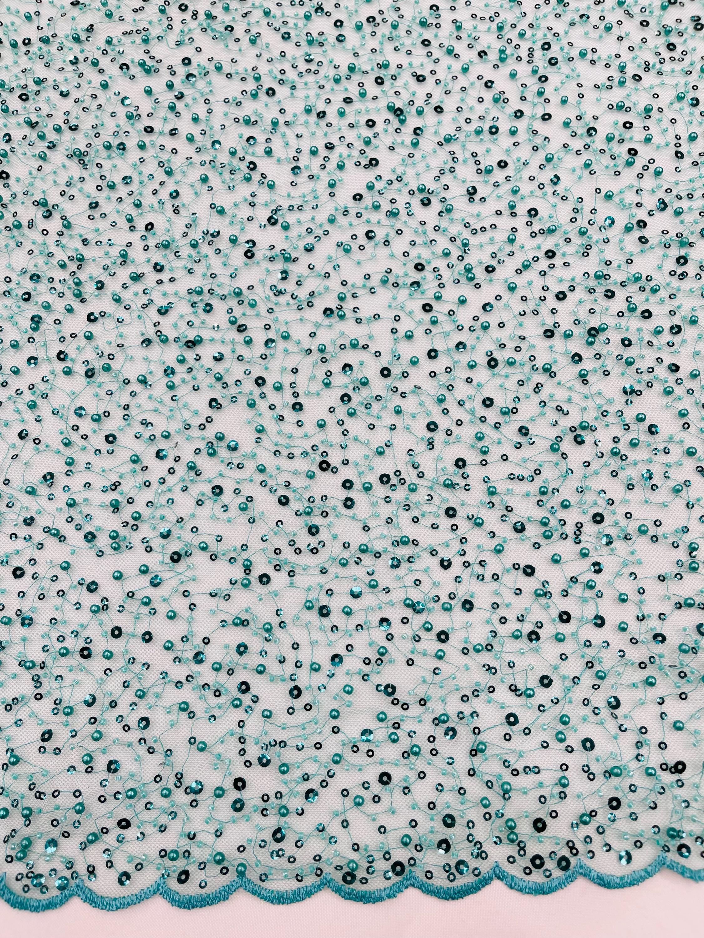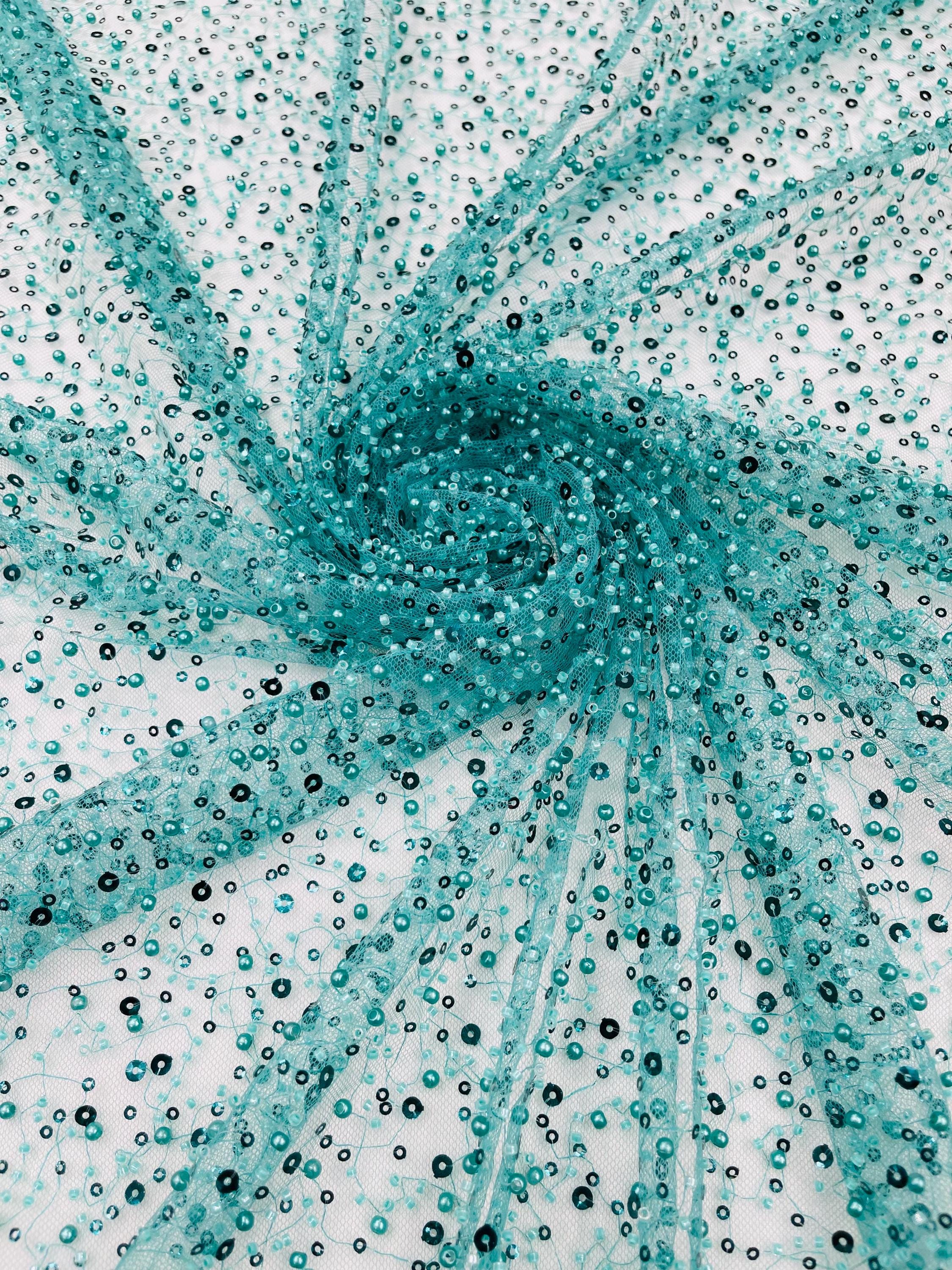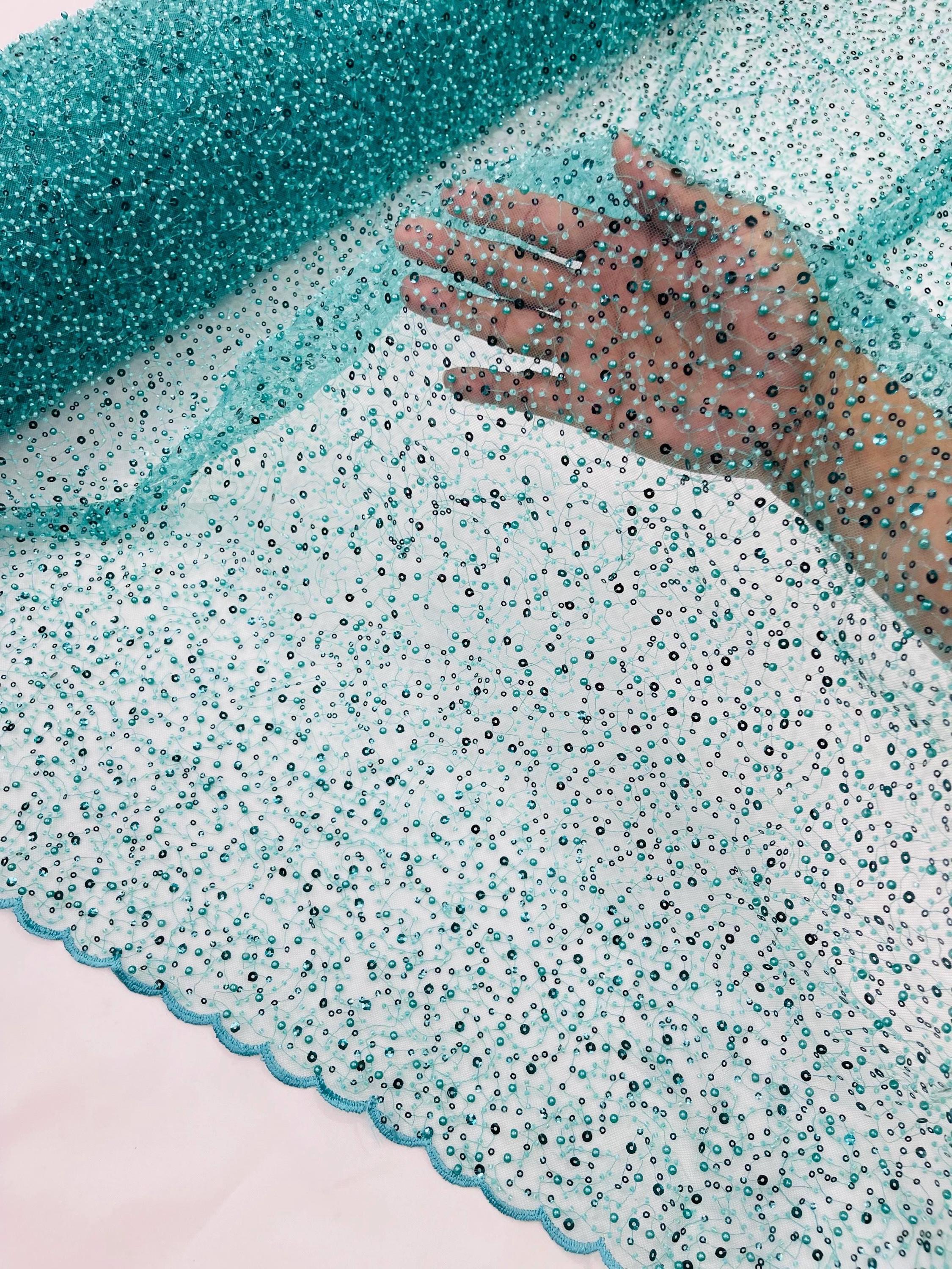 Teal Green Beaded Sequin Mesh Lace Fabric, Rain Design Embroidery By The Yard