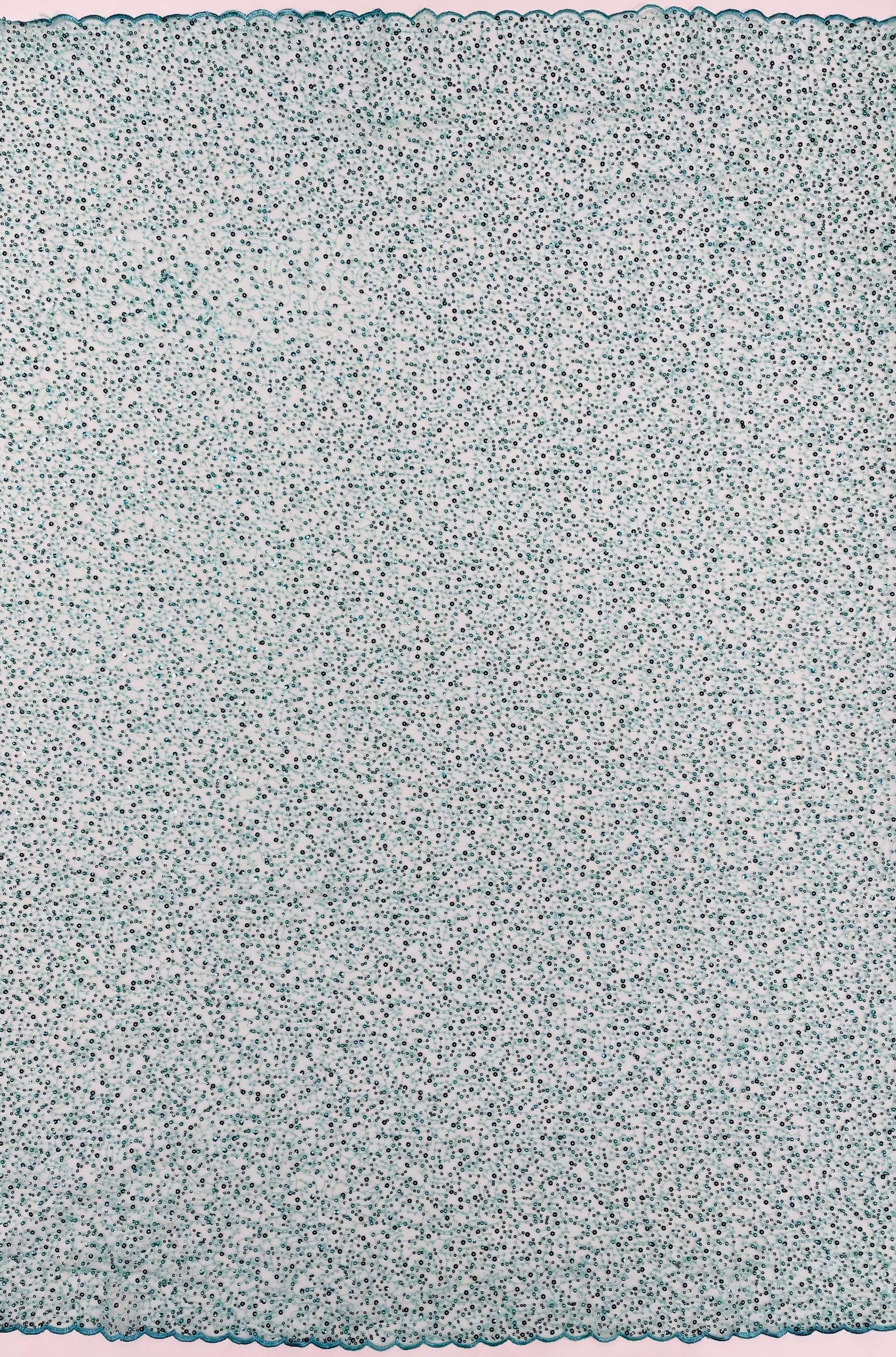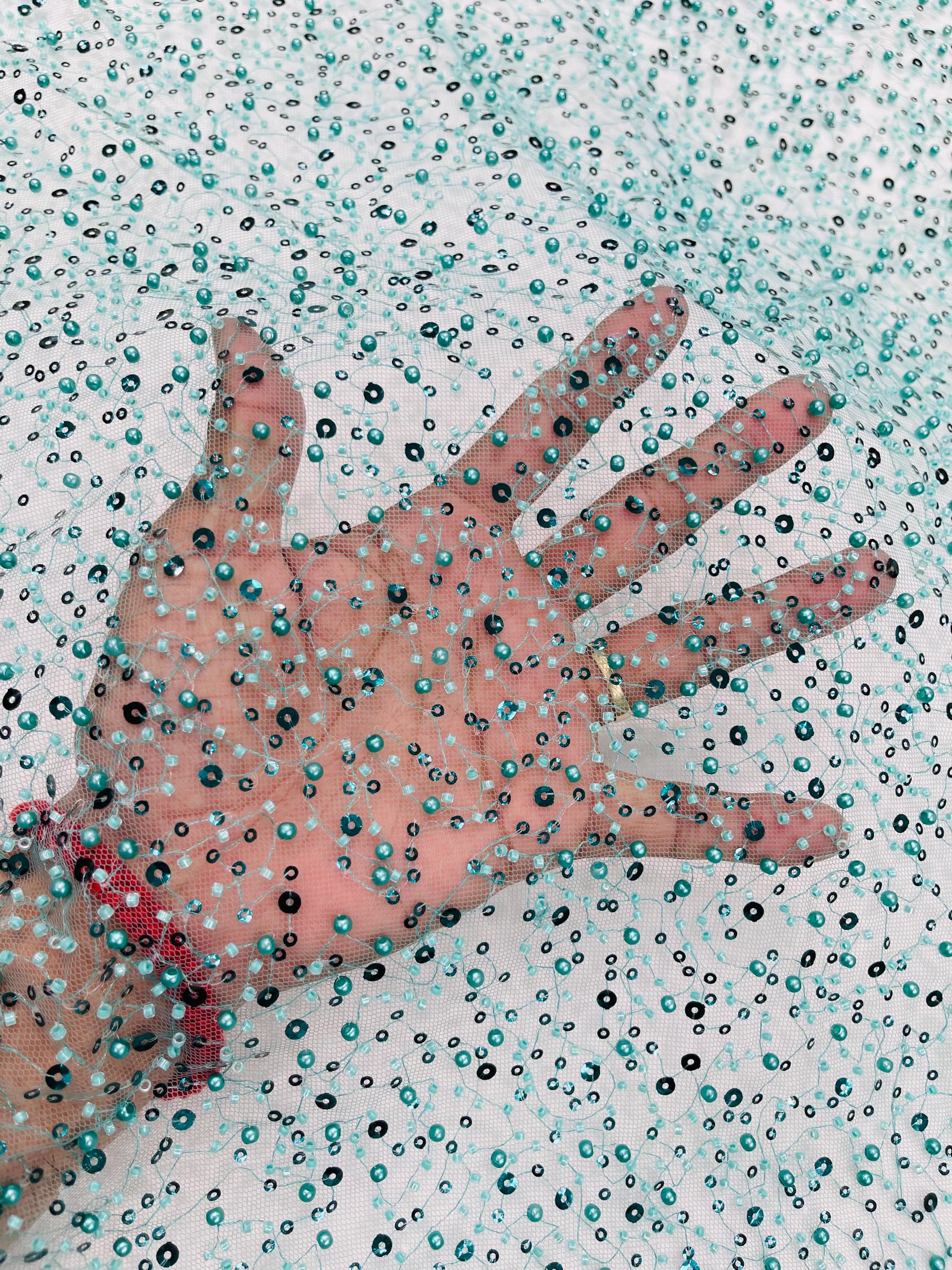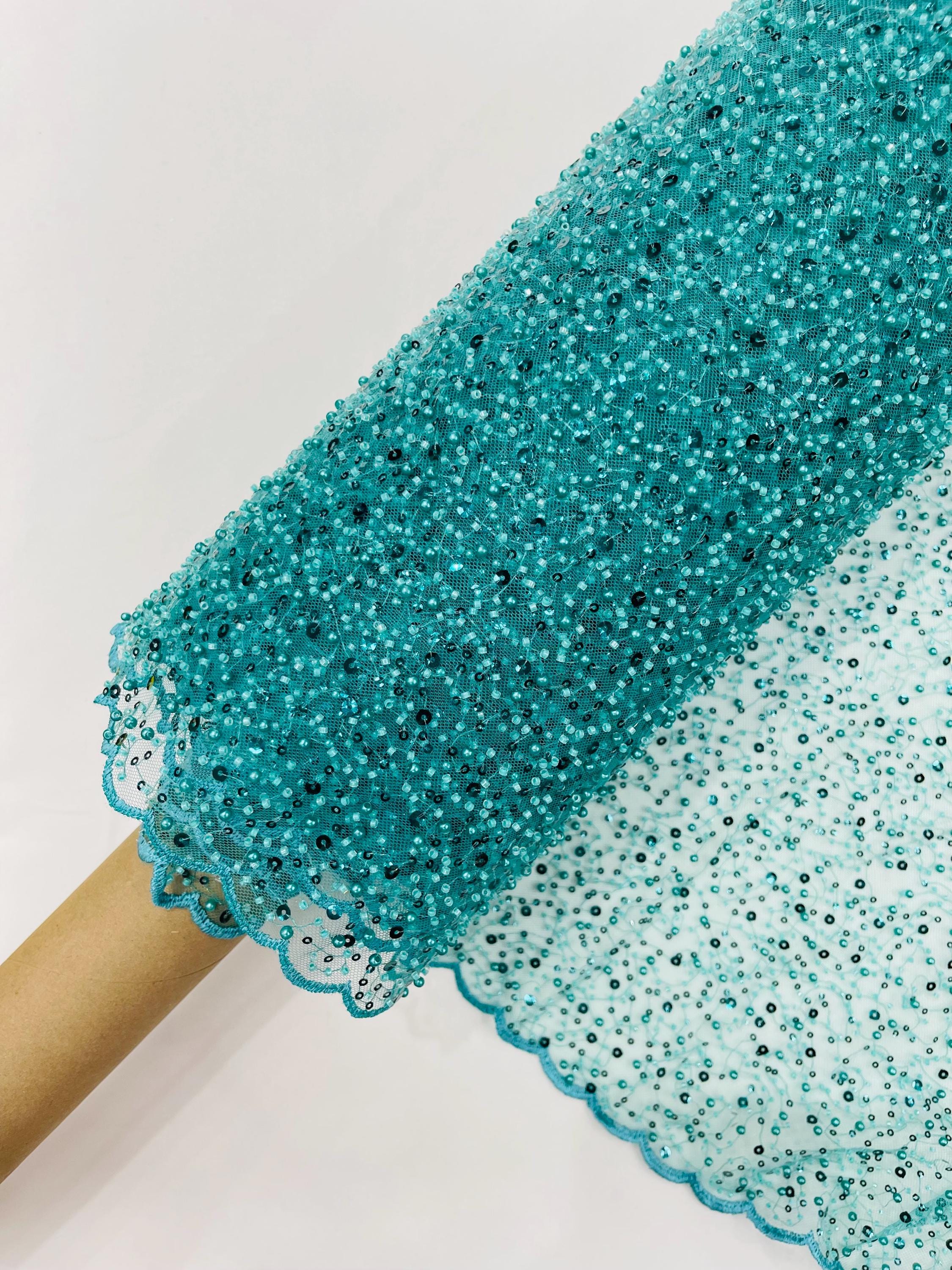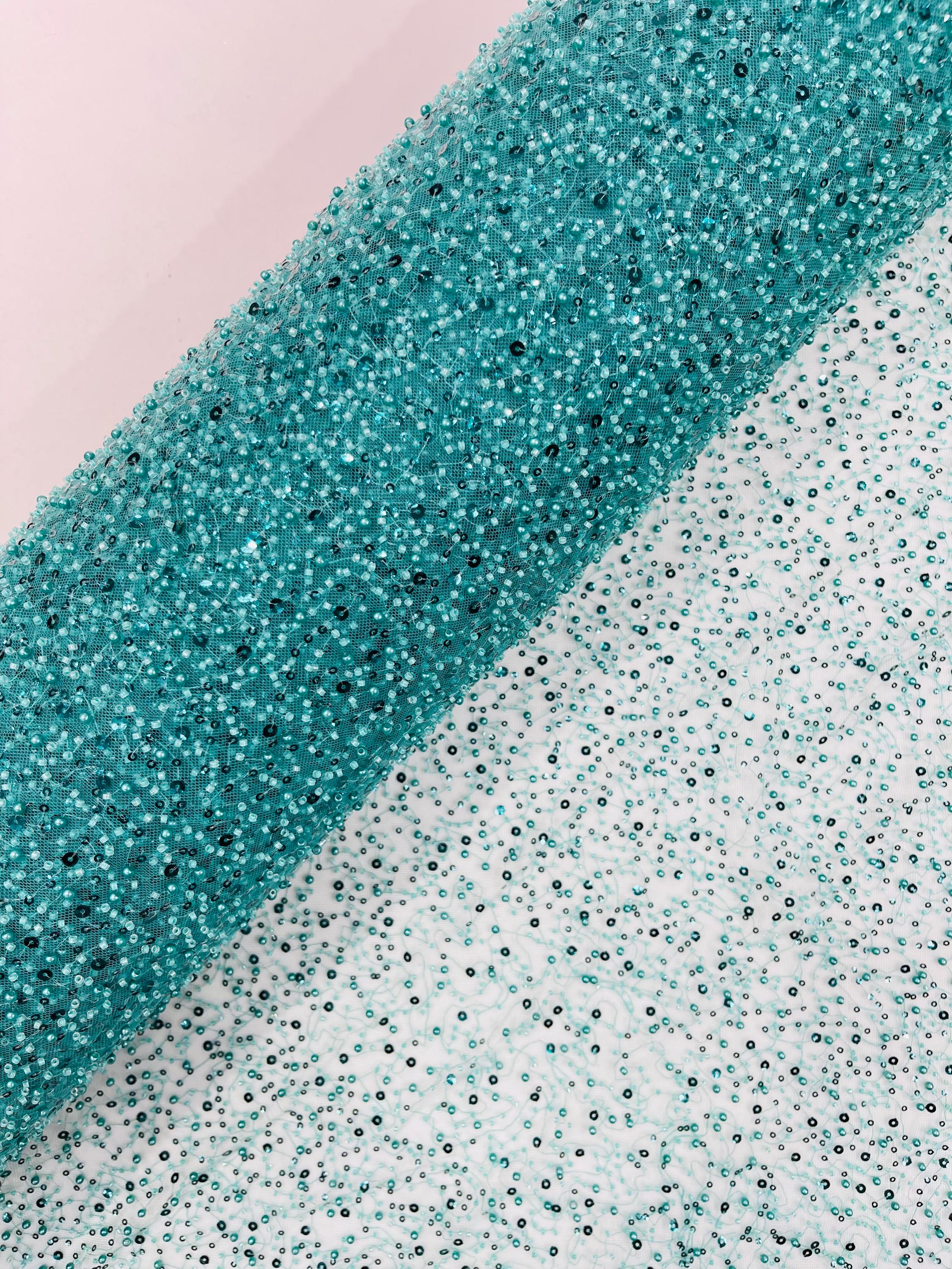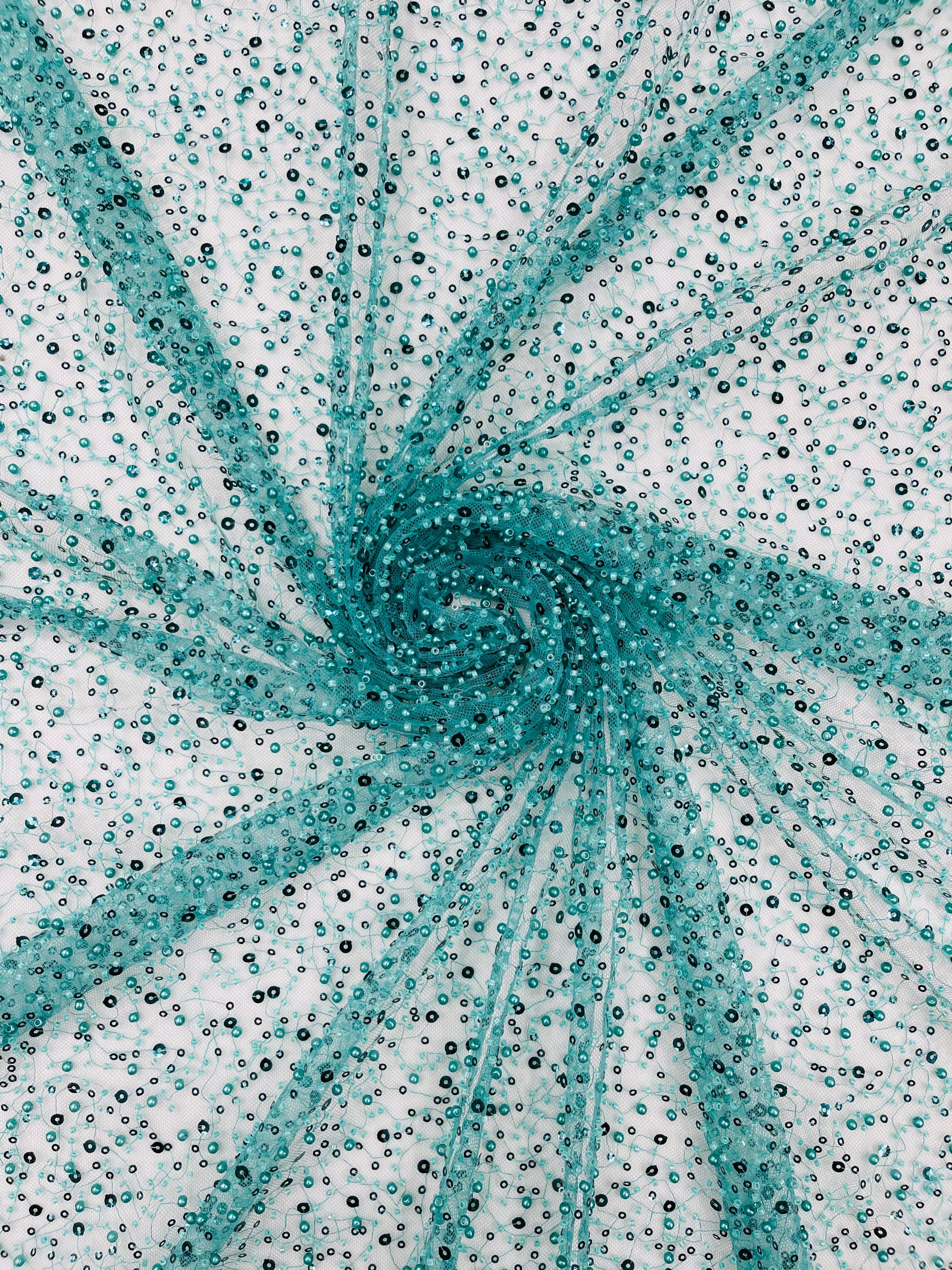 Teal Green Beaded Sequin Mesh Lace Fabric, Rain Design Embroidery By The Yard