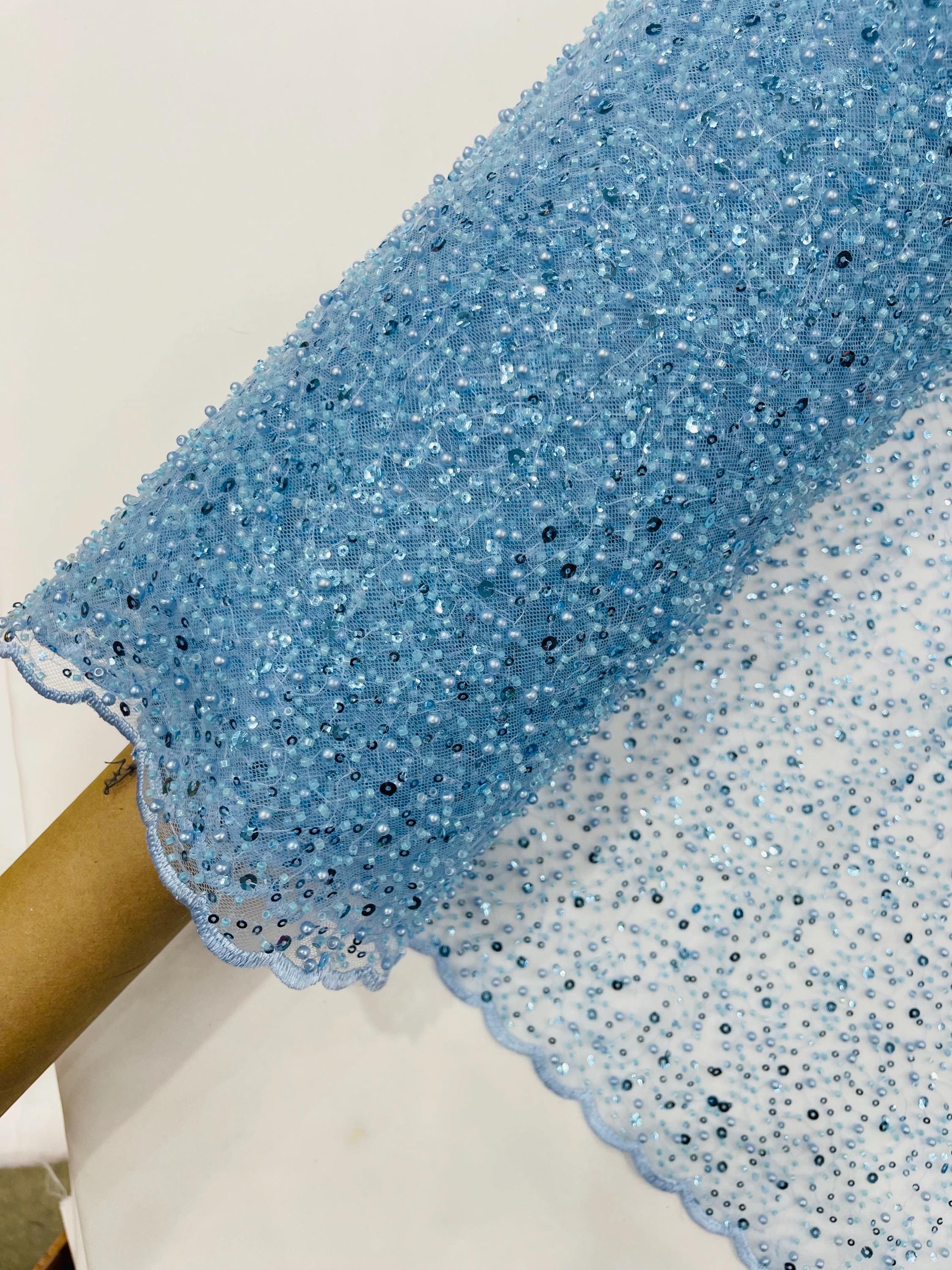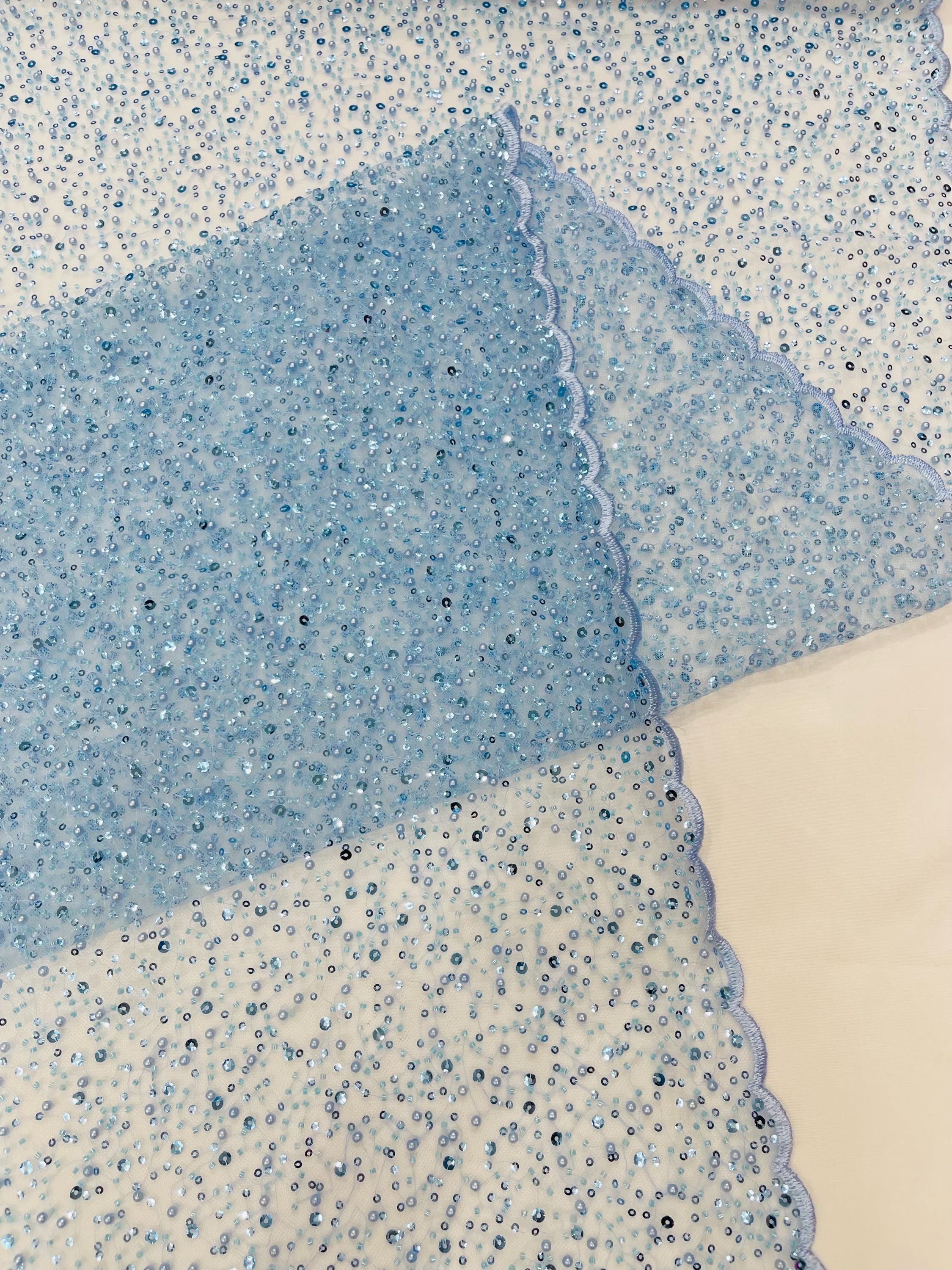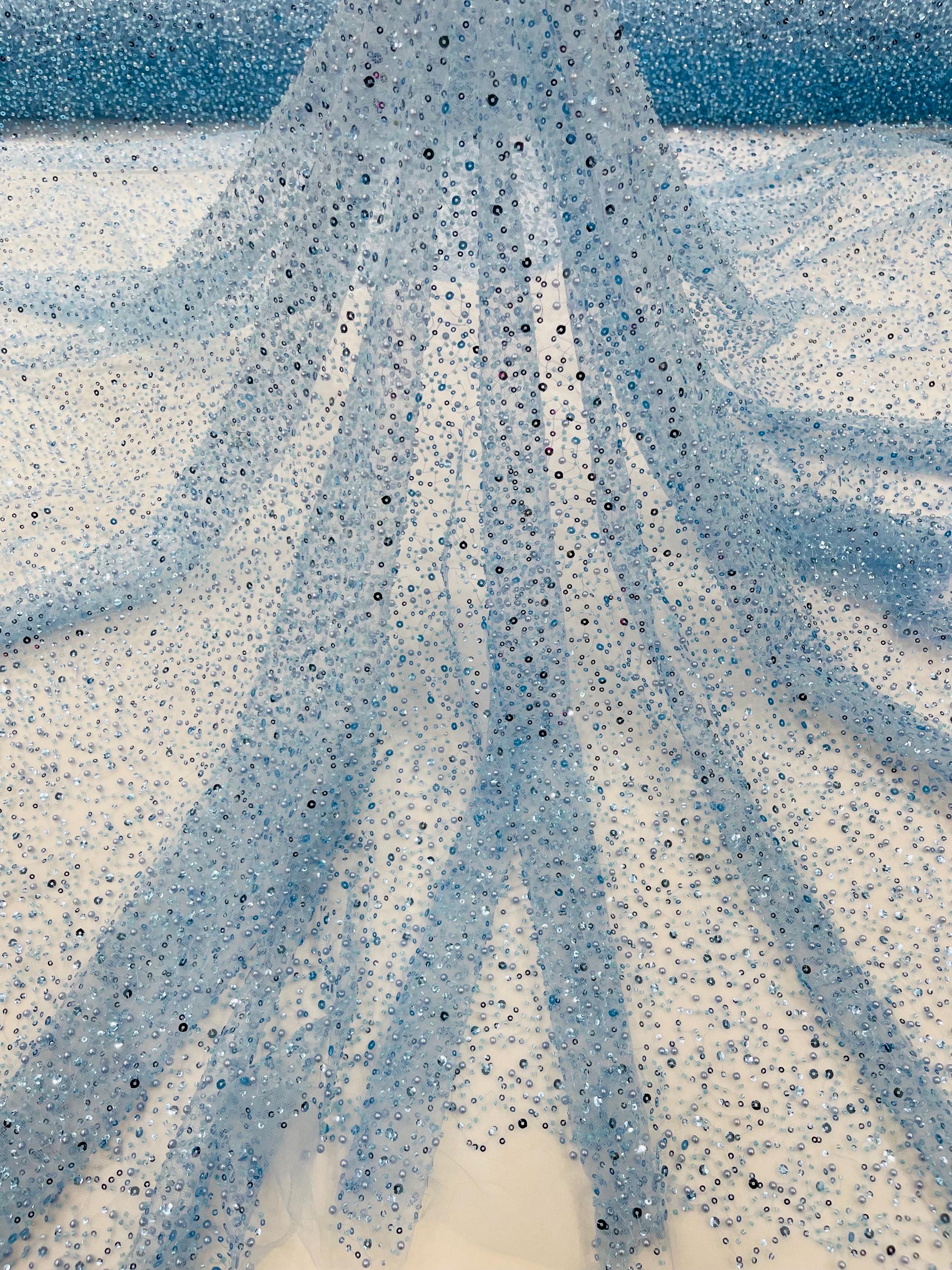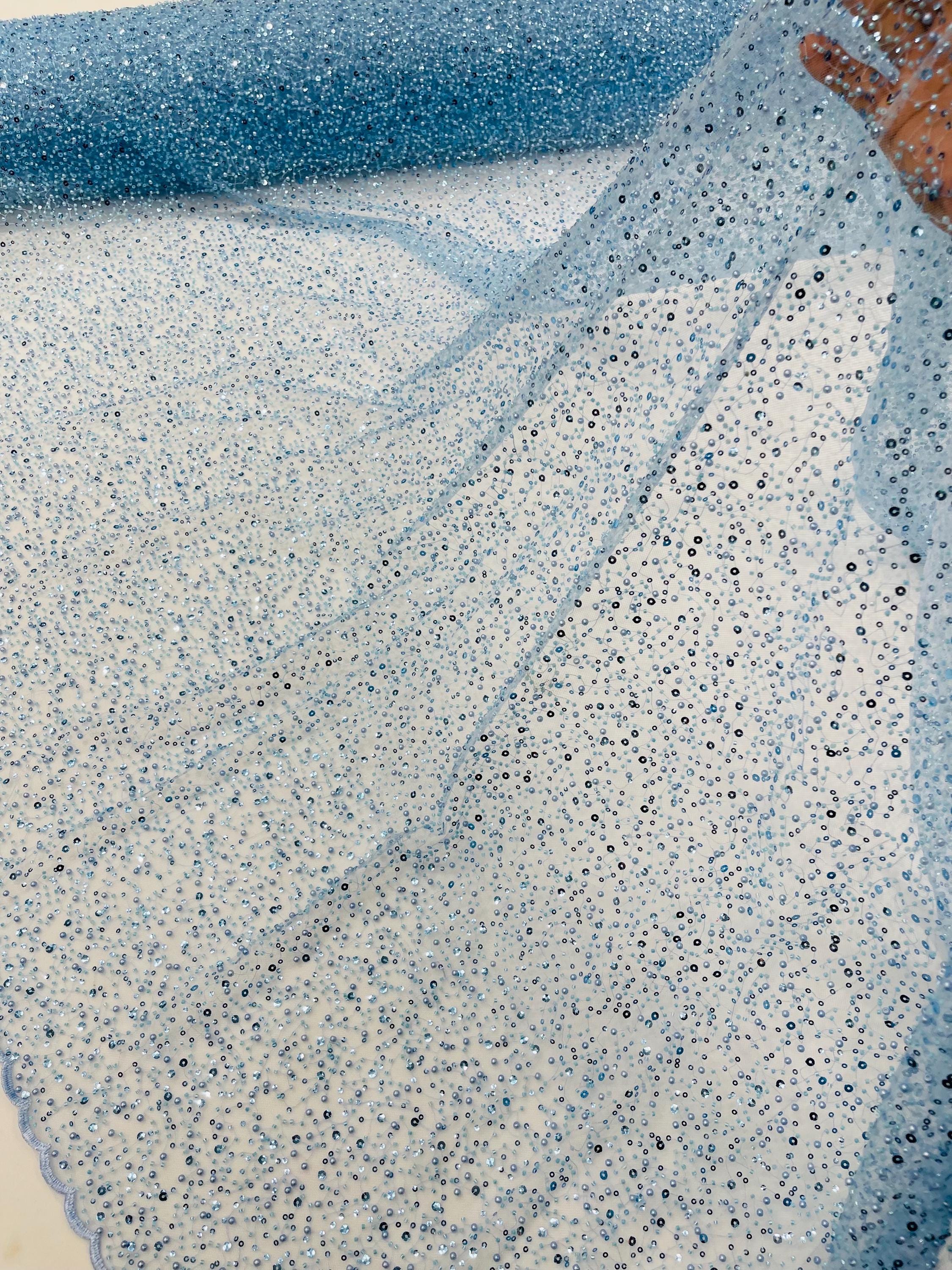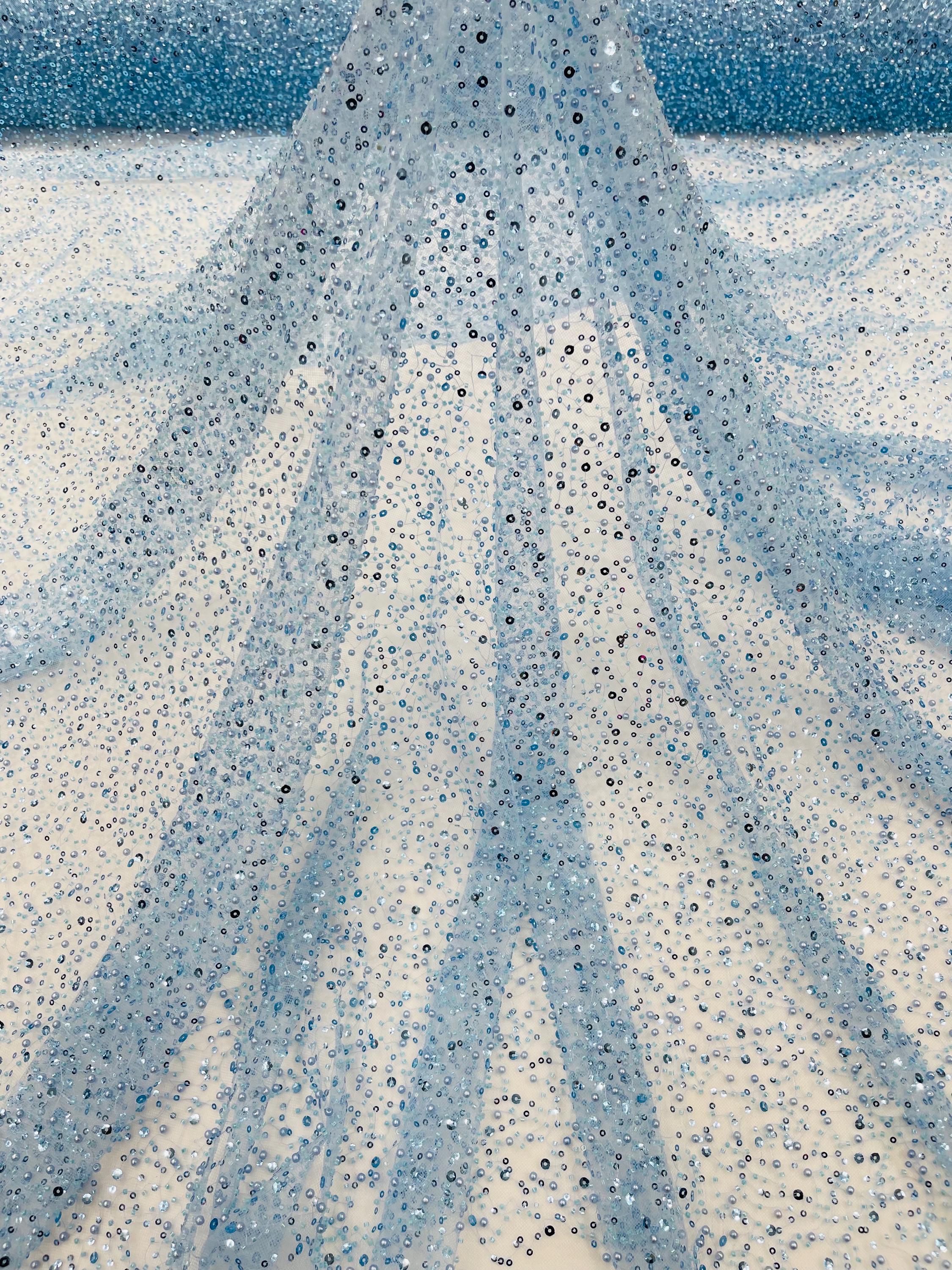 Baby Blue Beaded Sequin Mesh Lace Fabric, Rain Design Embroidery By The Yard