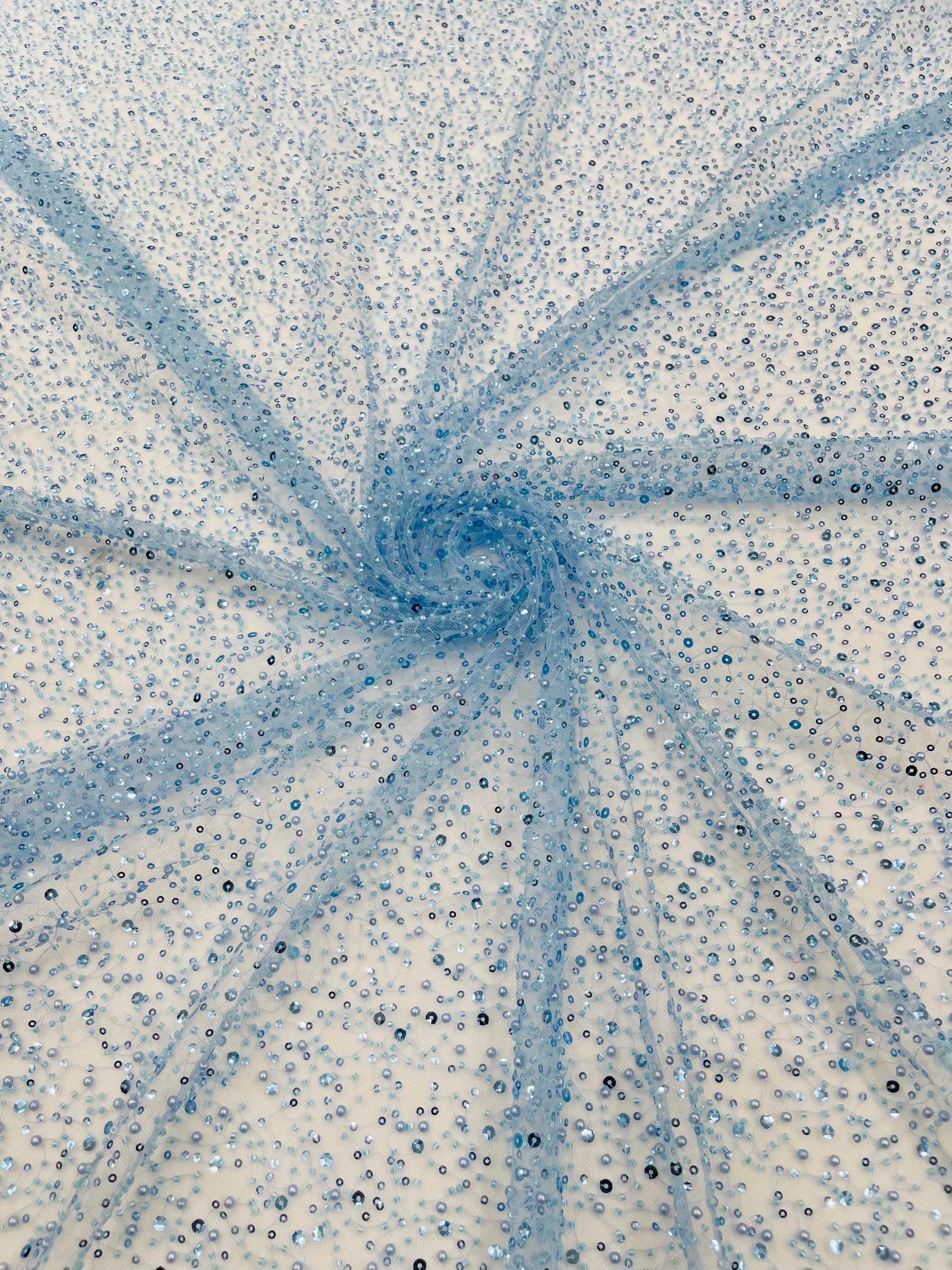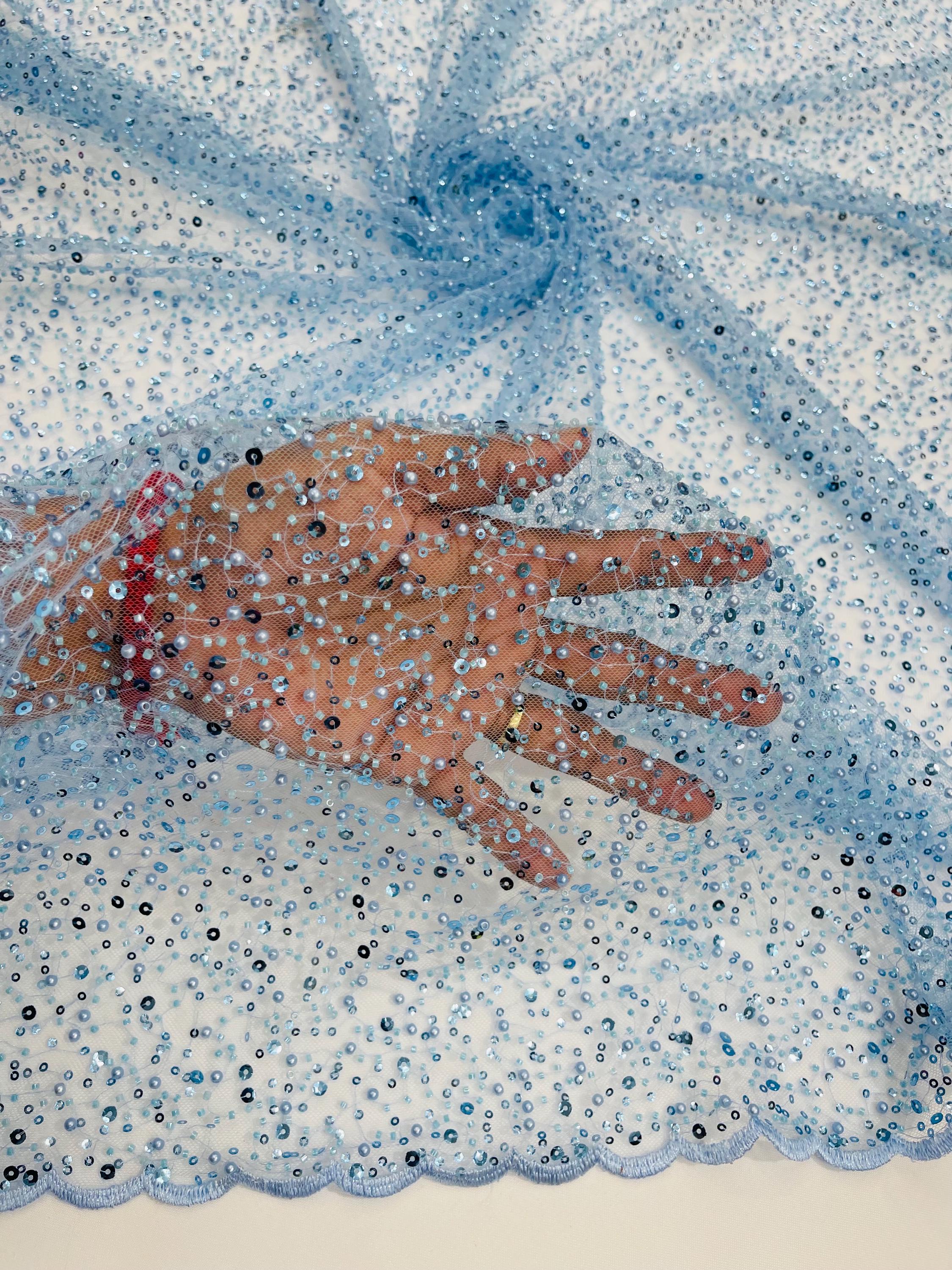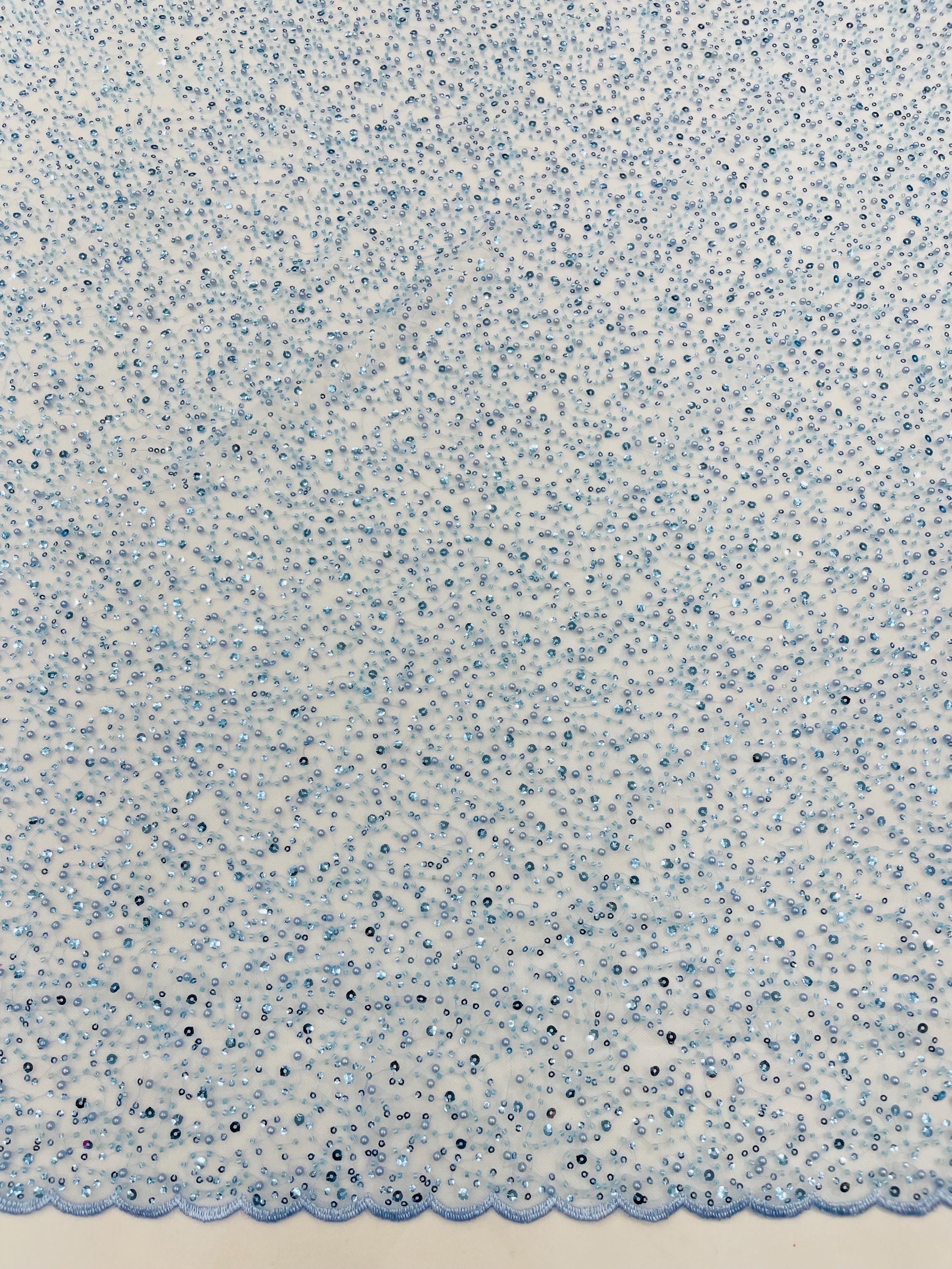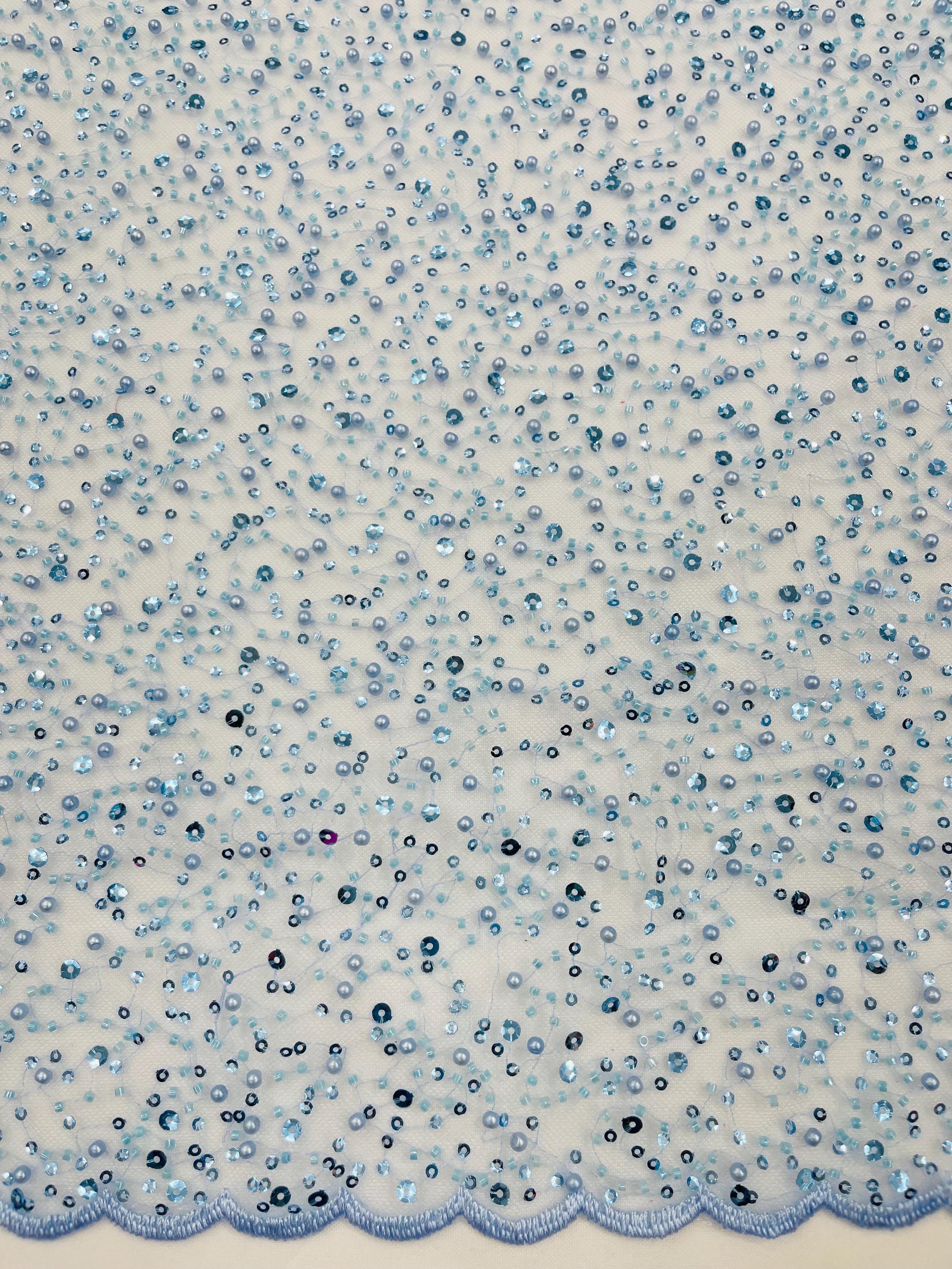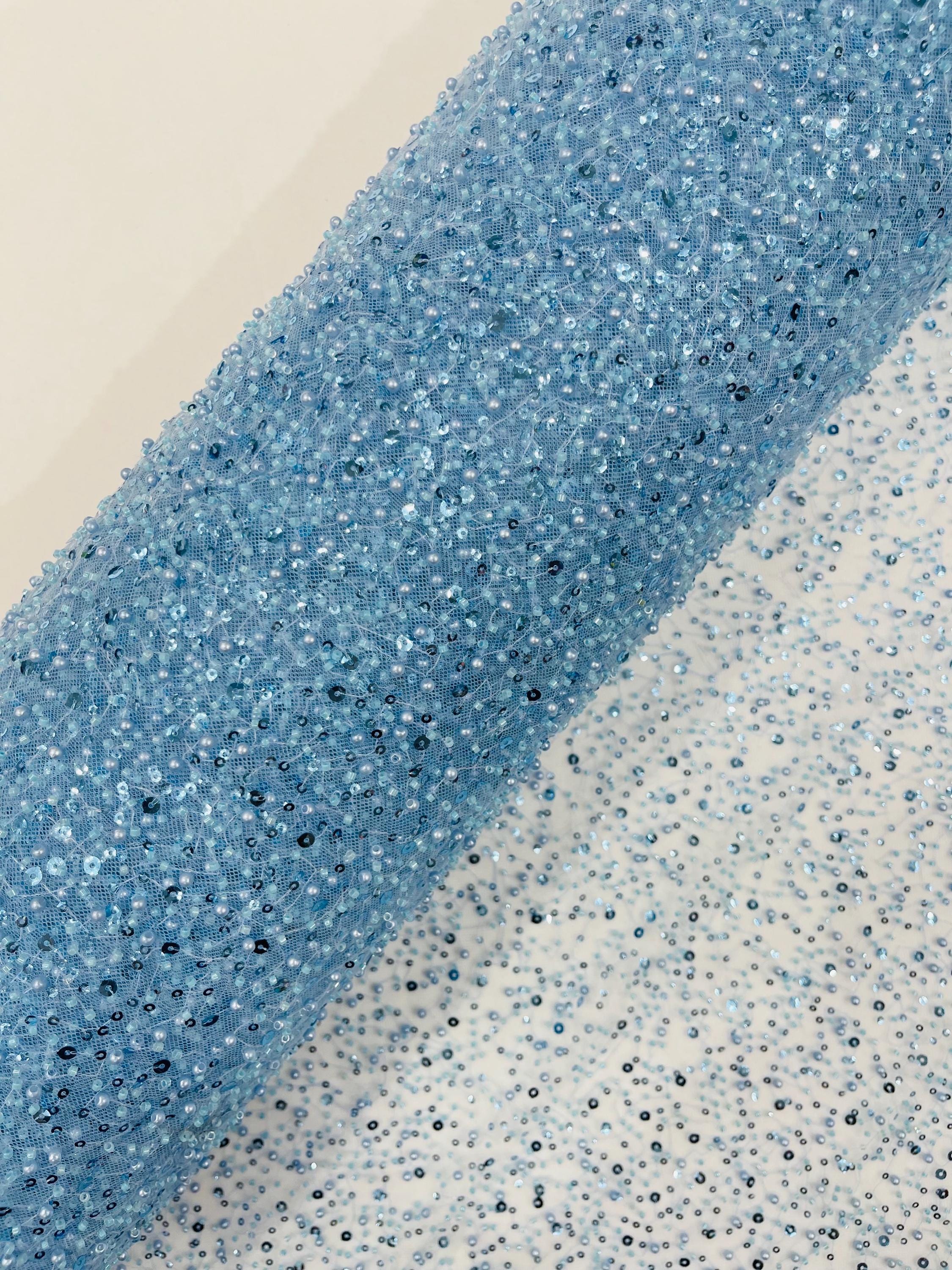 Baby Blue Beaded Sequin Mesh Lace Fabric, Rain Design Embroidery By The Yard