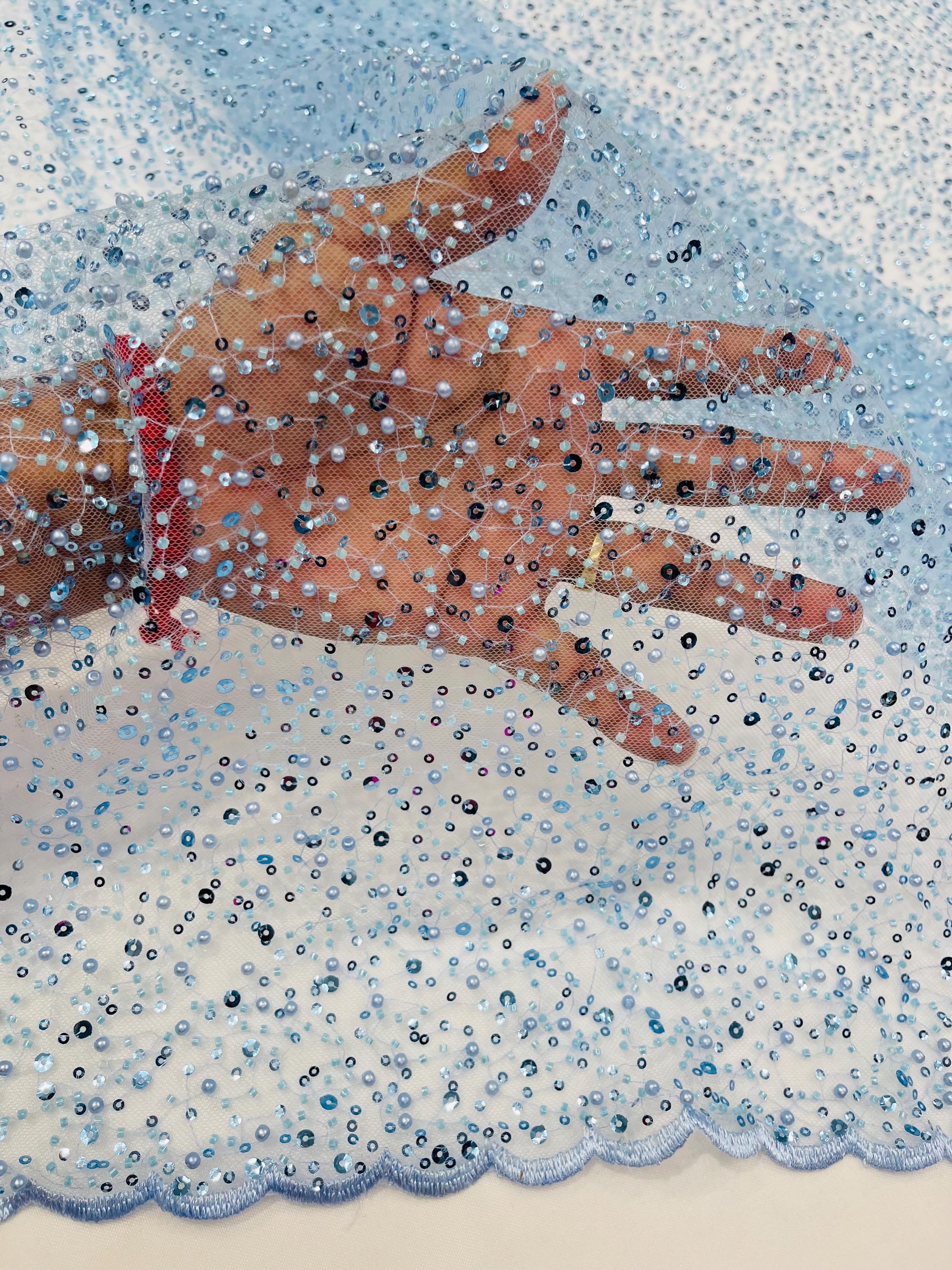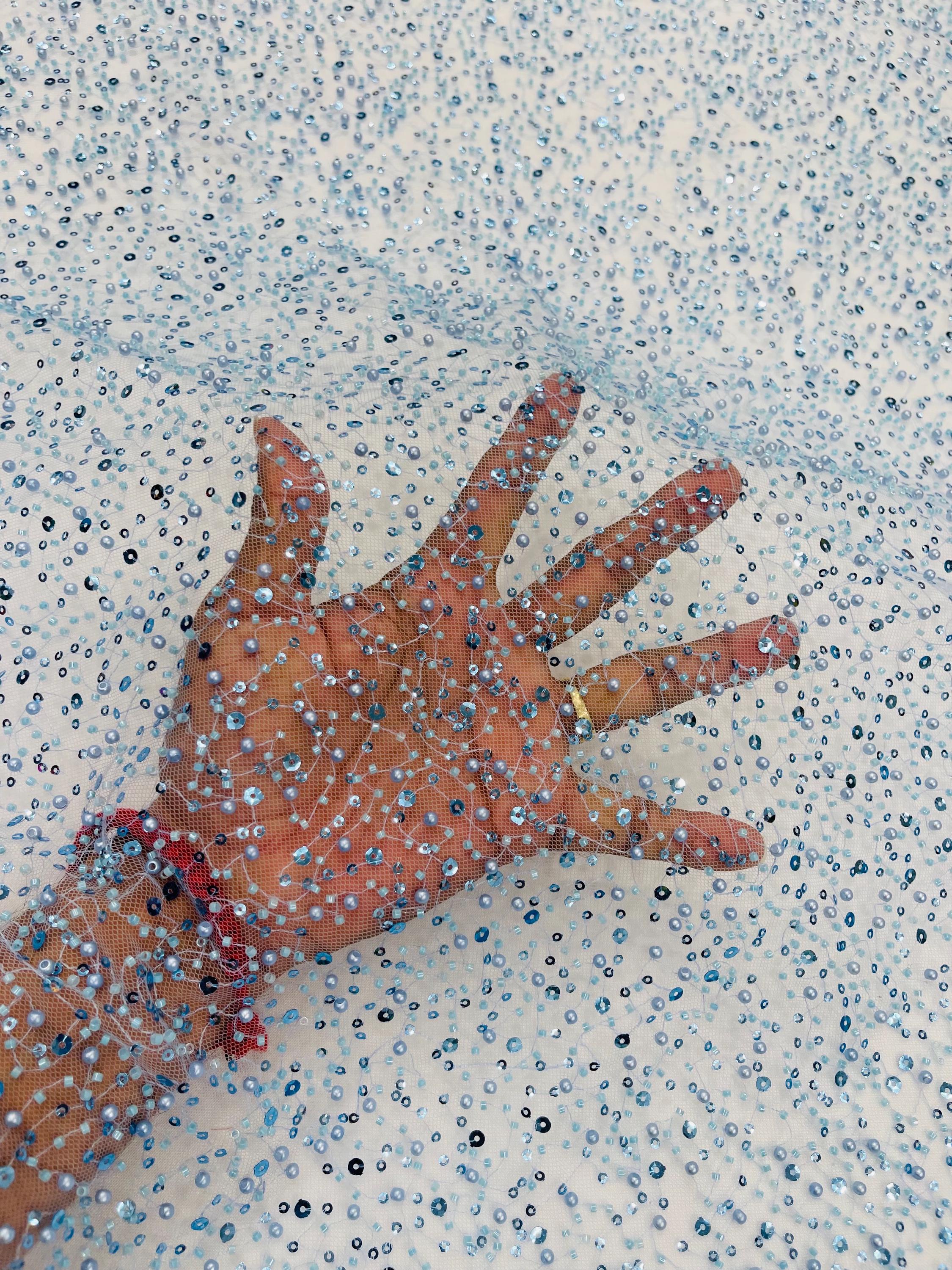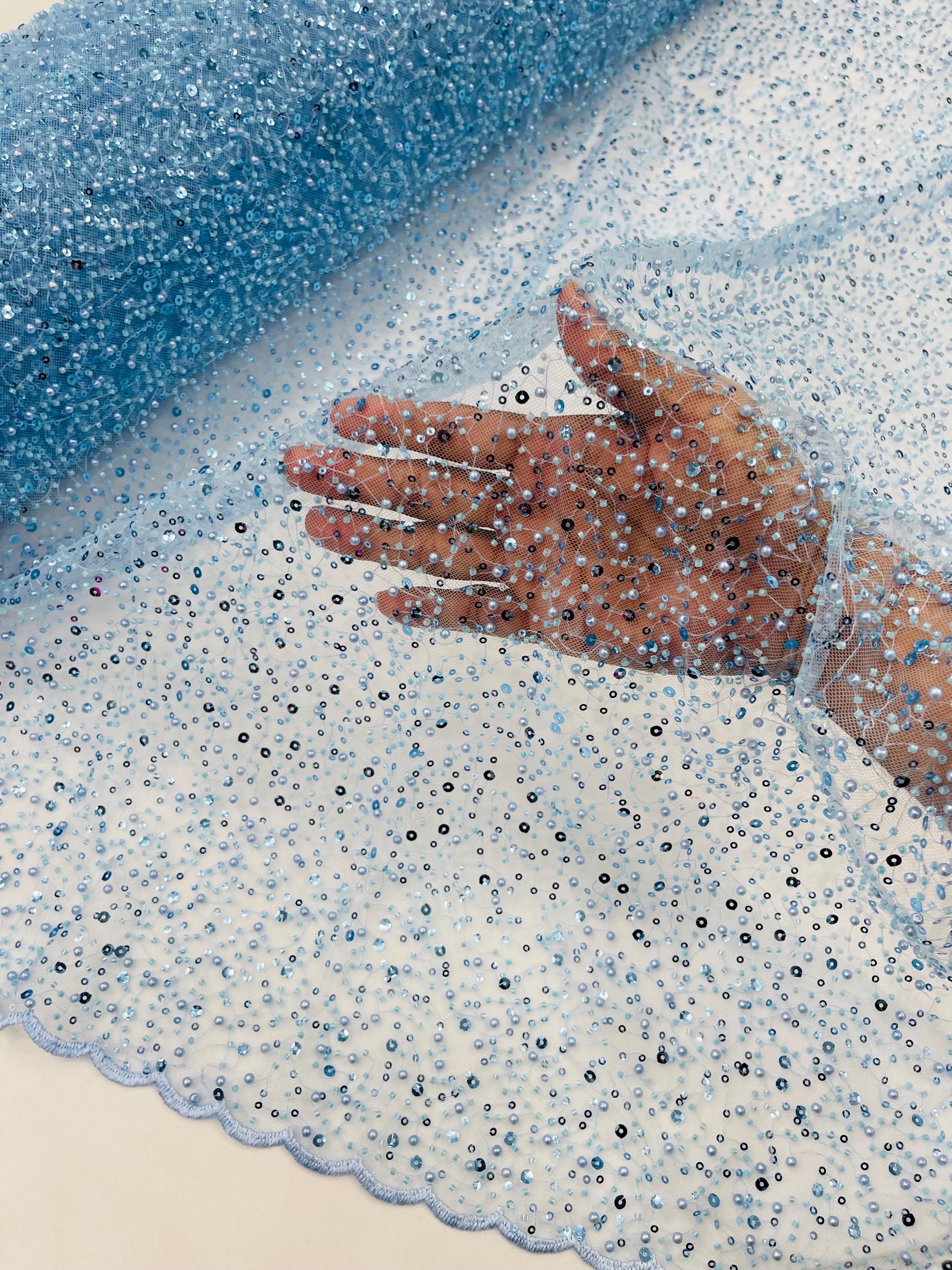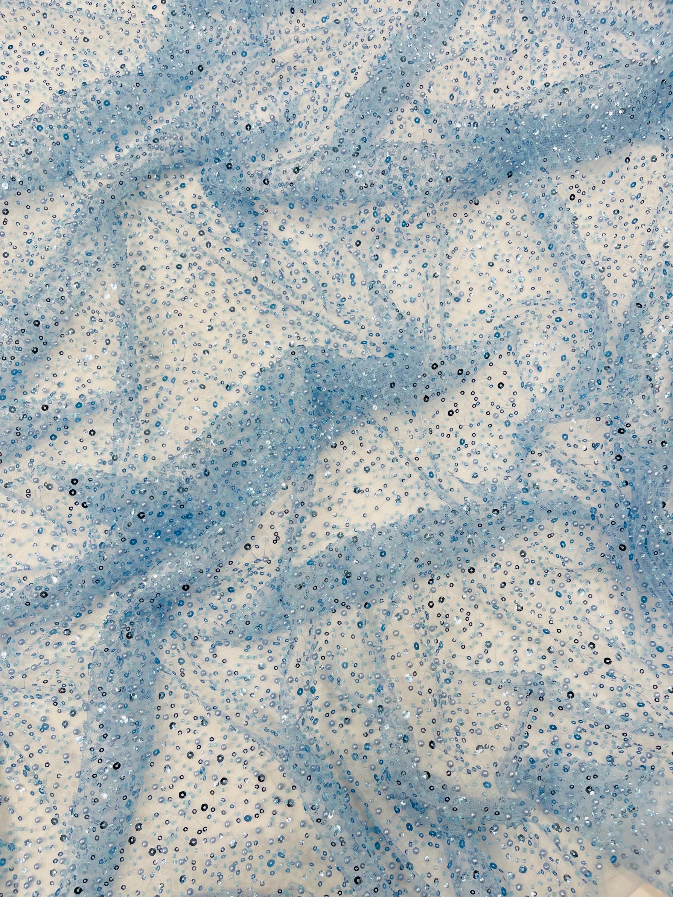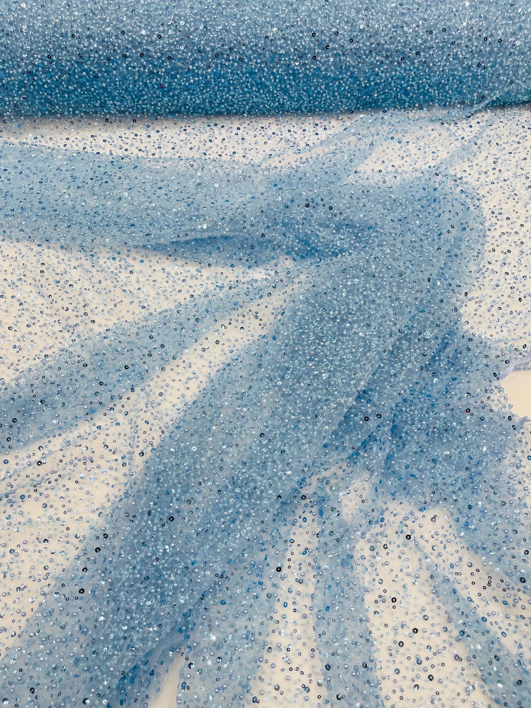 Baby Blue Beaded Sequin Mesh Lace Fabric, Rain Design Embroidery By The Yard