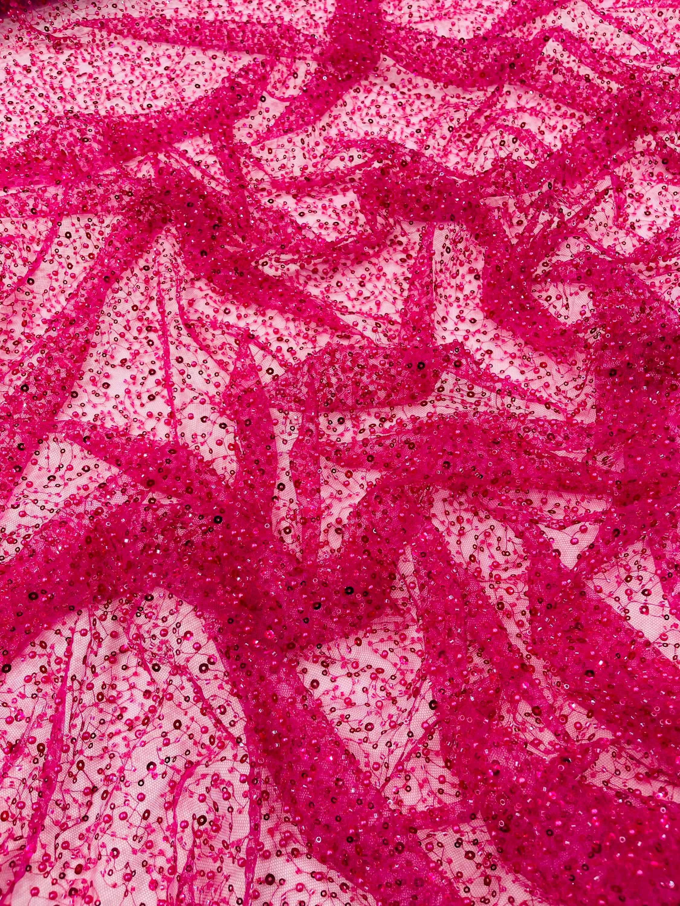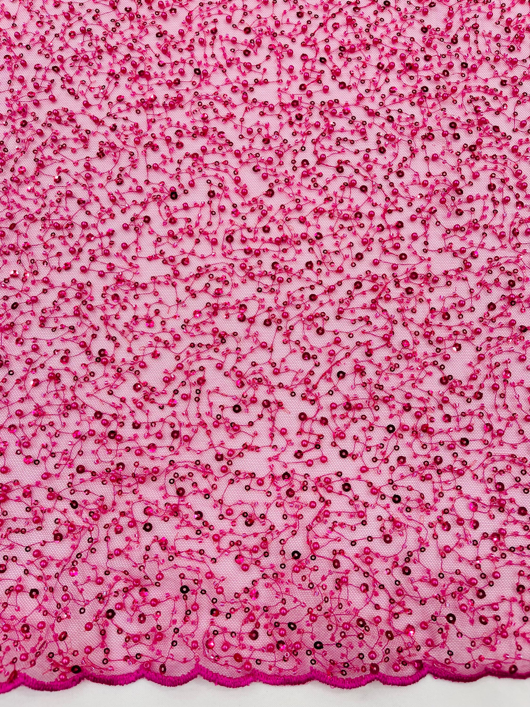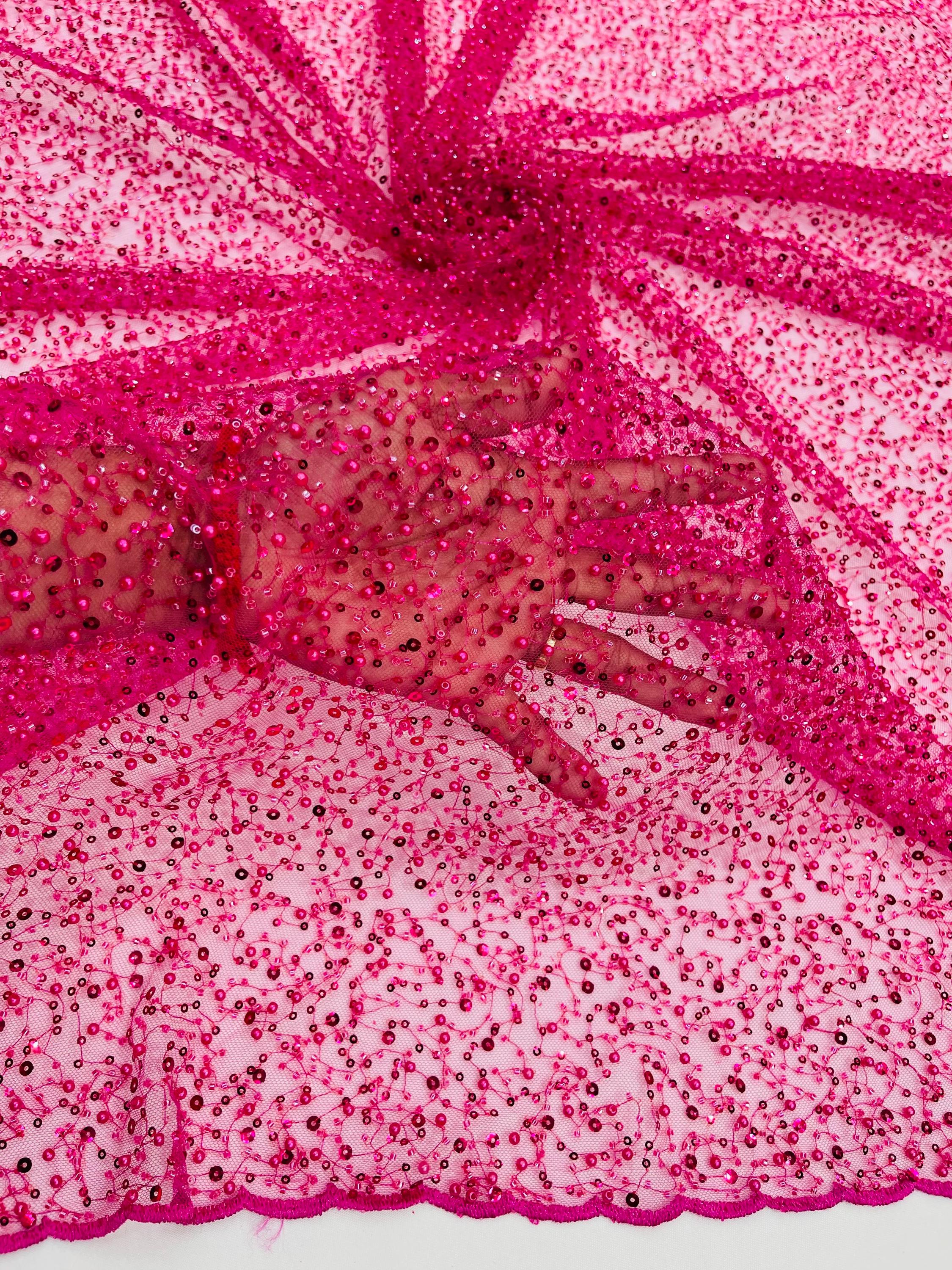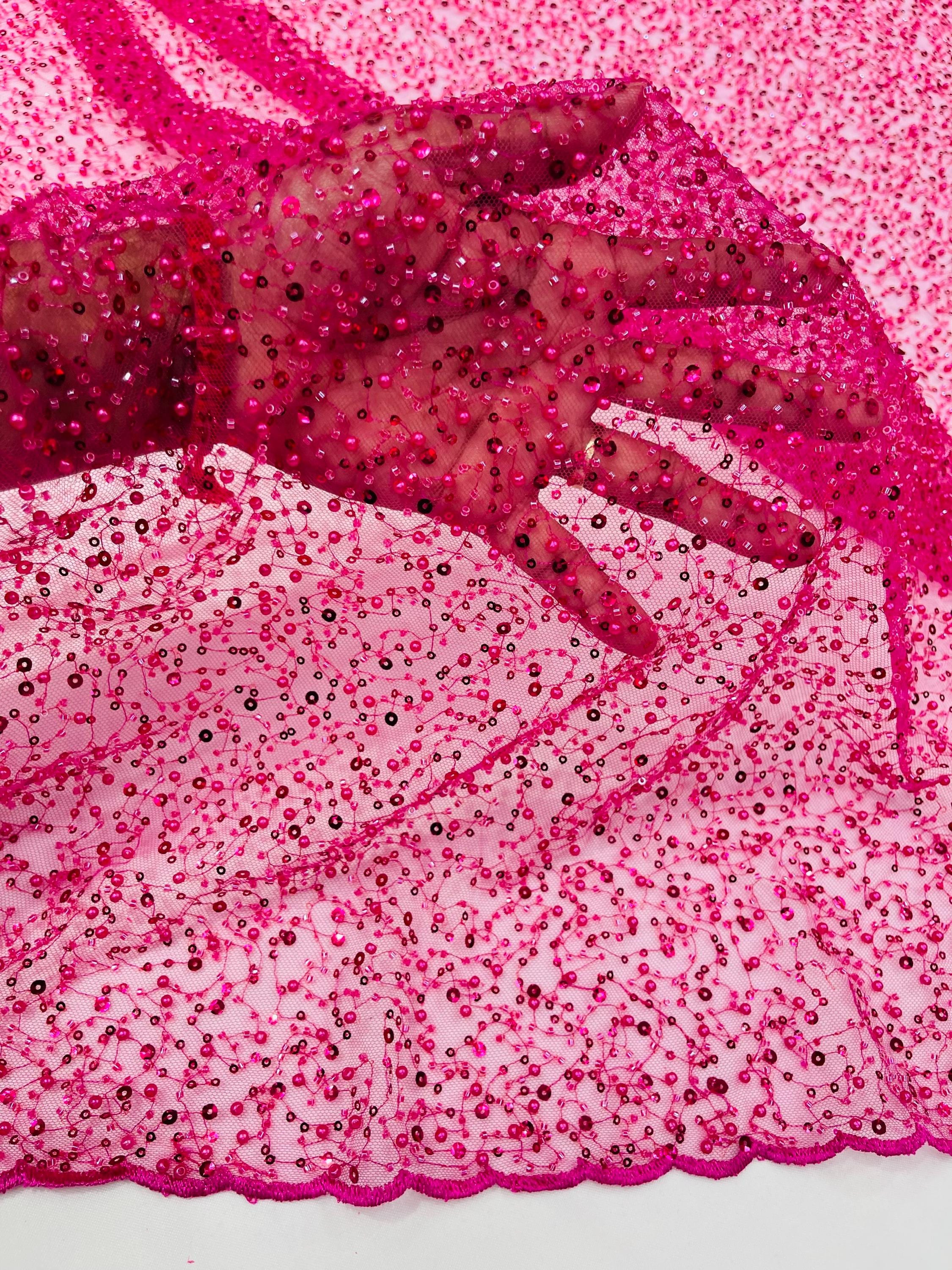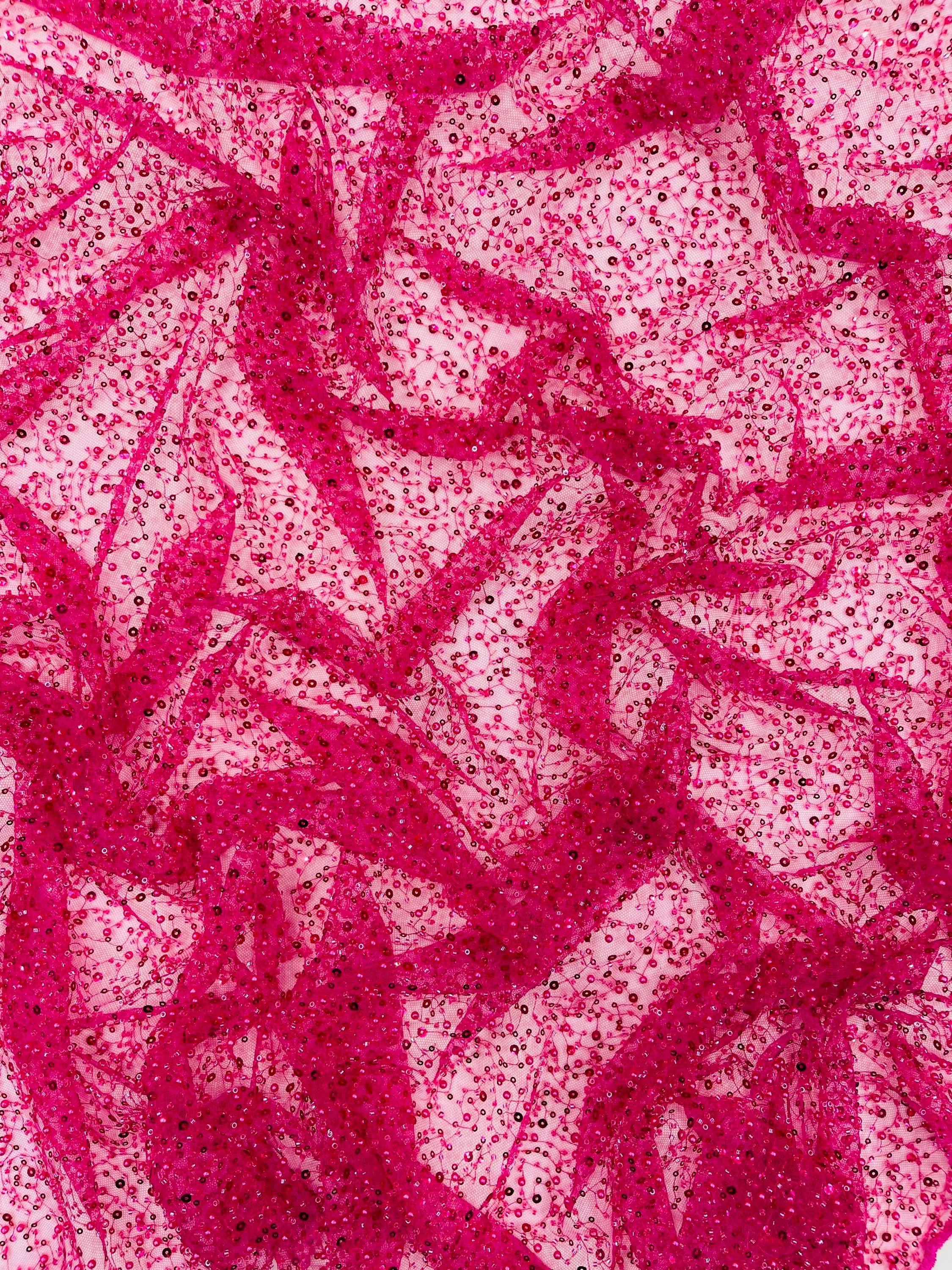 Fuchsia Beaded Sequin Mesh Lace Fabric, Rain Design Embroidery By The Yard