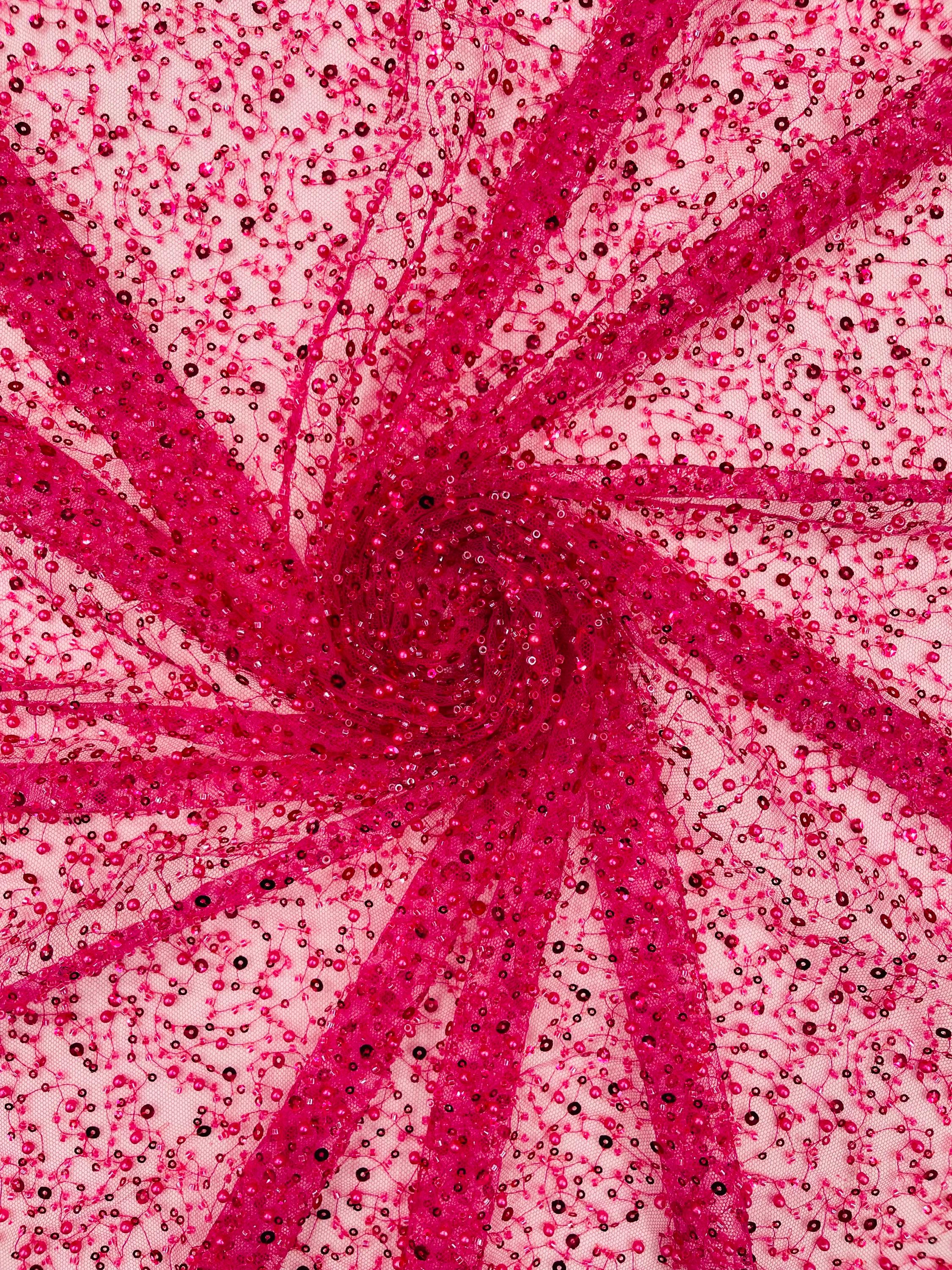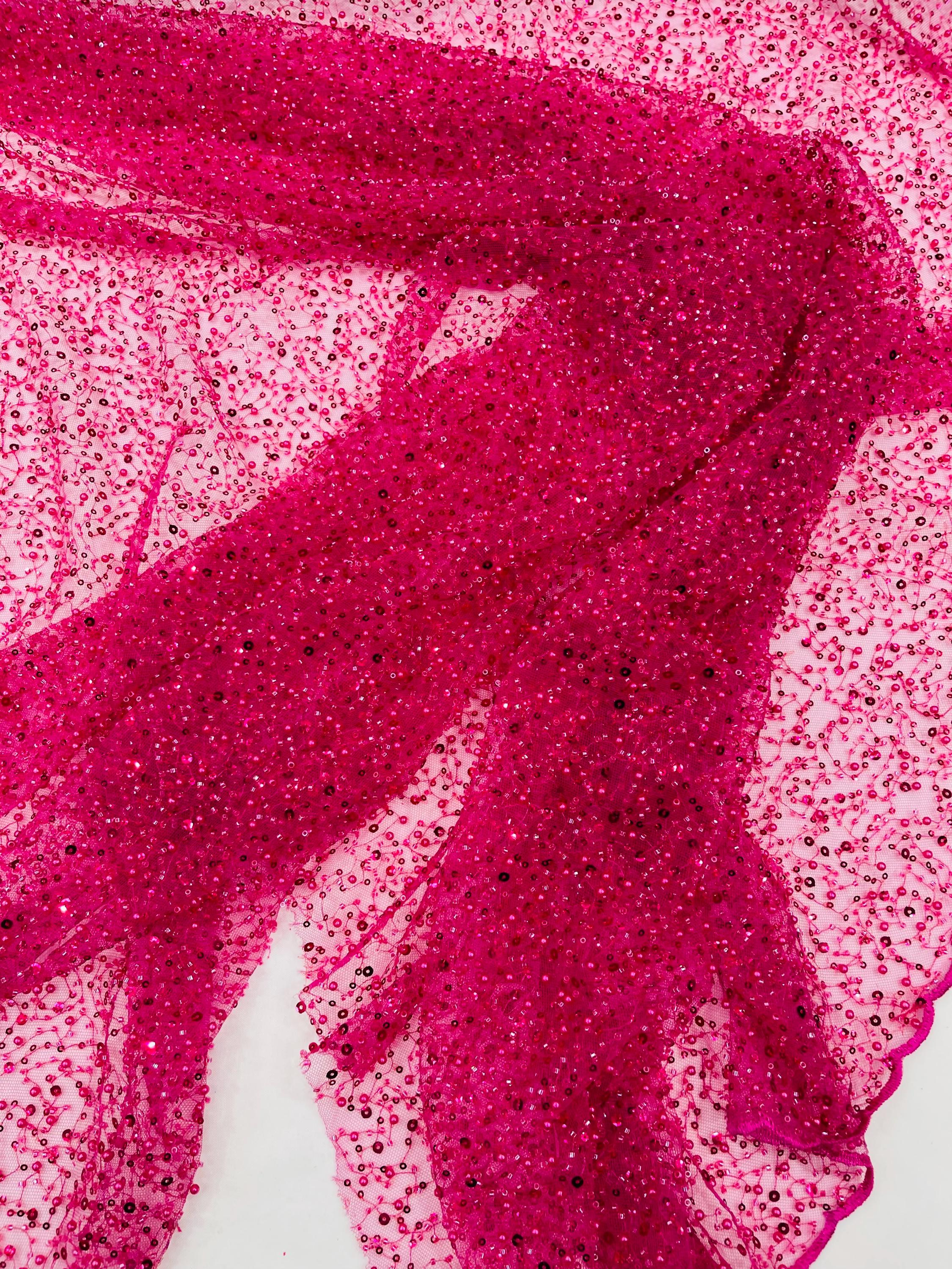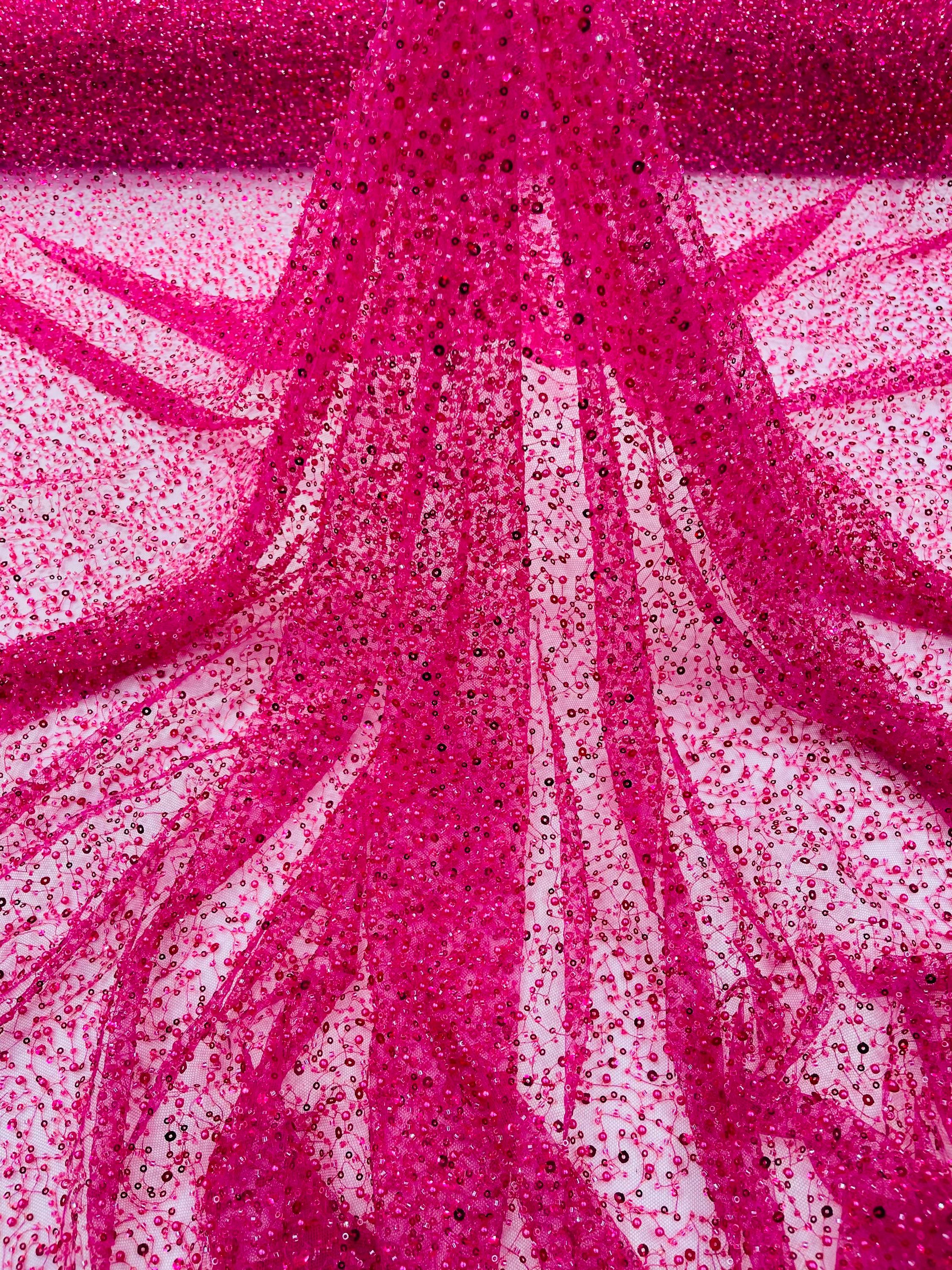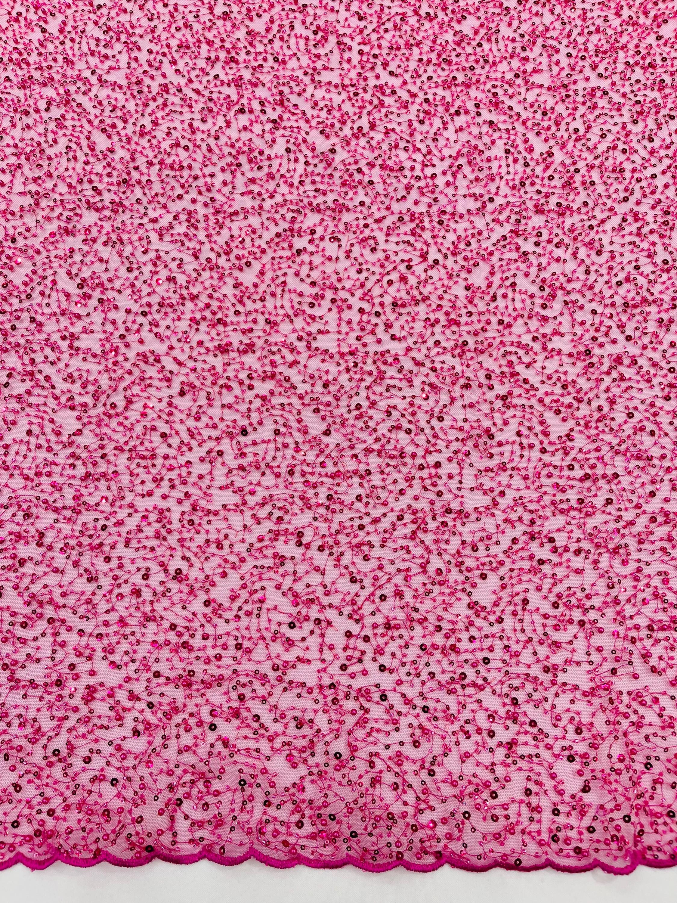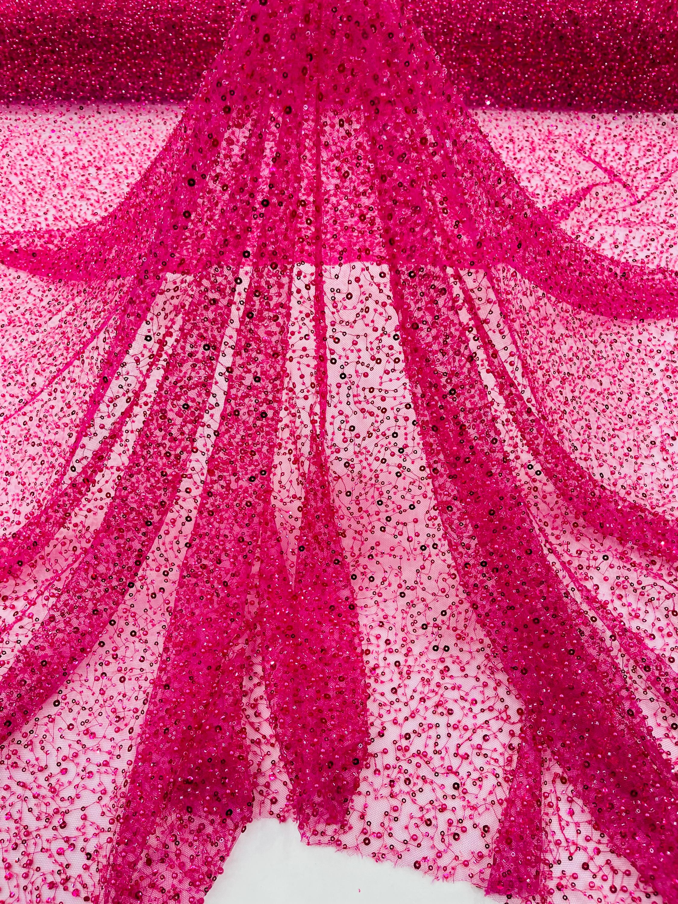 Fuchsia Beaded Sequin Mesh Lace Fabric, Rain Design Embroidery By The Yard