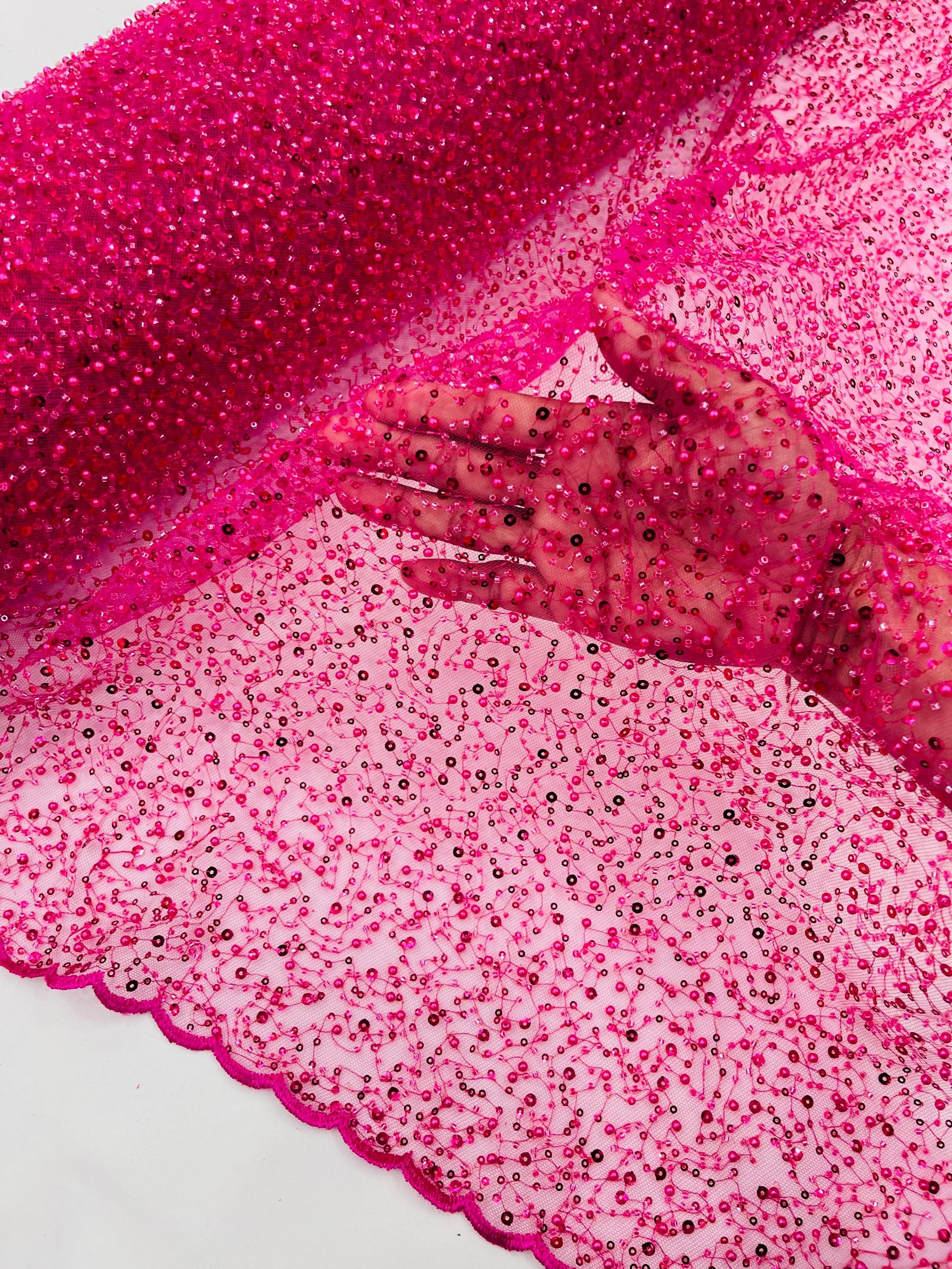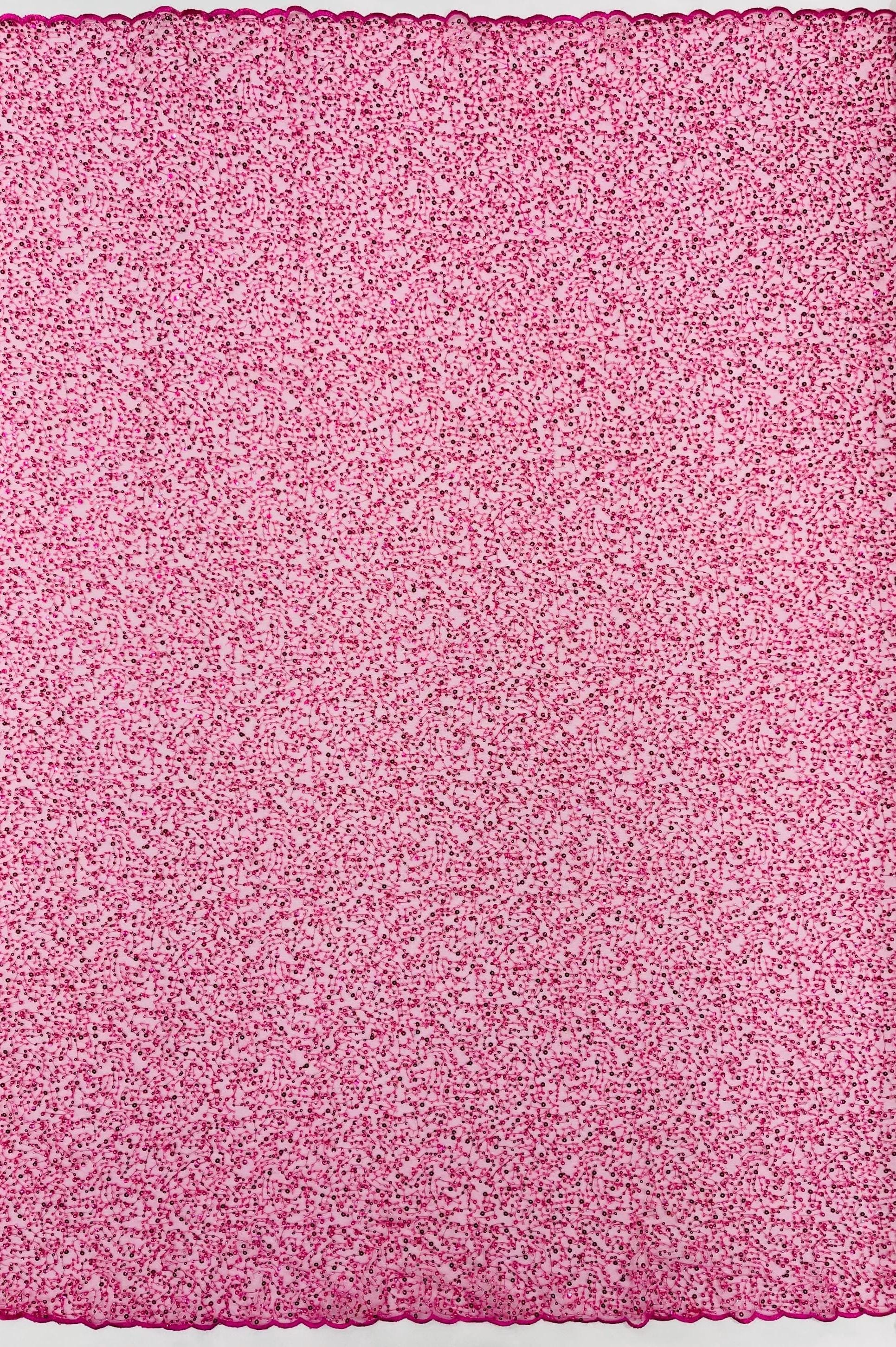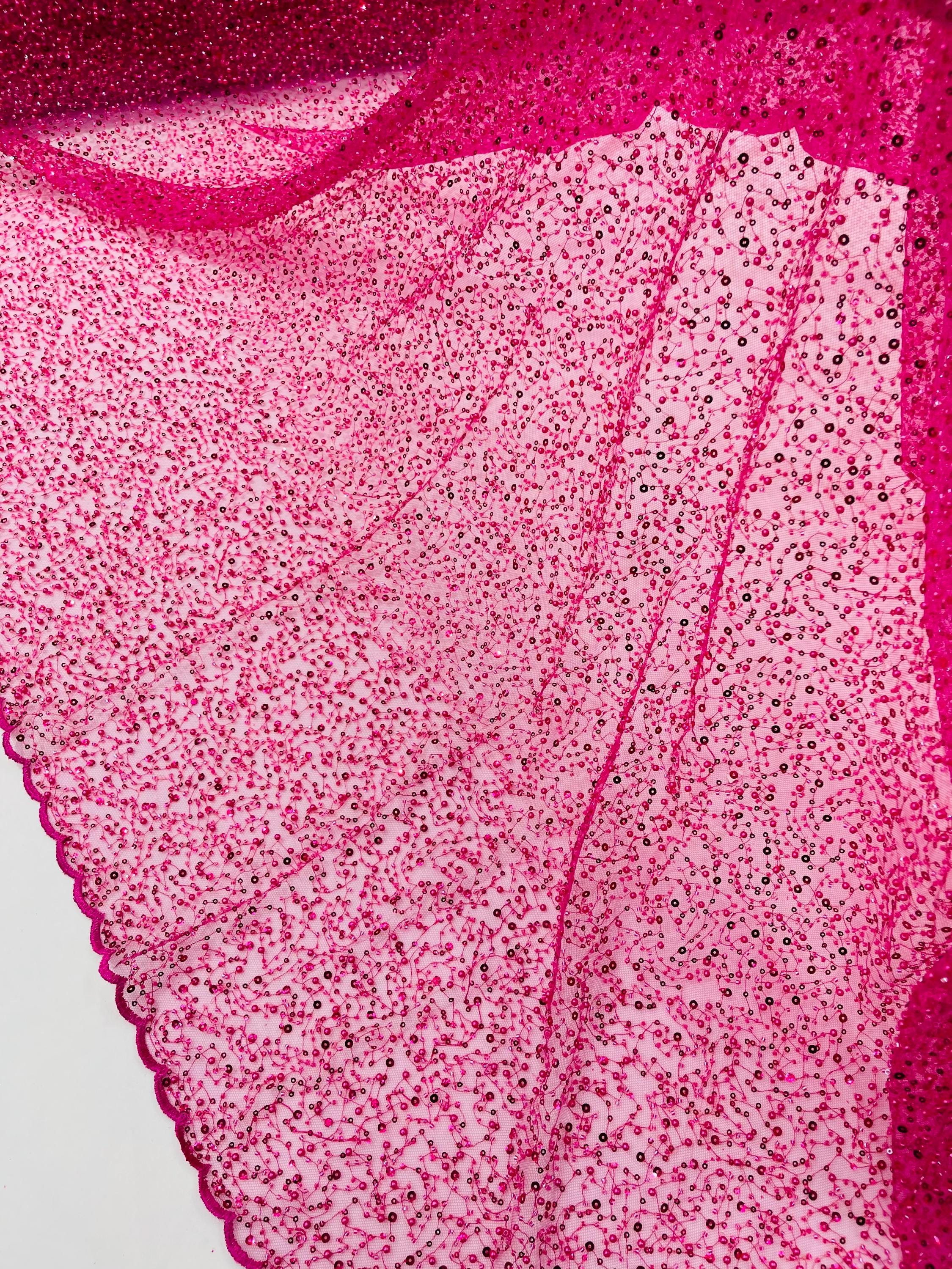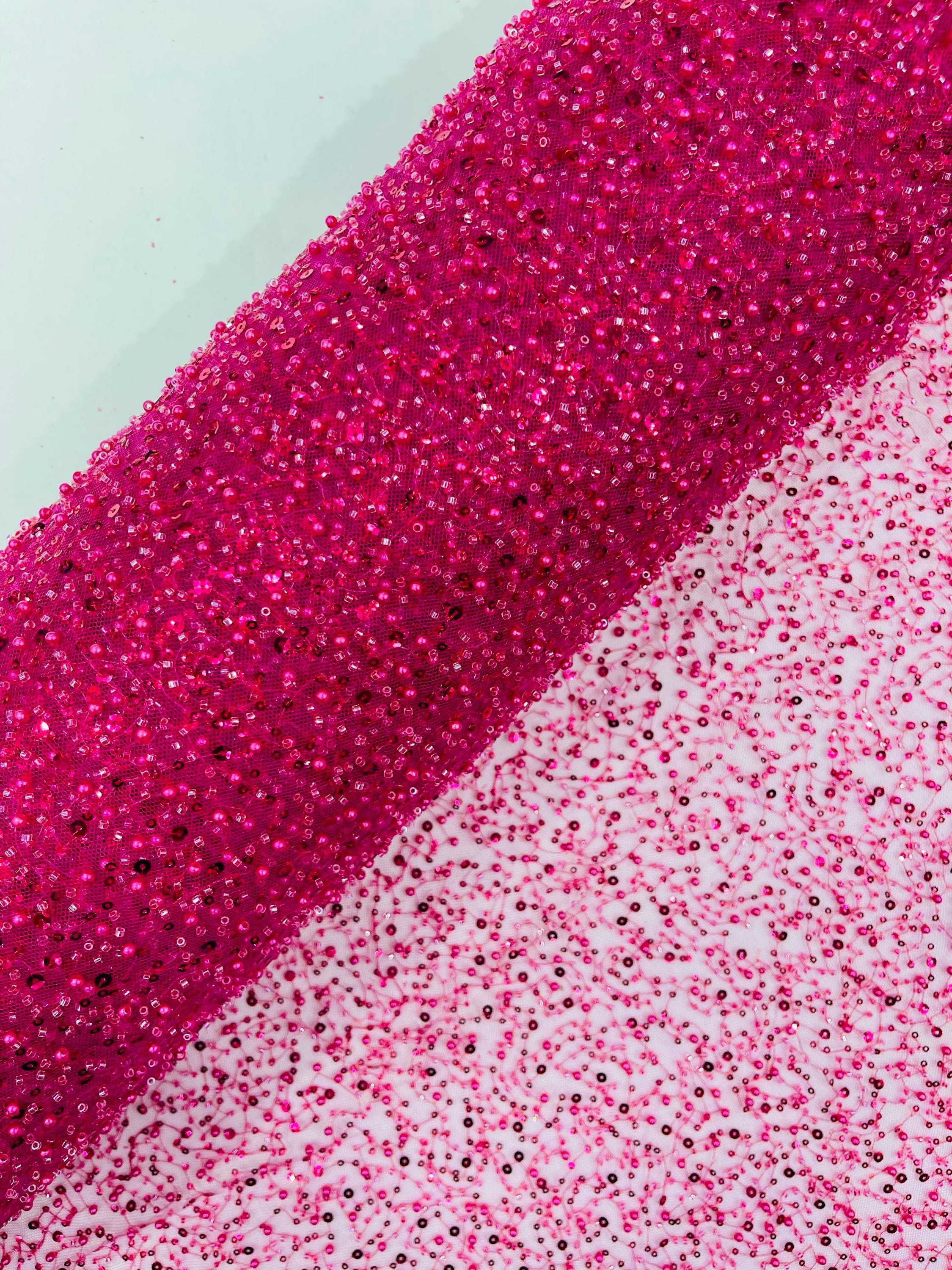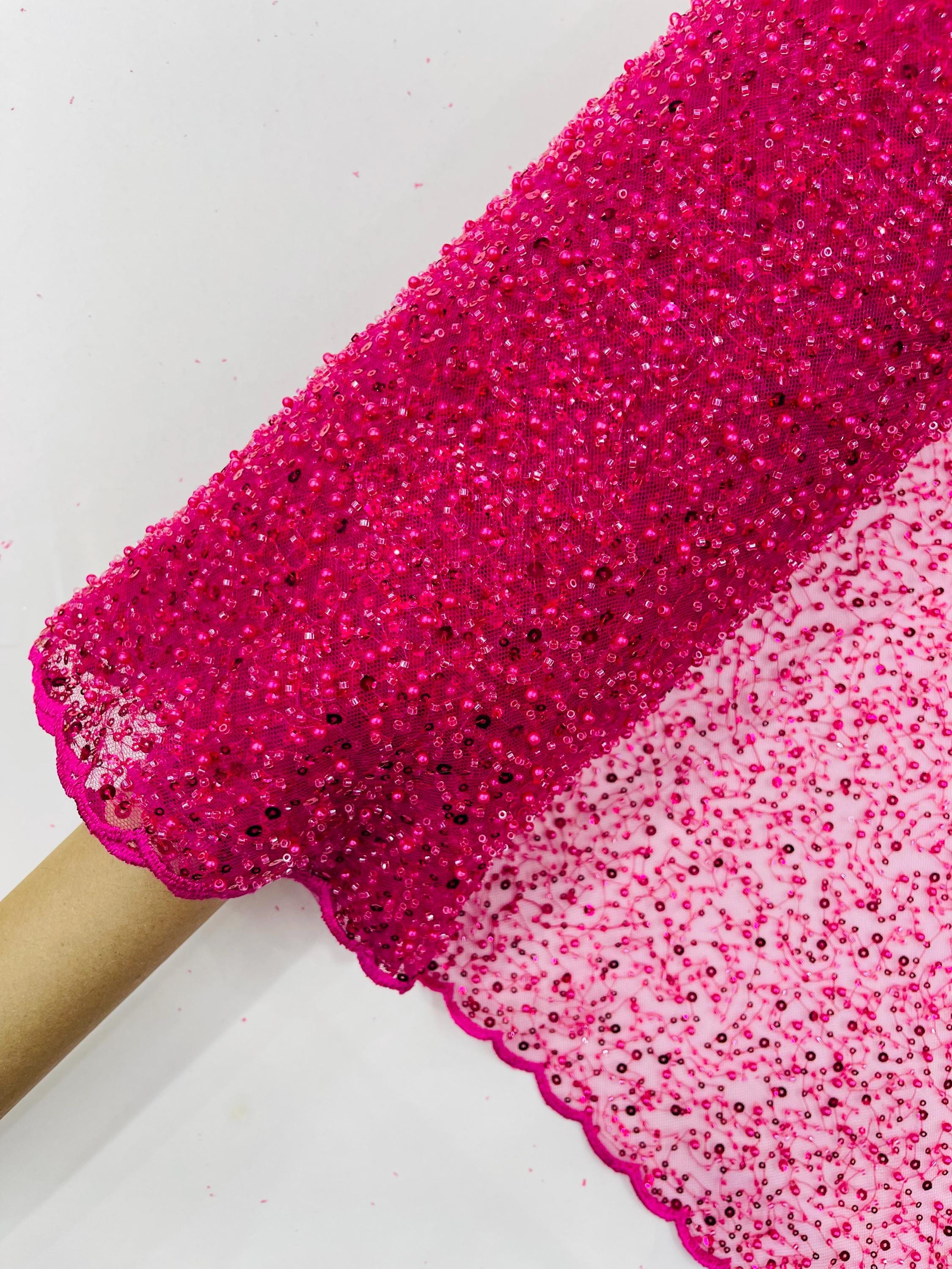Fuchsia Beaded Sequin Mesh Lace Fabric, Rain Design Embroidery By The Yard