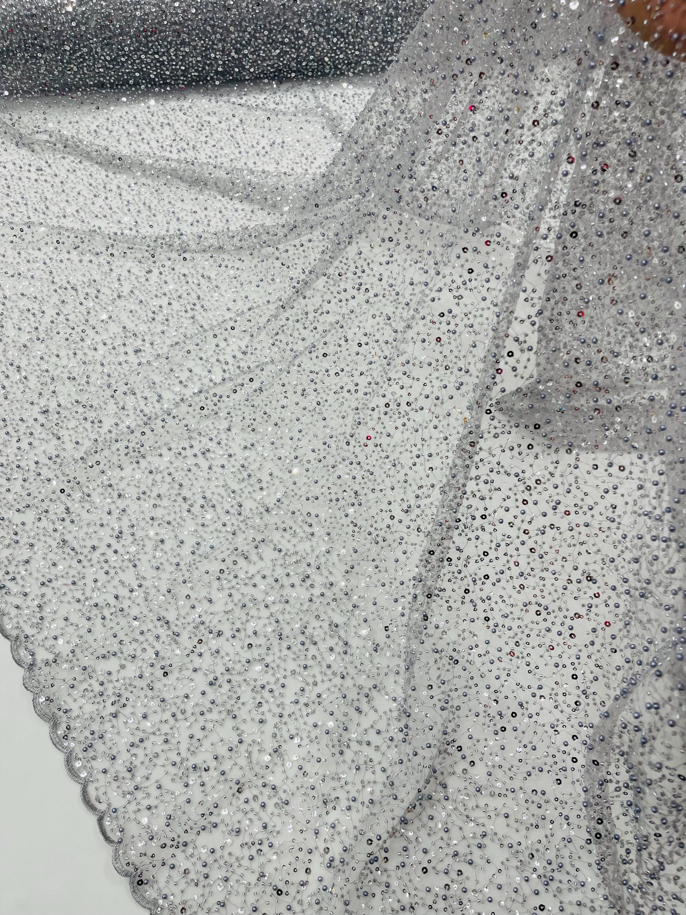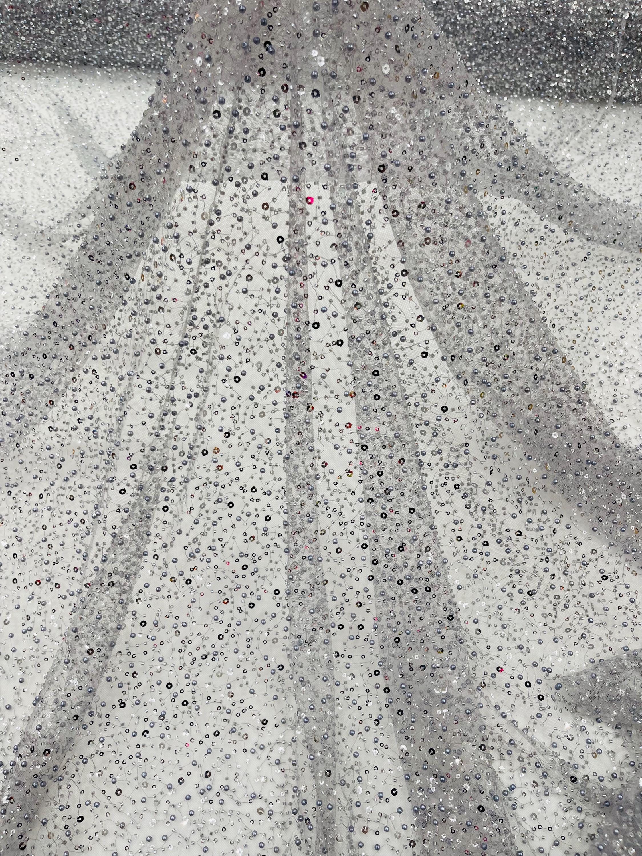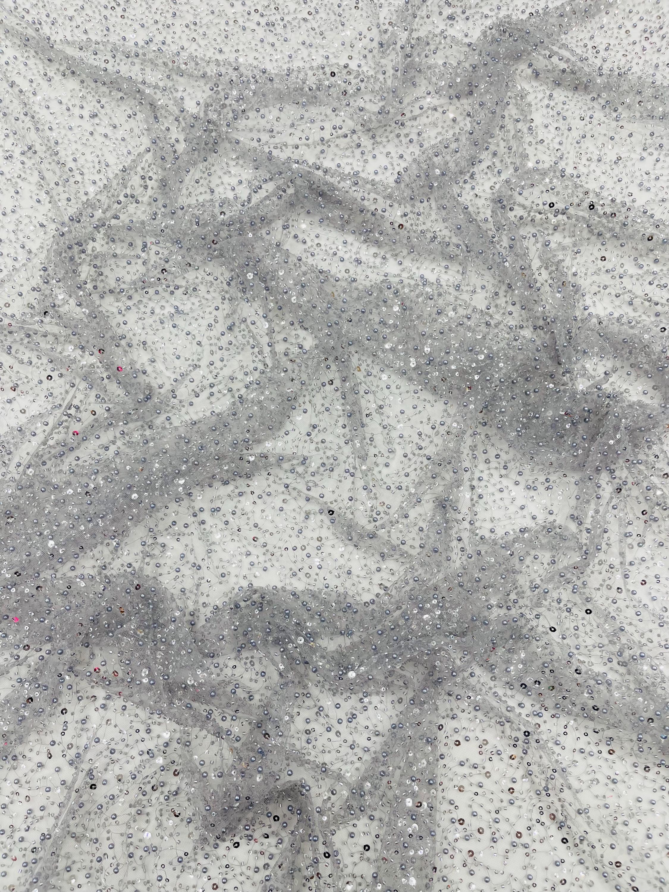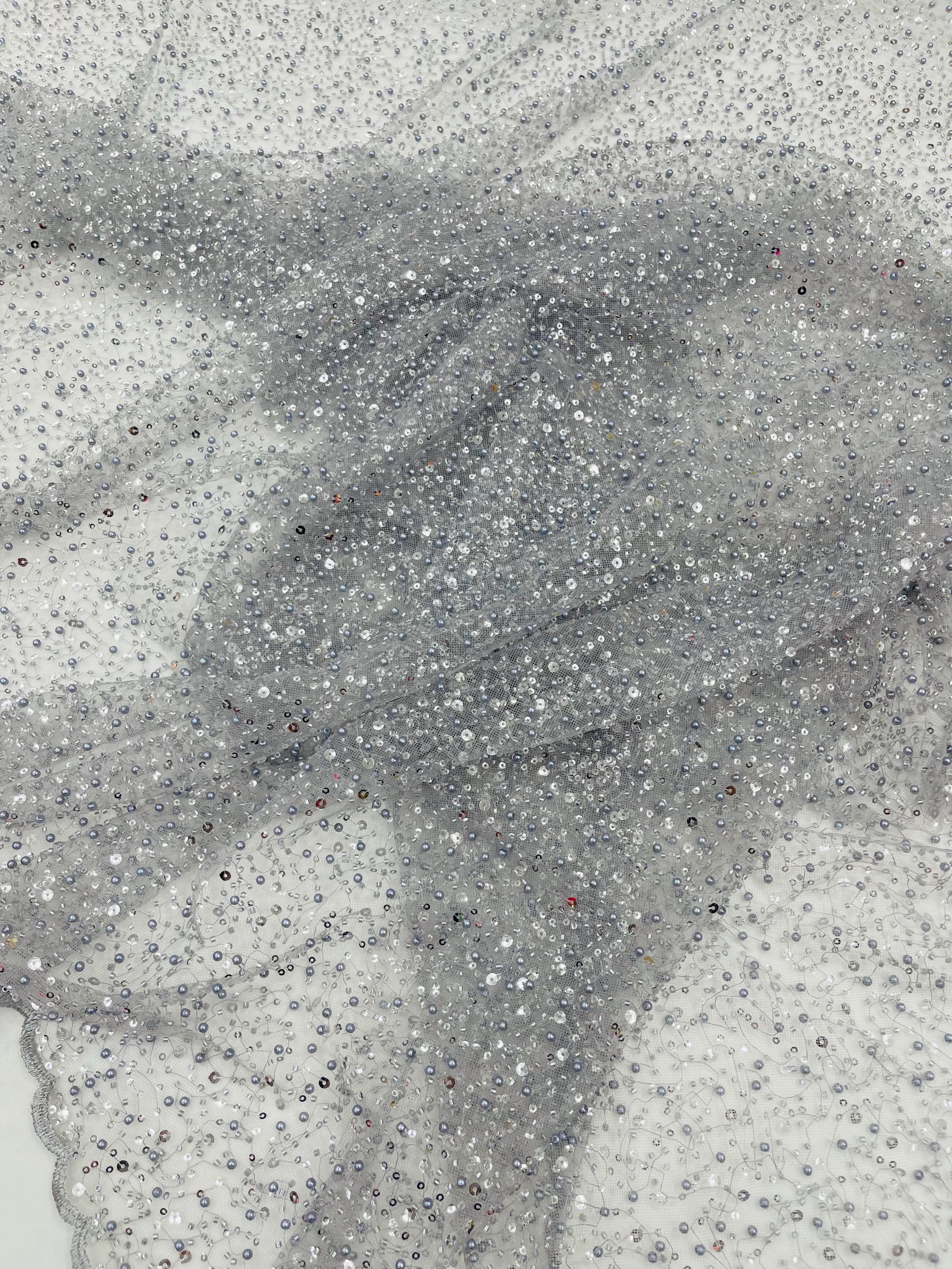 Silver Beaded Sequin Mesh Lace Fabric, Rain Design Embroidery By The Yard