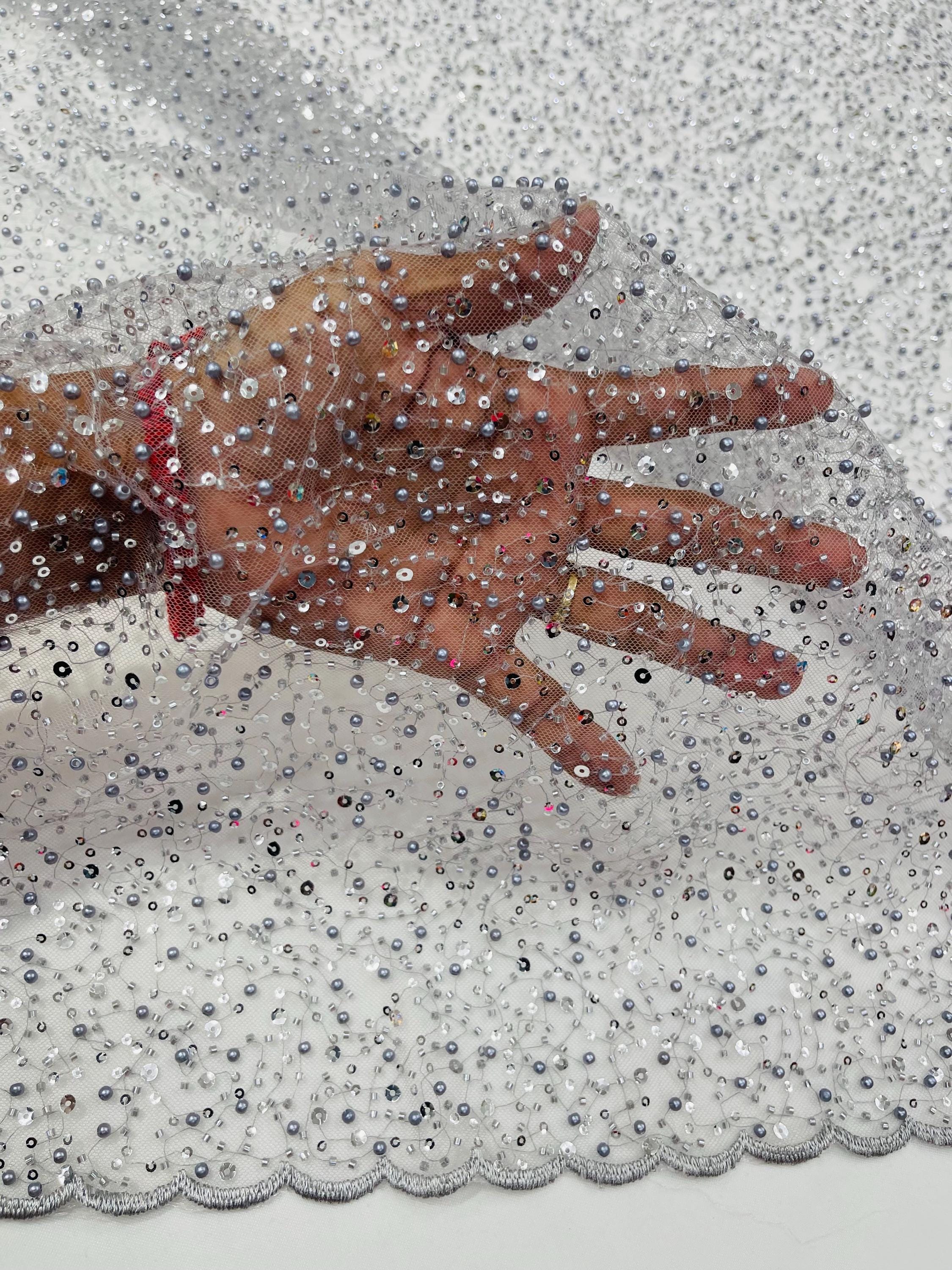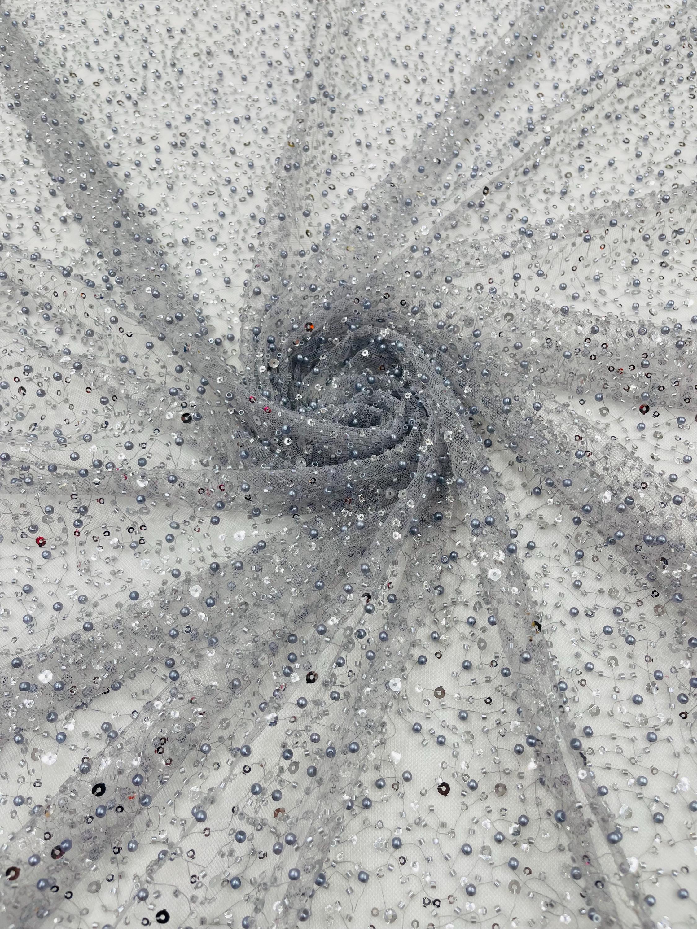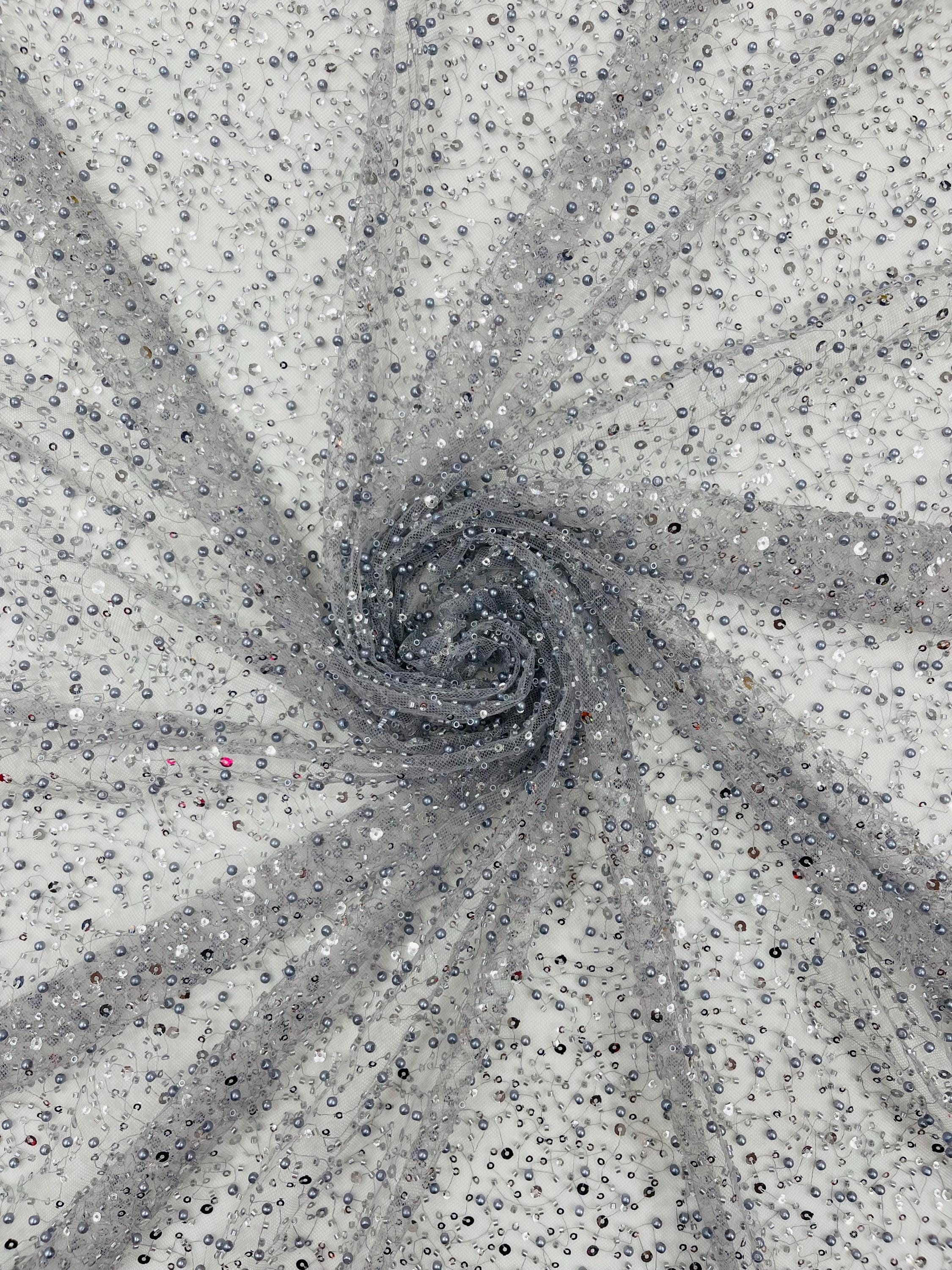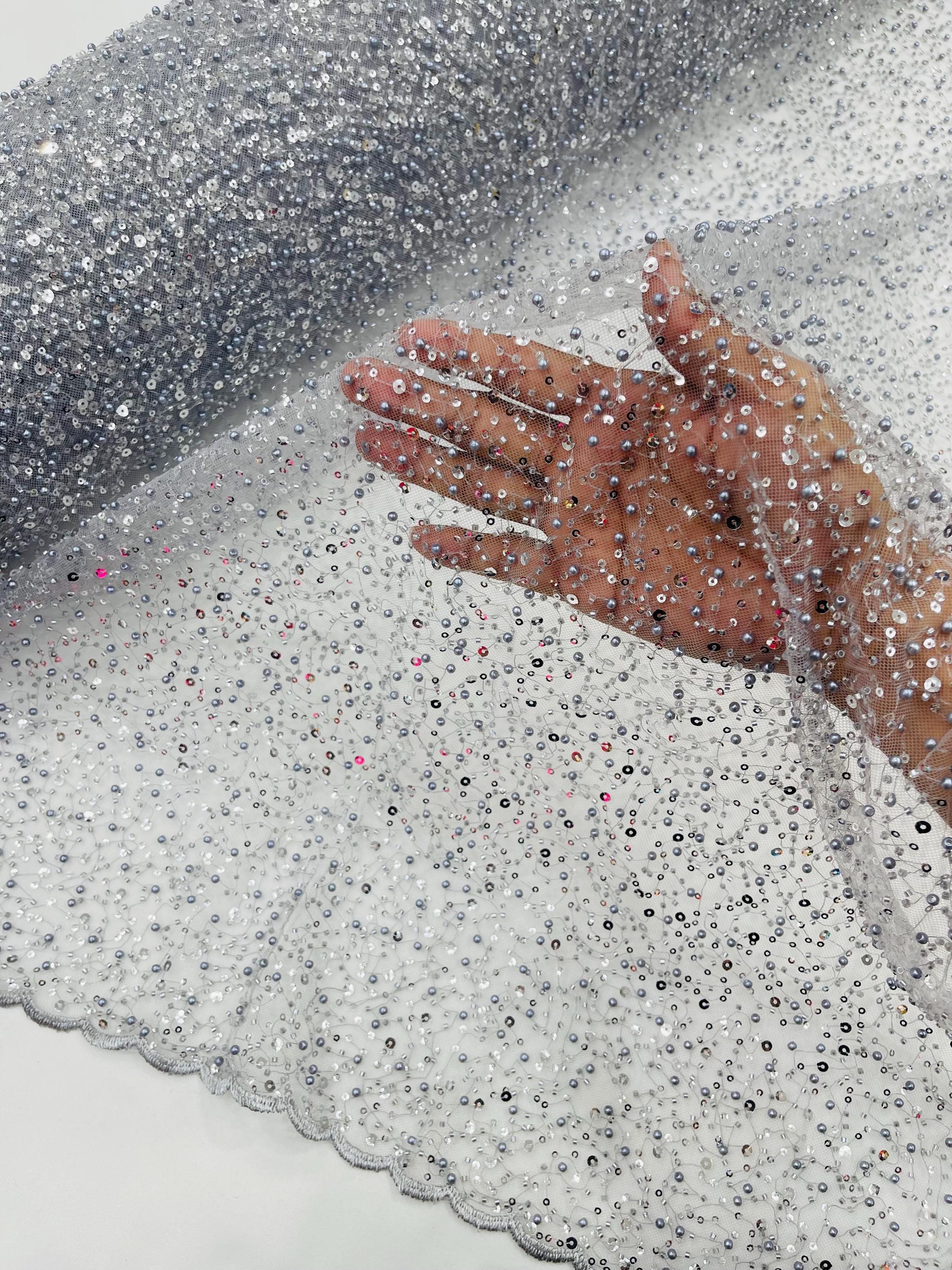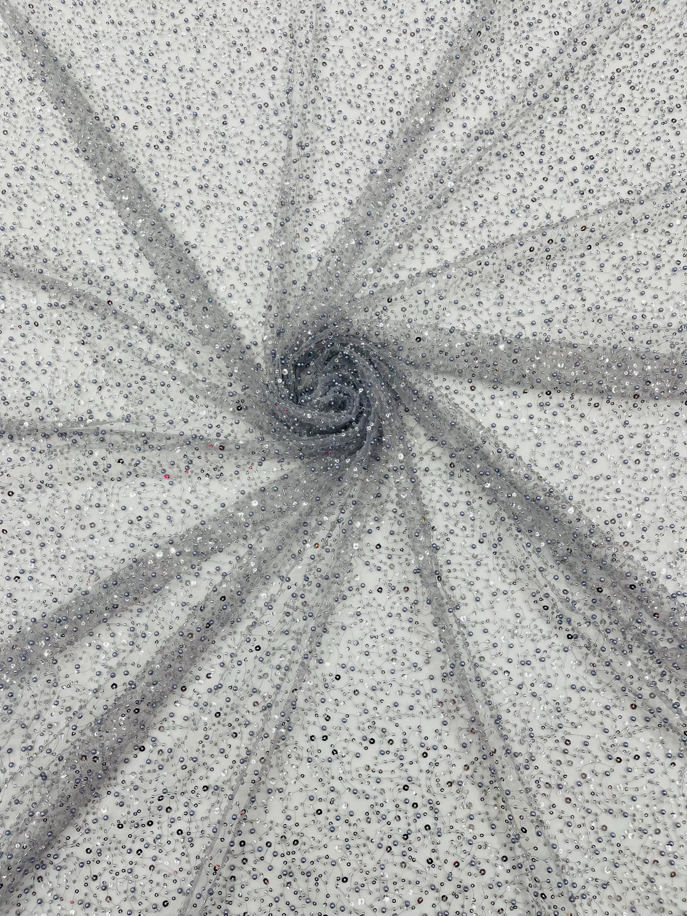 Silver Beaded Sequin Mesh Lace Fabric, Rain Design Embroidery By The Yard