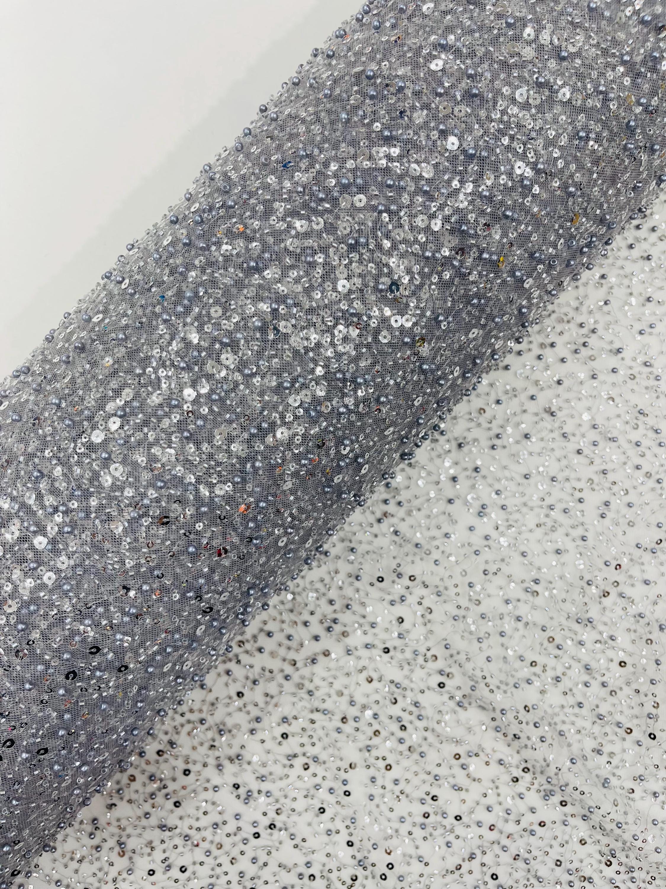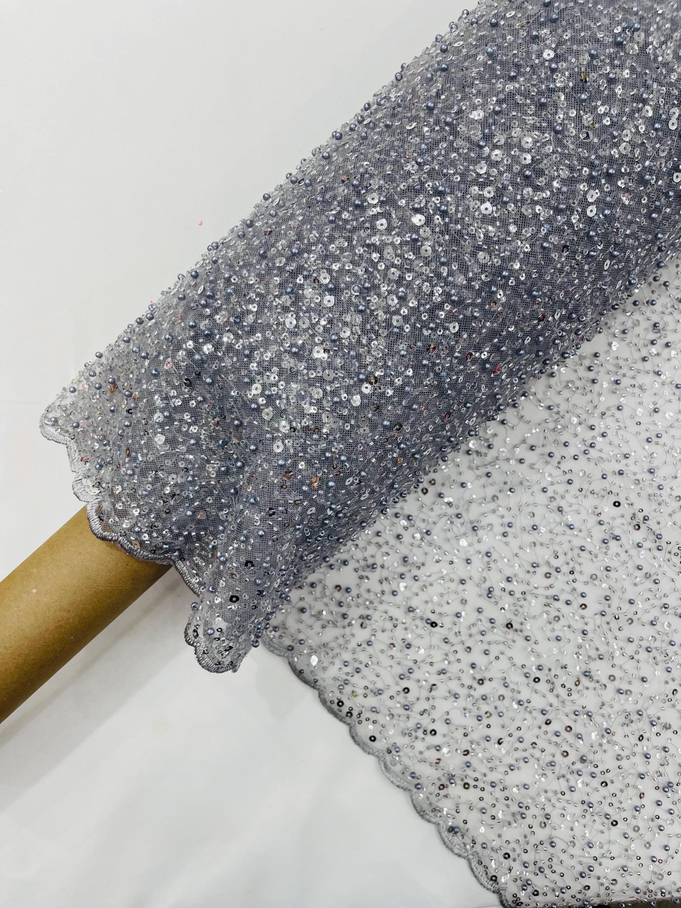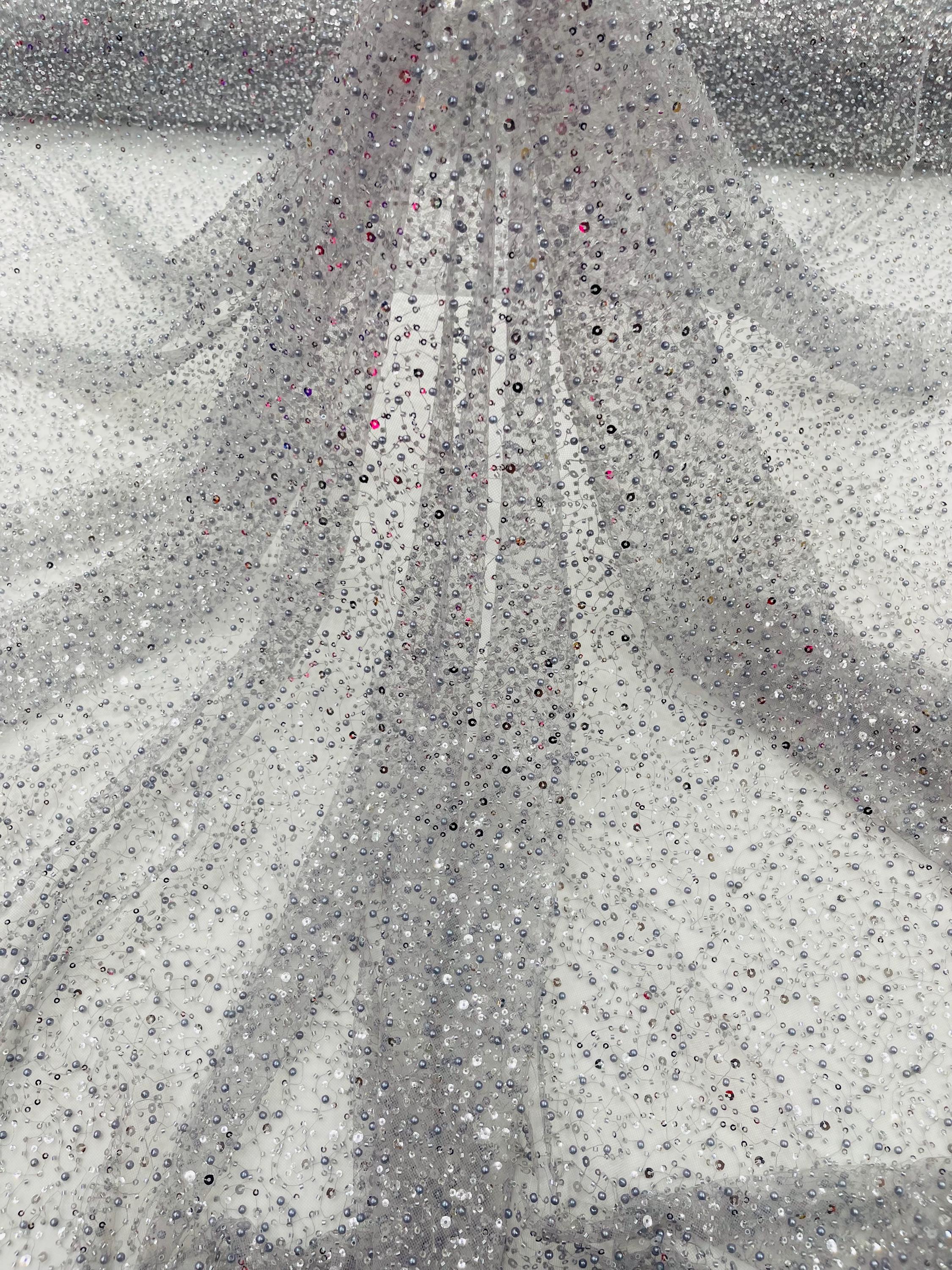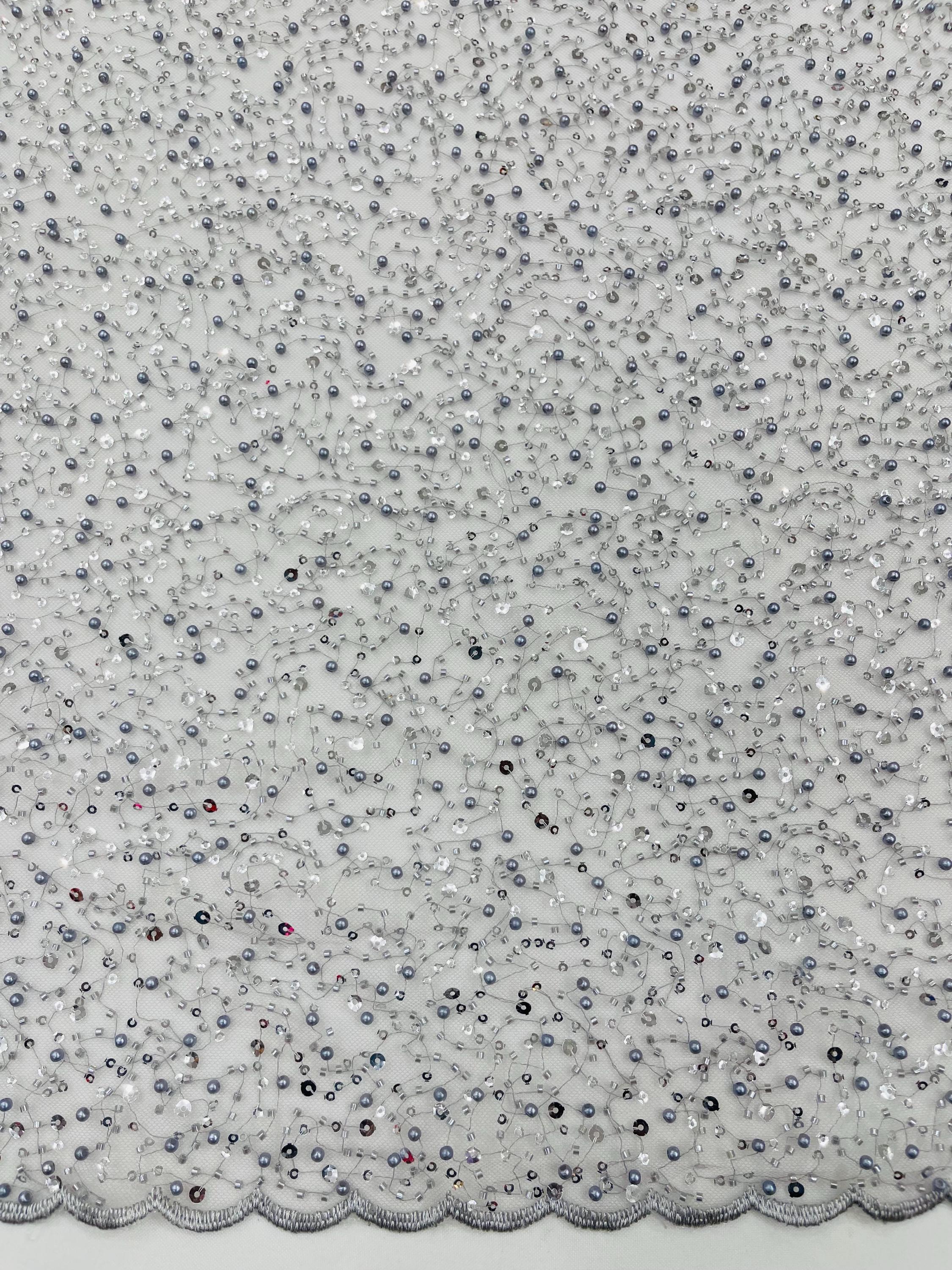 Silver Beaded Sequin Mesh Lace Fabric, Rain Design Embroidery By The Yard