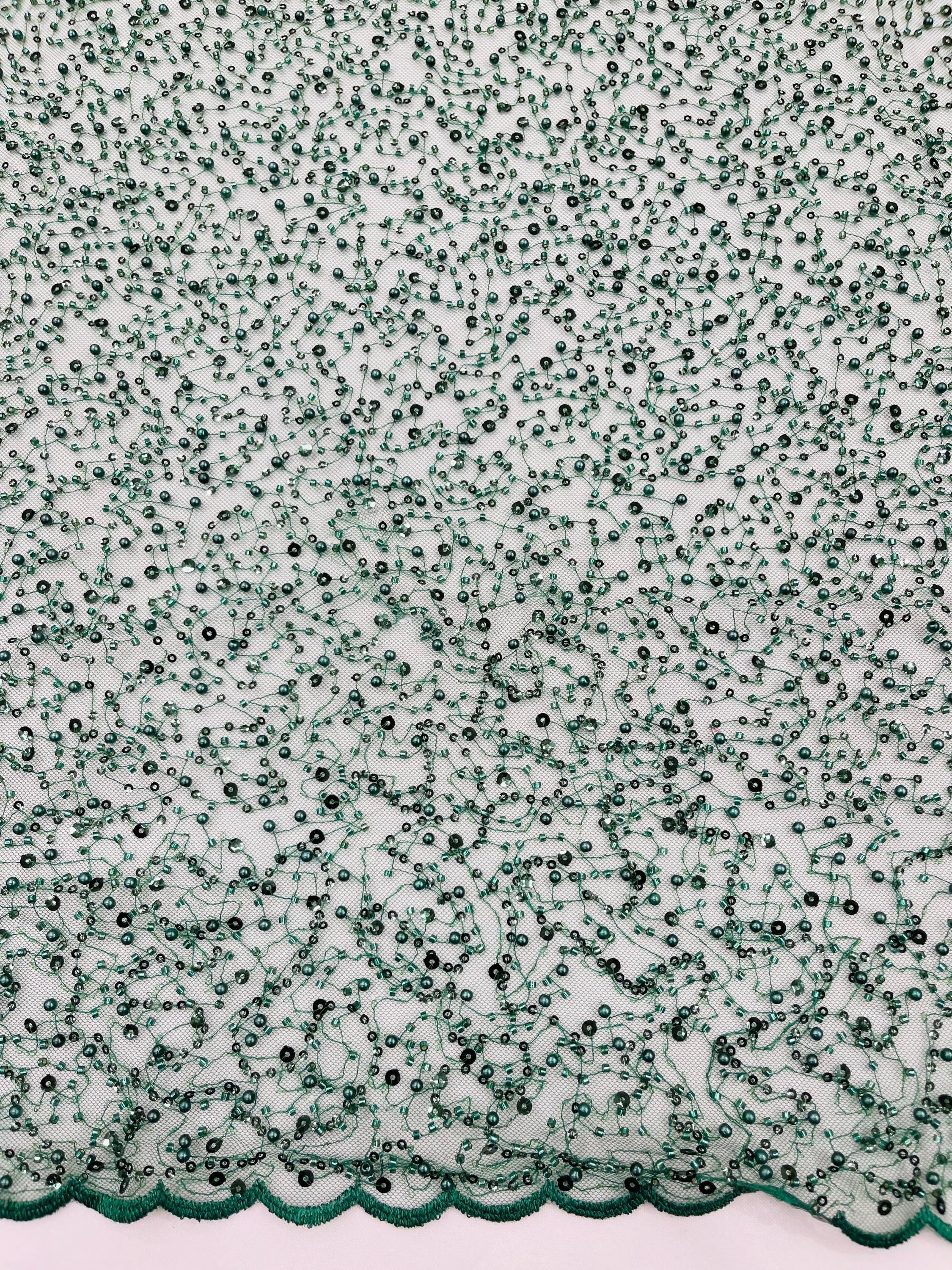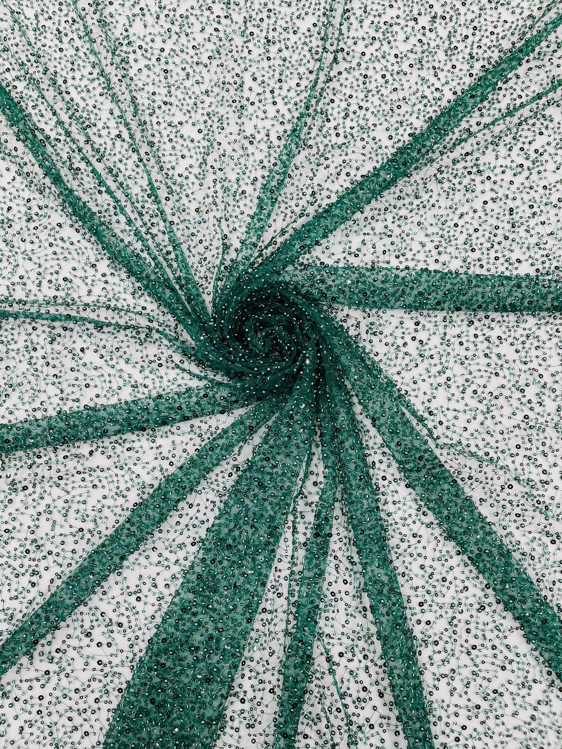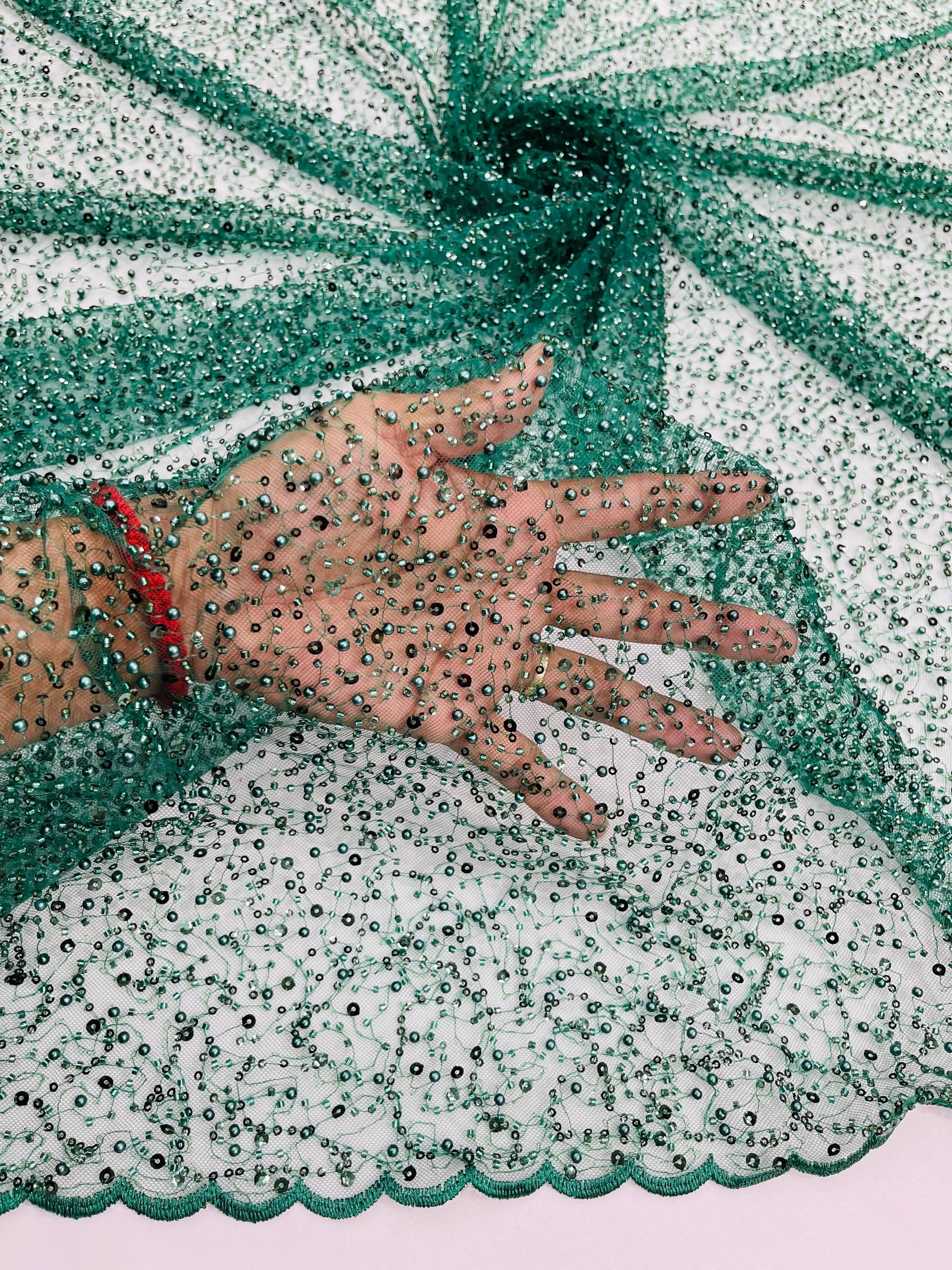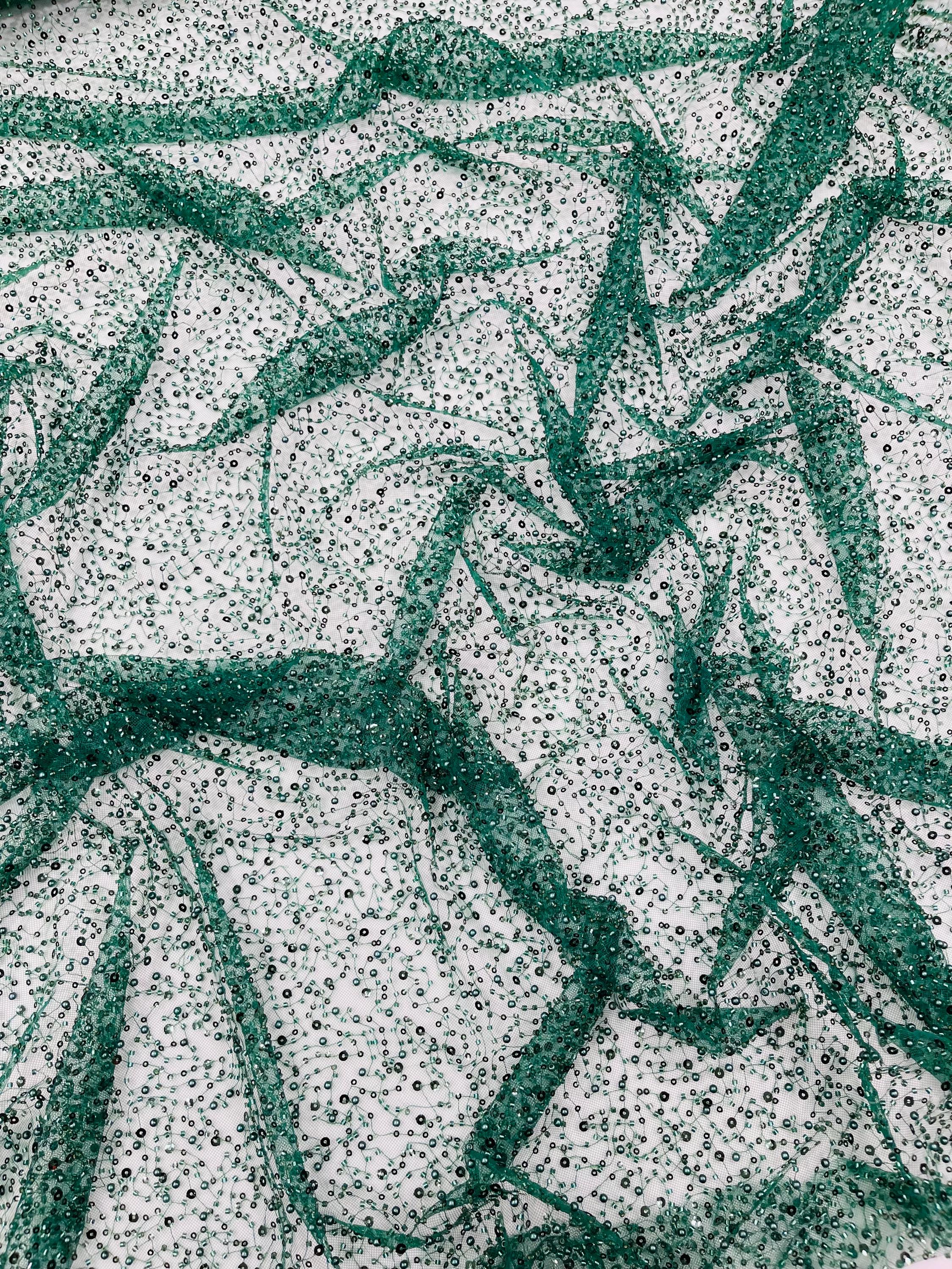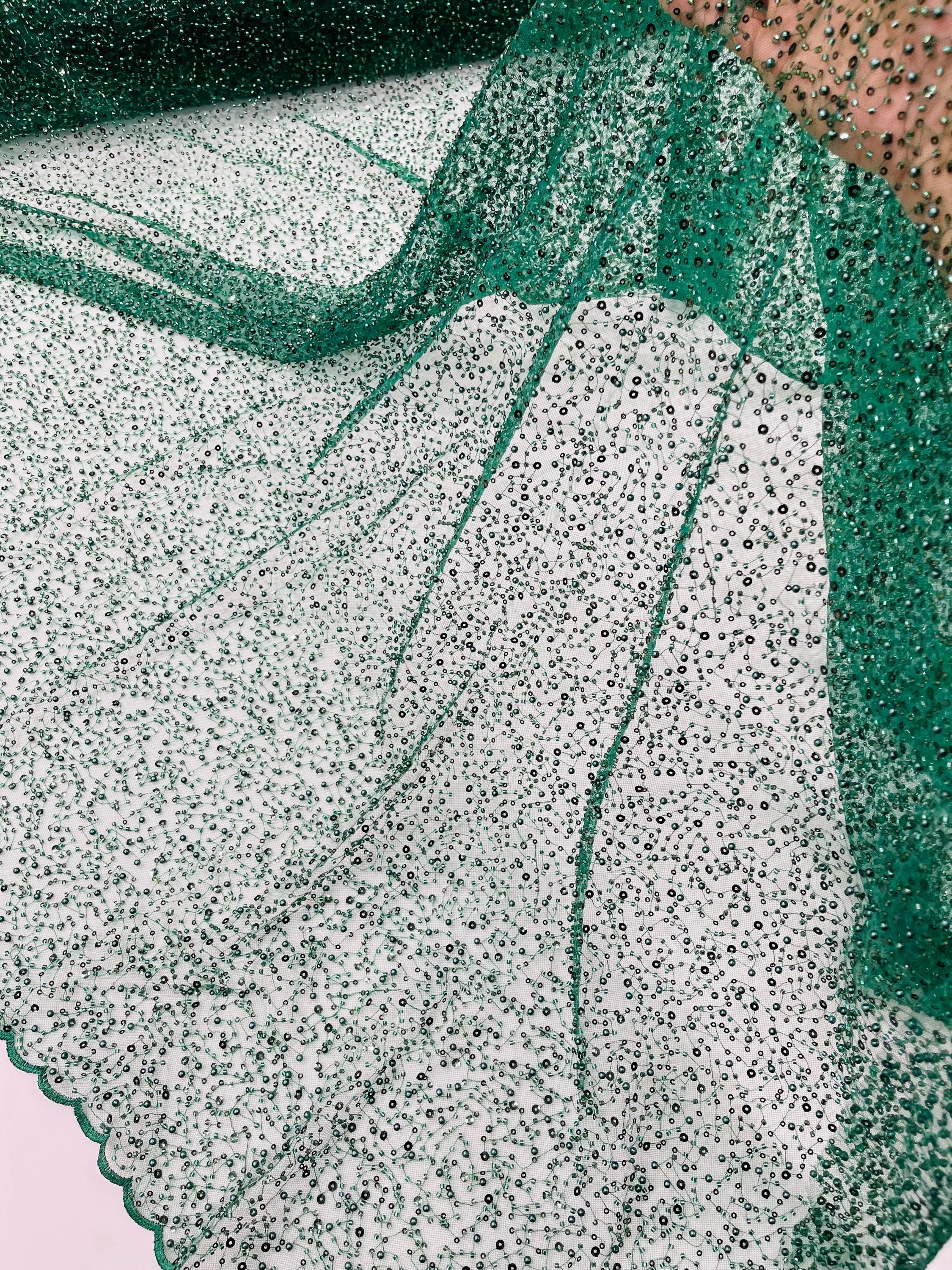 Hunter Green Beaded Sequin Mesh Lace Fabric, Rain Design Embroidery By The Yard