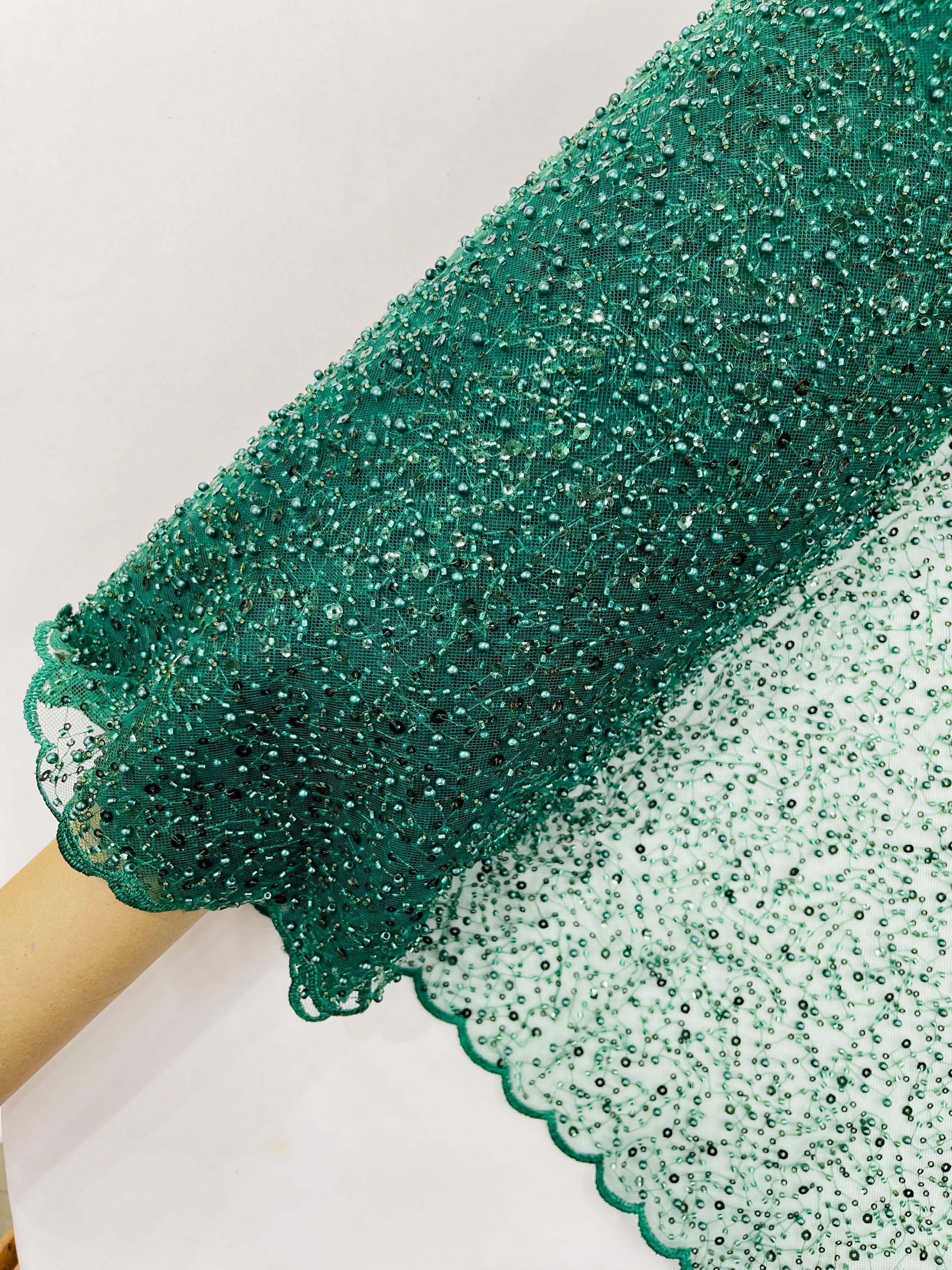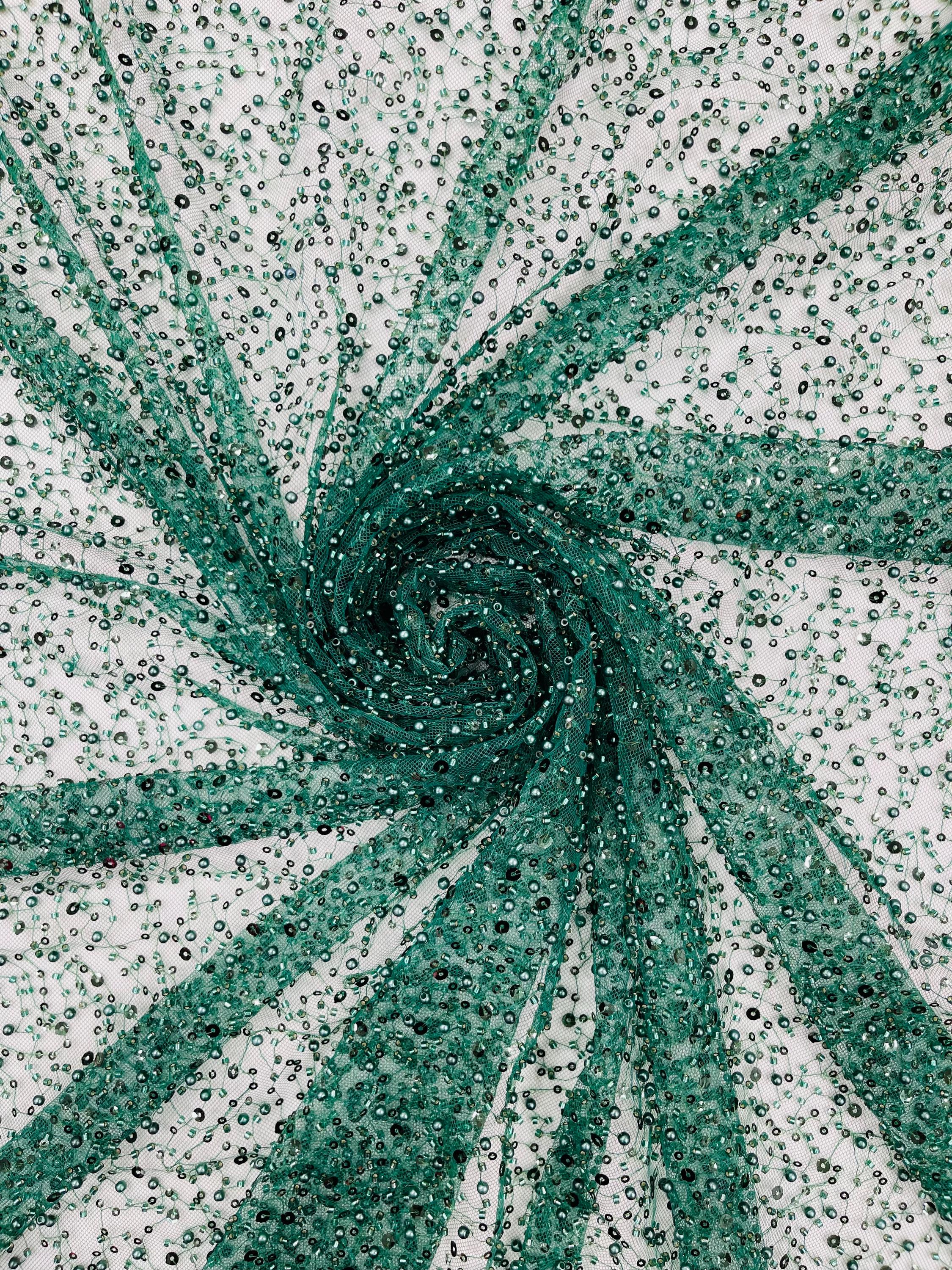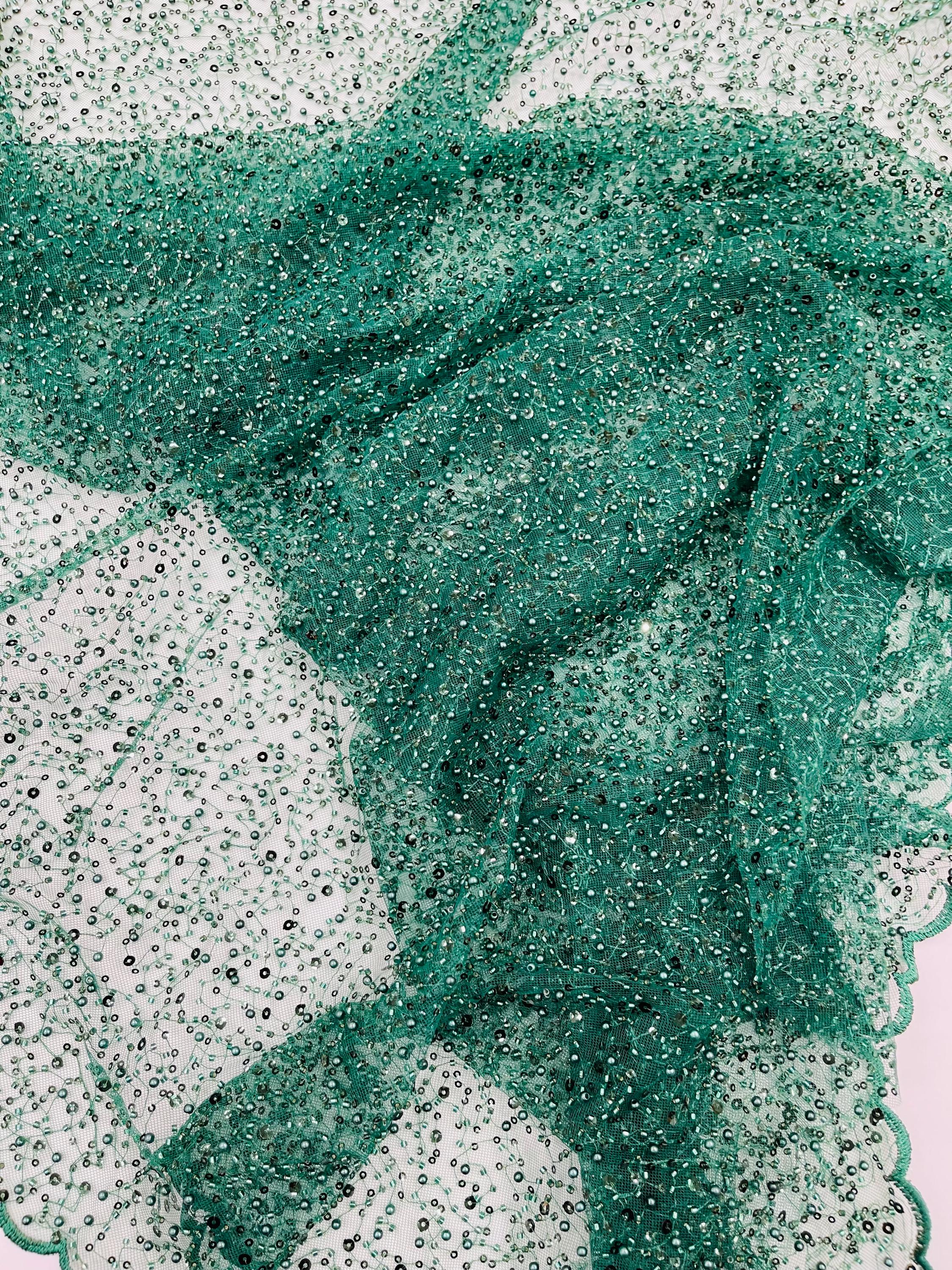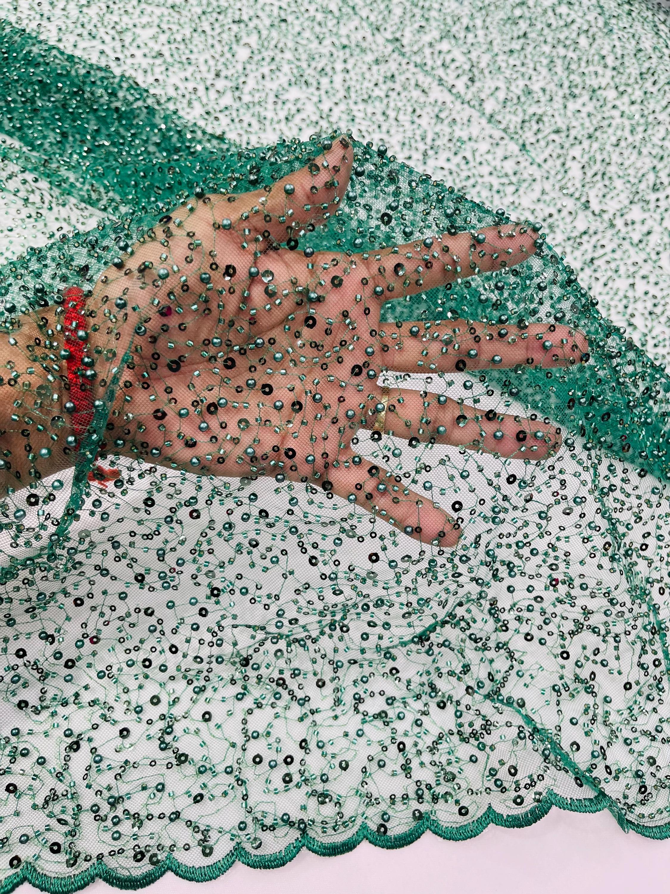 Hunter Green Beaded Sequin Mesh Lace Fabric, Rain Design Embroidery By The Yard