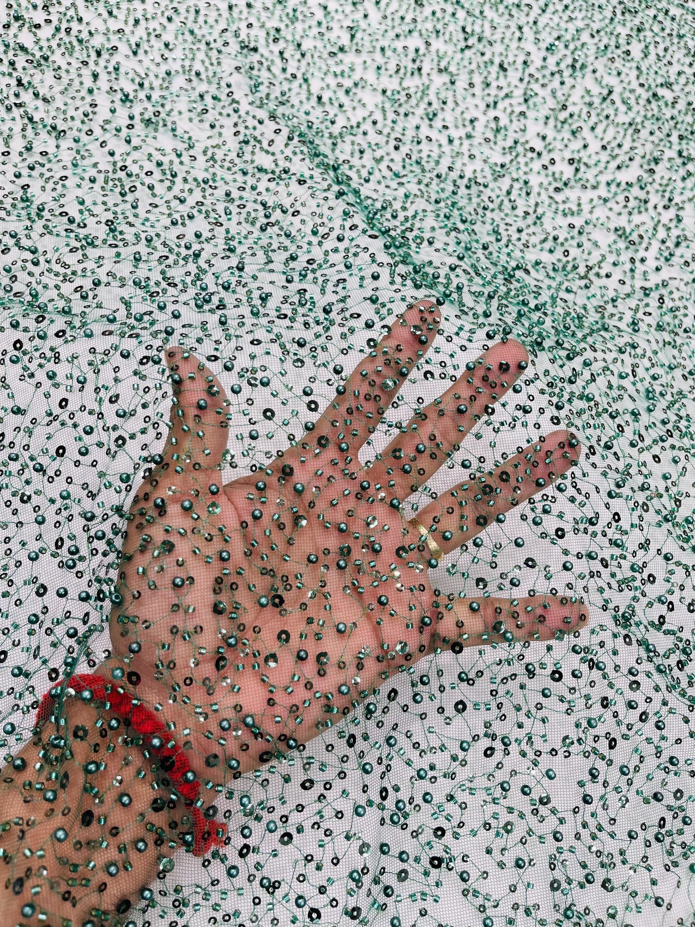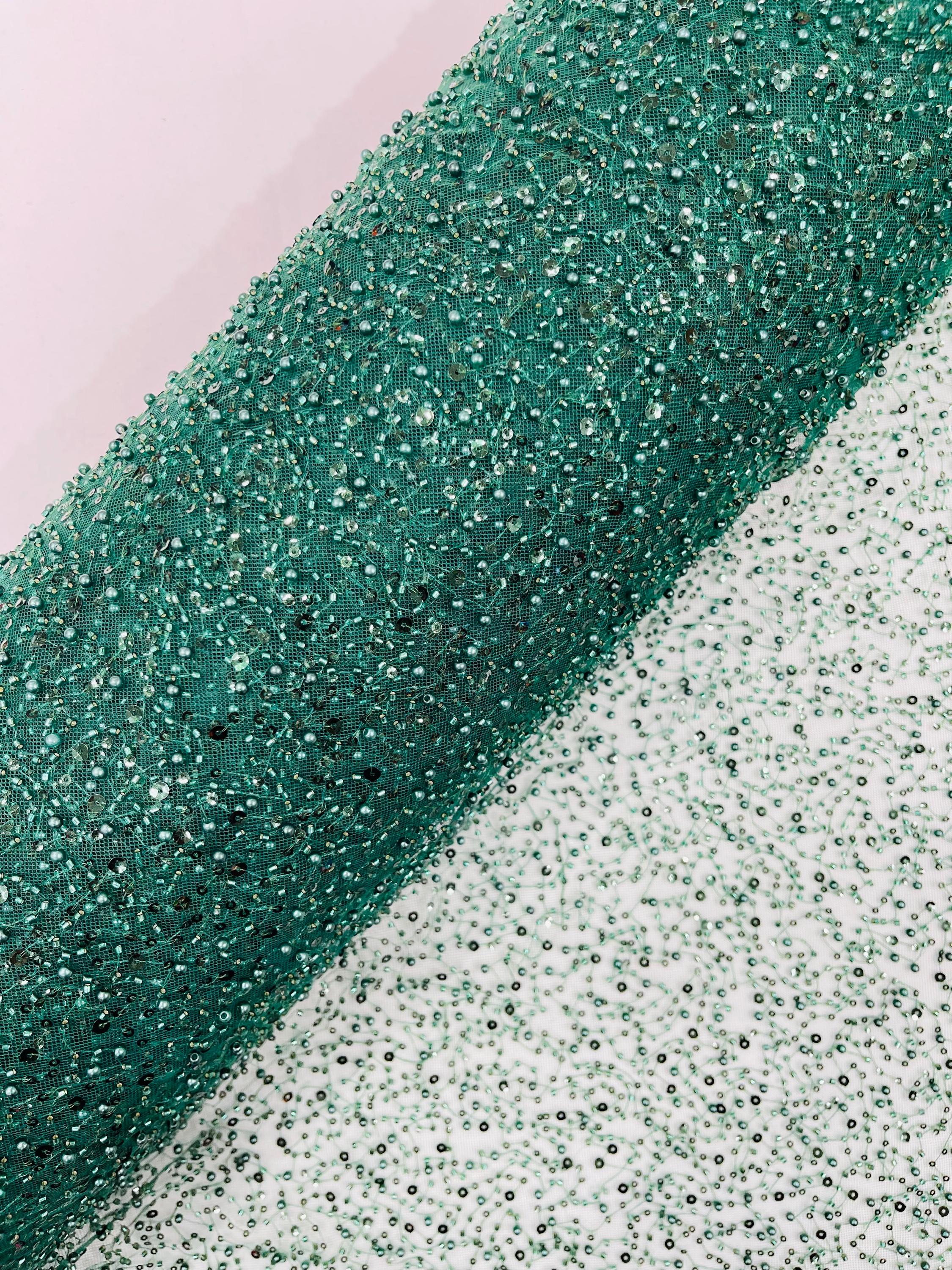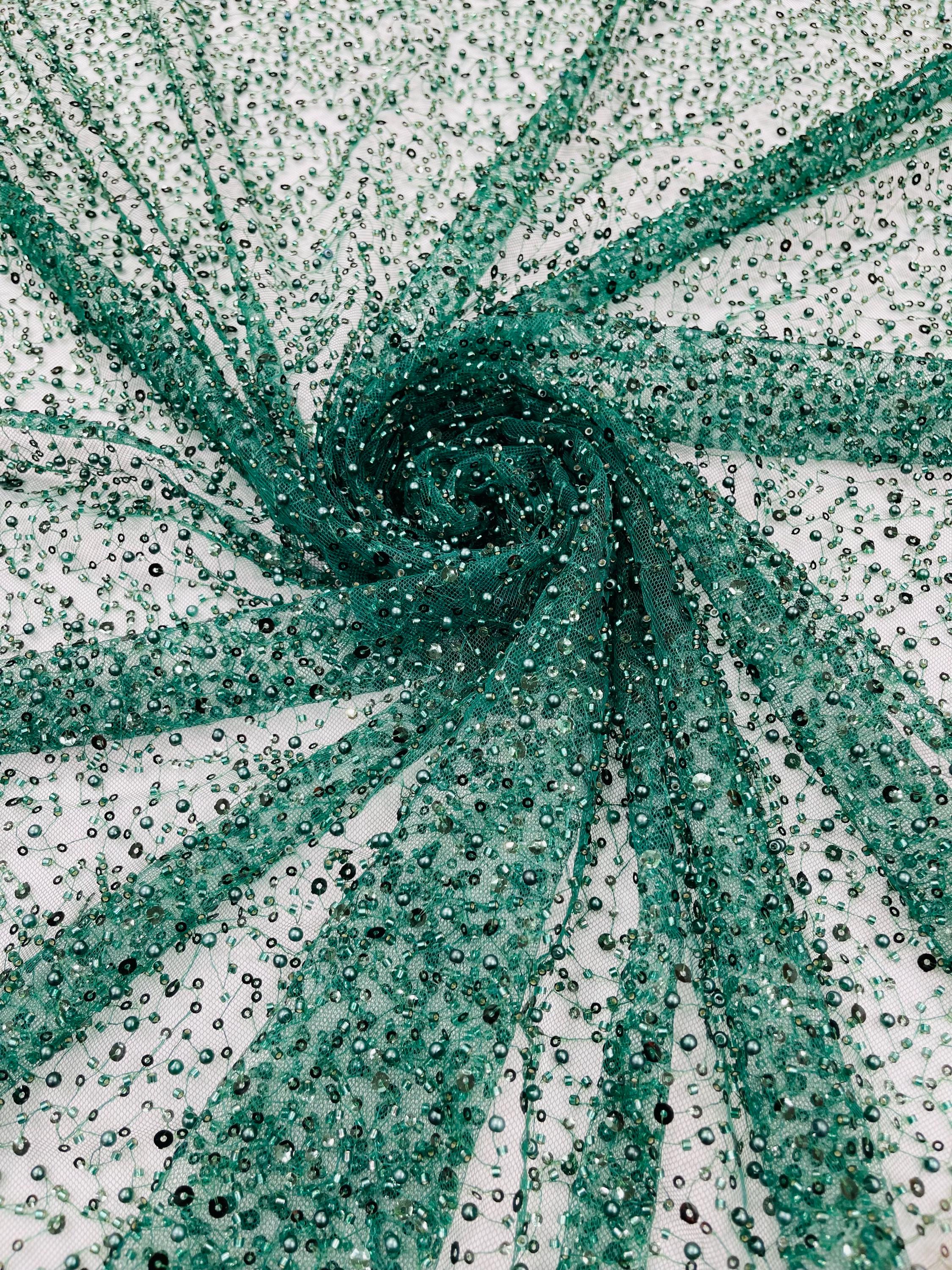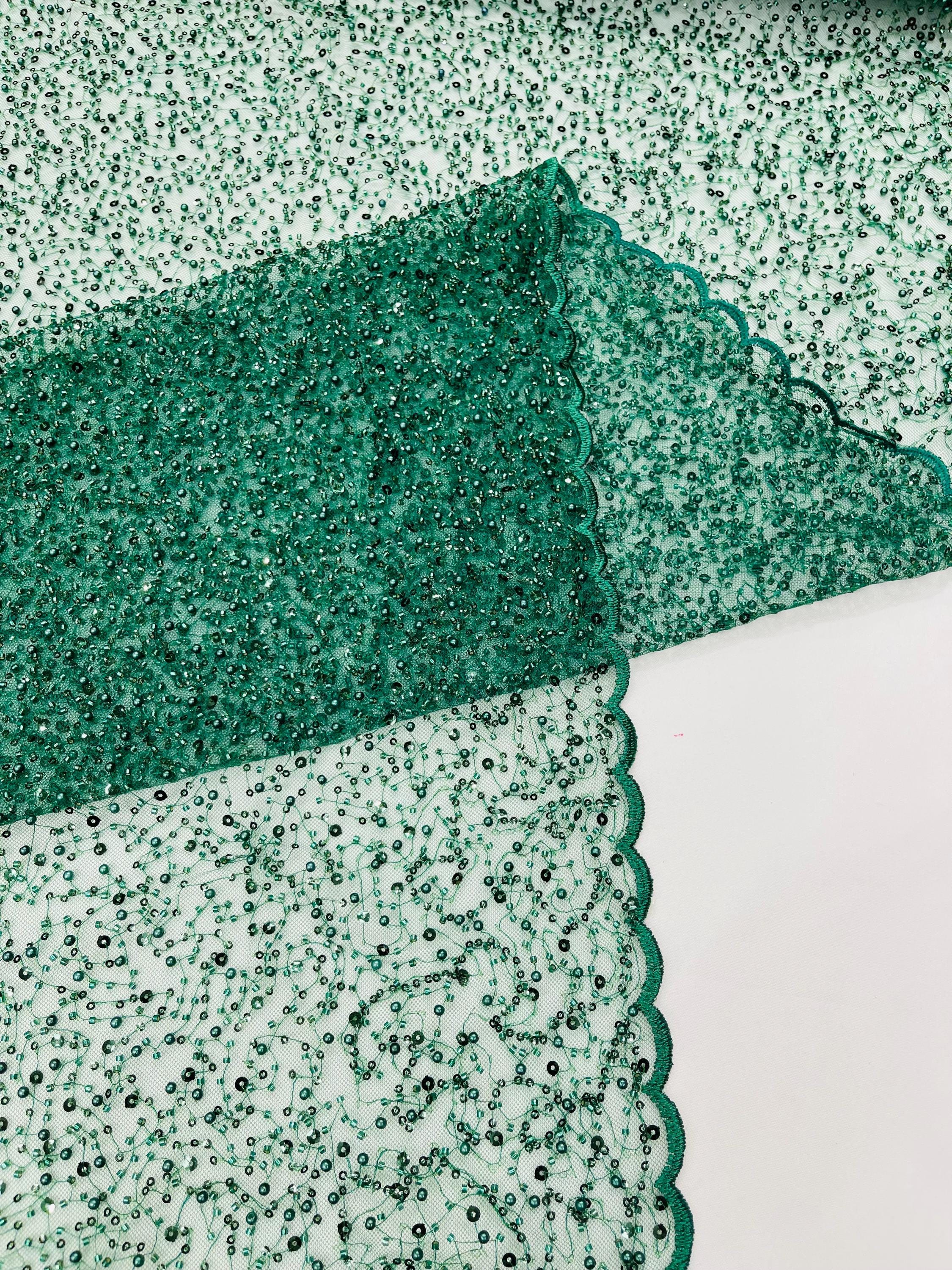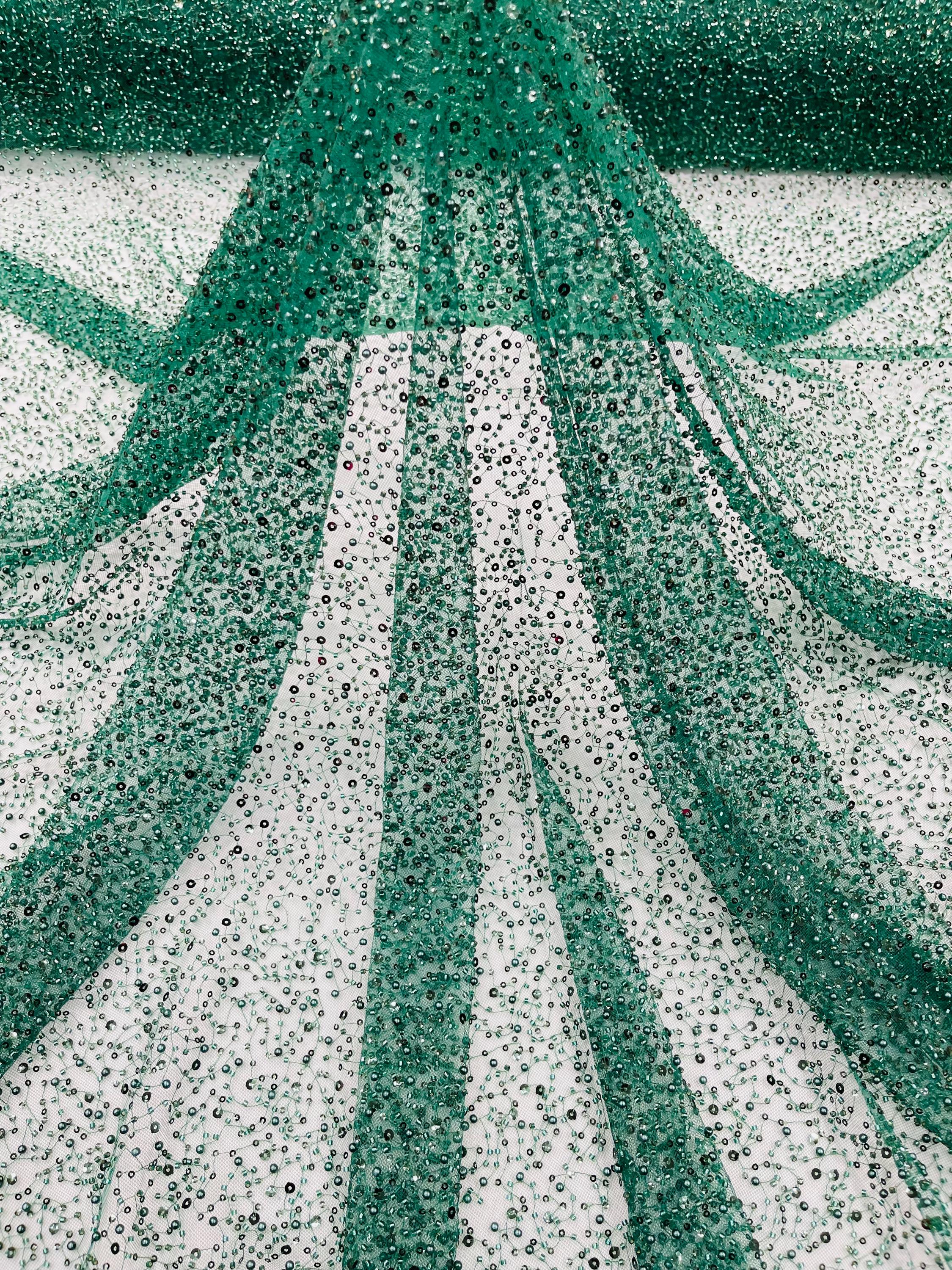 Hunter Green Beaded Sequin Mesh Lace Fabric, Rain Design Embroidery By The Yard