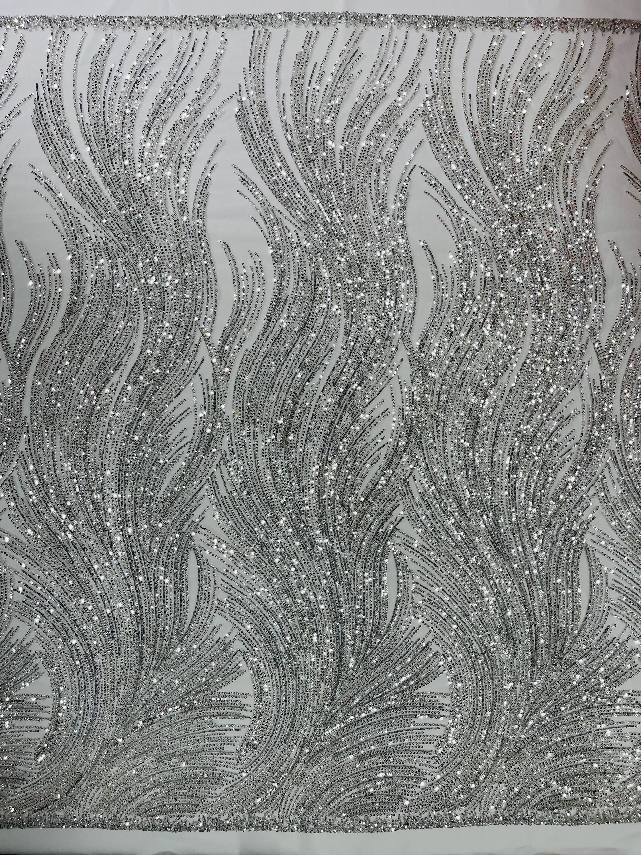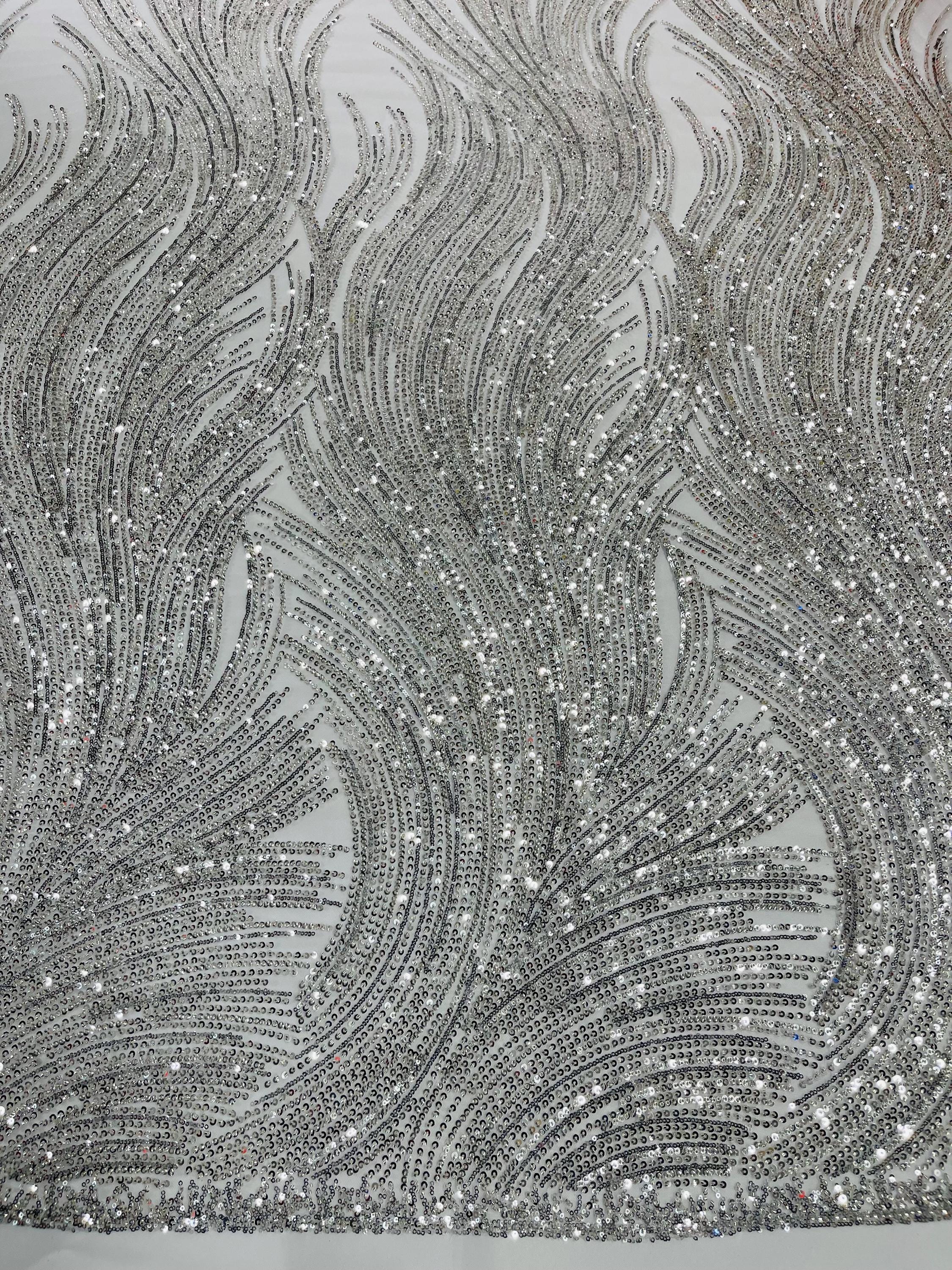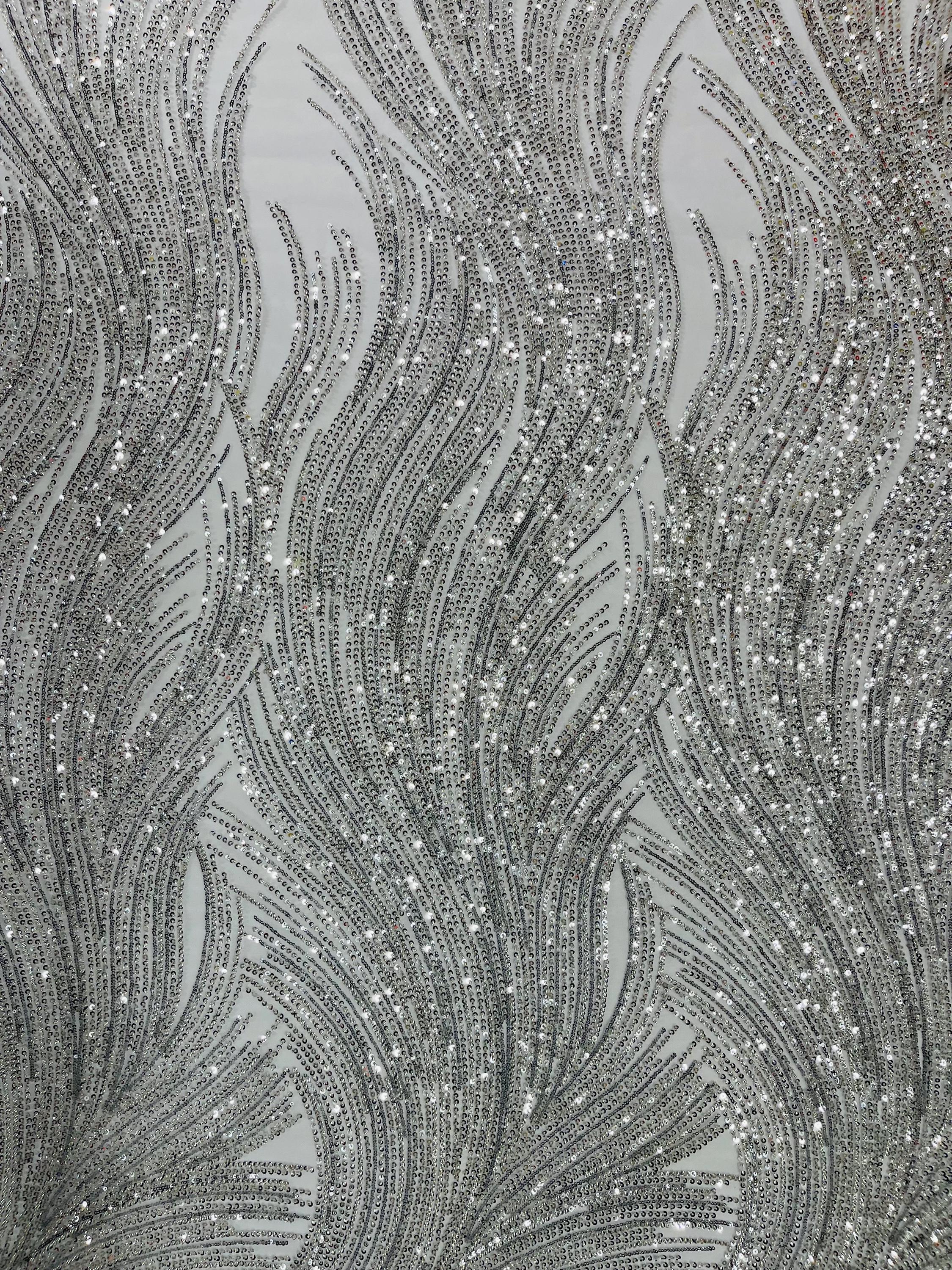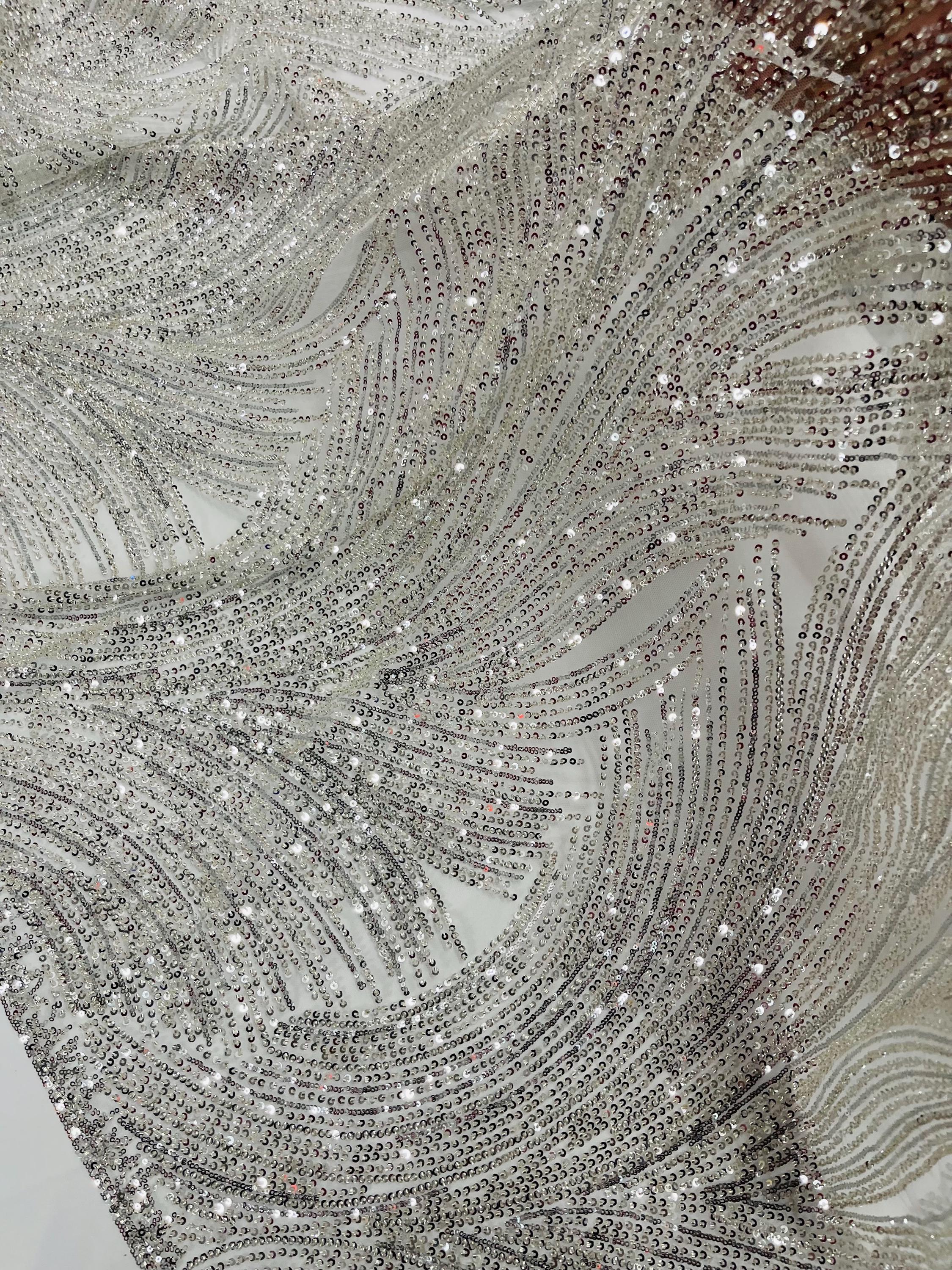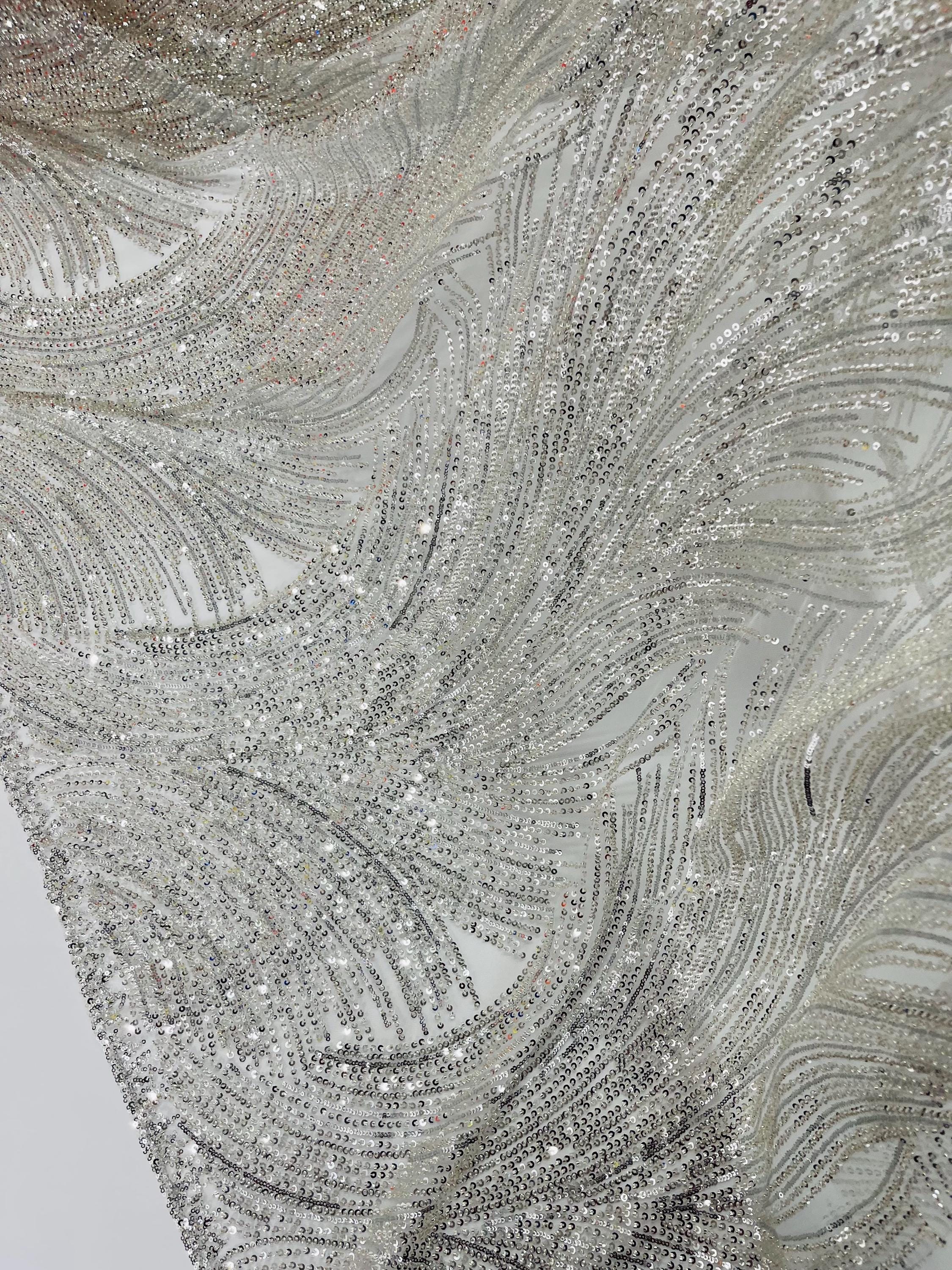 The beautiful design includes embroidered wavy plants patterns with beads across a mesh fabric of great quality. It has a beautiful border on both ends. This lace can be used for dresses, tablecloths, nightgowns, prom gowns, bridesmaid gowns, wedding gowns, table covers/runners, pillows, home /event decorations, and much more.