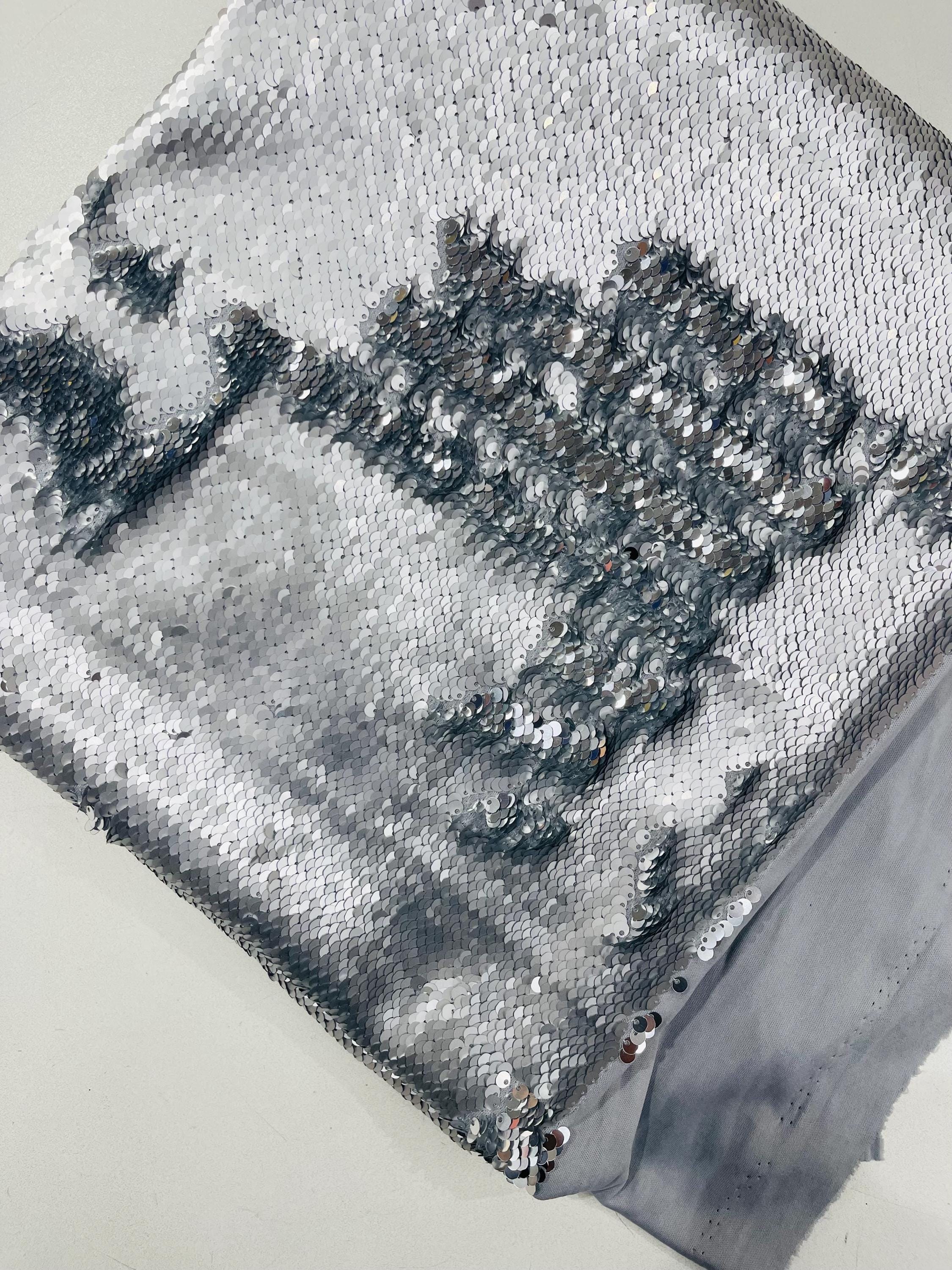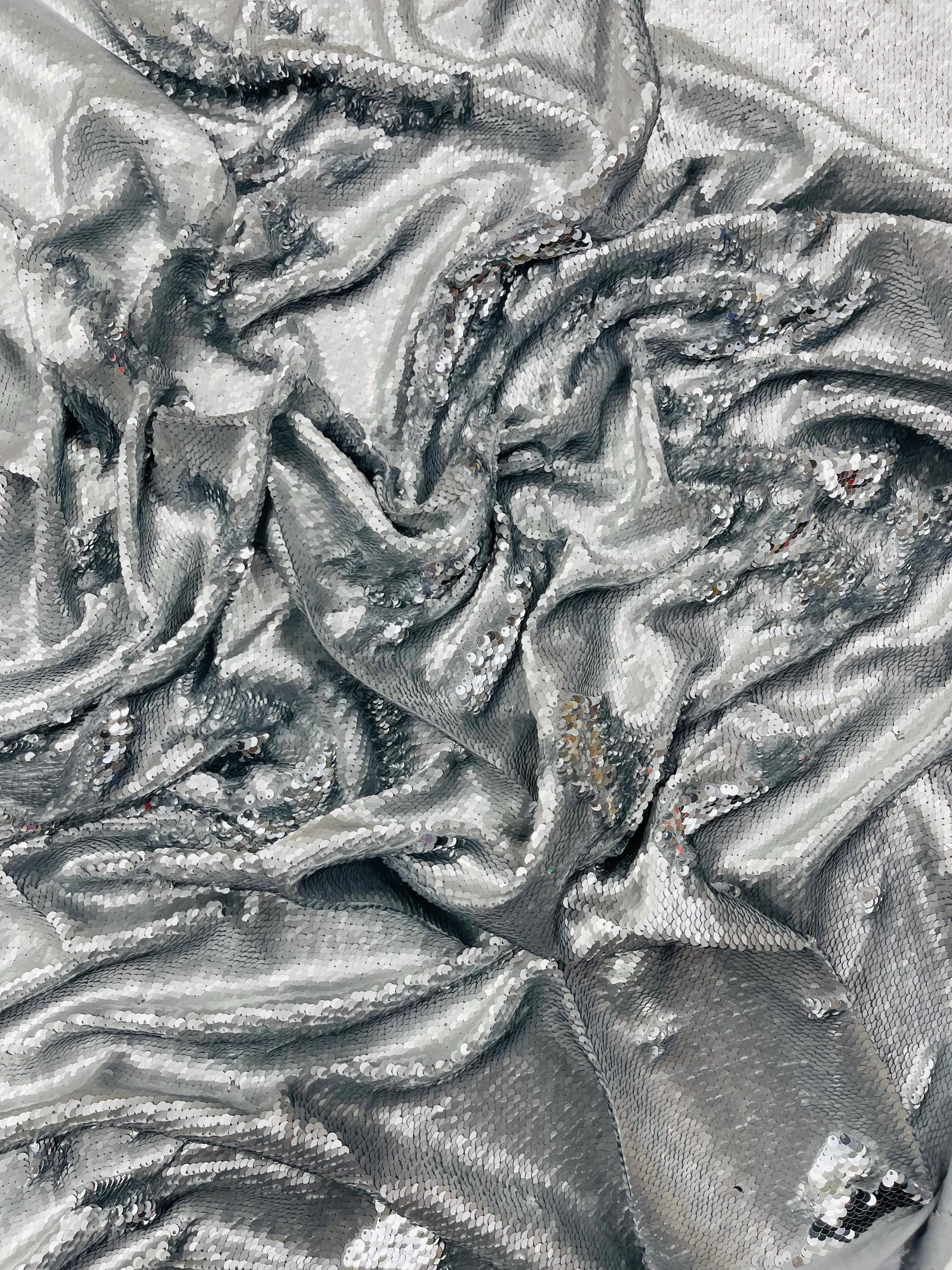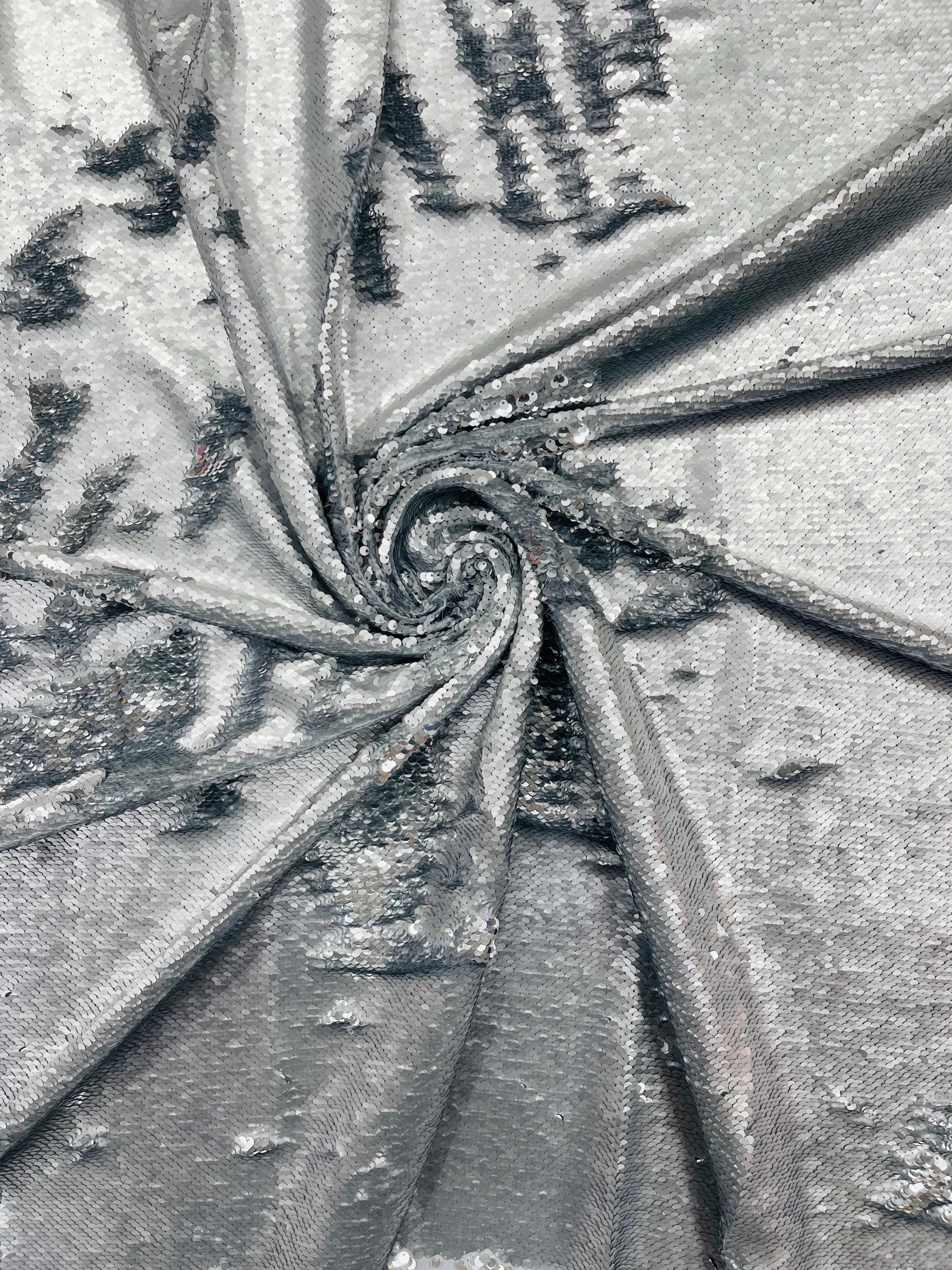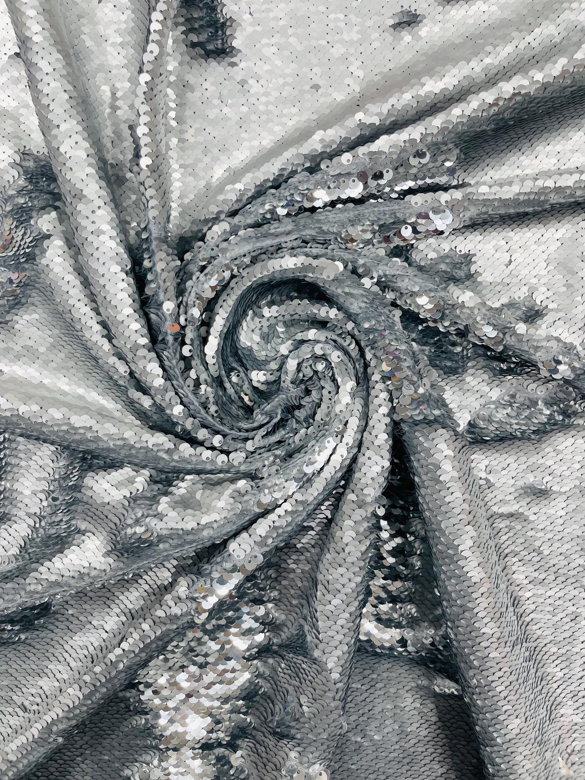 Matte Silver/Silver Flip Sequins Fabric: 2-Way Stretch Reversible Material