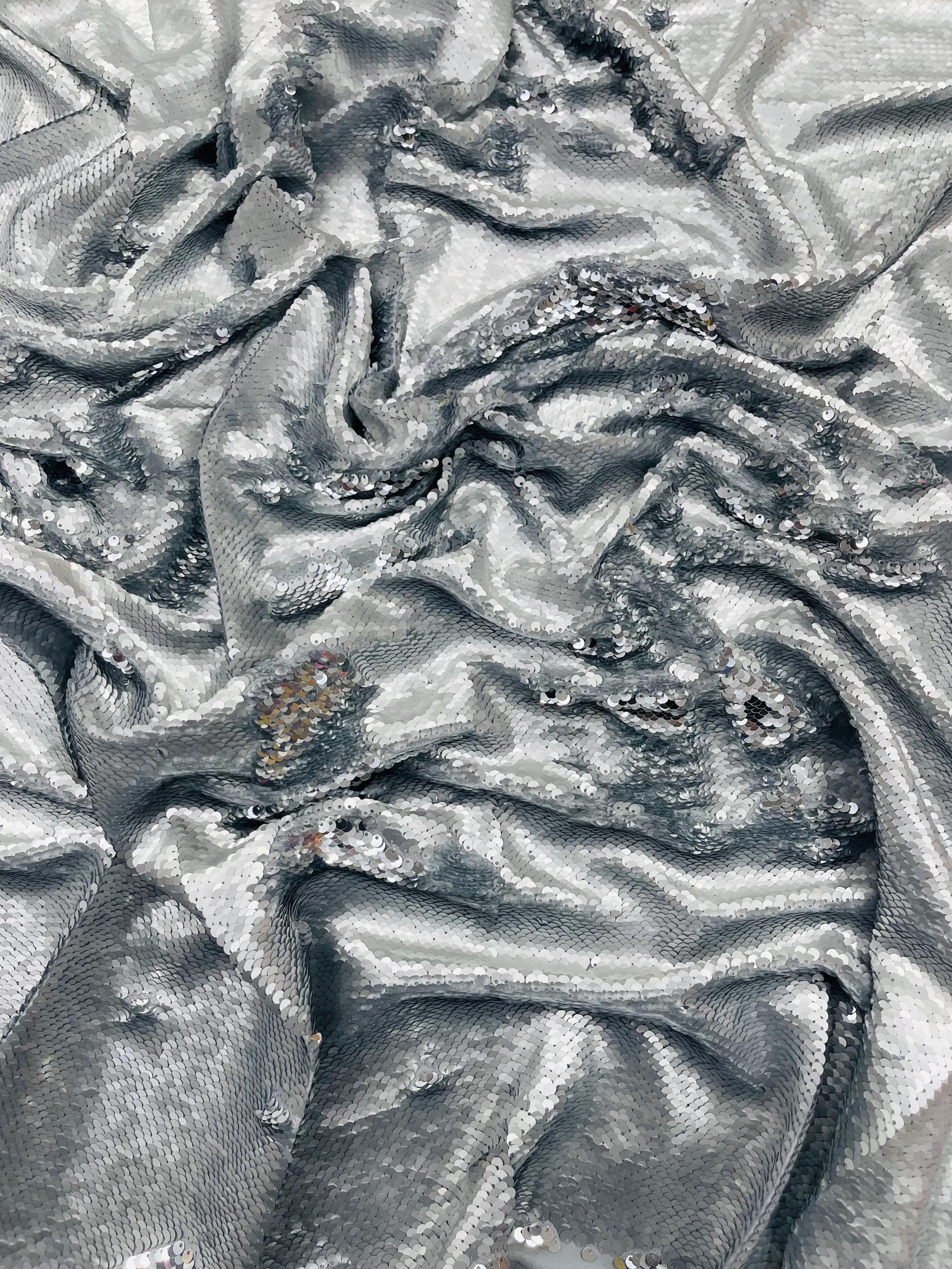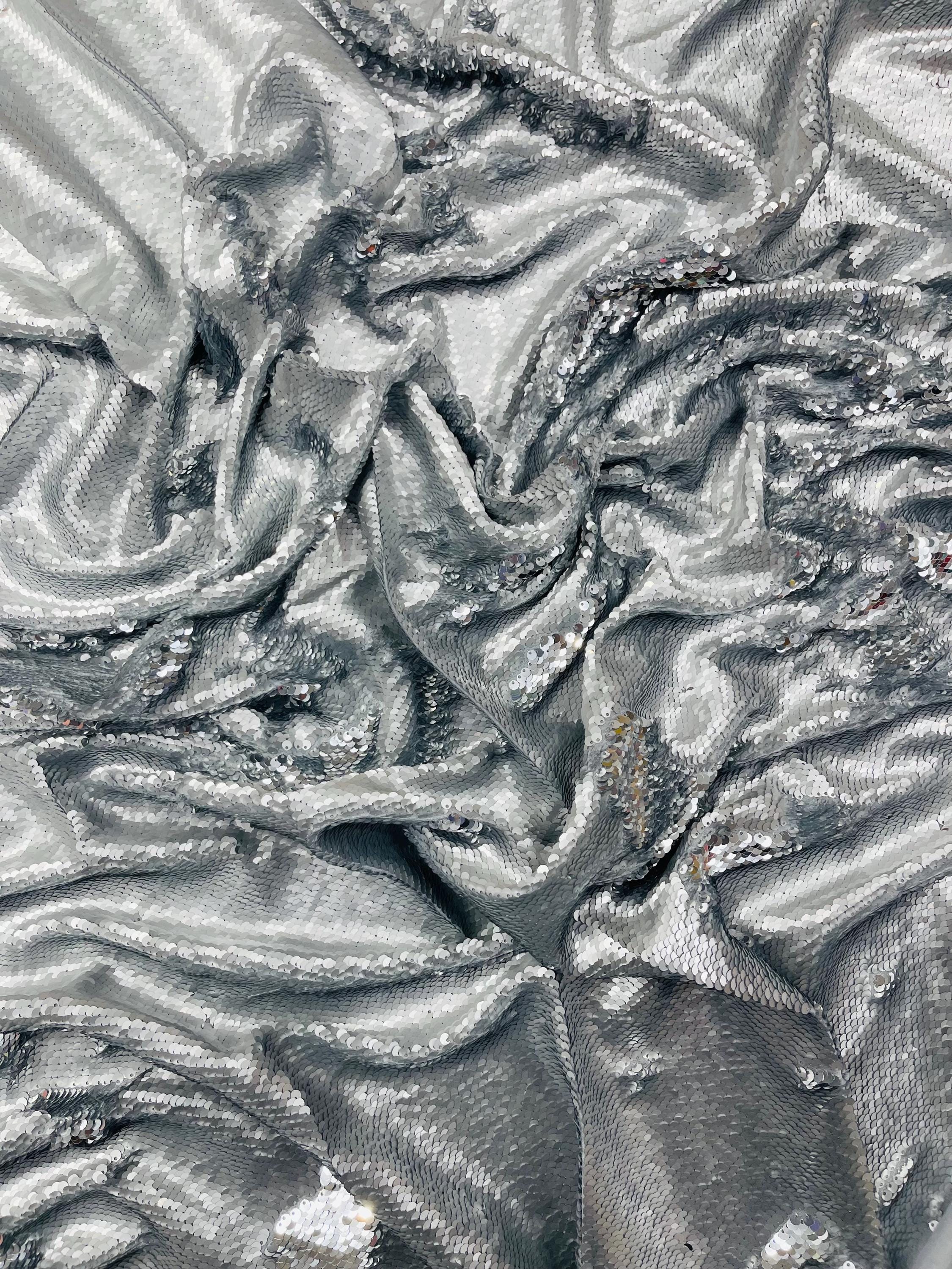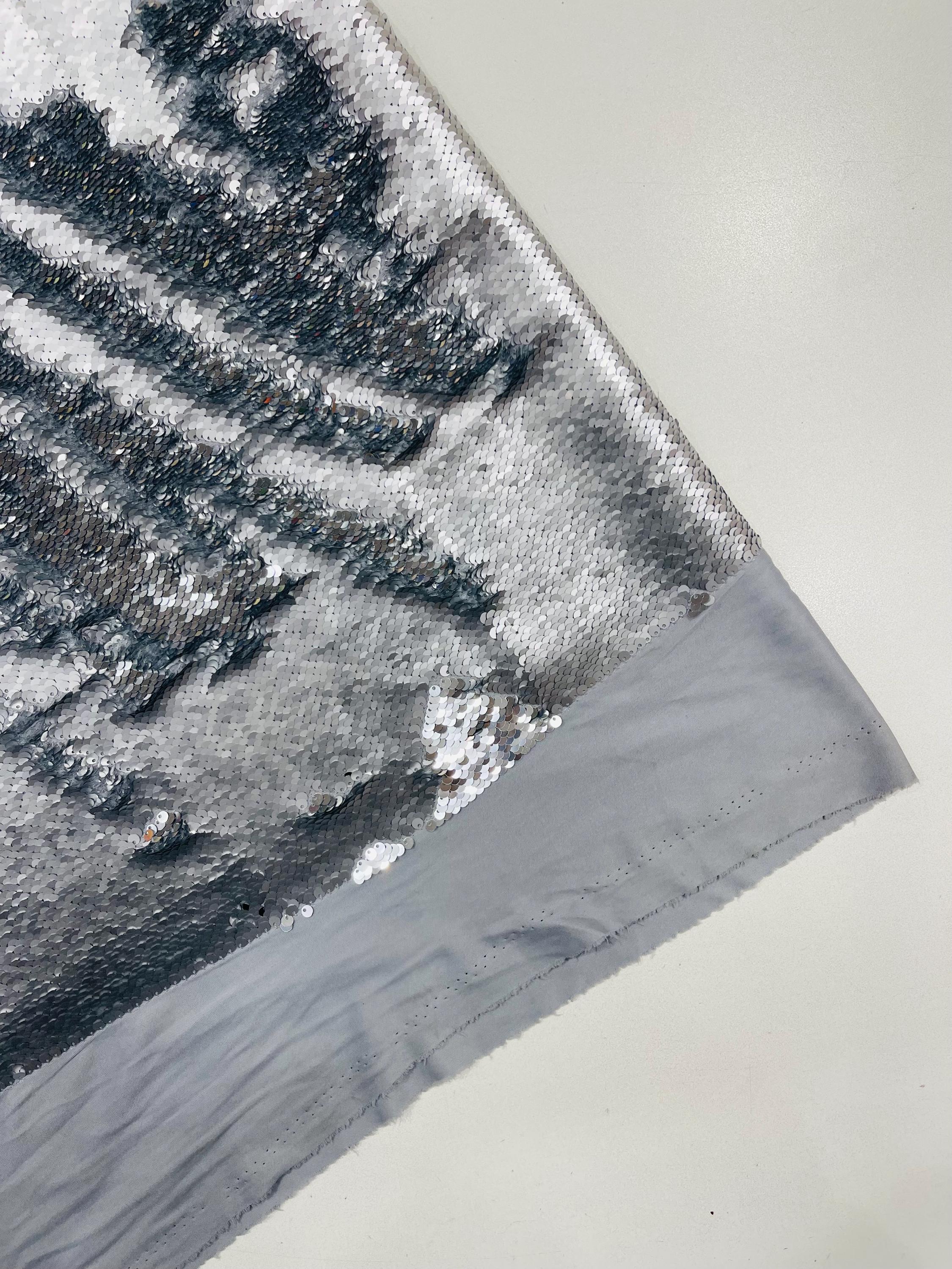 Matte Silver/Silver Flip Sequins Fabric: 2-Way Stretch Reversible Material