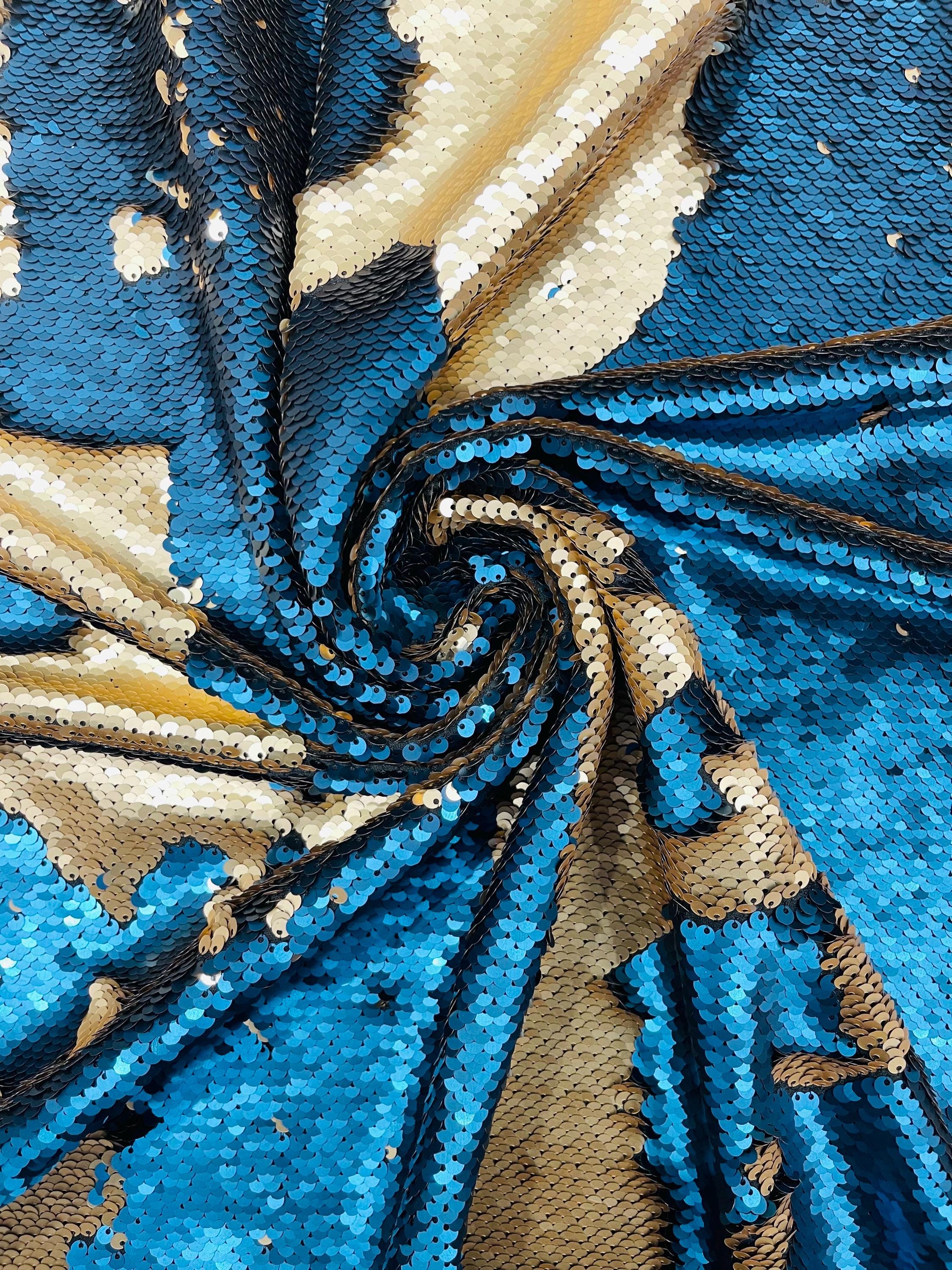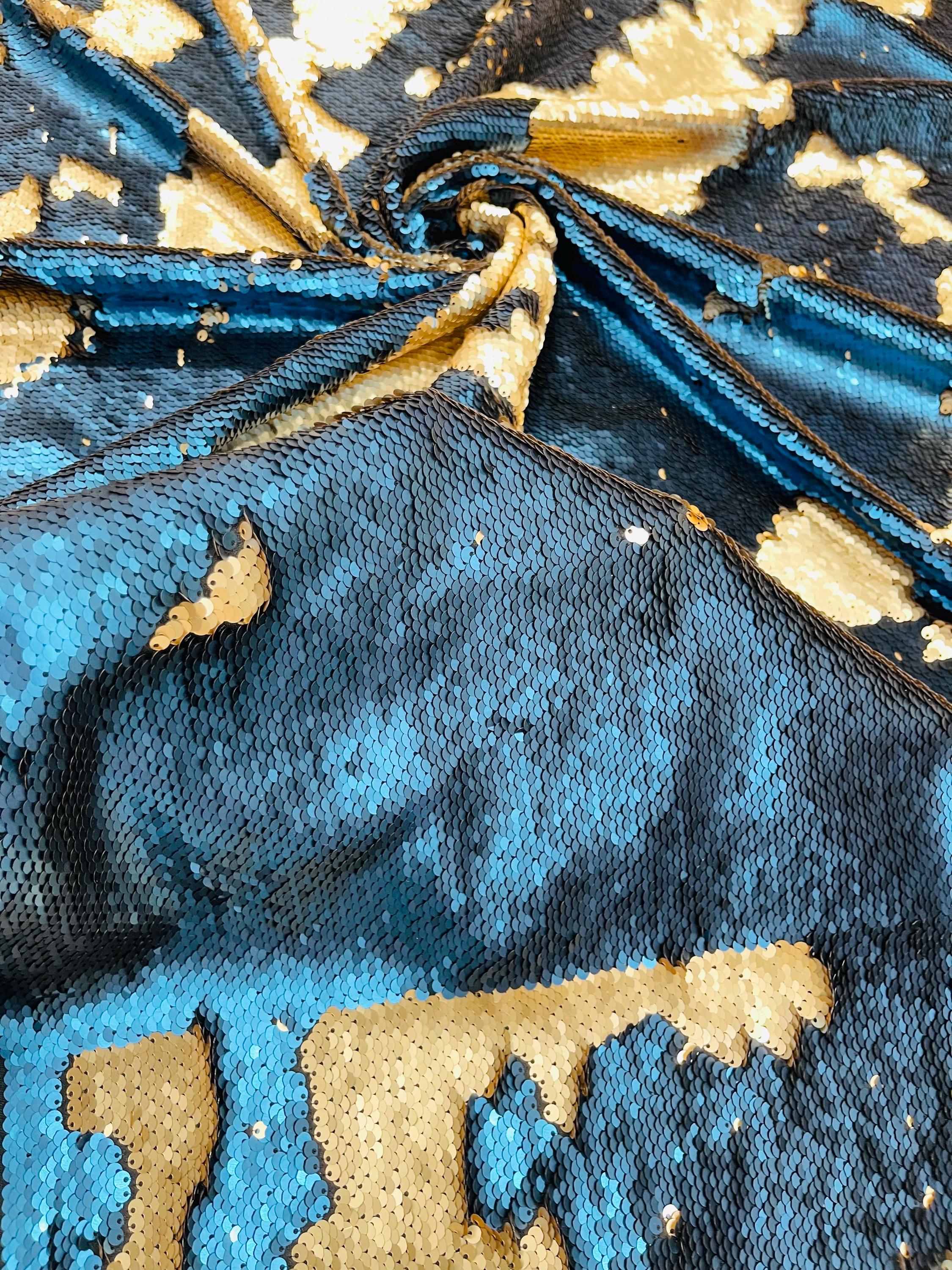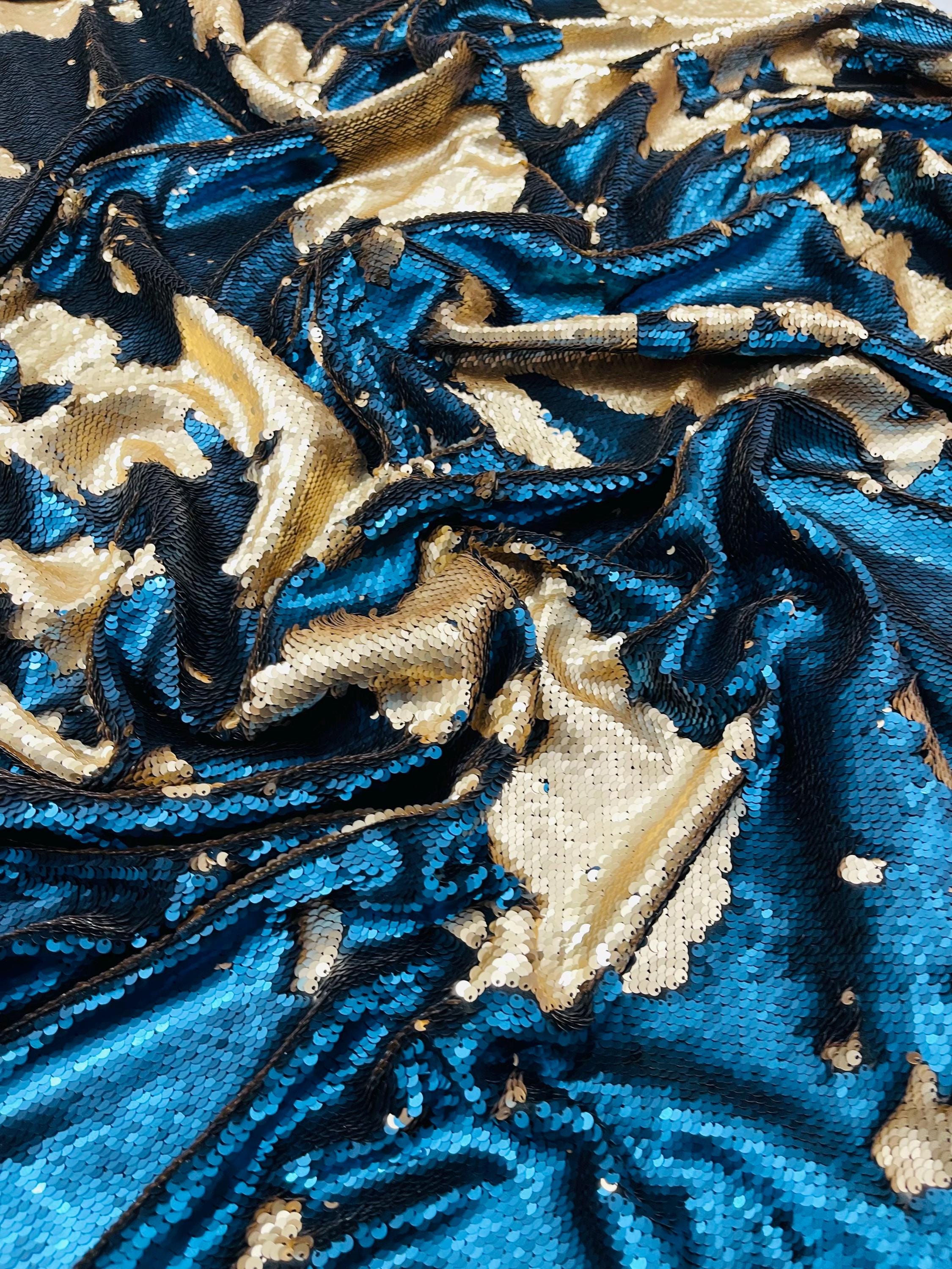 Matte Teal/Gold Flip Sequins Fabric: 2-Way Stretch Reversible Material