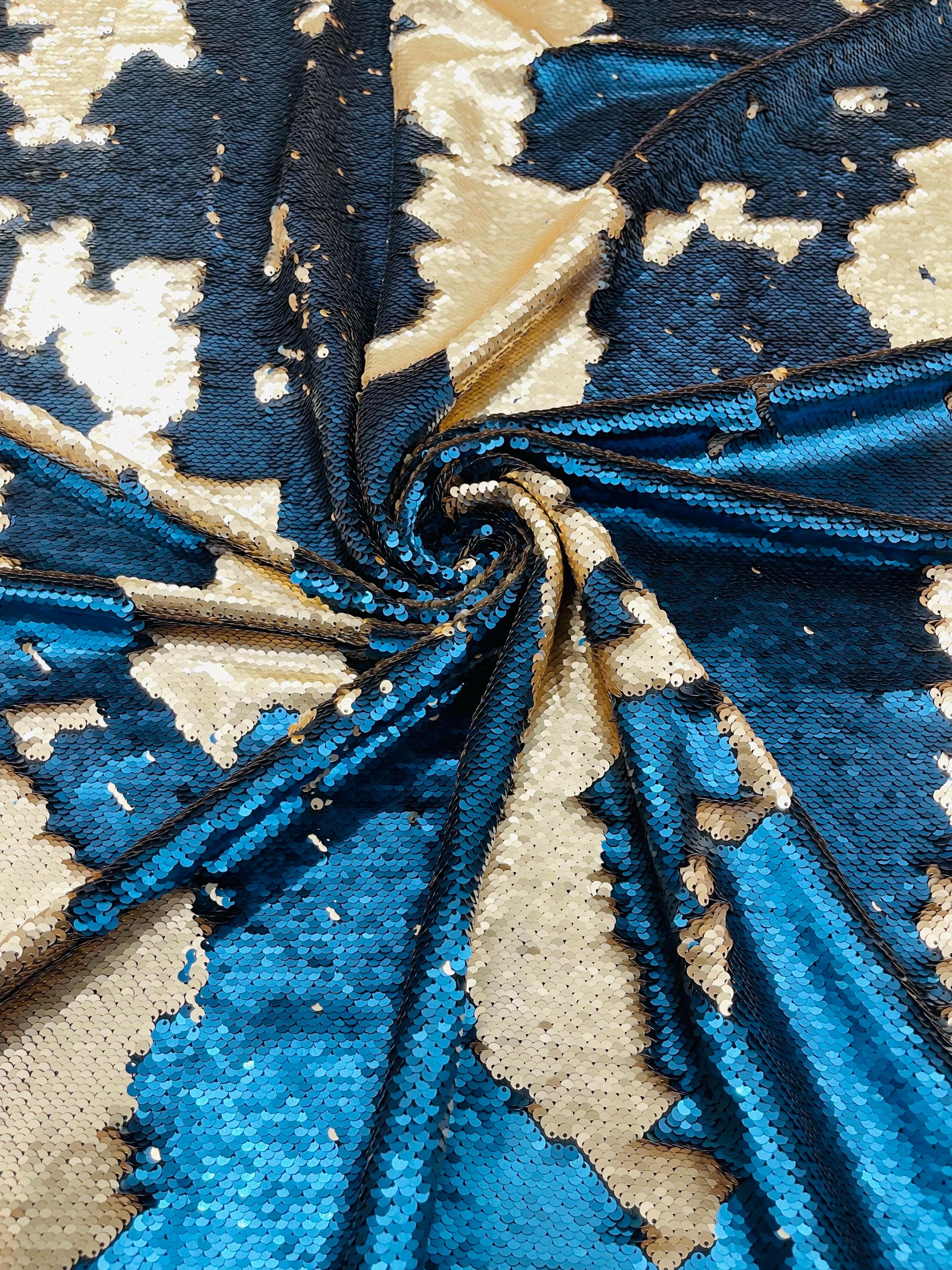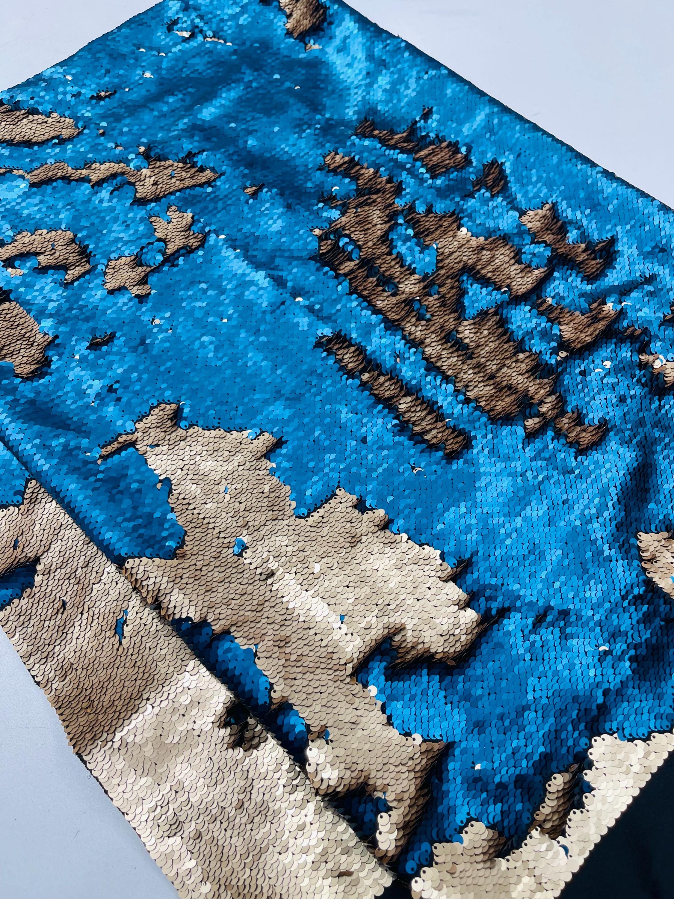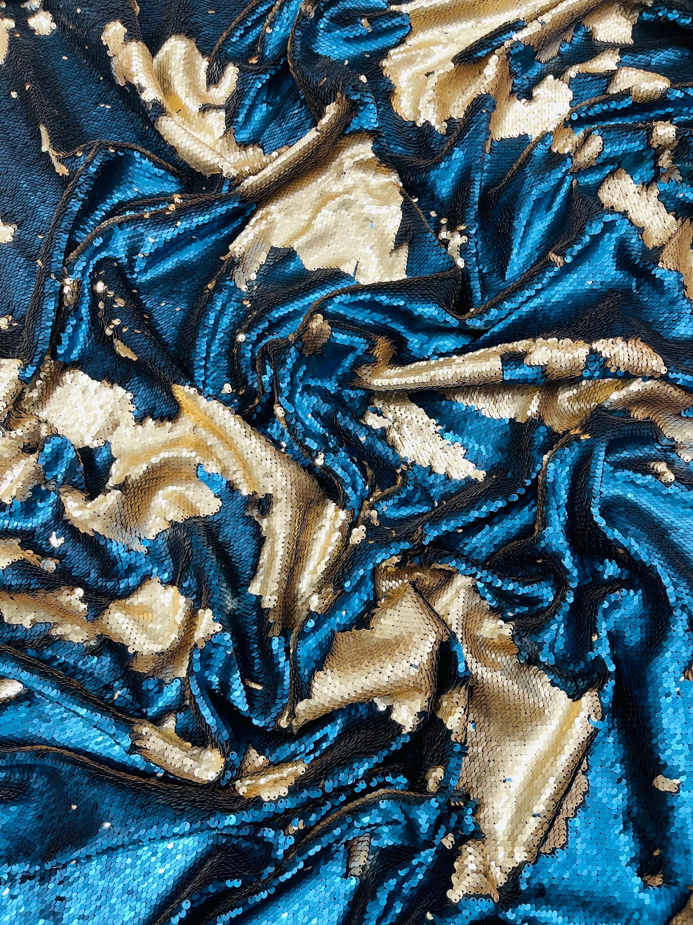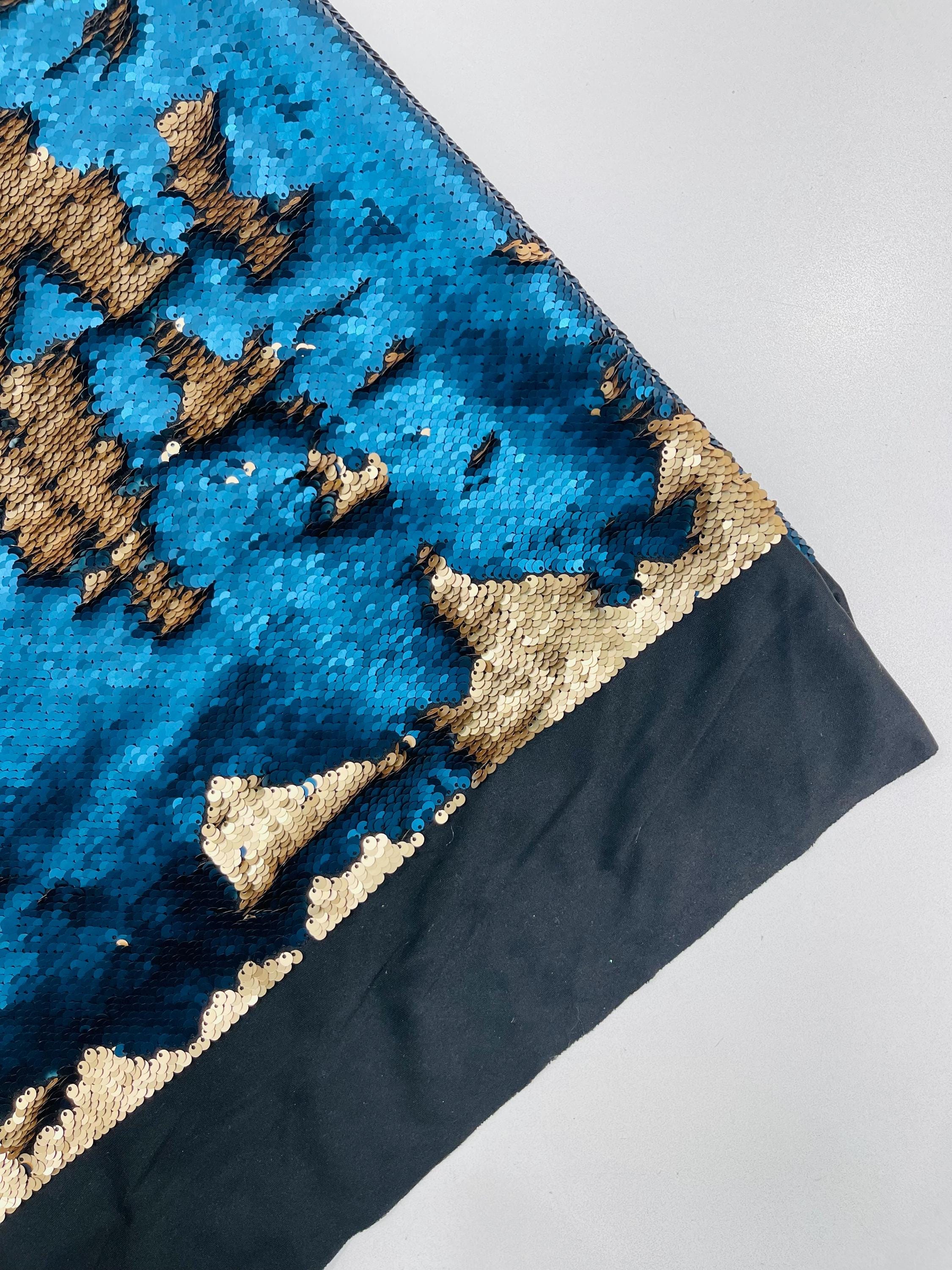 Matte Teal/Gold Flip Sequins Fabric: 2-Way Stretch Reversible Material