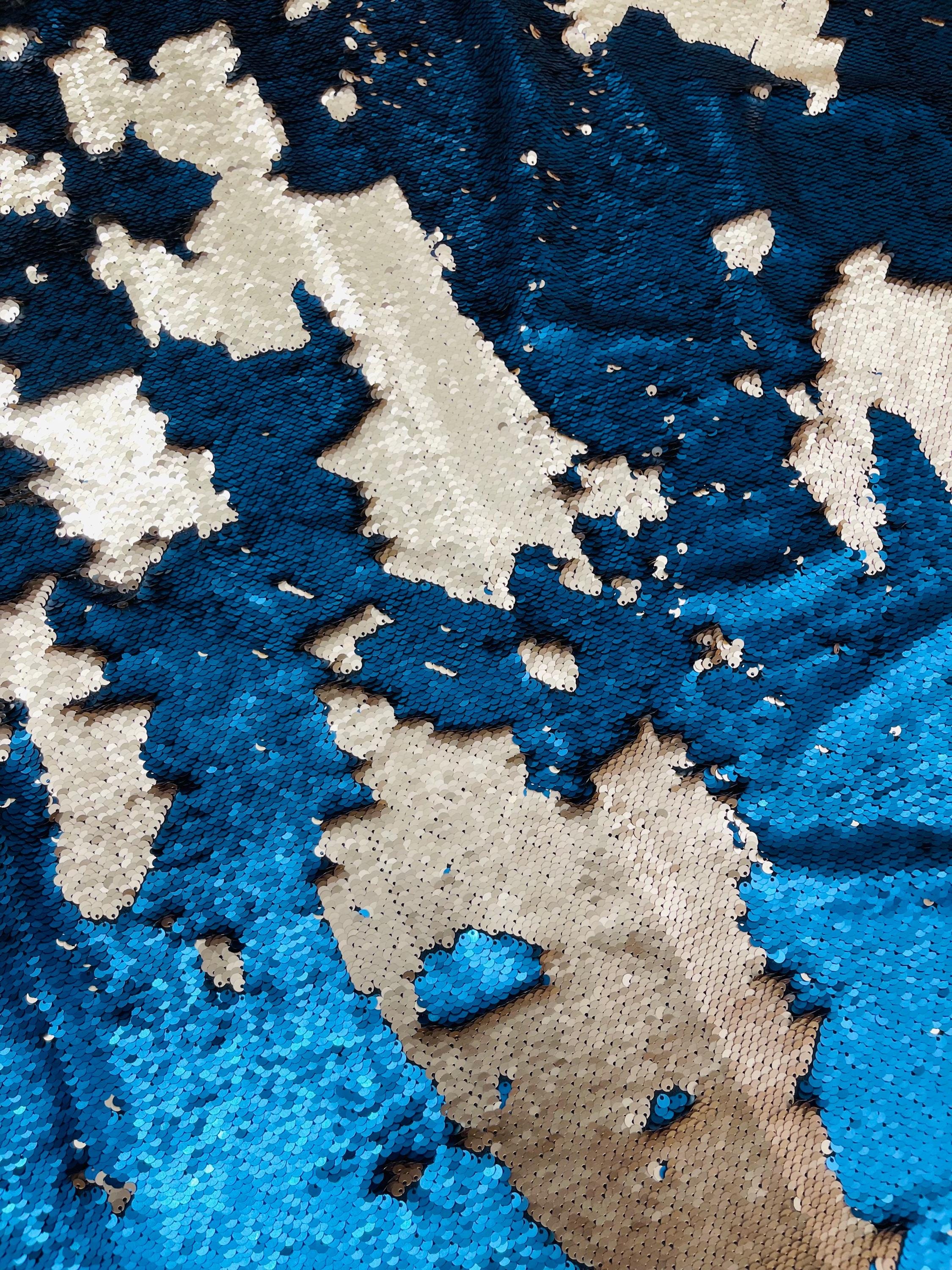 This mermaid fish scales has a 2 way stretch to it .this design has two color tones on the design. When you brush it with your fingers it changes colors. All the sequins are stitched and they over lap each other to give it the full look. This sequins can be use for dresses, tablecloths, nightgowns, prom gowns, bridal gowns, wedding gowns.runners, Vegas shows,pillows, decoration and much more.