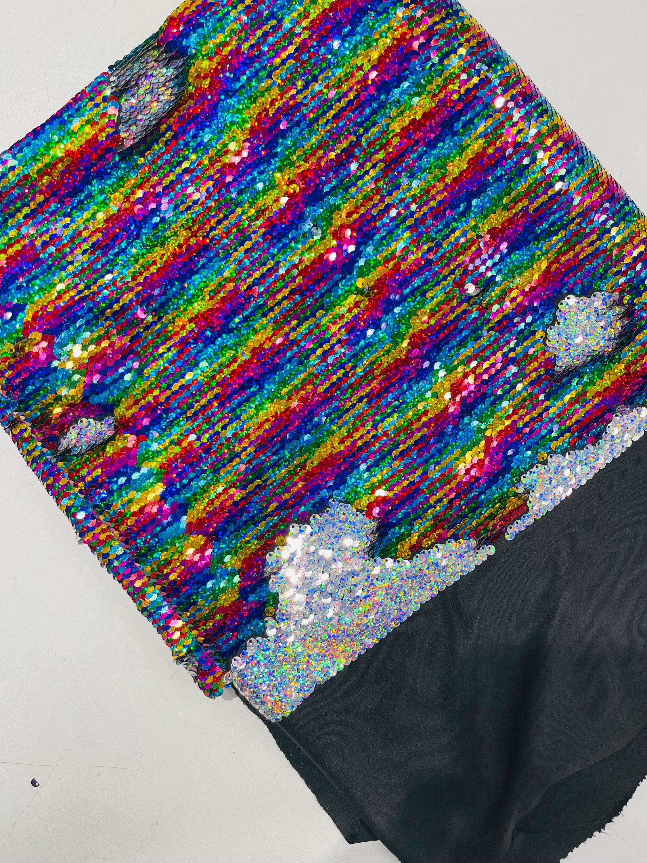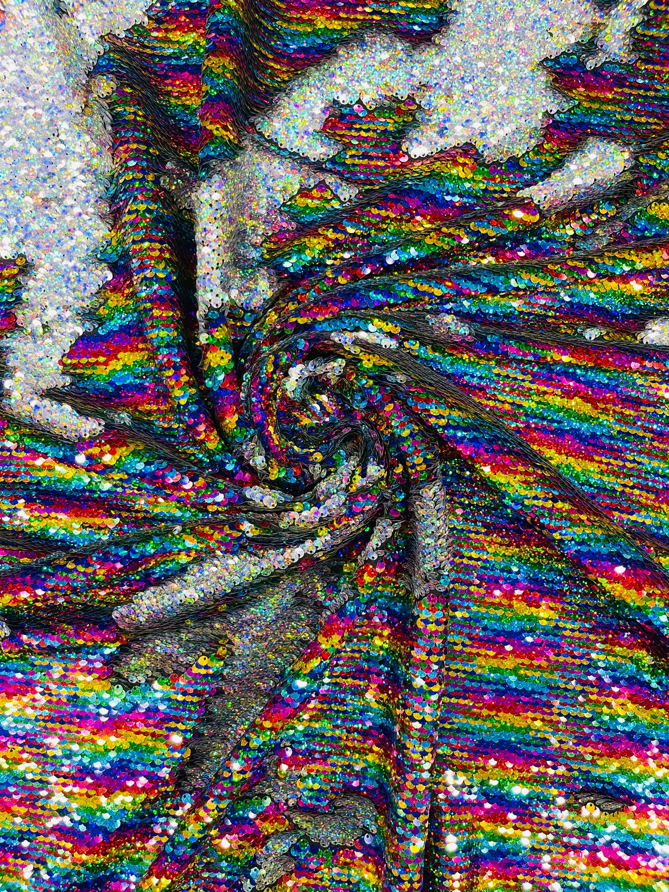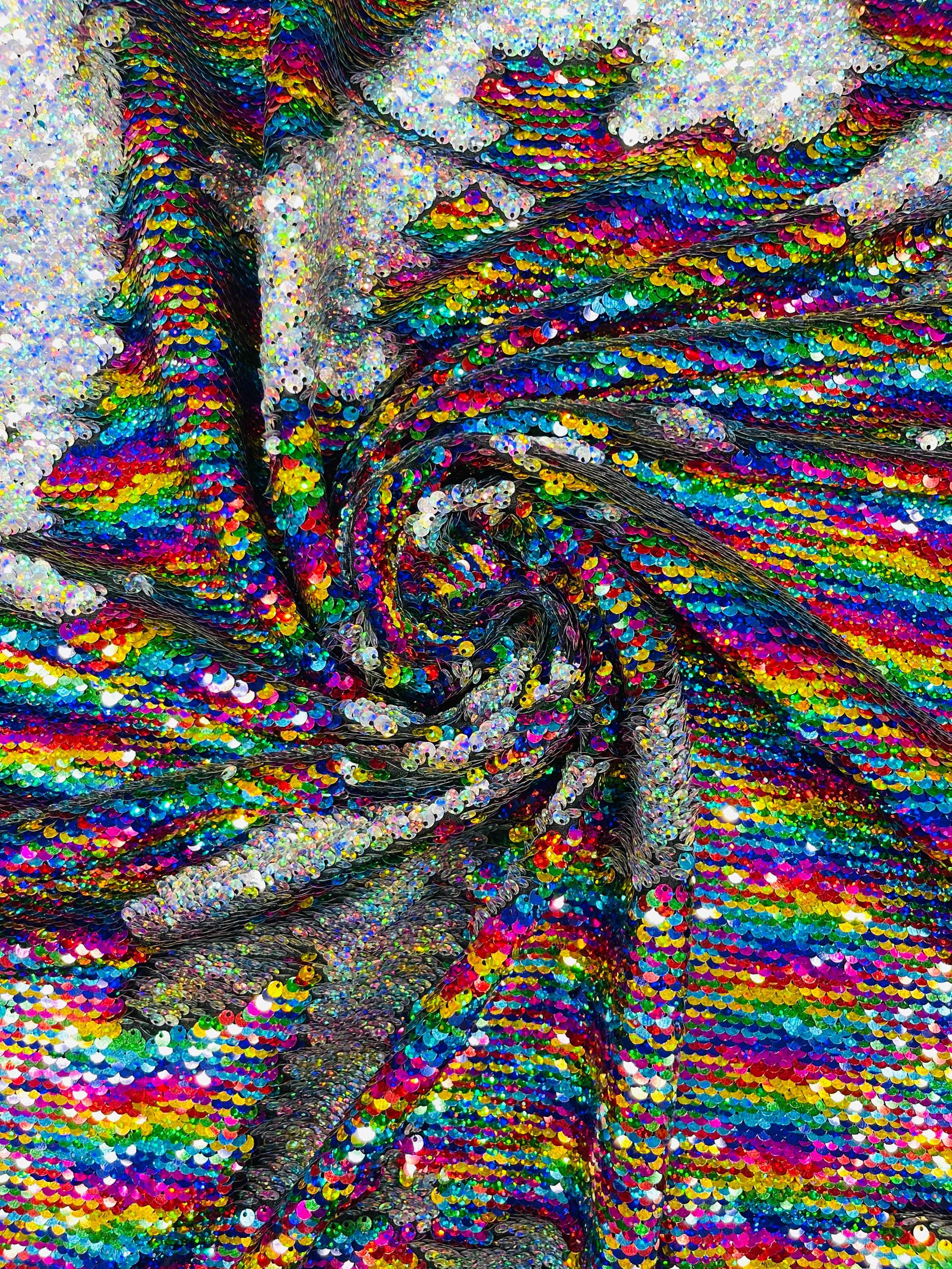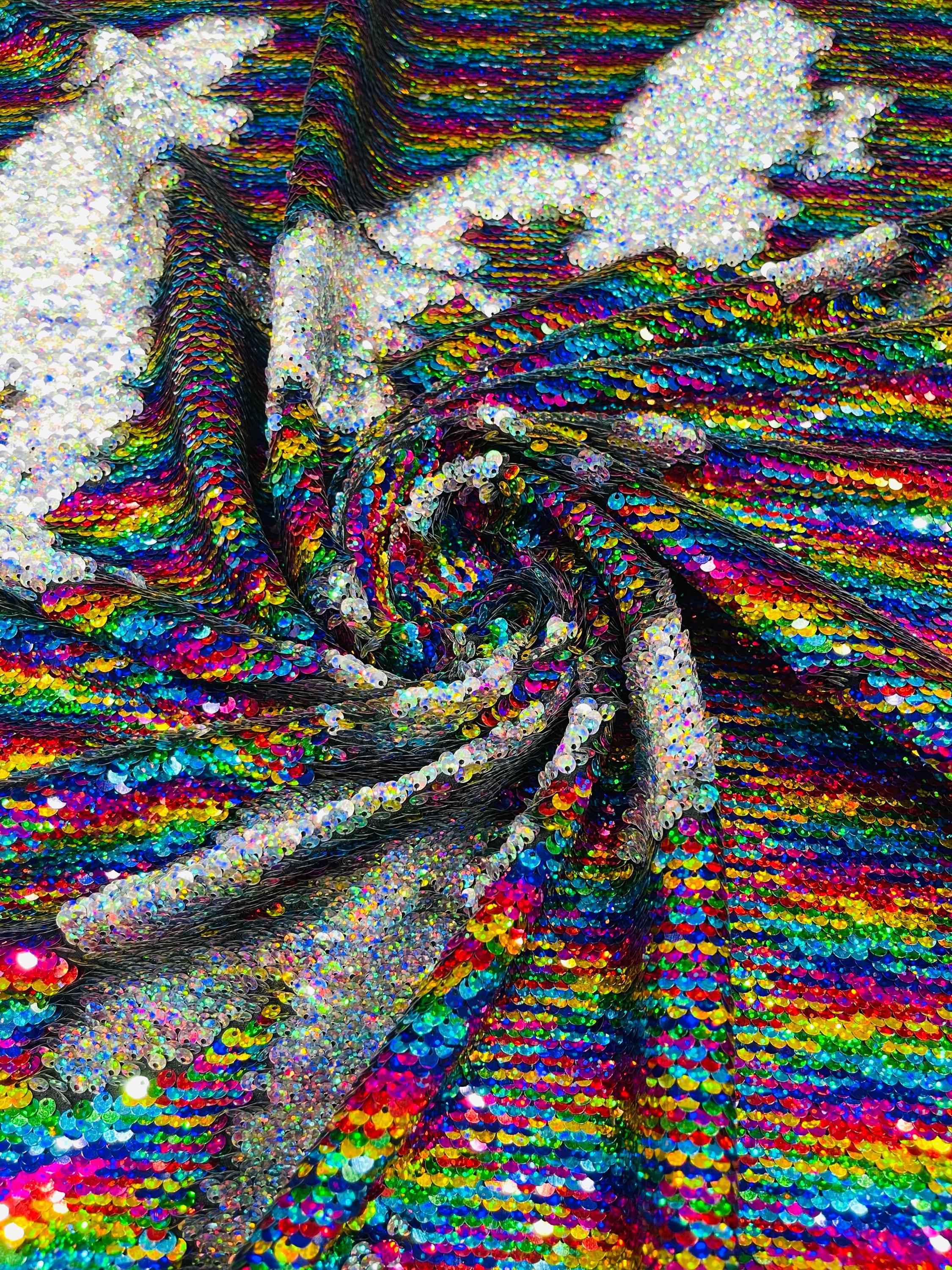 Hologram Silver/Rainbow Flip Sequins Fabric: 2-Way Stretch Reversible Material