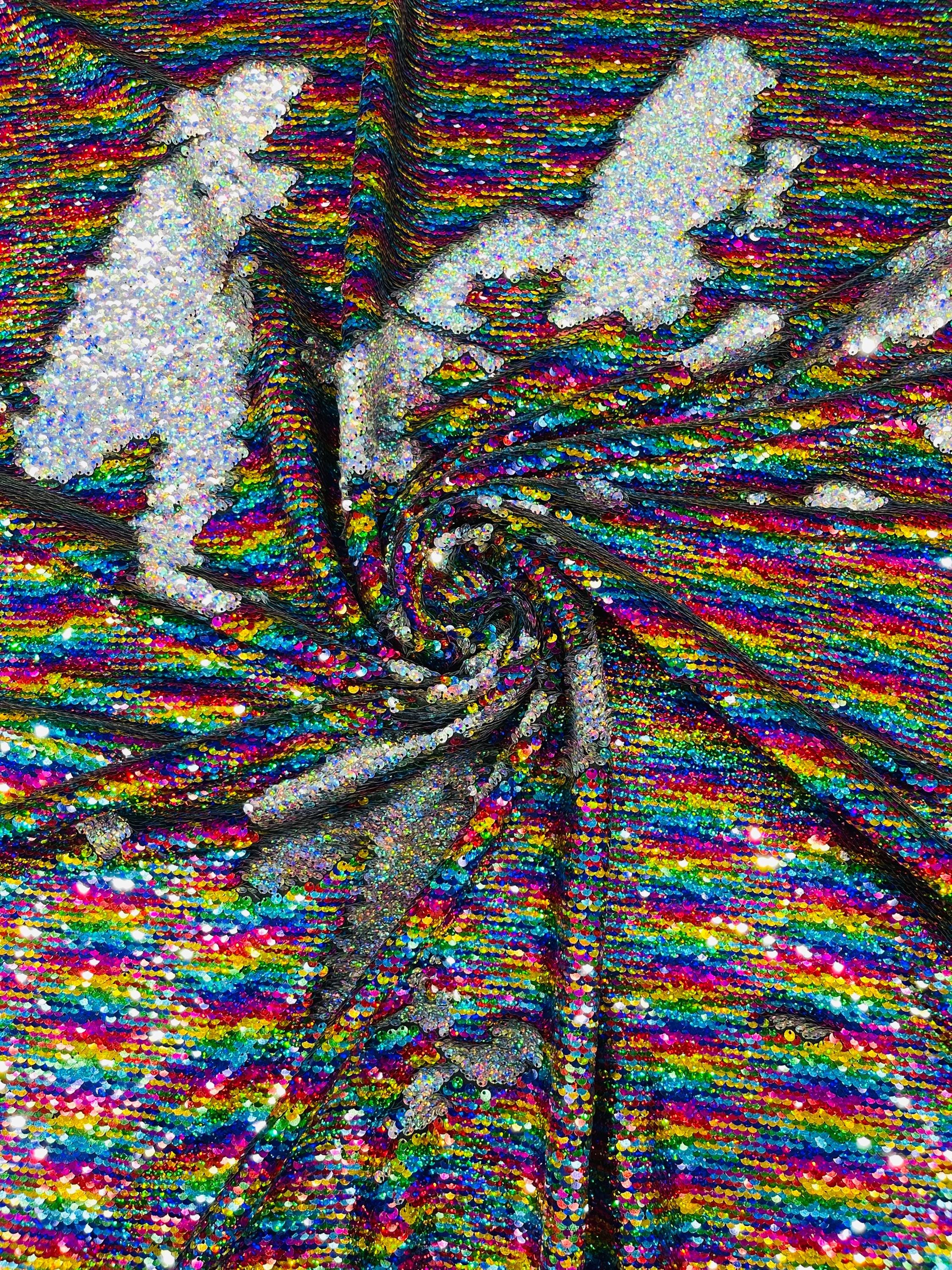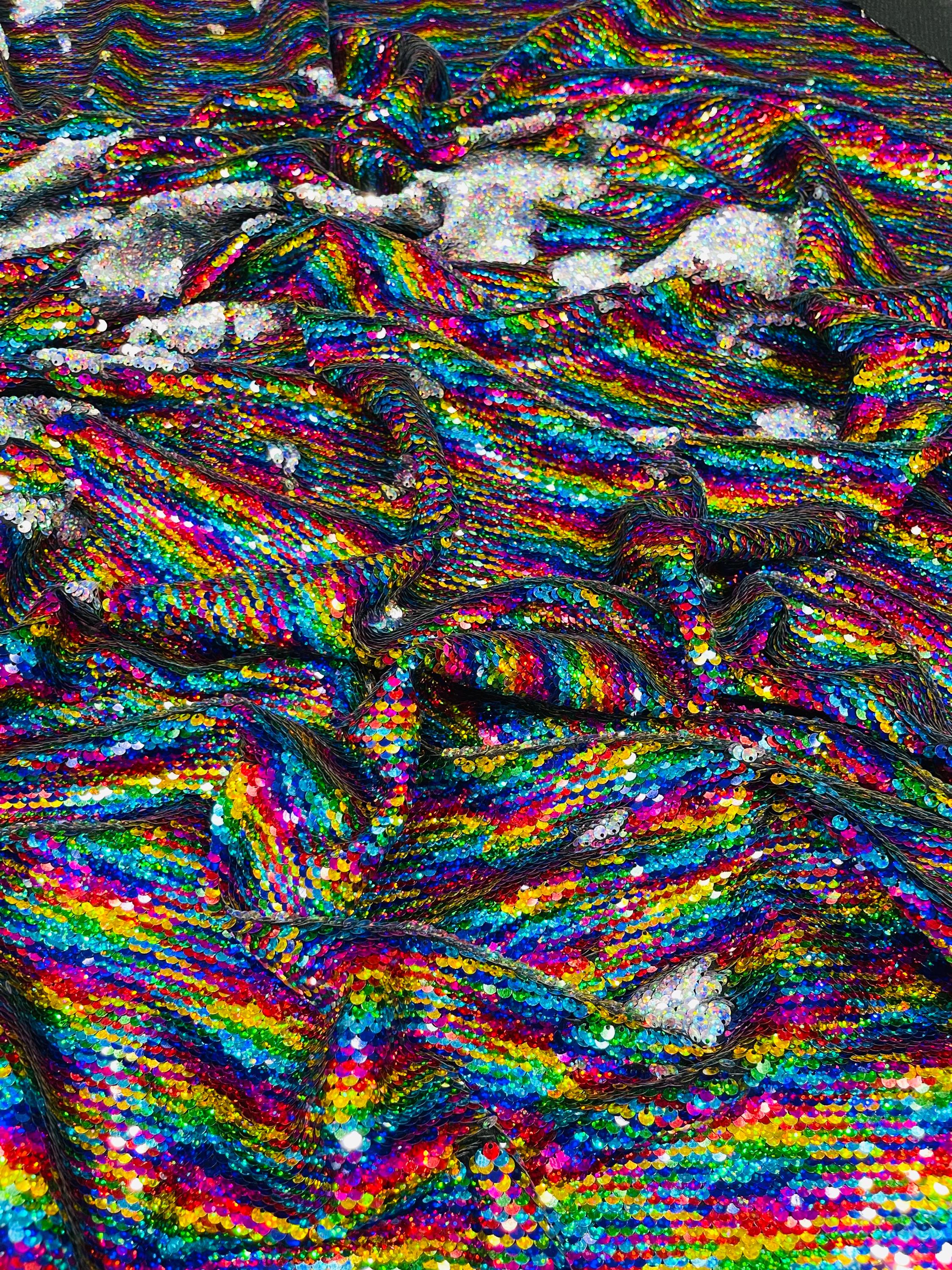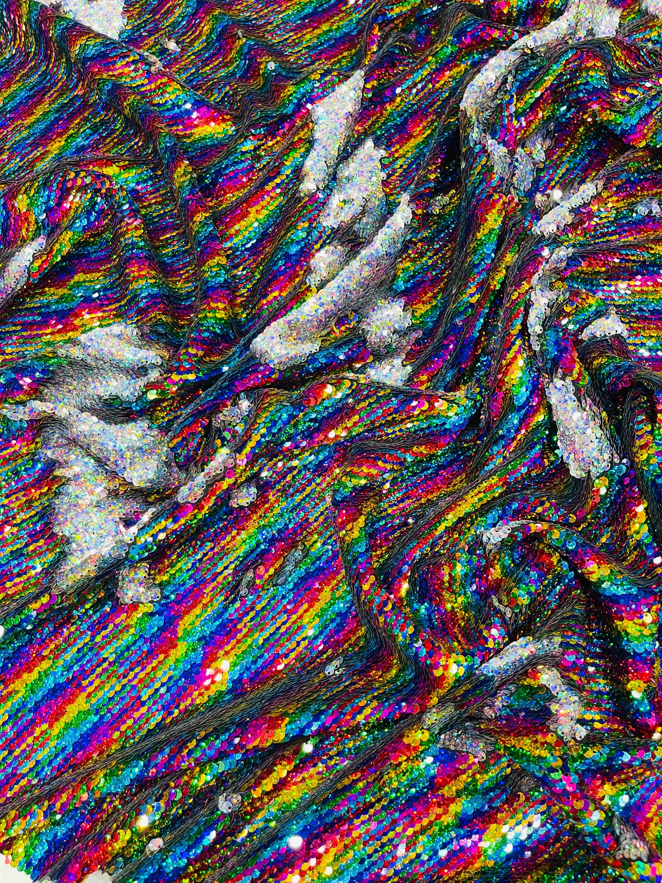 Hologram Silver/Rainbow Flip Sequins Fabric: 2-Way Stretch Reversible Material