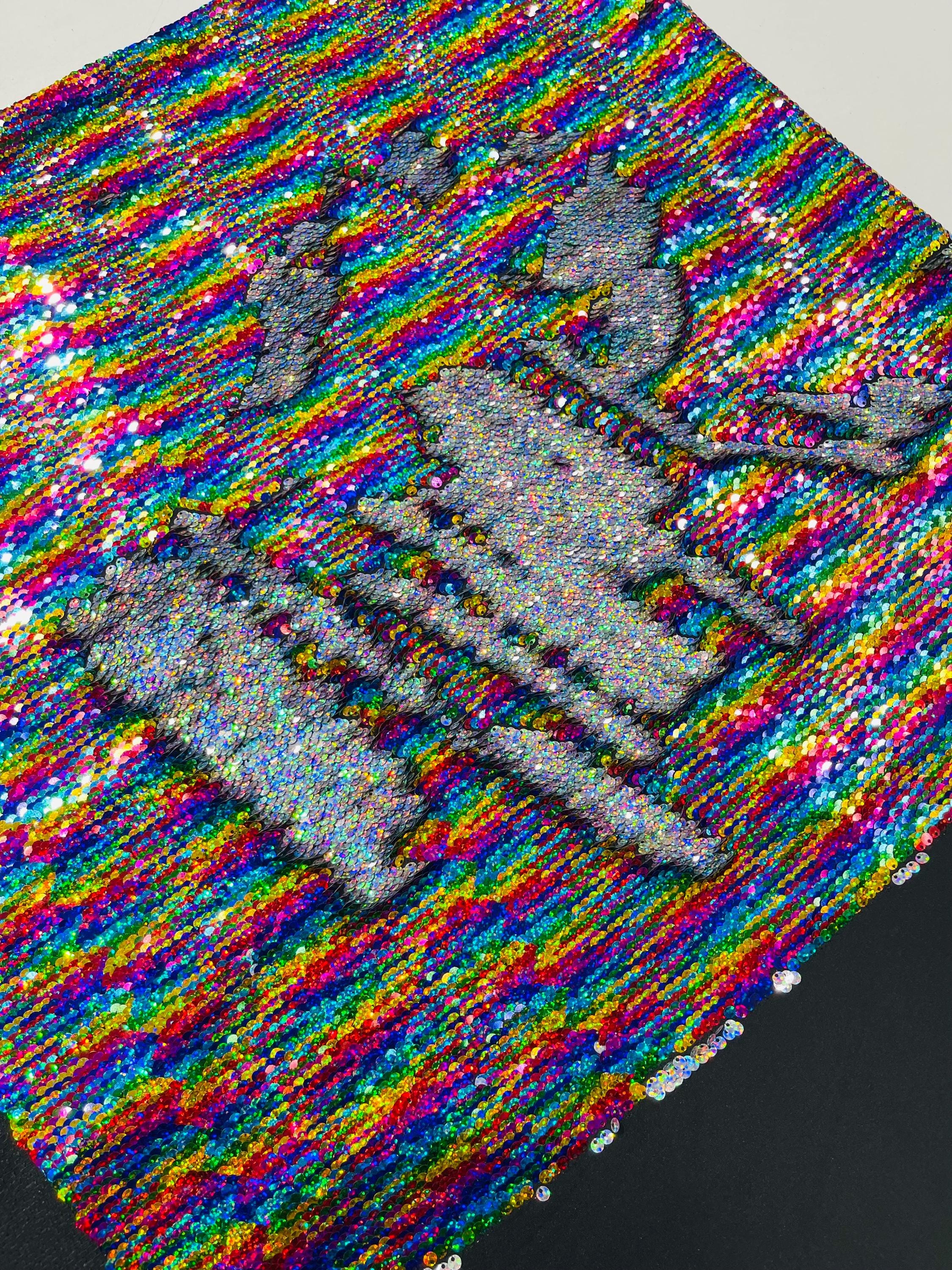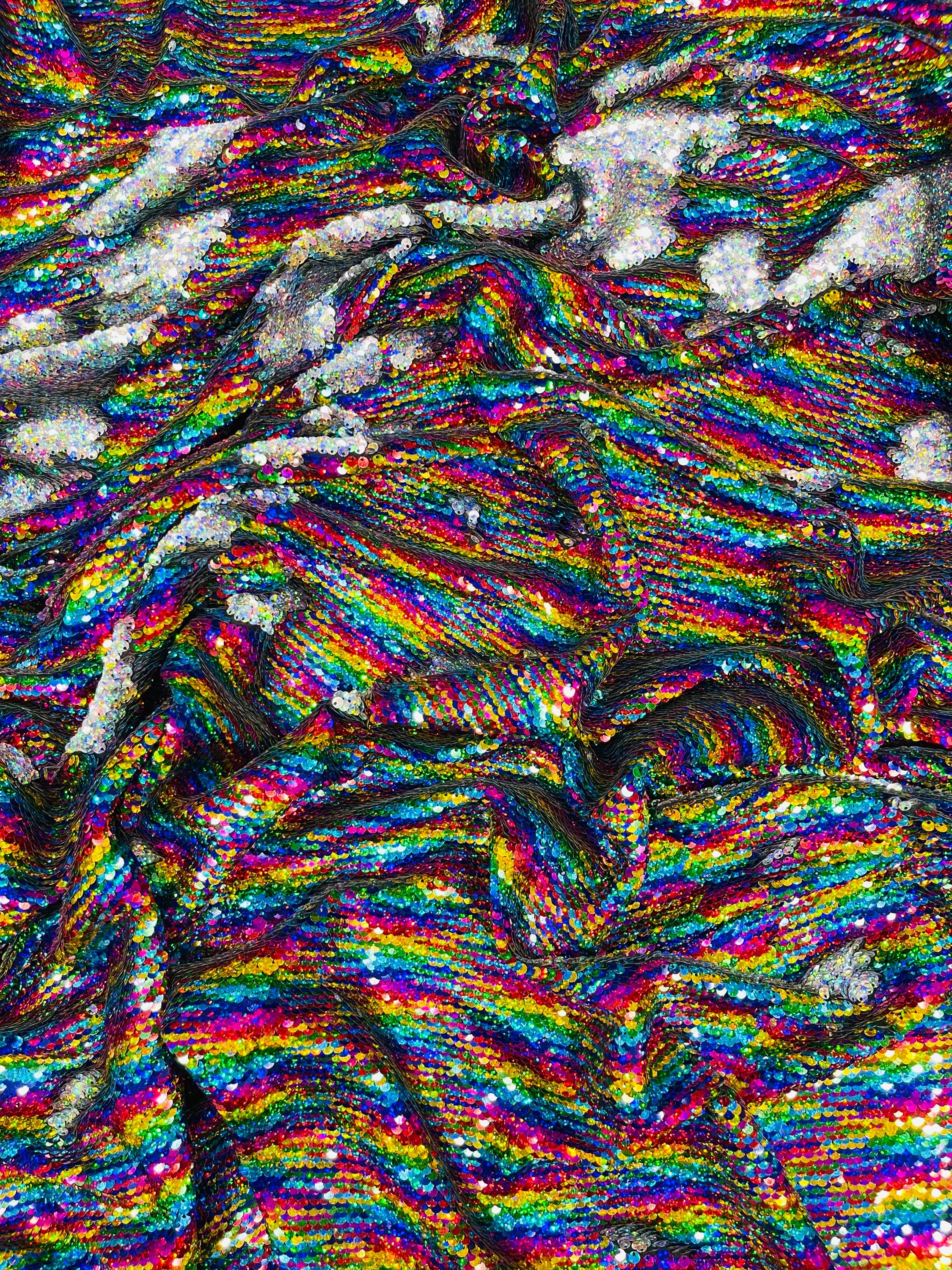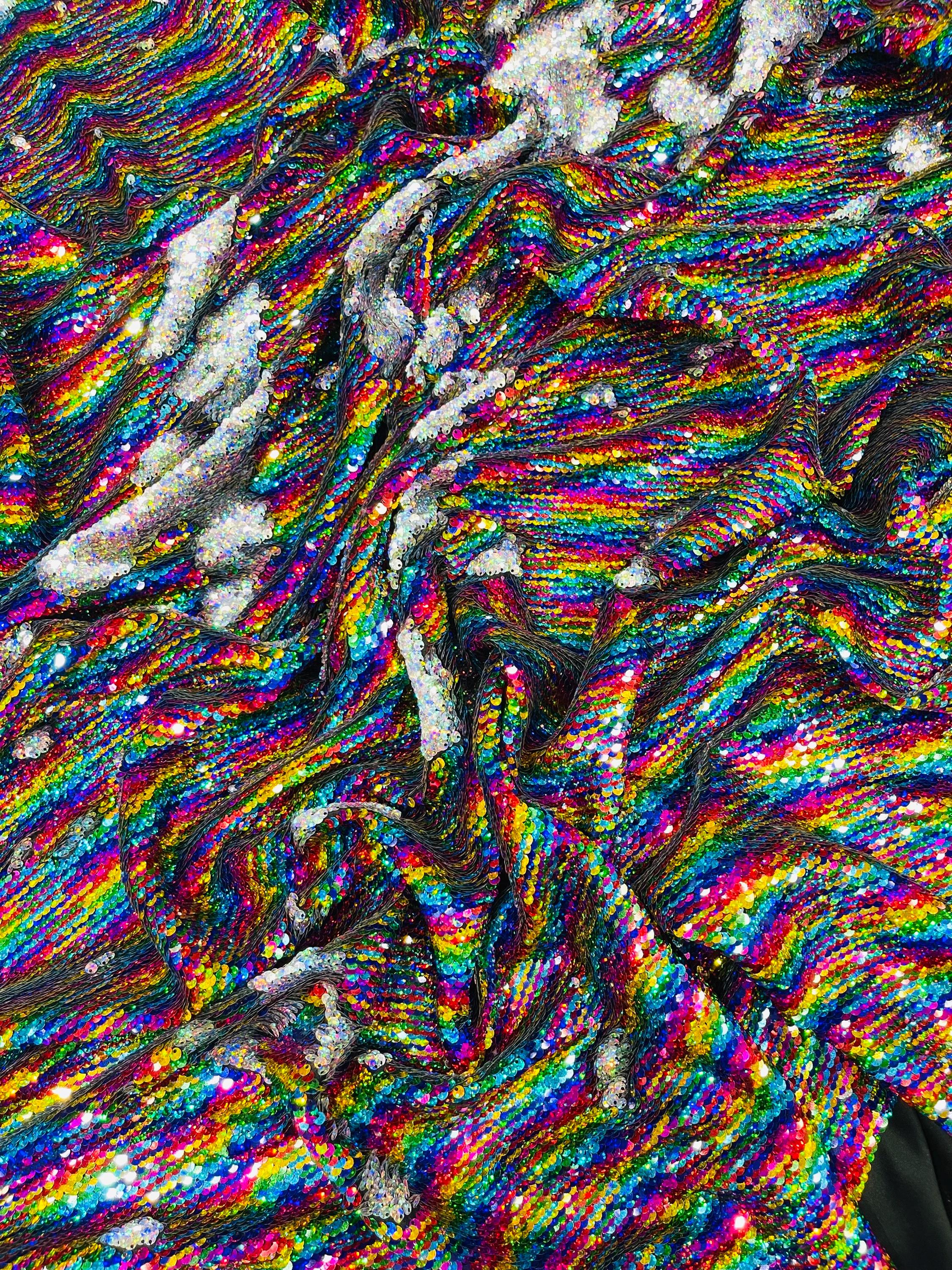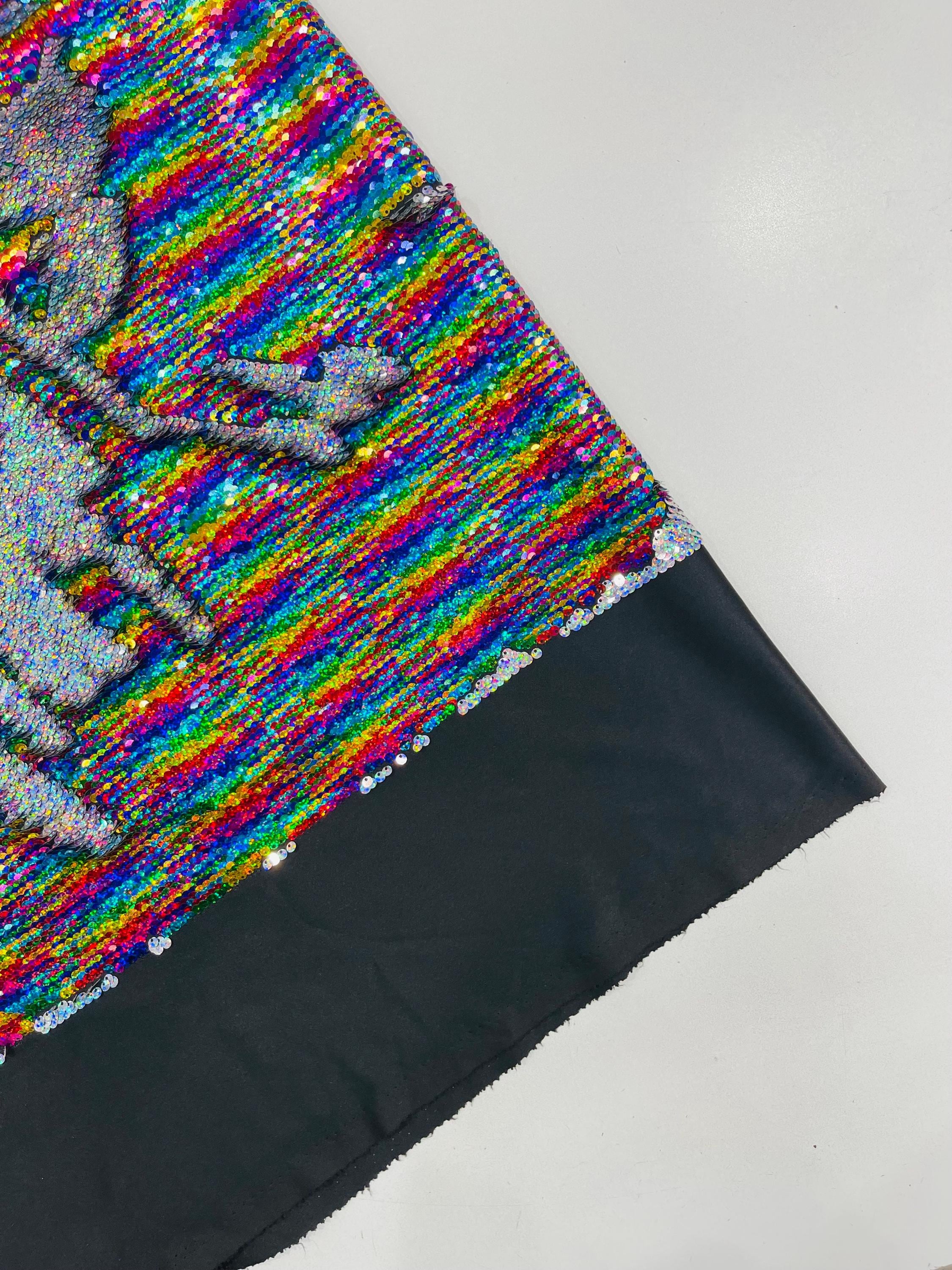 Hologram Silver/Rainbow Flip Sequins Fabric: 2-Way Stretch Reversible Material