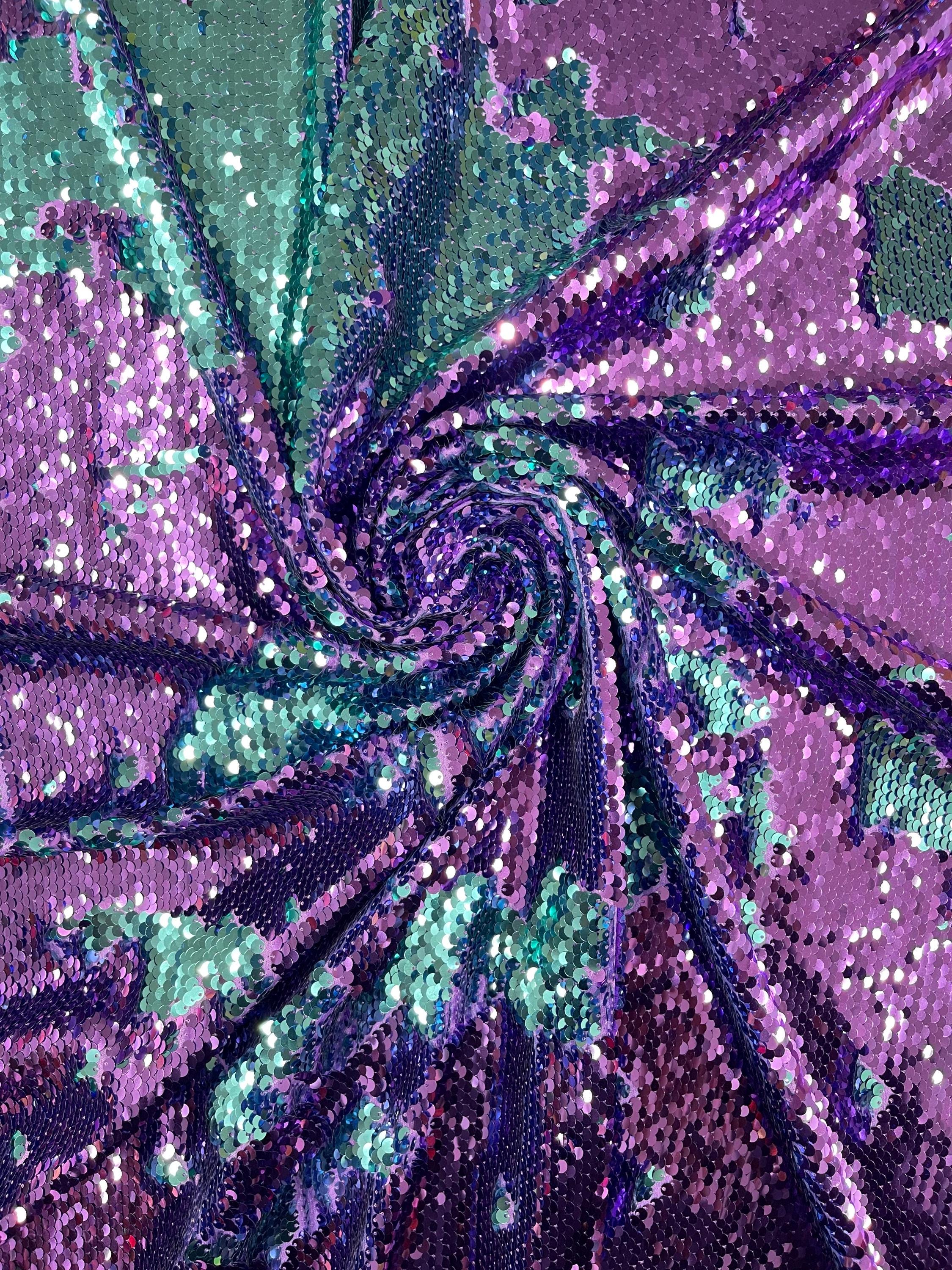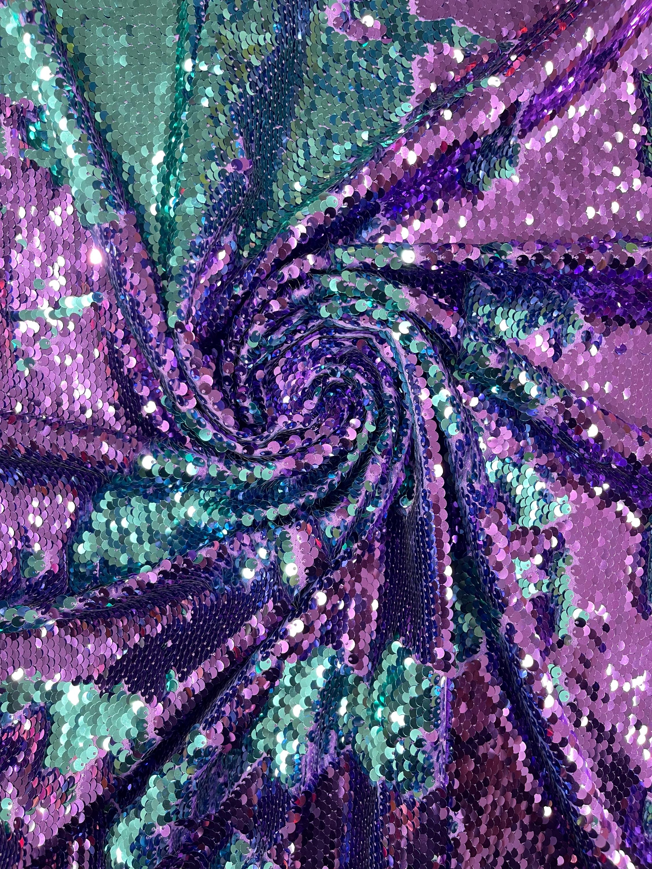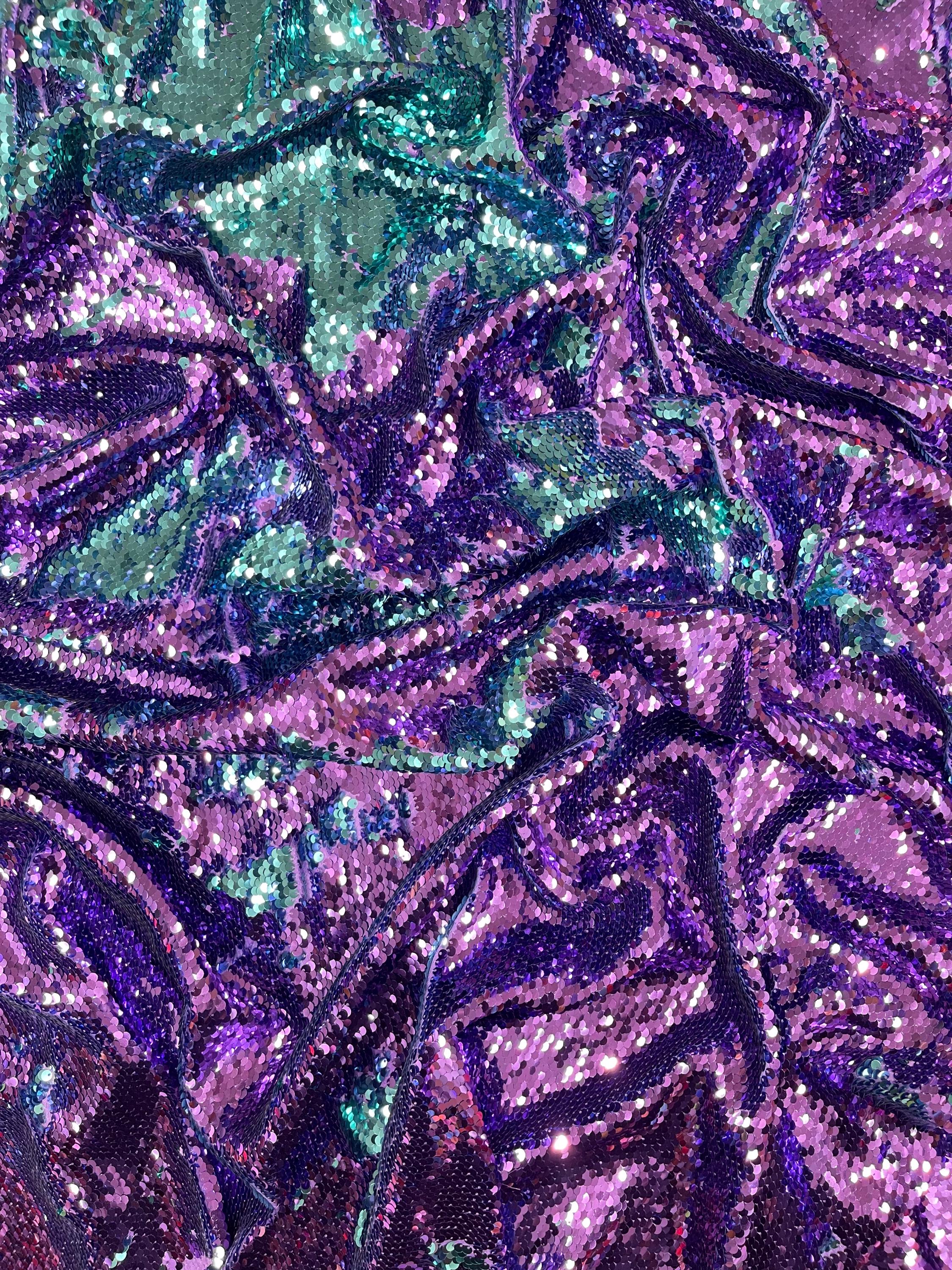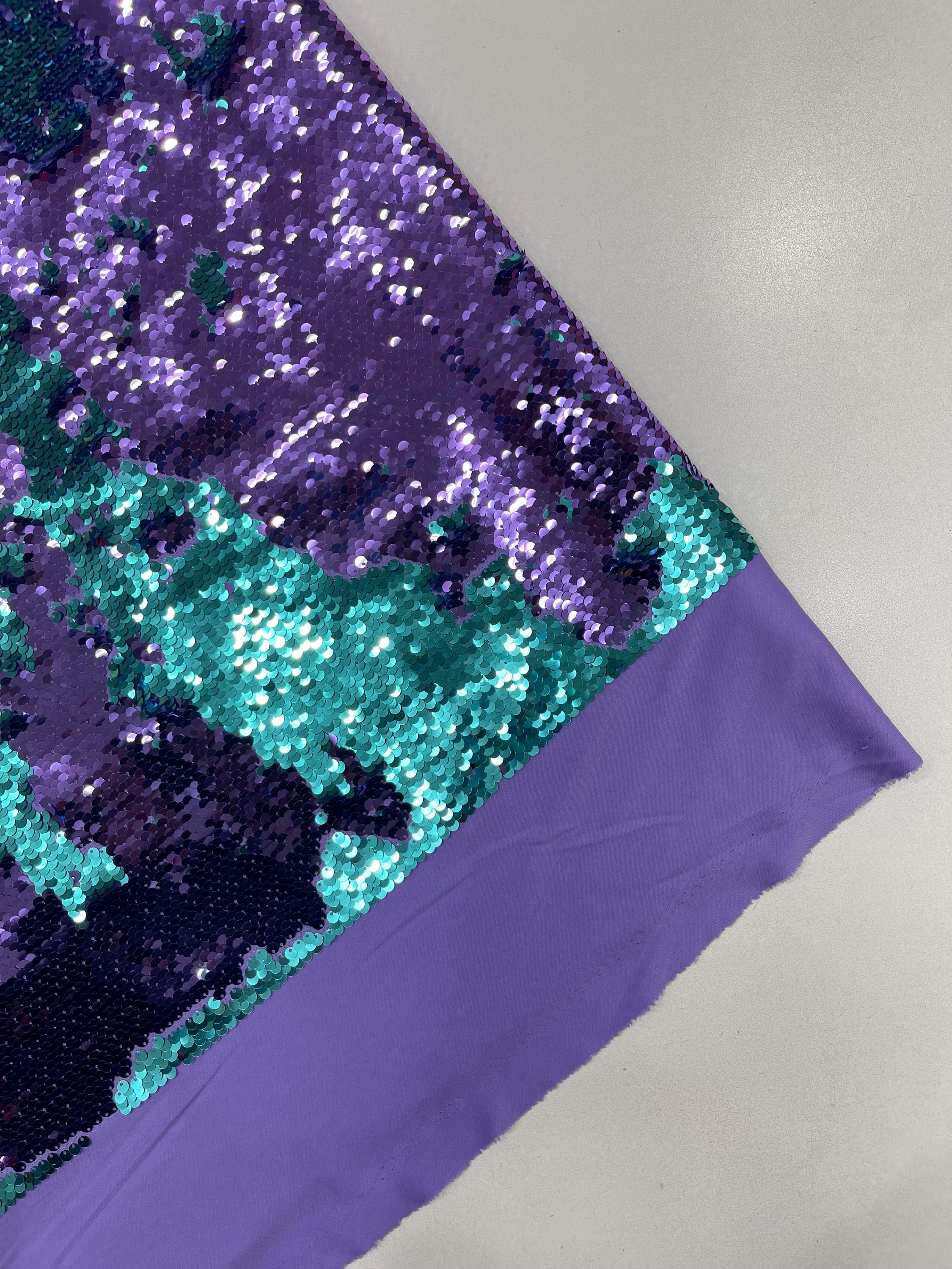 Purple/Turquoise Flip Up Sequins Reversible, 2-Way Stretch 58/60” Sequins Fabric Nightgowns-Prom Gown