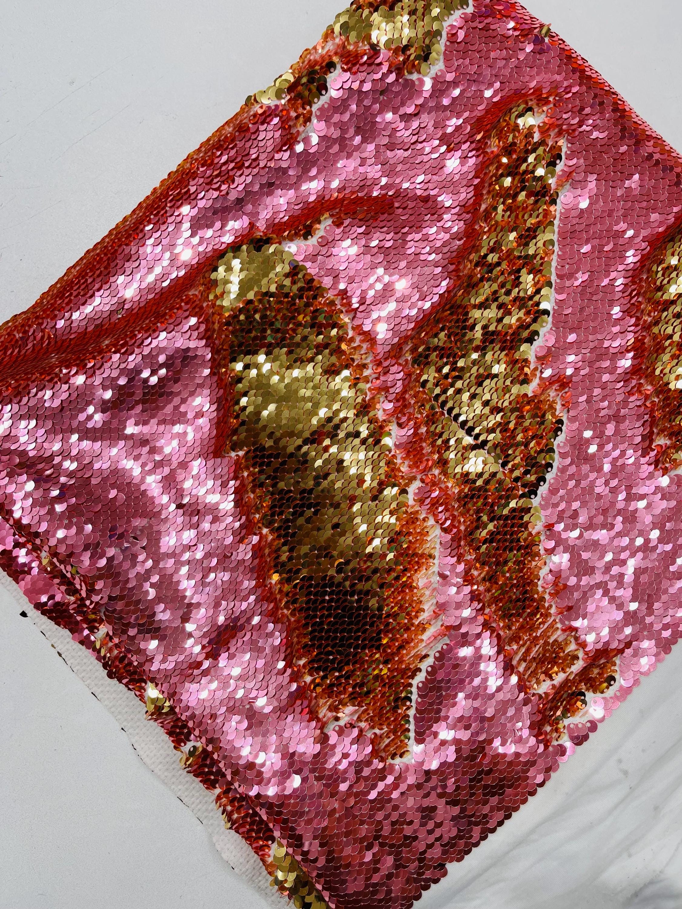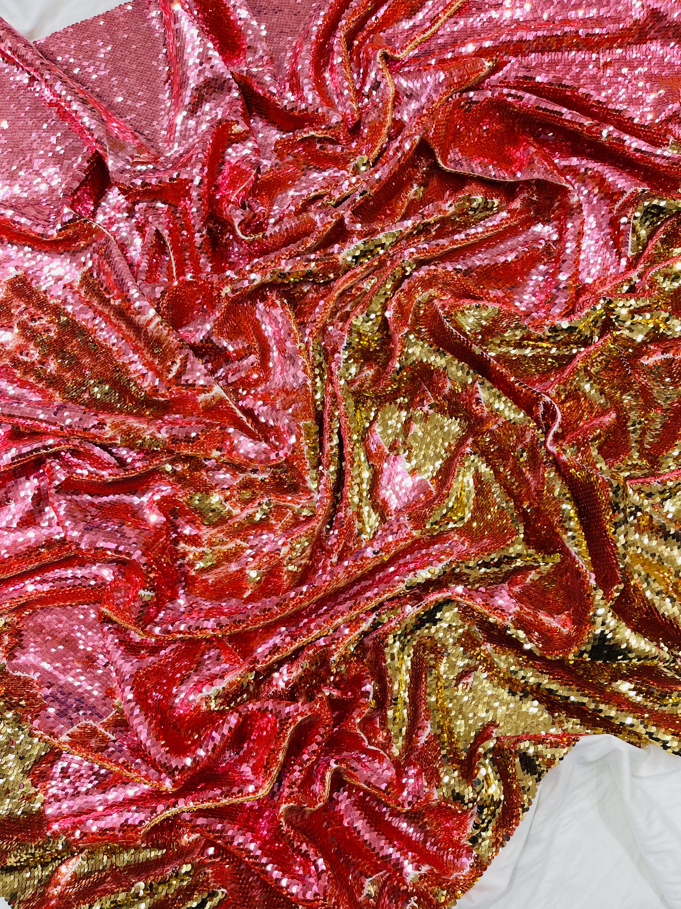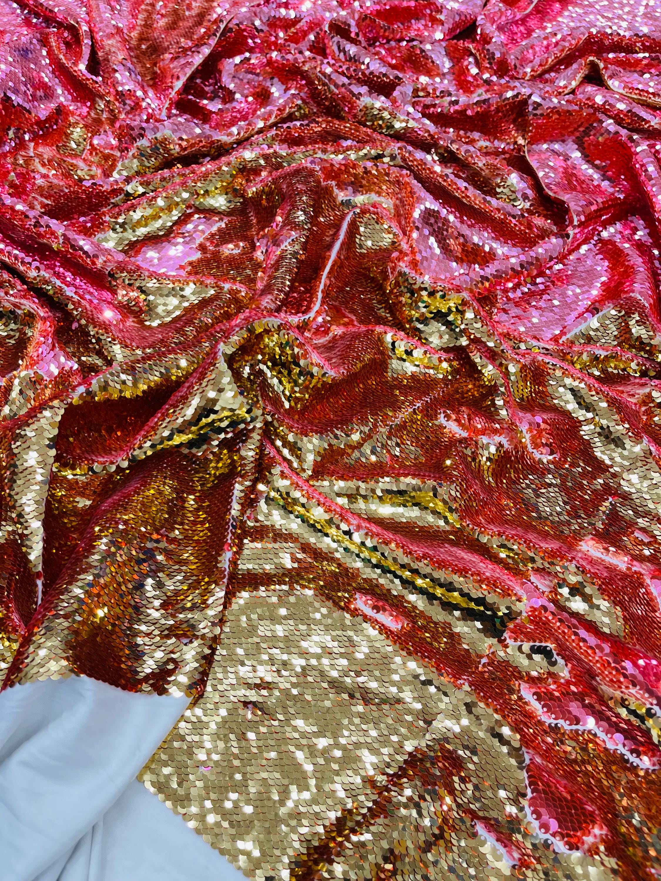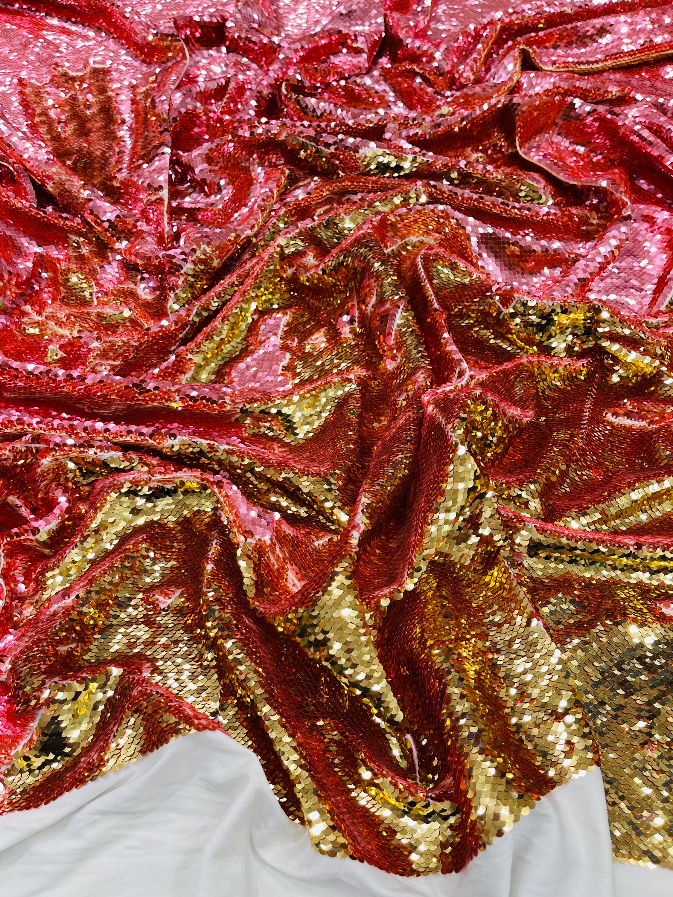 Gold/Coral Sequins Fabric: 2-Way Stretch Flip-Up Reversible Sequin