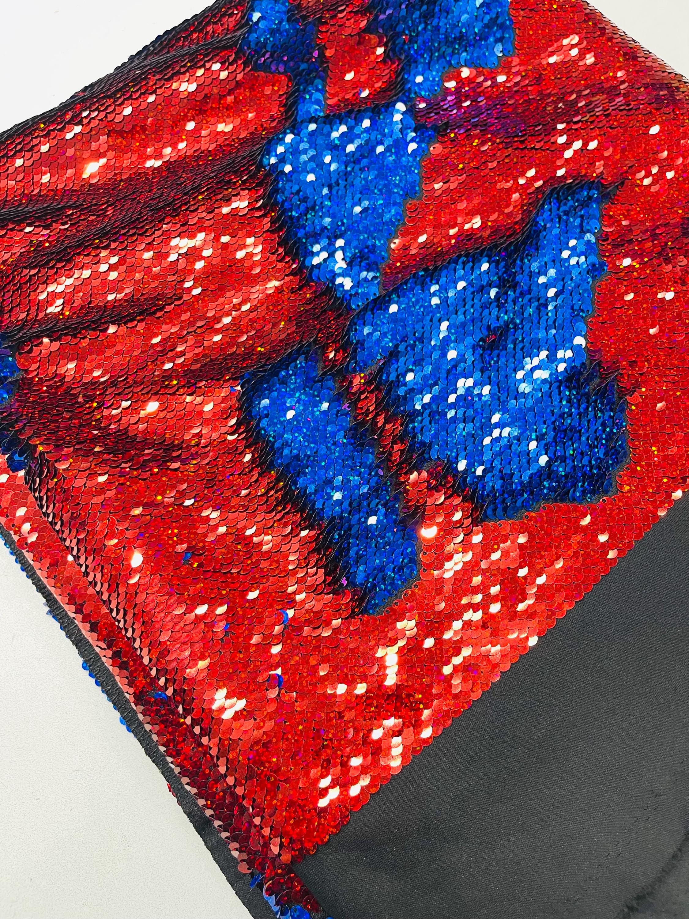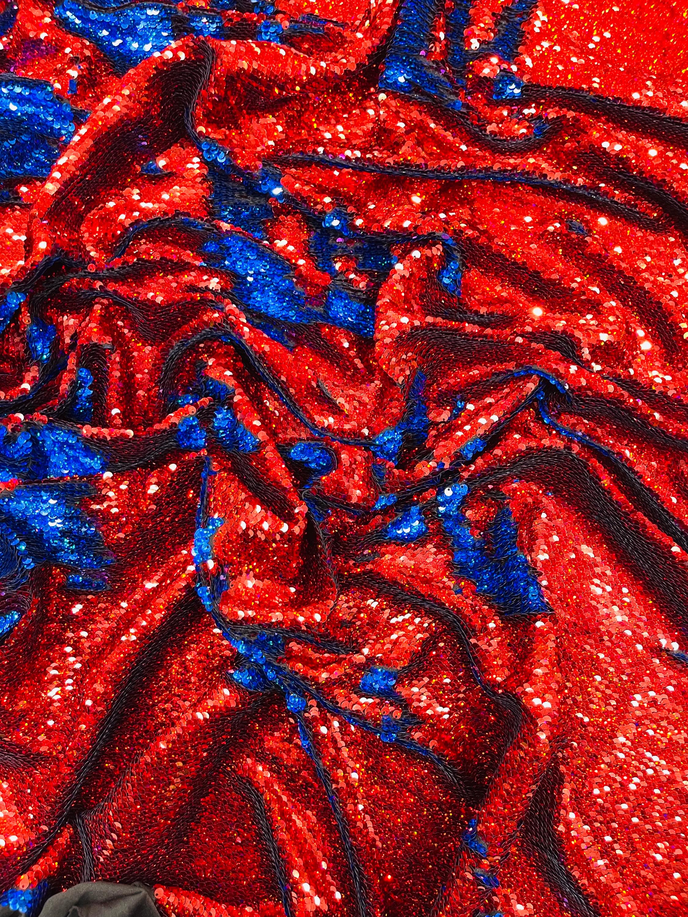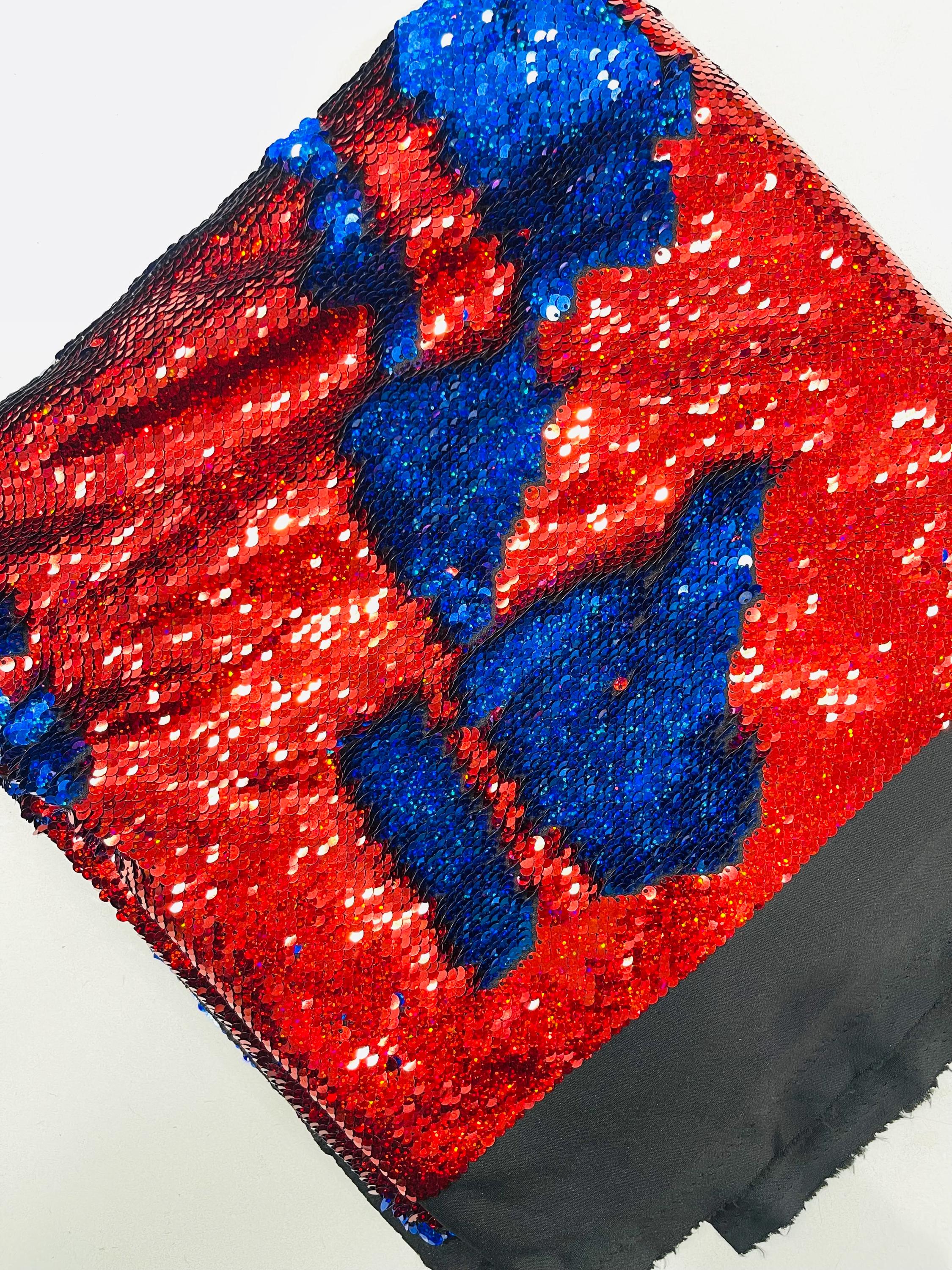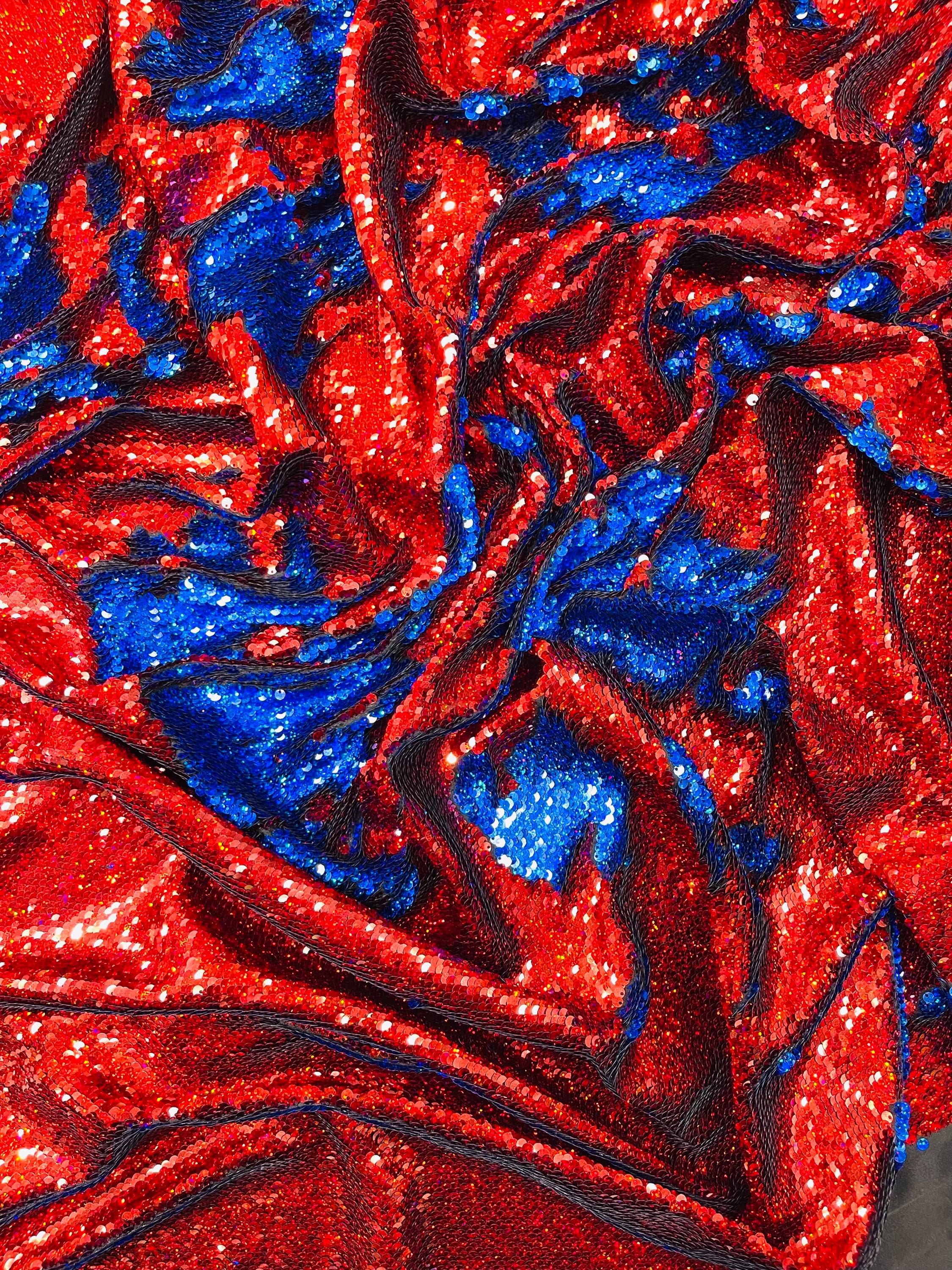 Red/Royal Blue Sequins Fabric: 2-Way Stretch Flip-Up Reversible Sequin