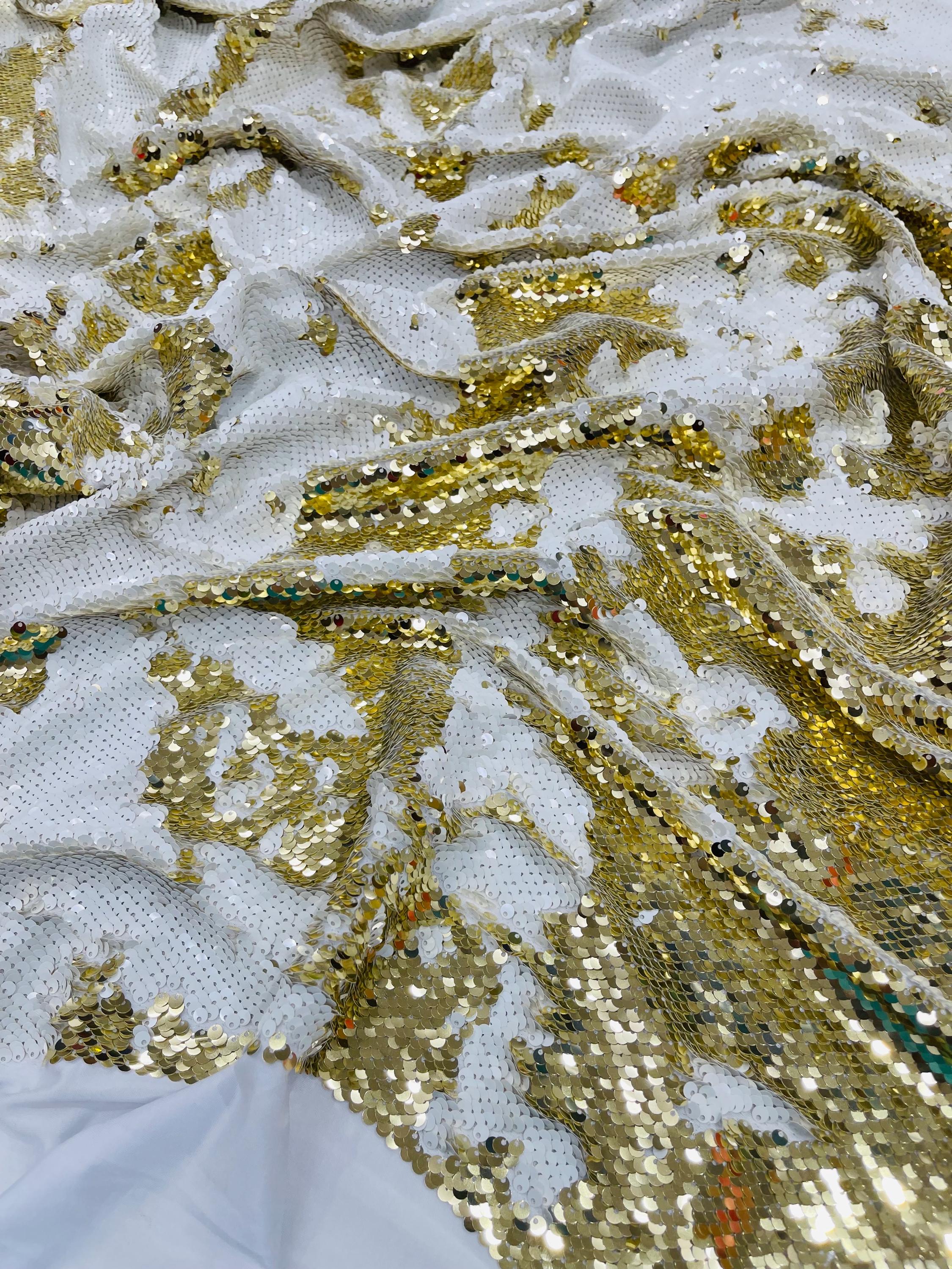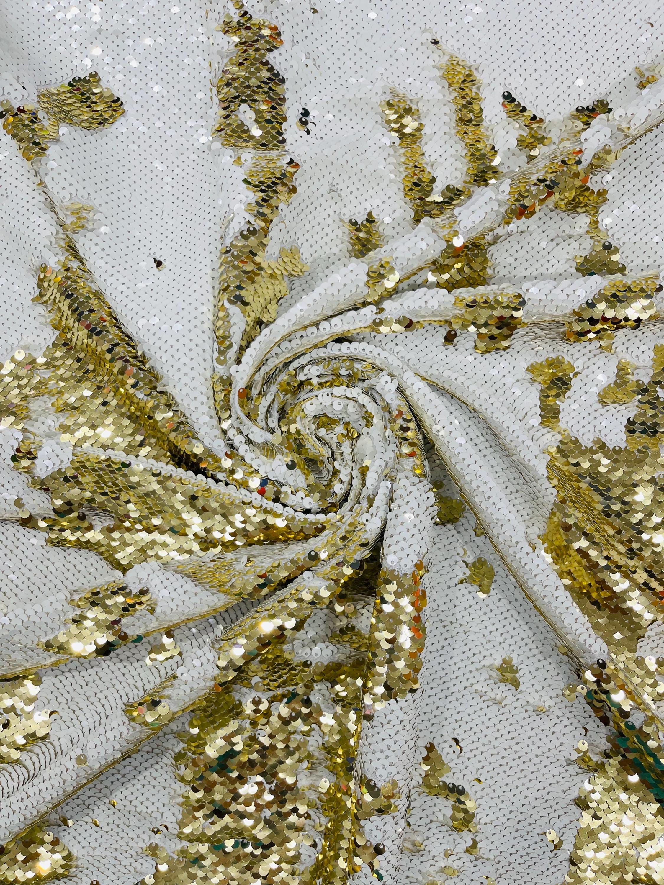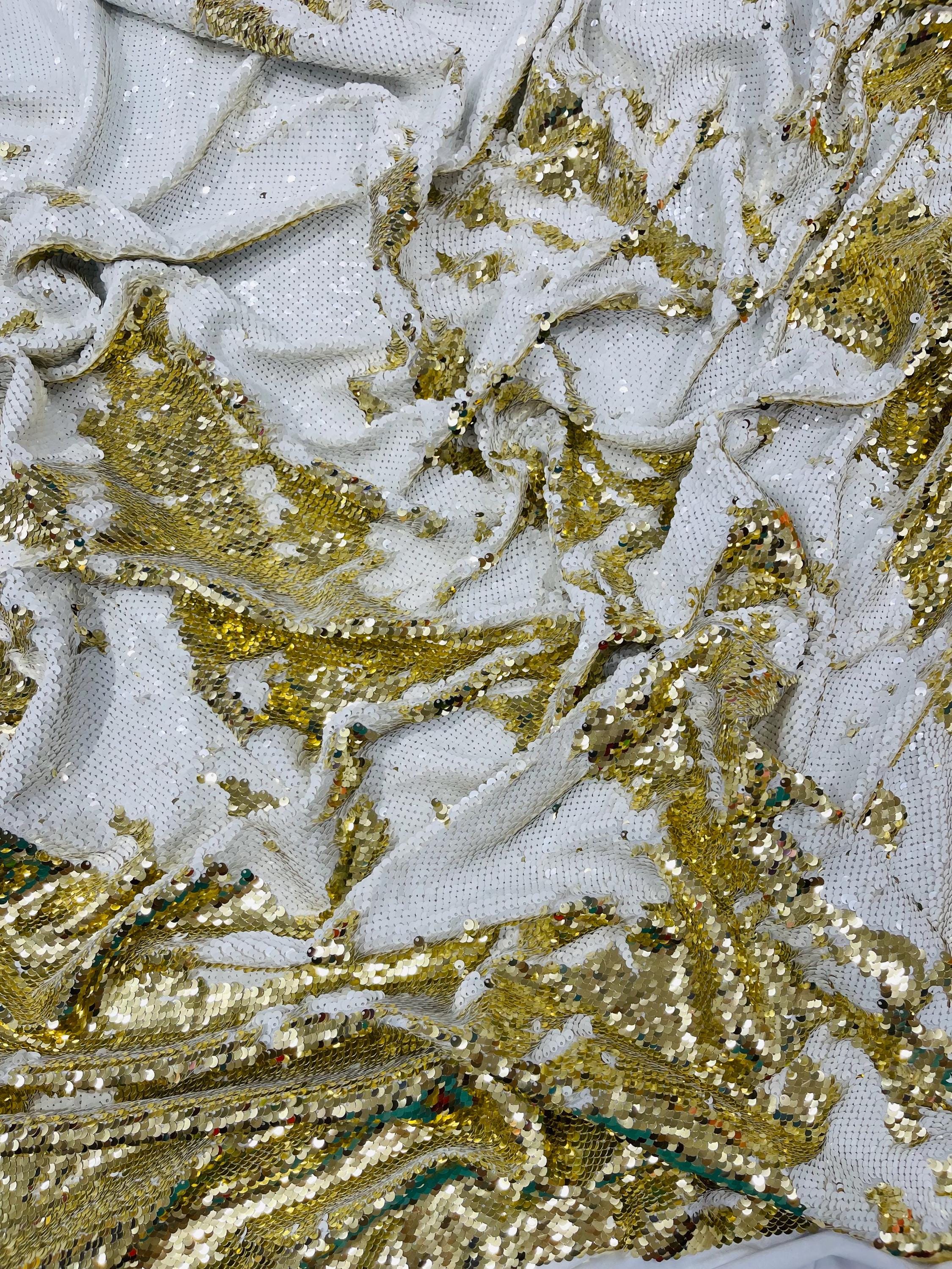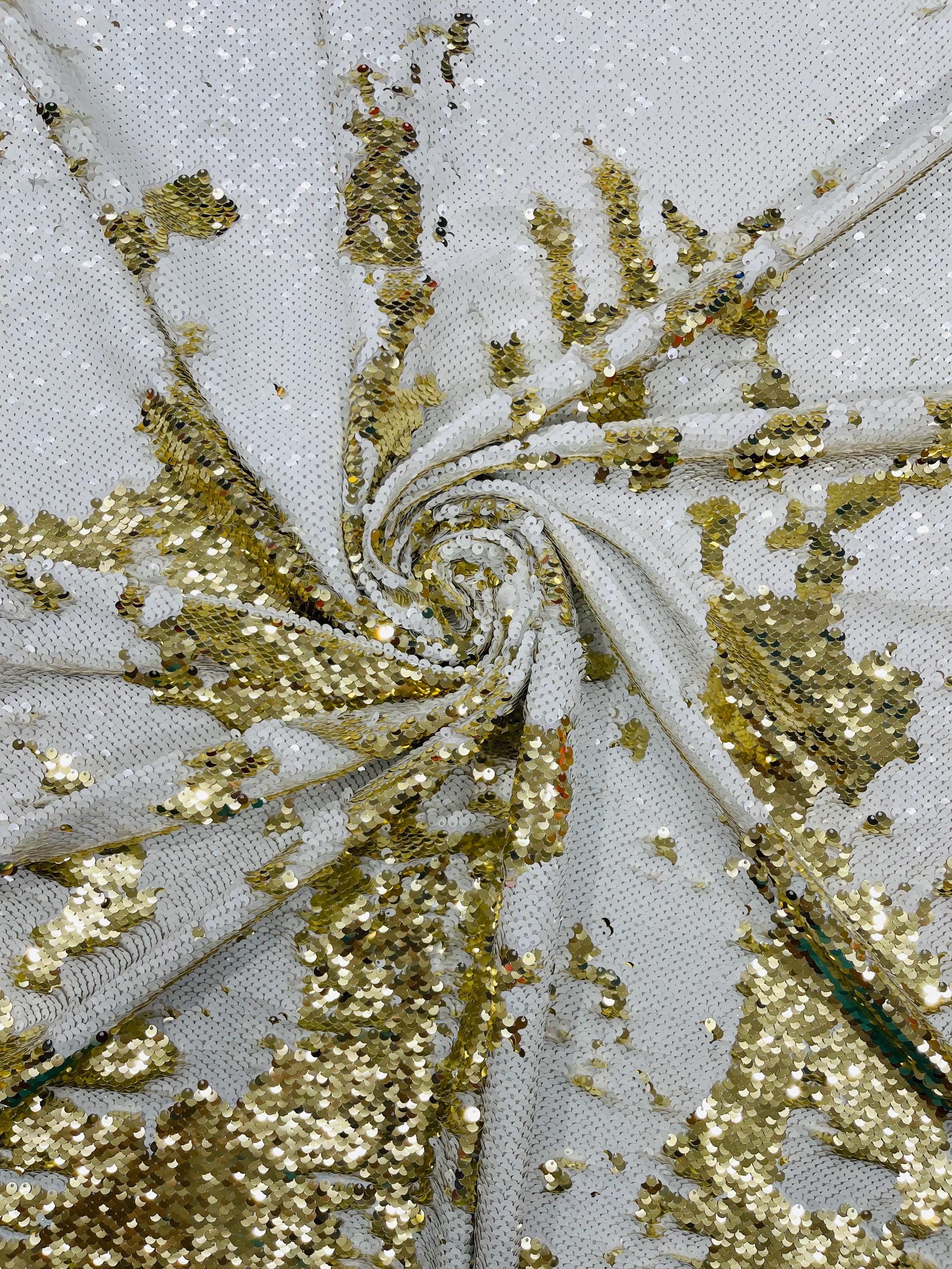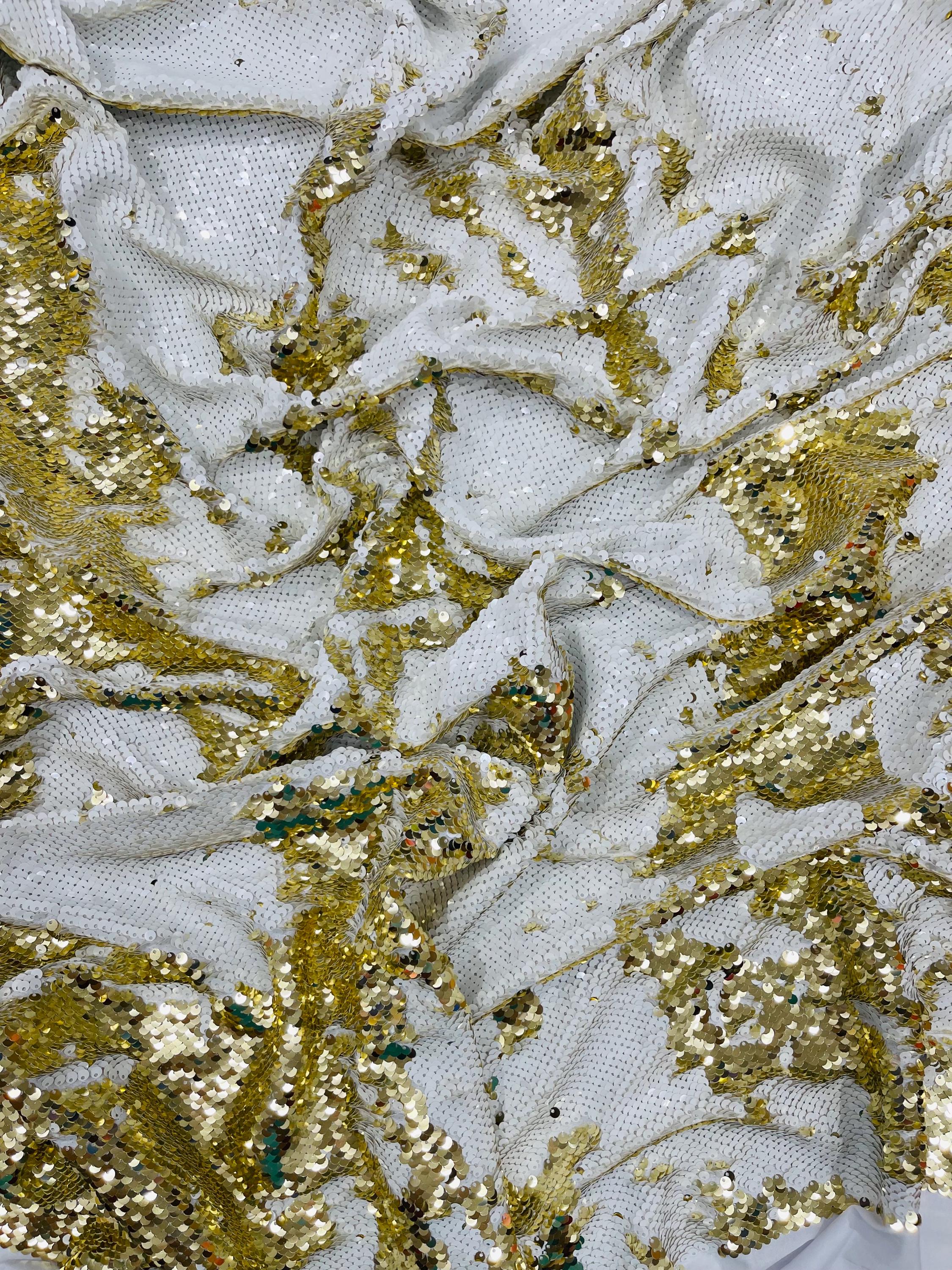 Gold/White Sequins Fabric: 2-Way Stretch Flip-Up Reversible Sequin