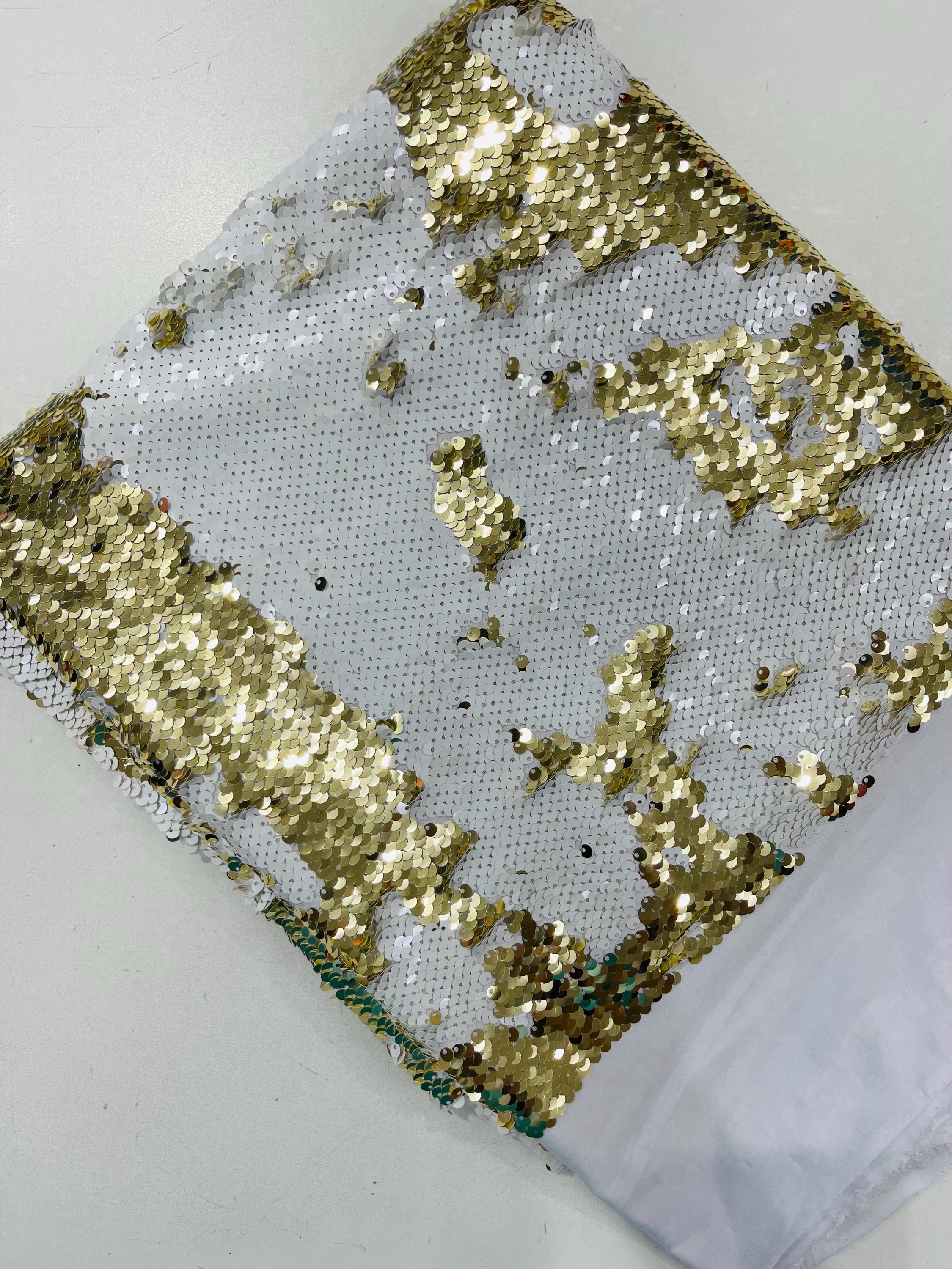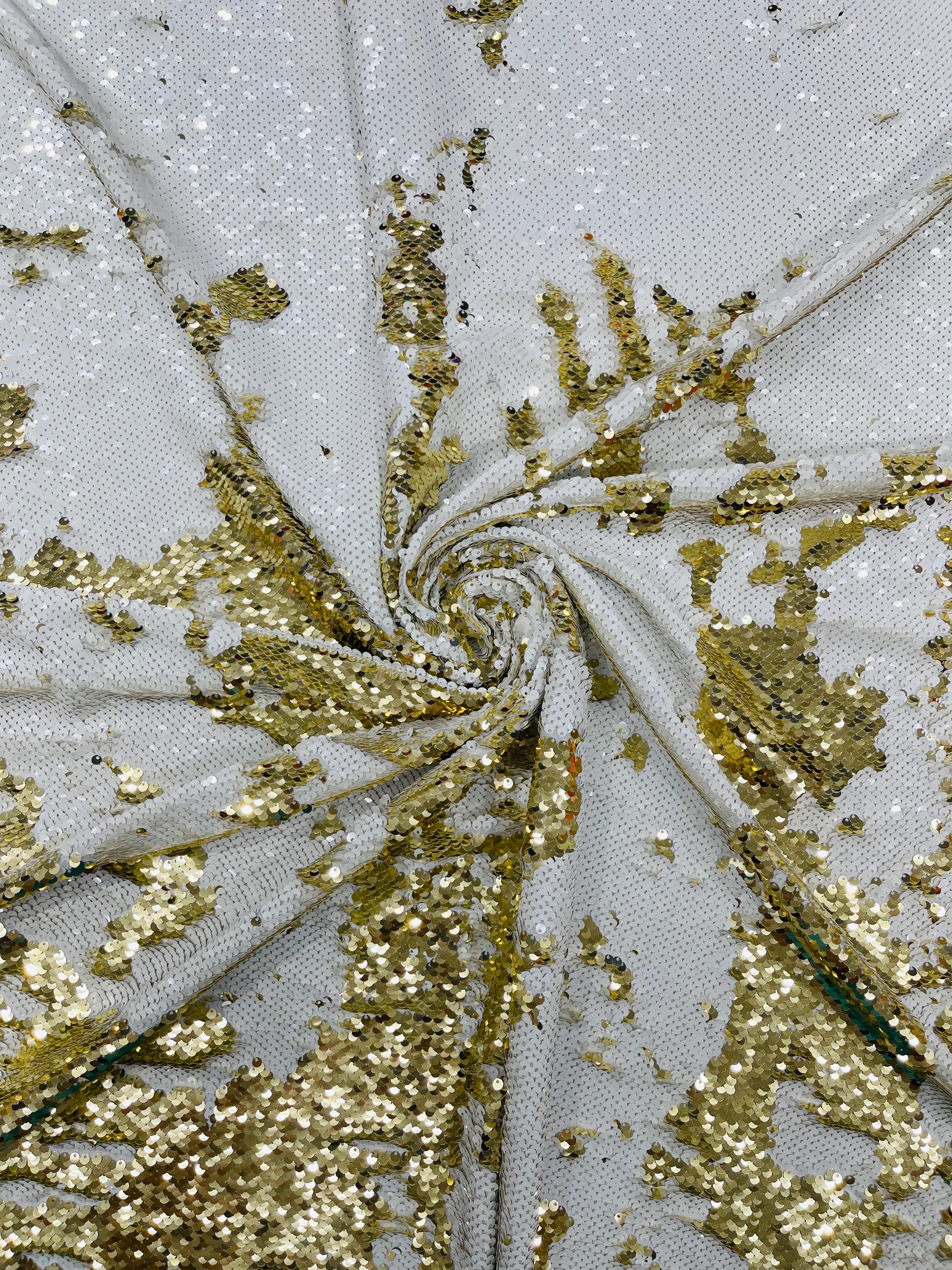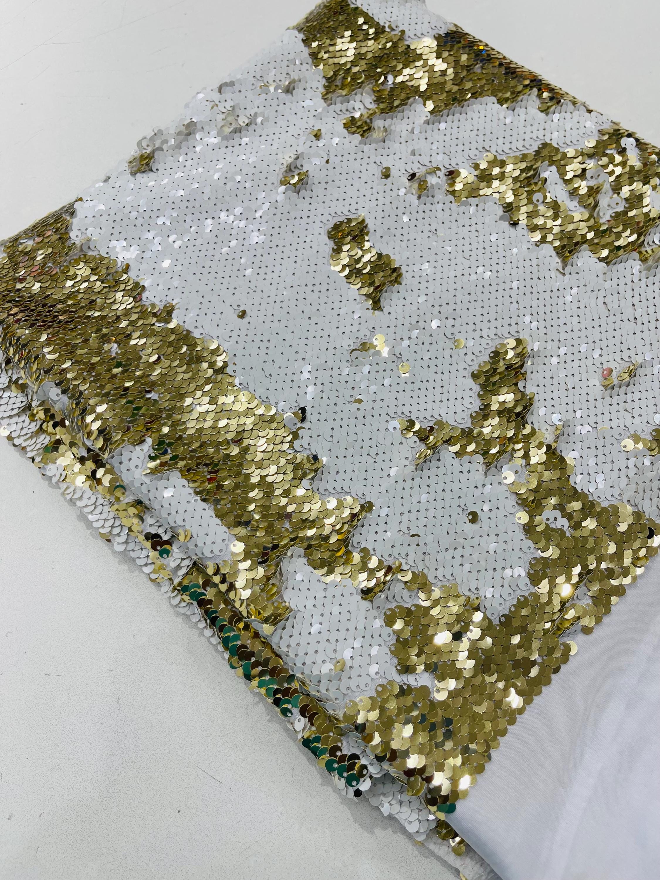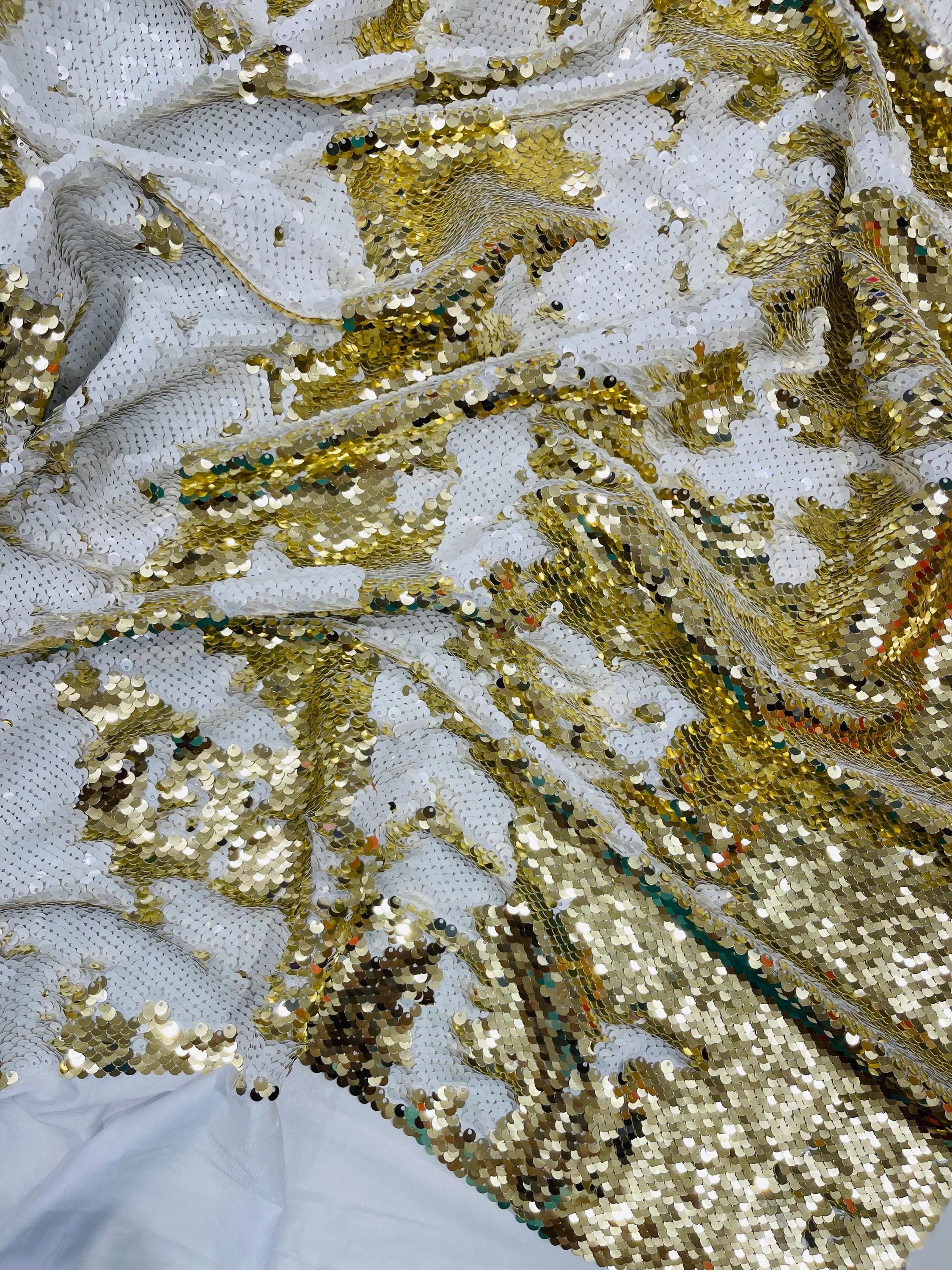 Gold/White Sequins Fabric: 2-Way Stretch Flip-Up Reversible Sequin