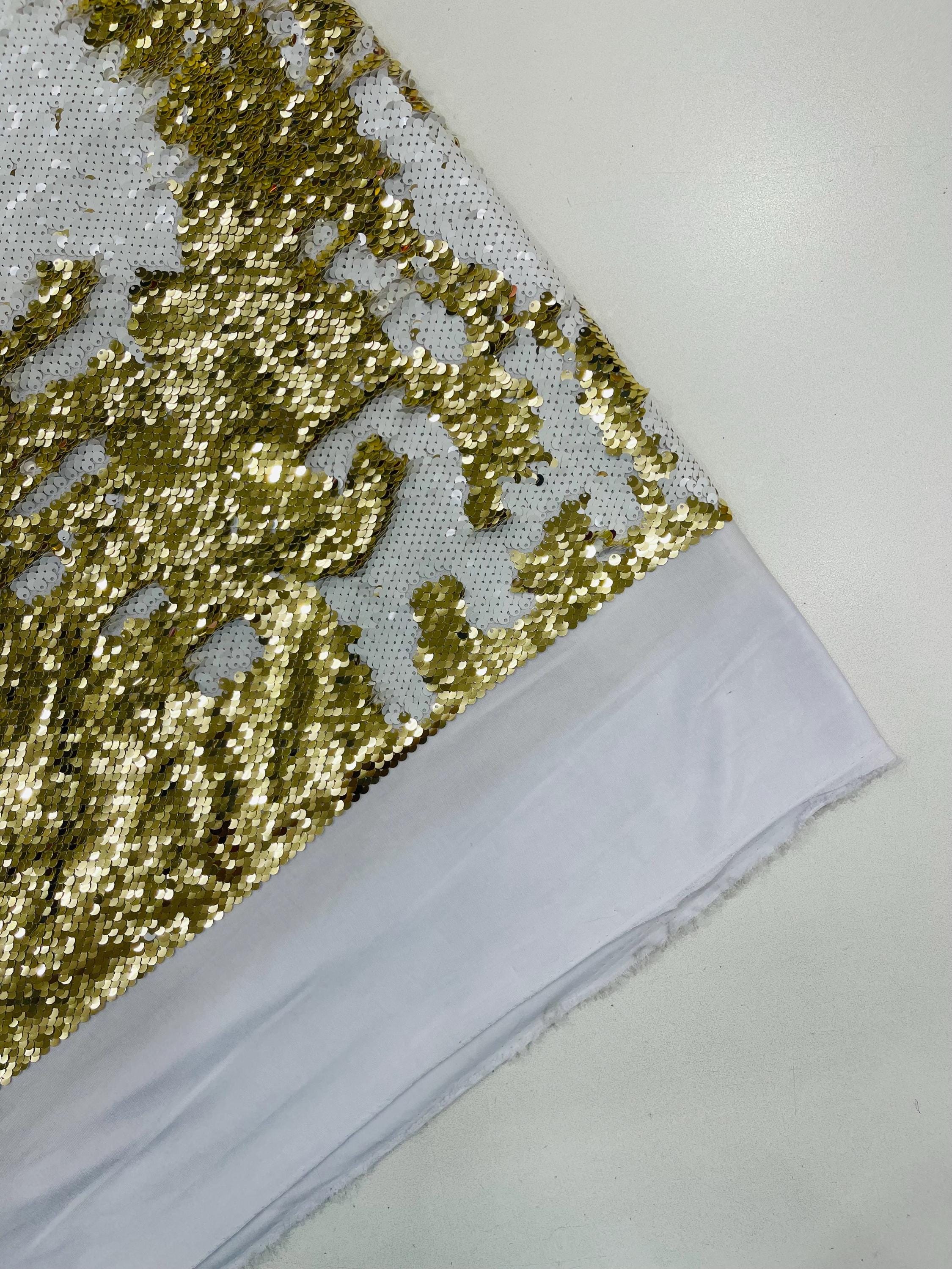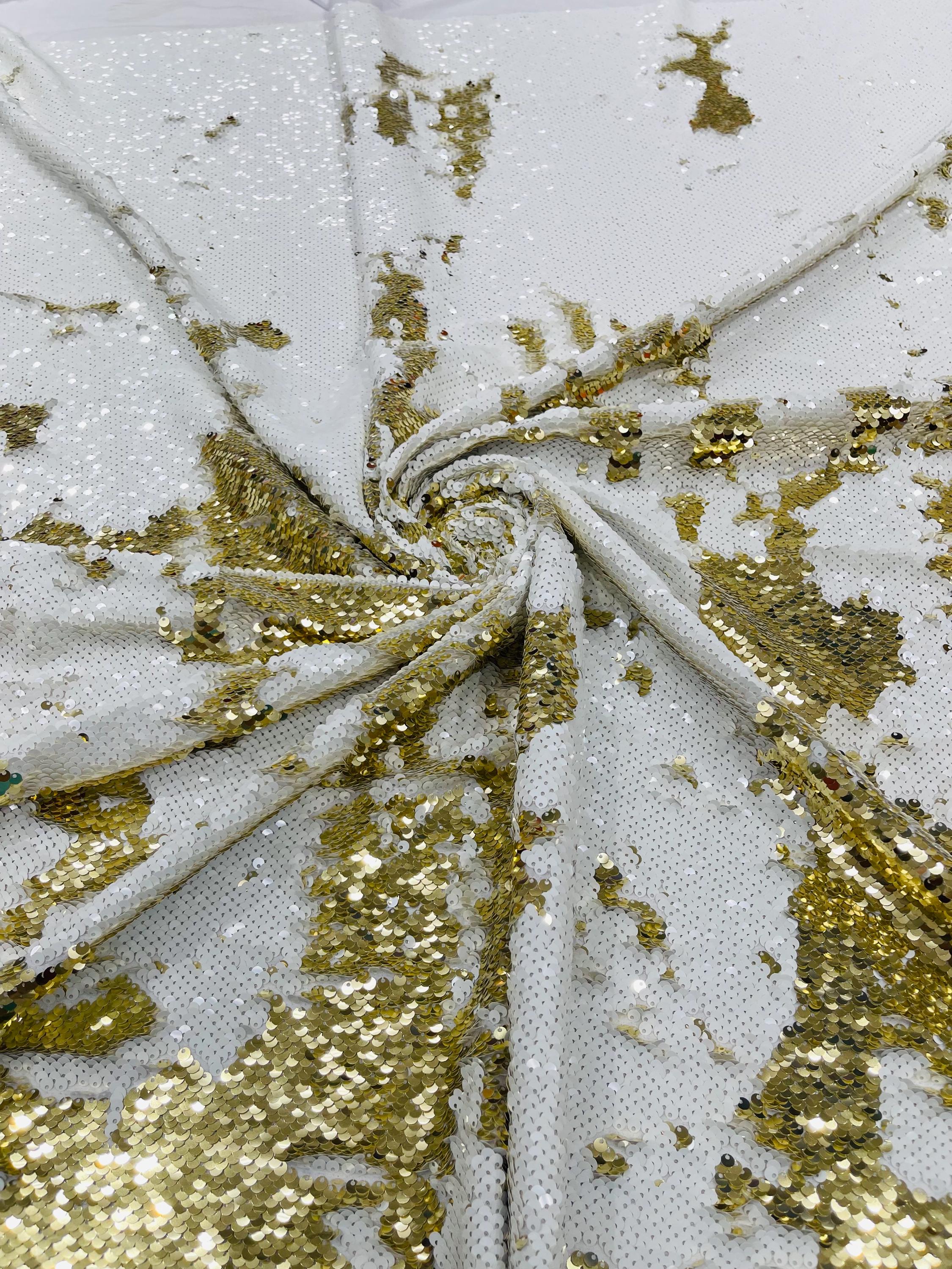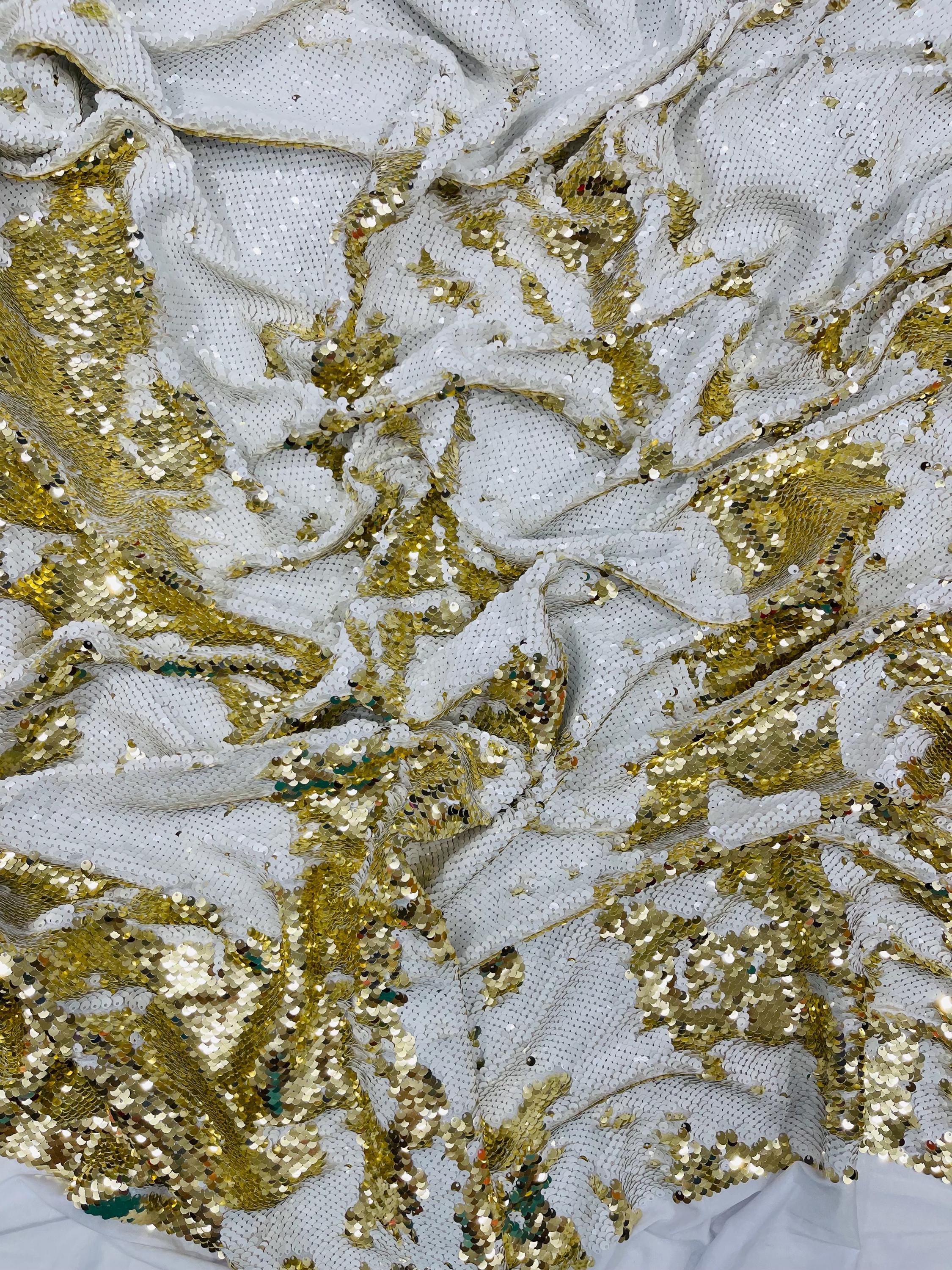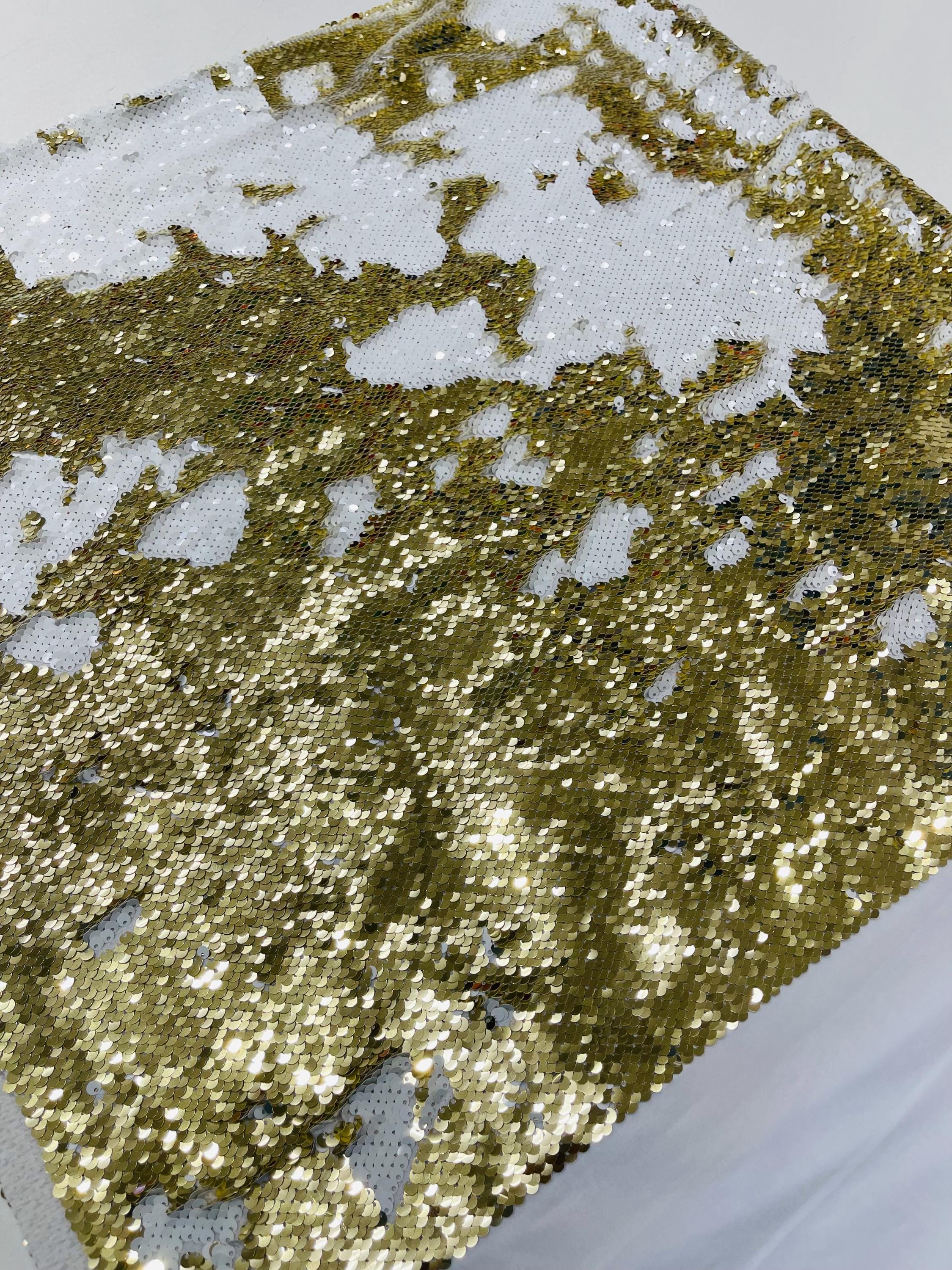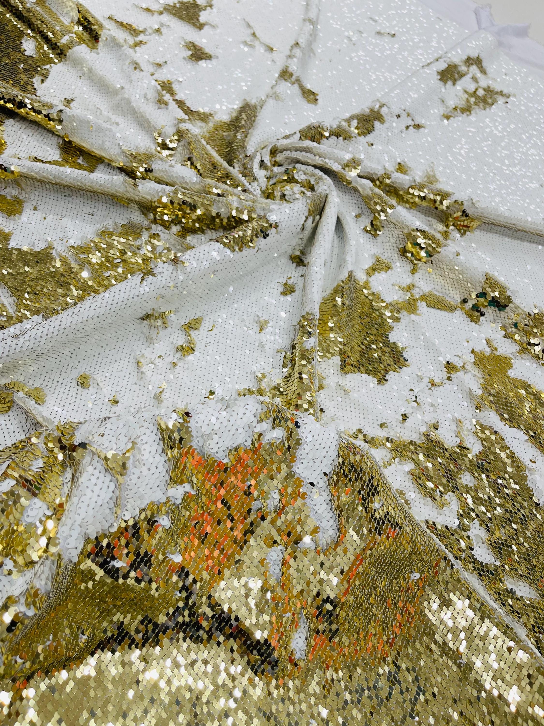 Gold/White Sequins Fabric: 2-Way Stretch Flip-Up Reversible Sequin