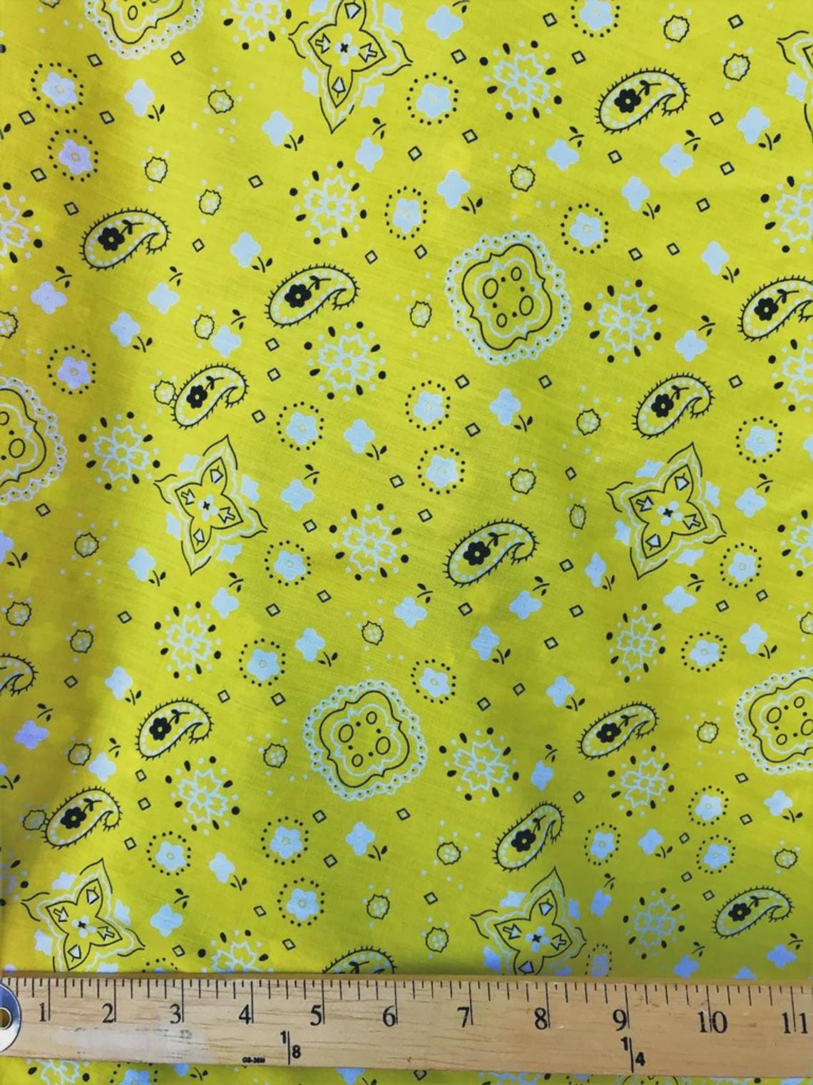 Wonderful bandanna print on a poly cotton fabric. Poly-cotton is a very inexpensive fabric that is light weight and breathable. Make some amazing table cover, runner, handkerchief, or an actual bandanna!