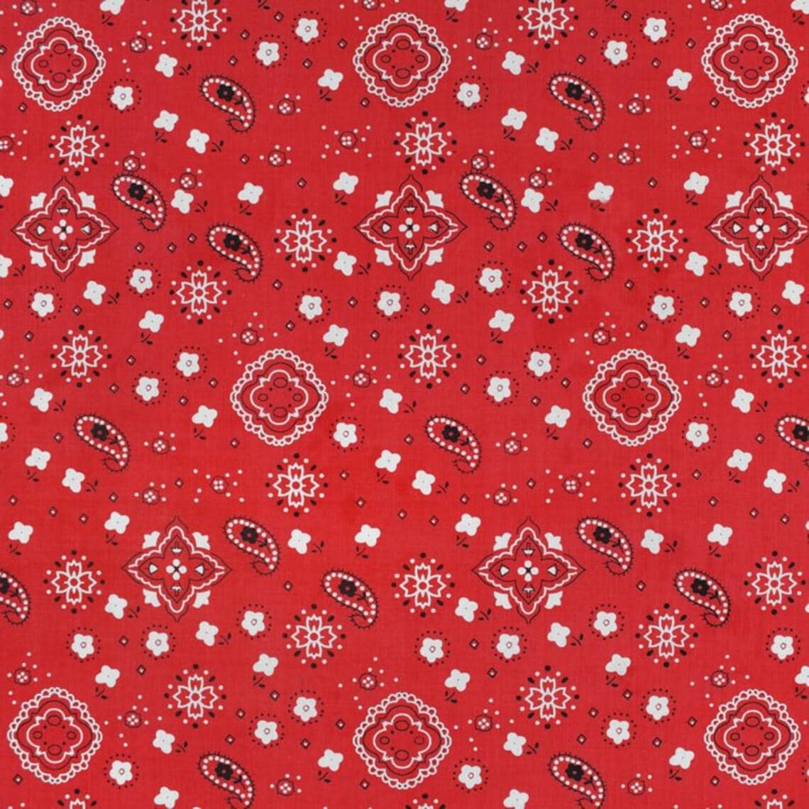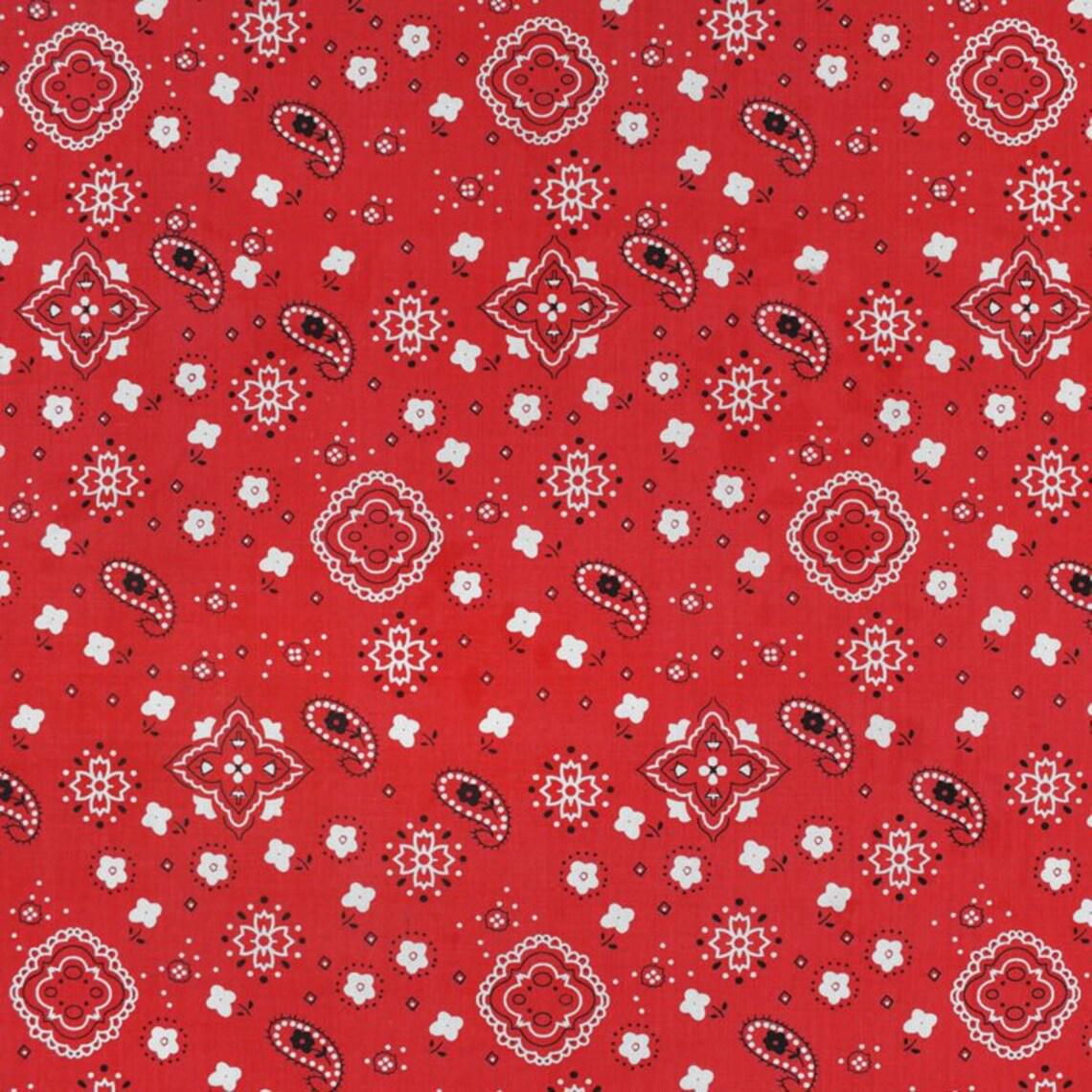 Wonderful bandanna print on a poly cotton fabric. Poly-cotton is a very inexpensive fabric that is light weight and breathable. Make some amazing table cover, runner, handkerchief, or an actual bandanna!