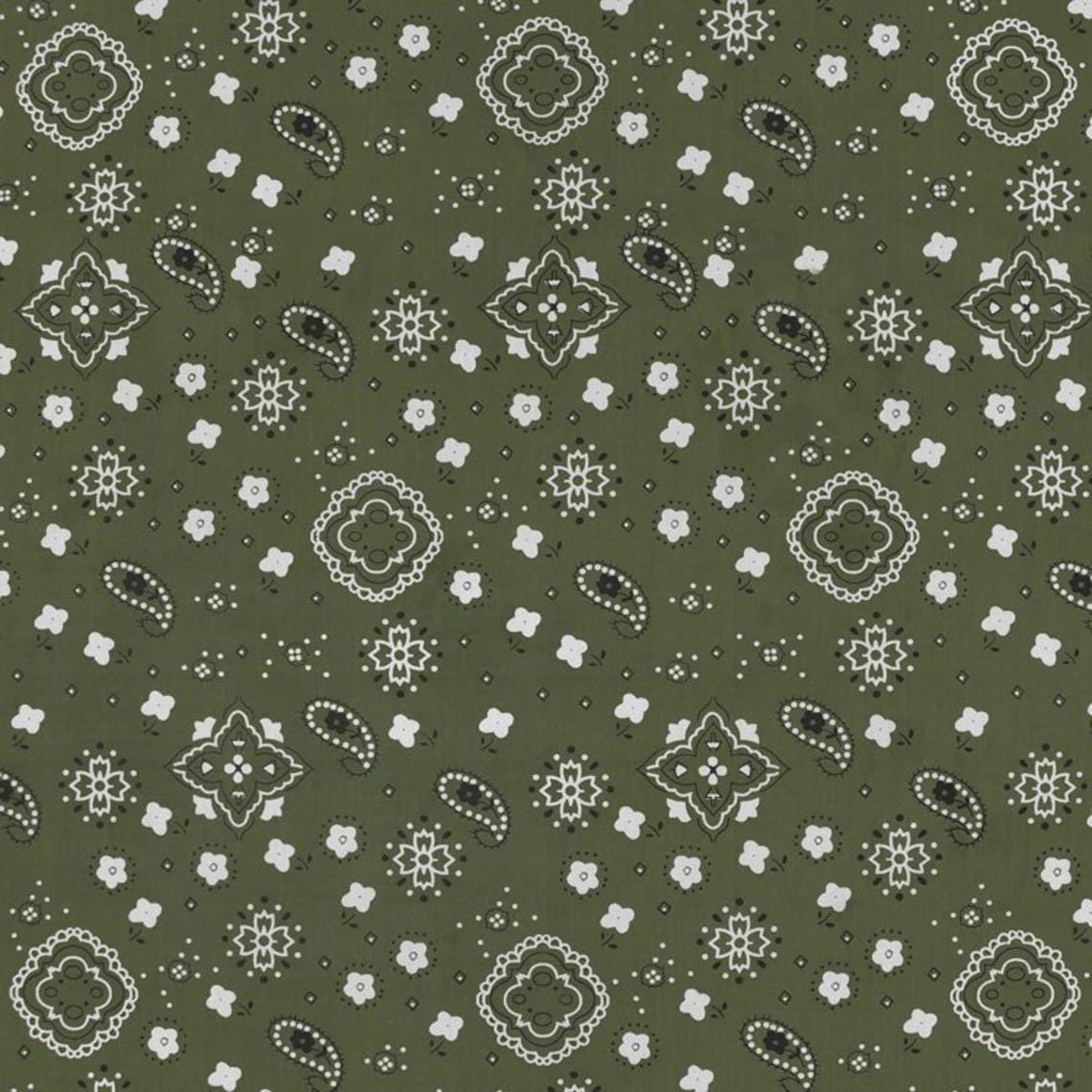 Olive Green Bandana Print Fabric Cotton/Polyester Sold By The Yard